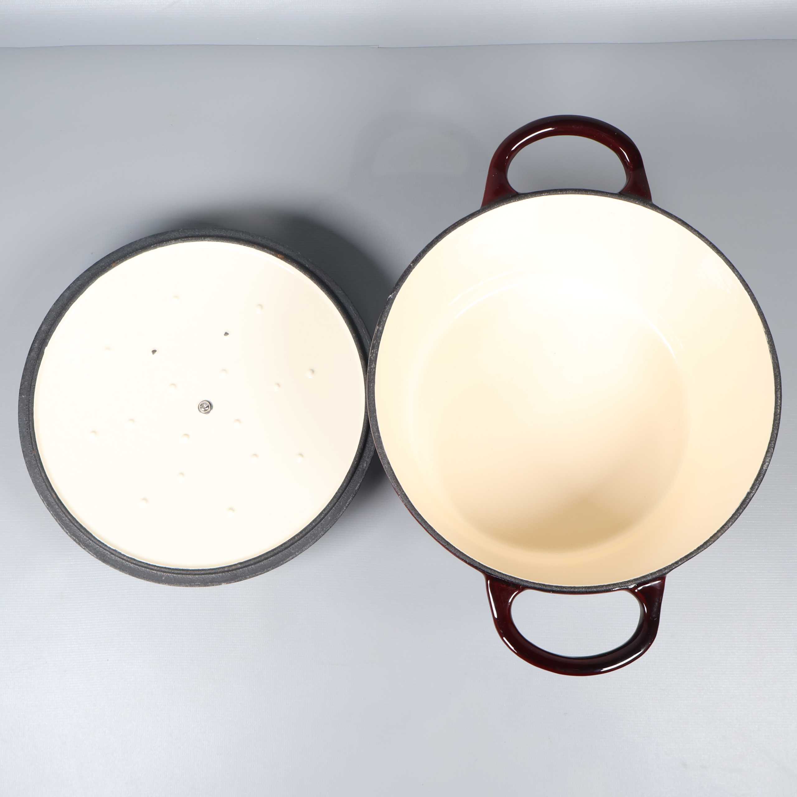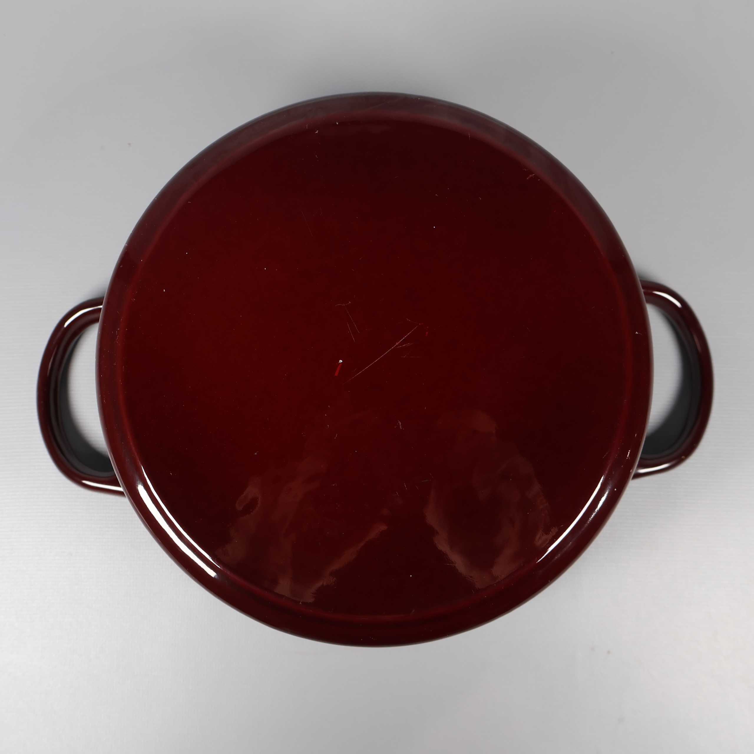 Robust gjutjärnsgryta med stilren djupröd finish och praktiskt lock med handtag i metall. Det finns två skador på insidan av locket.