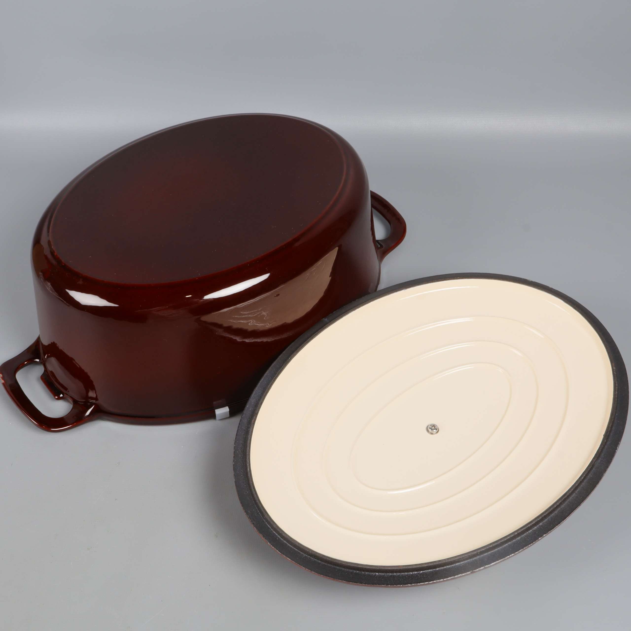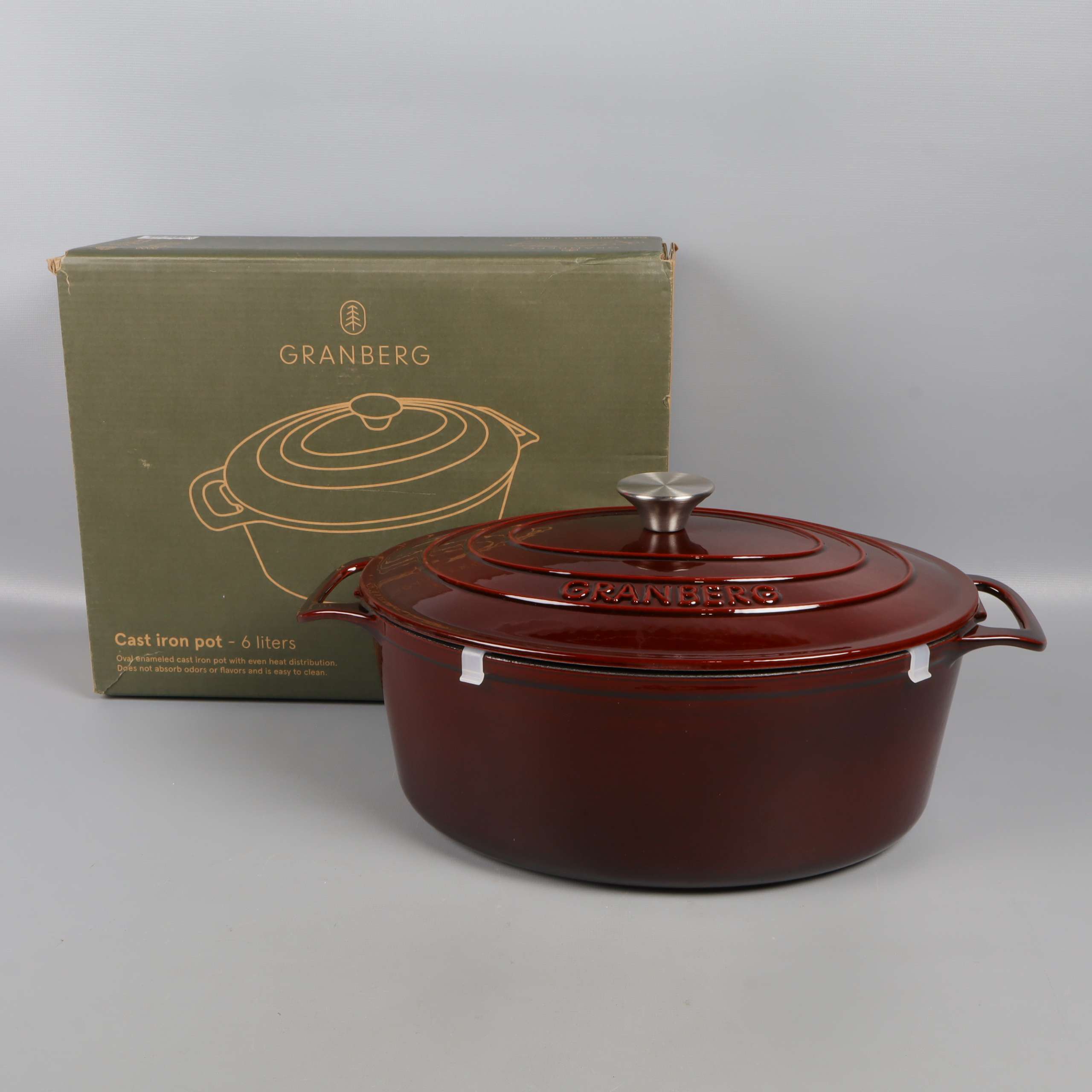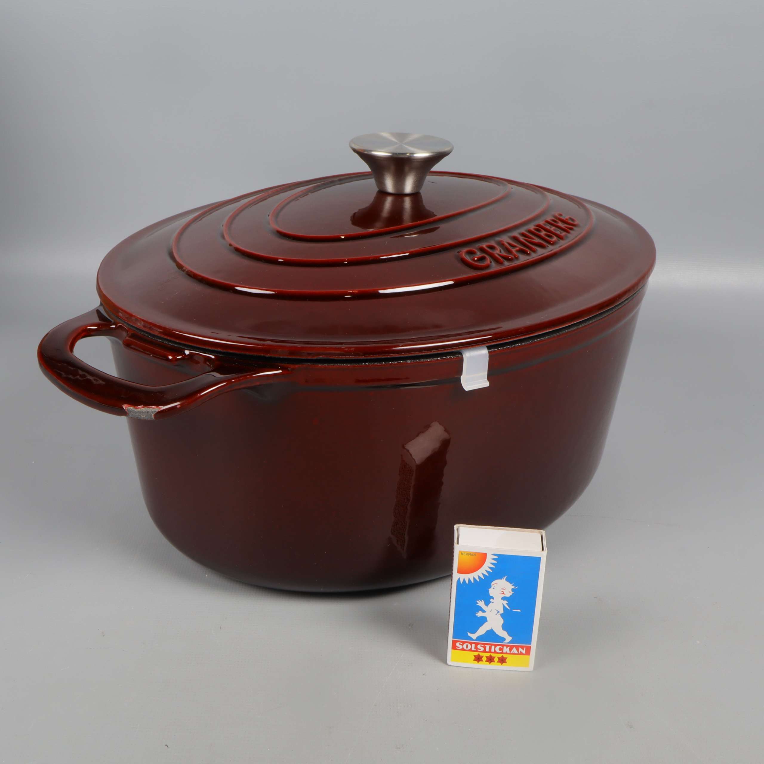 Robust oval gryta i gjutjärn med glänsande mörkbrun emaljerad yta och matchande lock. Invändigt ljus emalj för en klargjord look. Två greppvänliga handtag, metallknopp och tydlig Granberg-logo ger både stil och funktion. En kant har slitage/emaljskada.