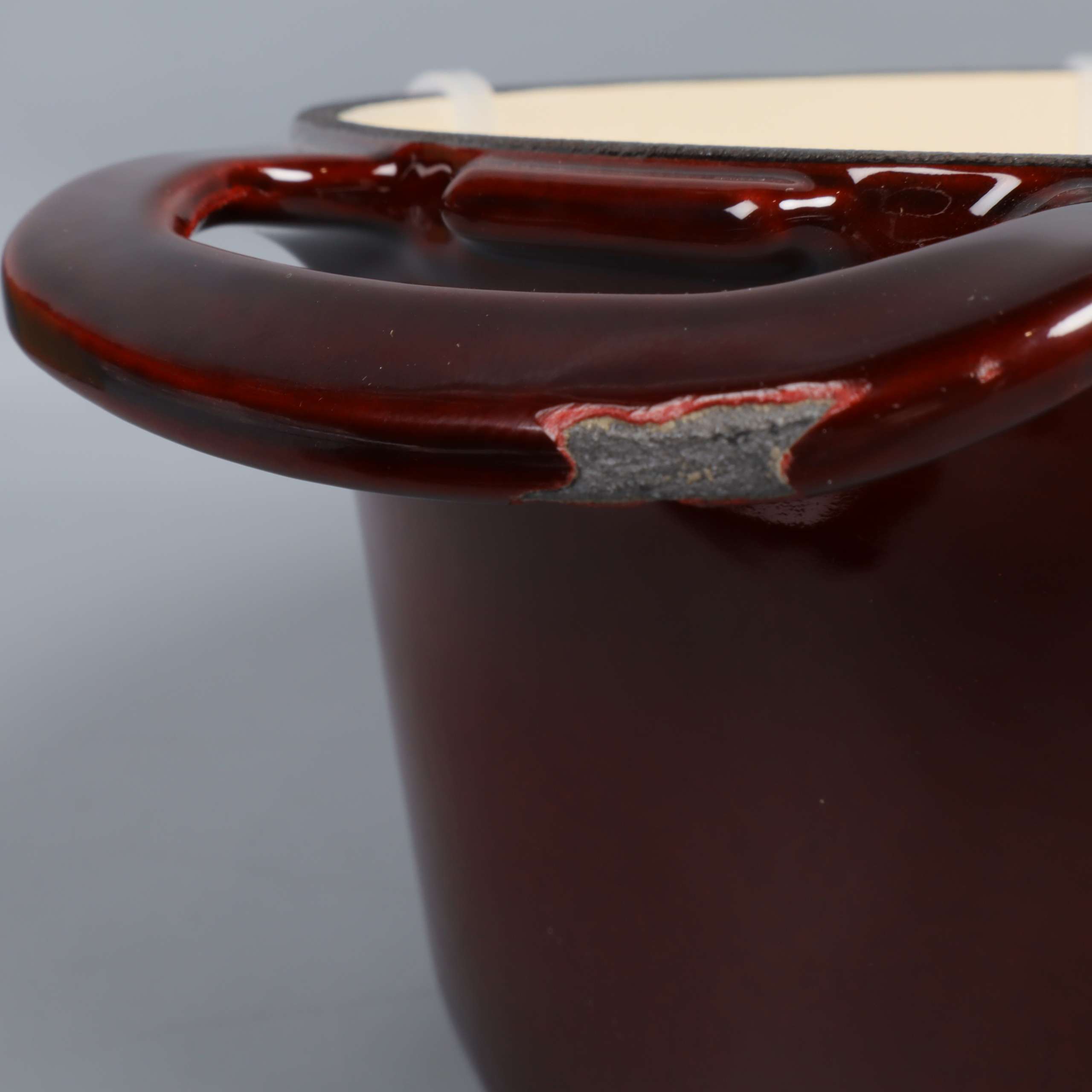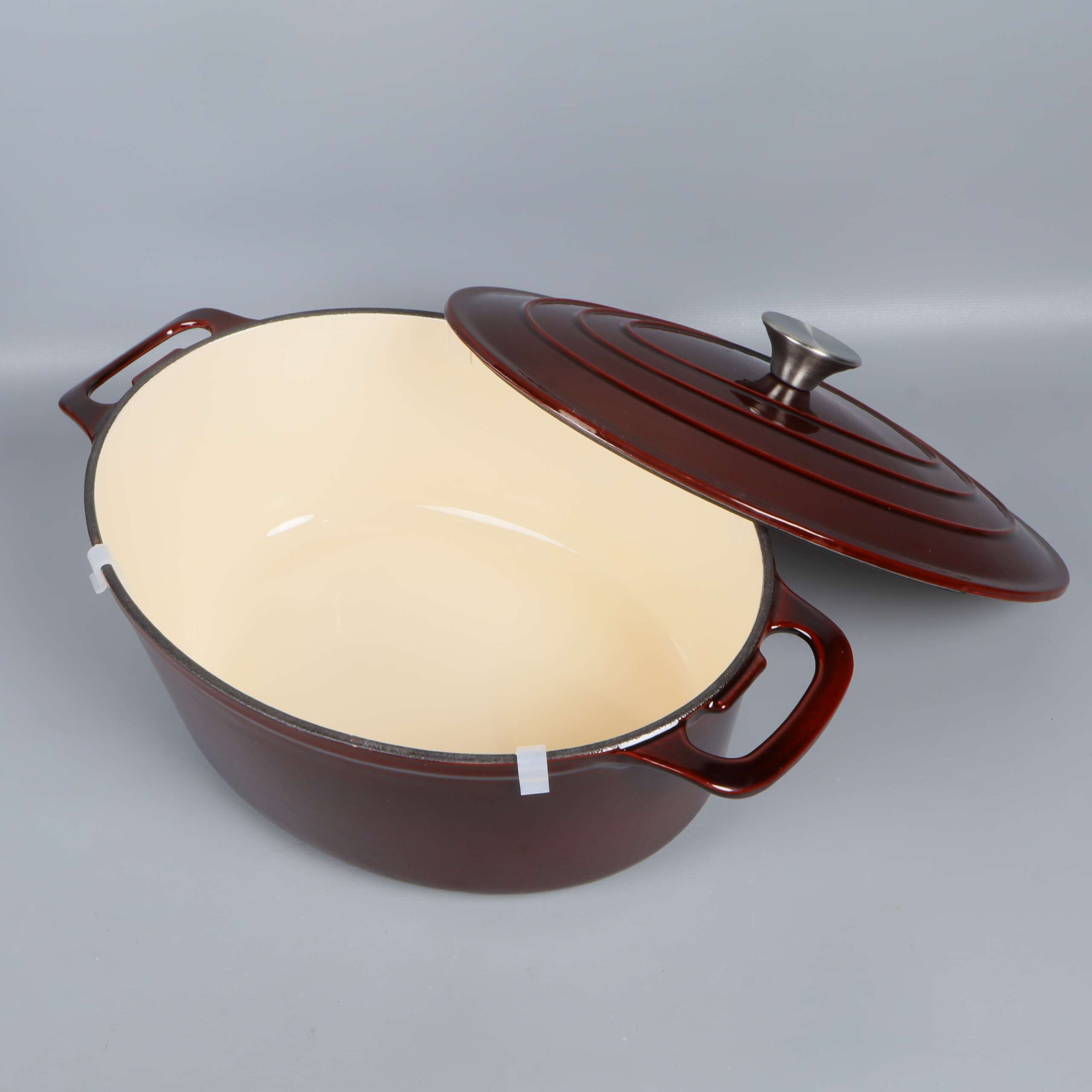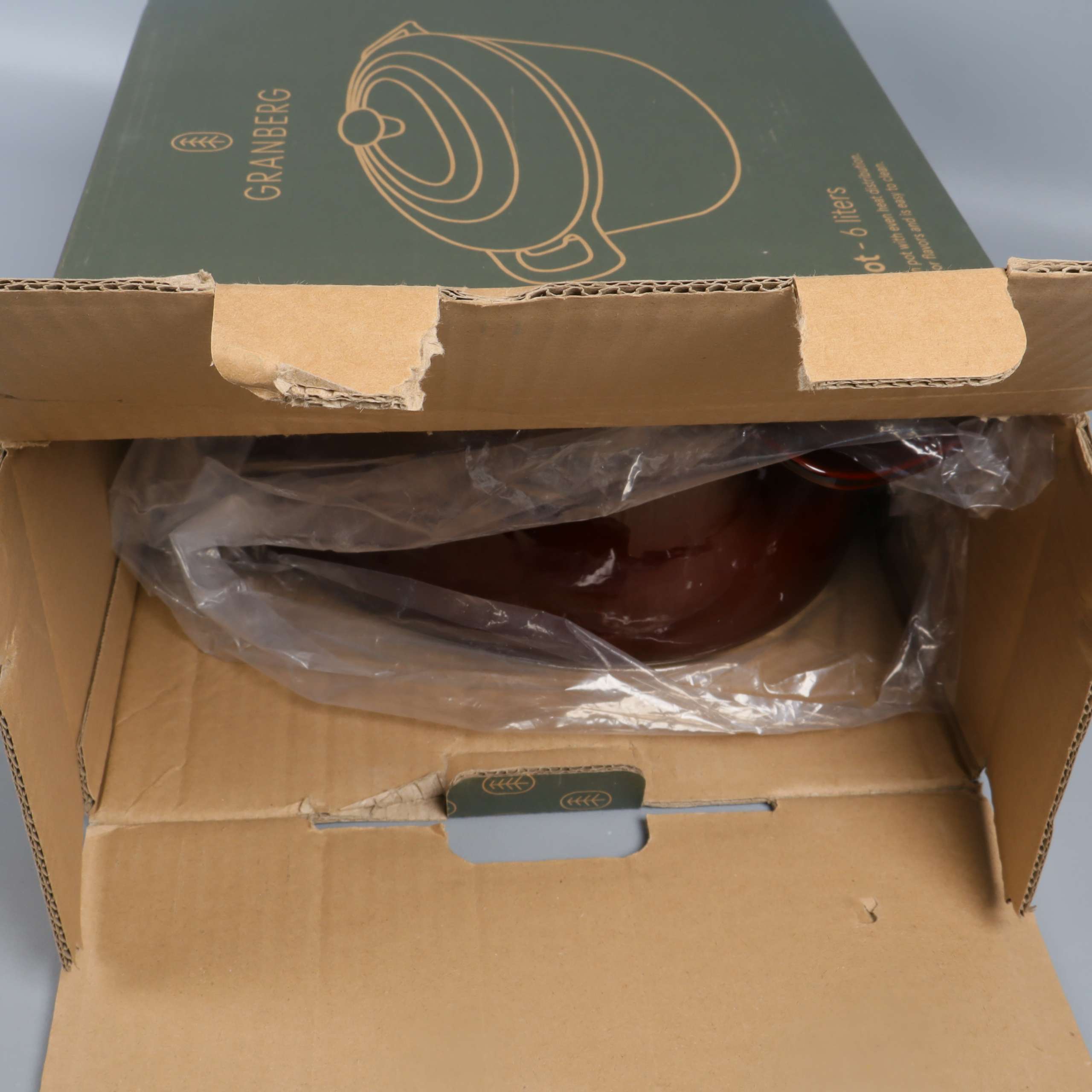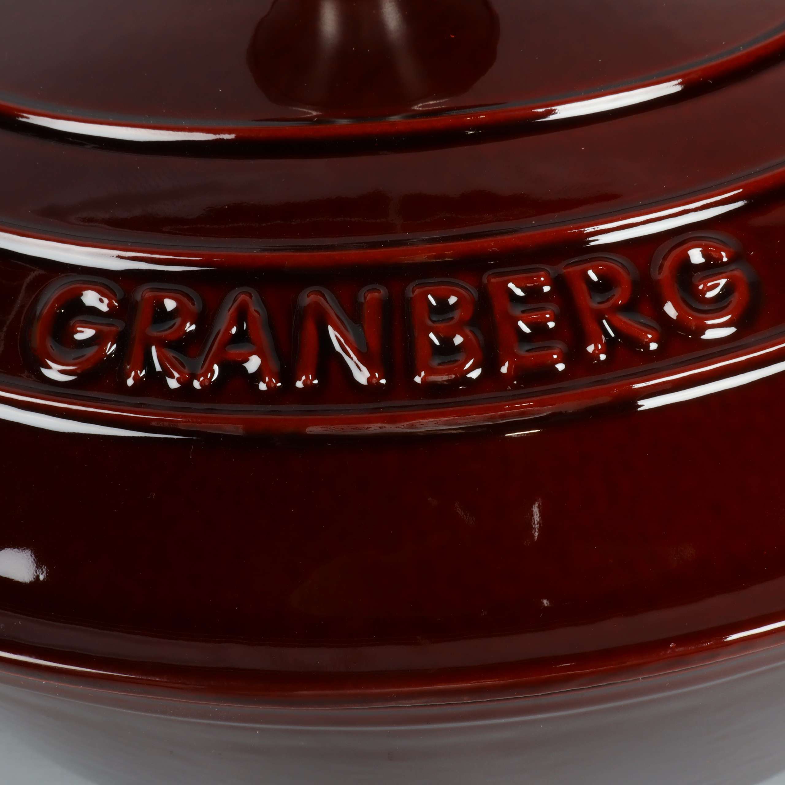 Robust oval gryta i gjutjärn med glänsande mörkbrun emaljerad yta och matchande lock. Invändigt ljus emalj för en klargjord look. Två greppvänliga handtag, metallknopp och tydlig Granberg-logo ger både stil och funktion. En kant har slitage/emaljskada.