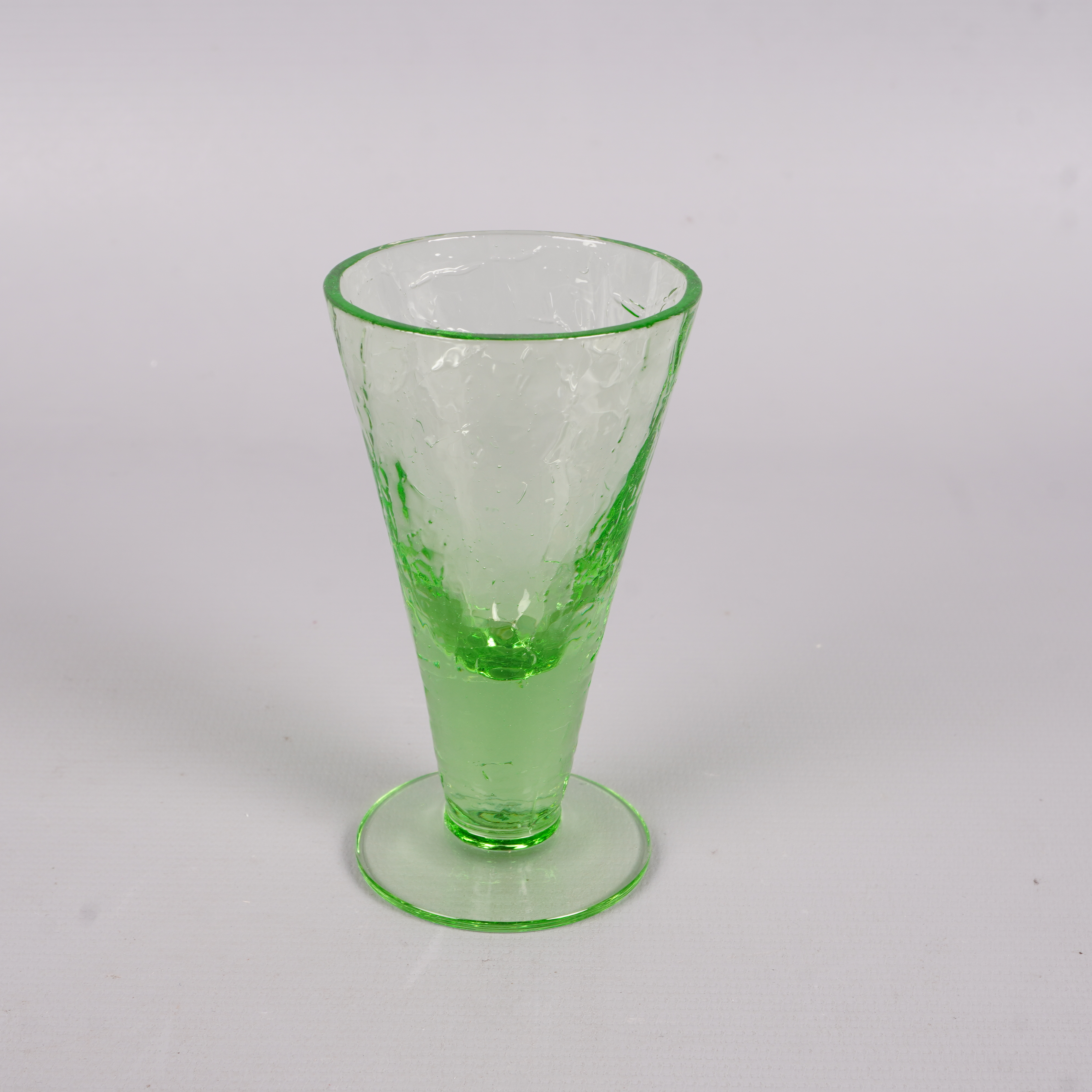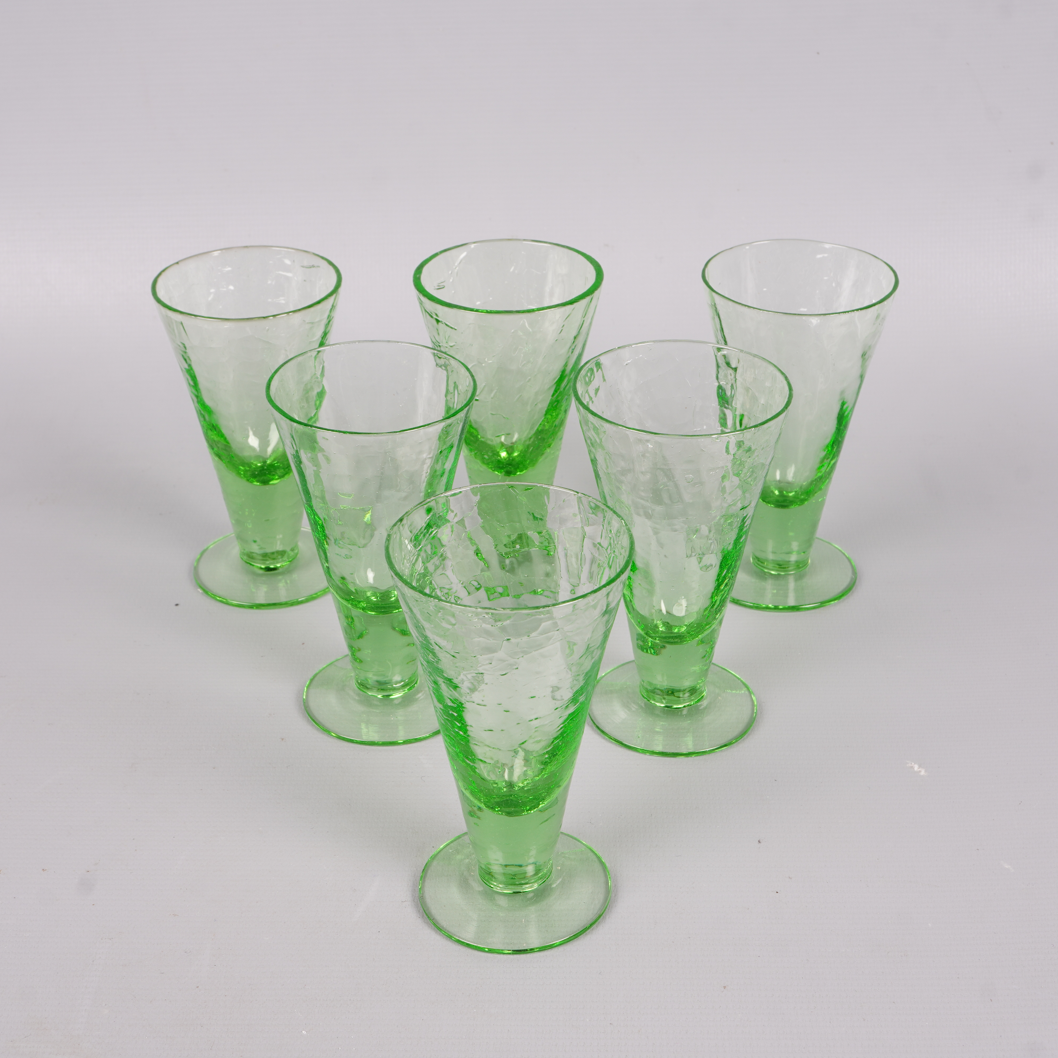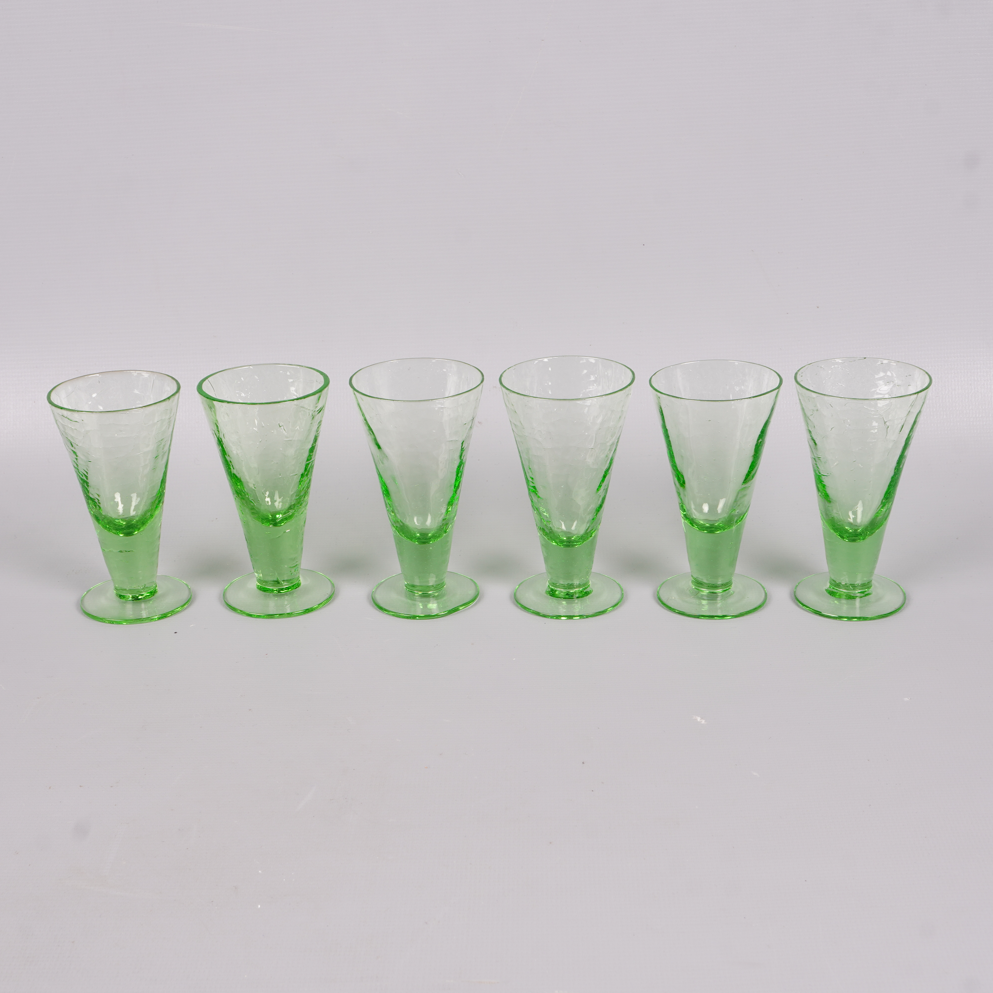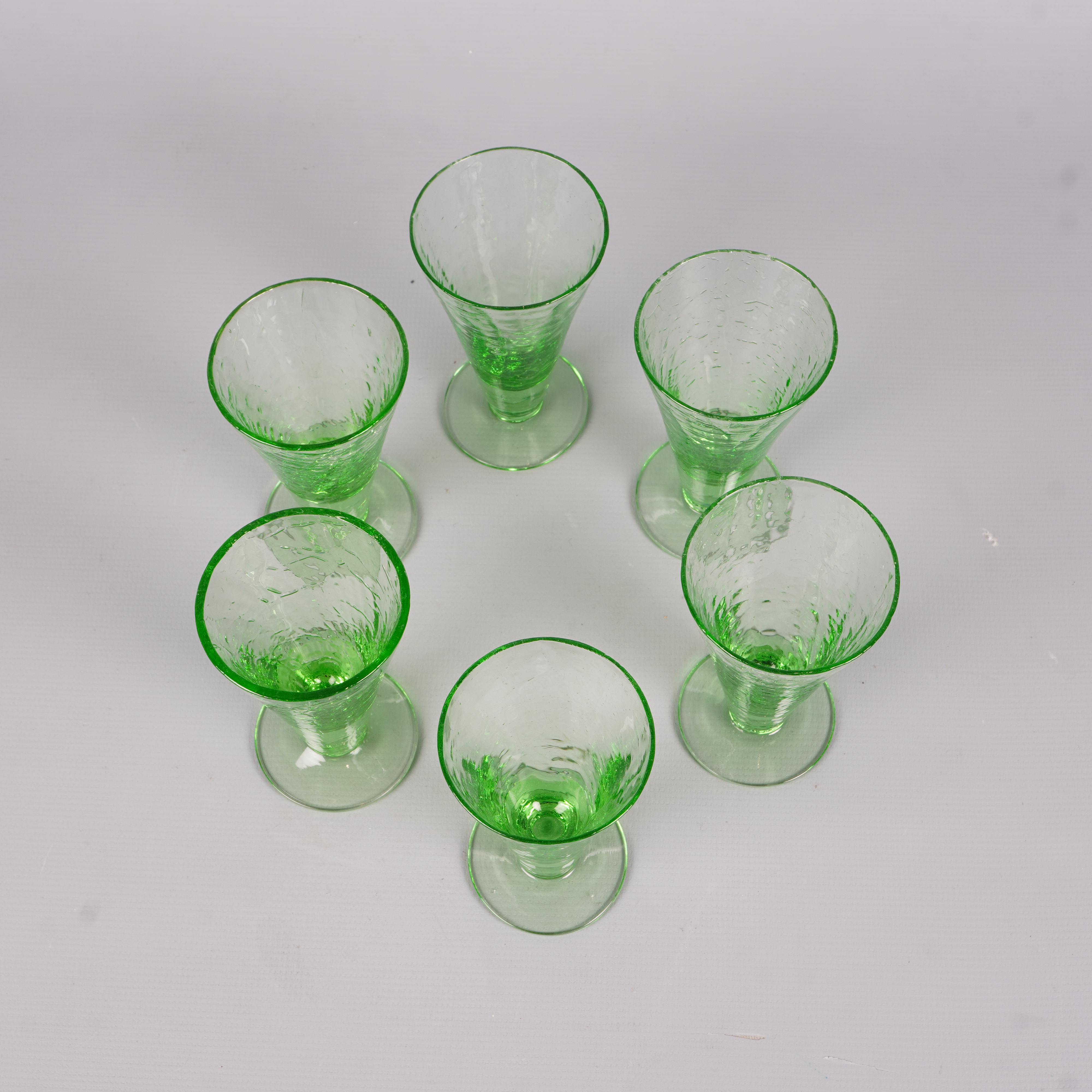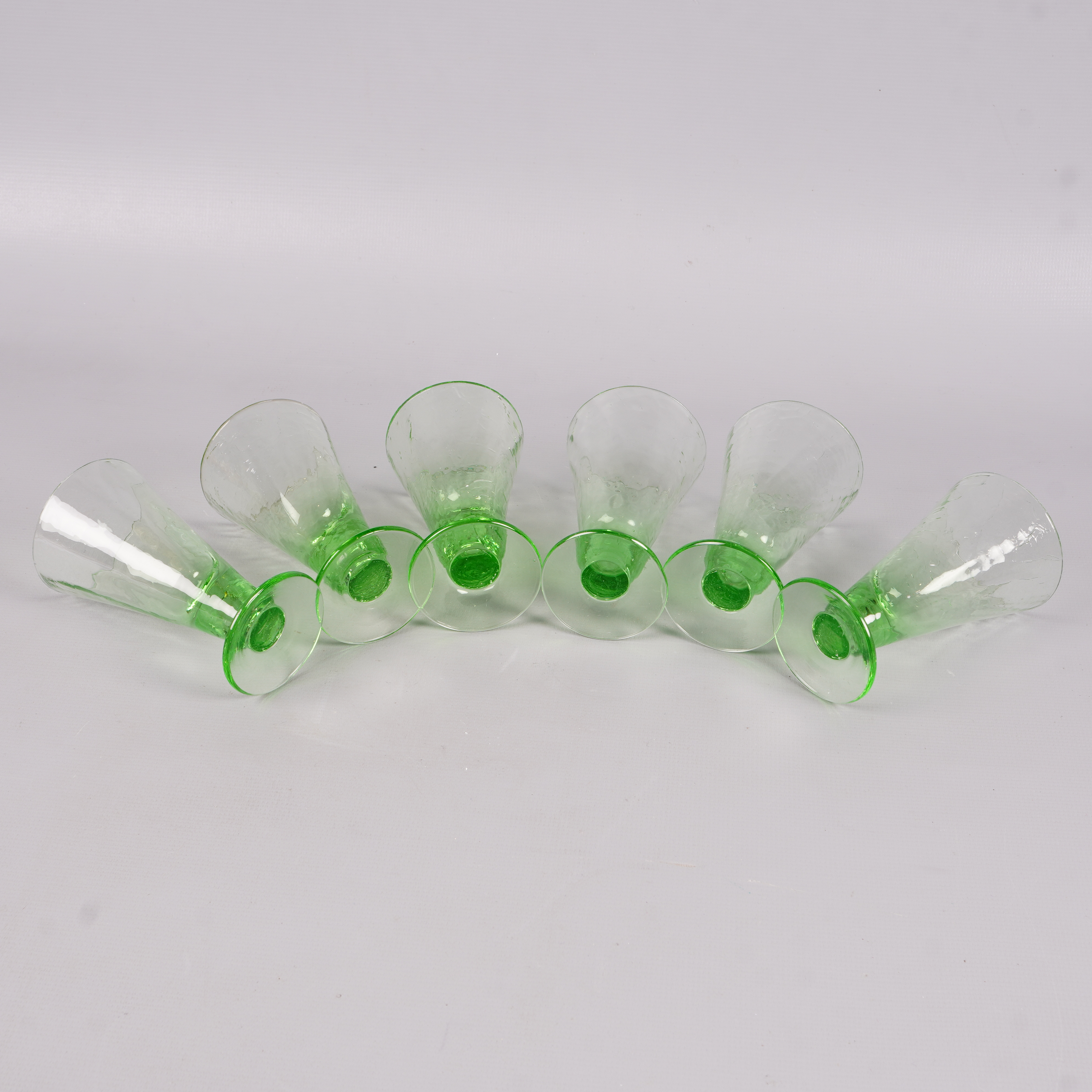 Set med sex stilrena likörglas i grönt transparent glas med unik bubblig struktur och smal, elegant fot. Glasens design ger en modern och lekfull känsla som passar lika bra till fest som till vardag.