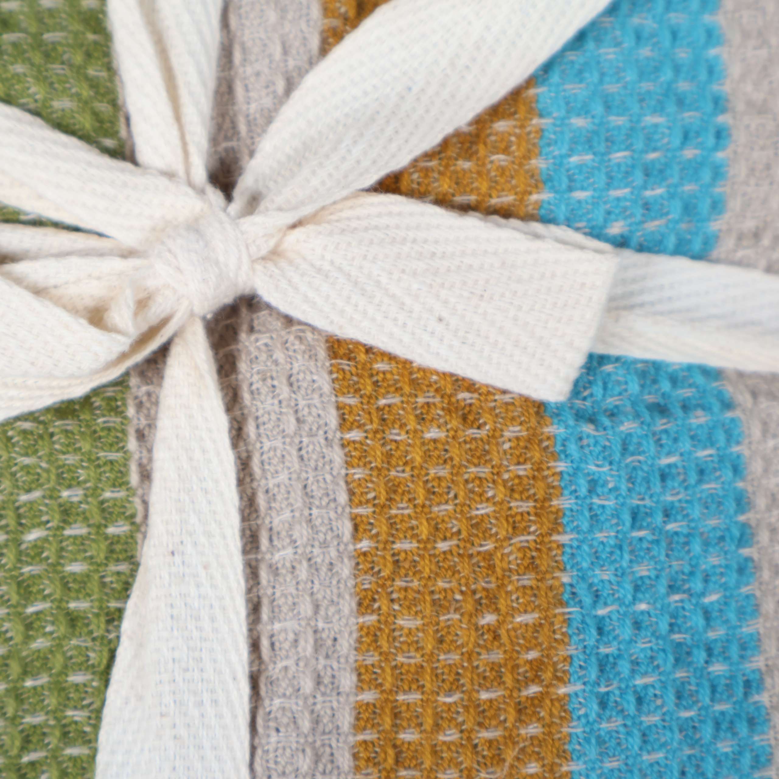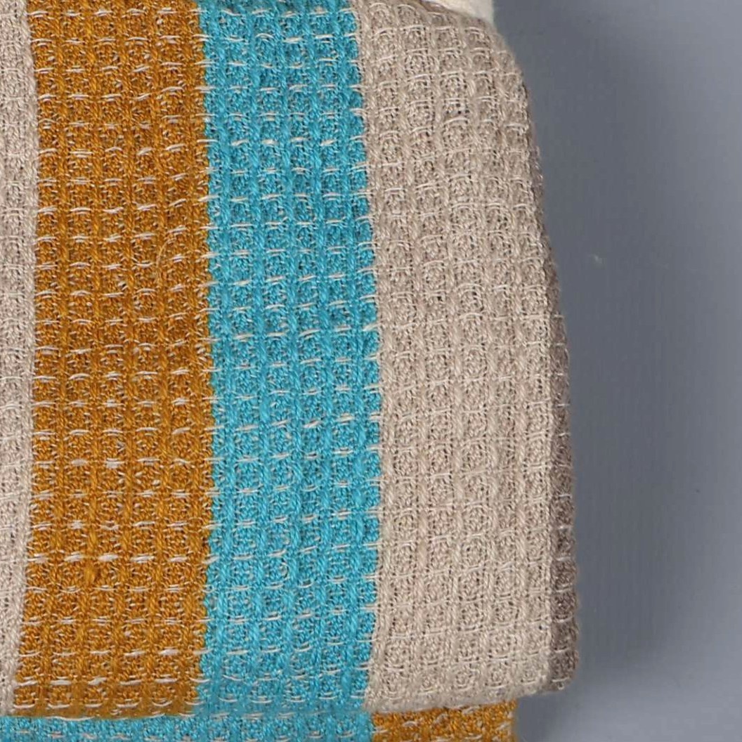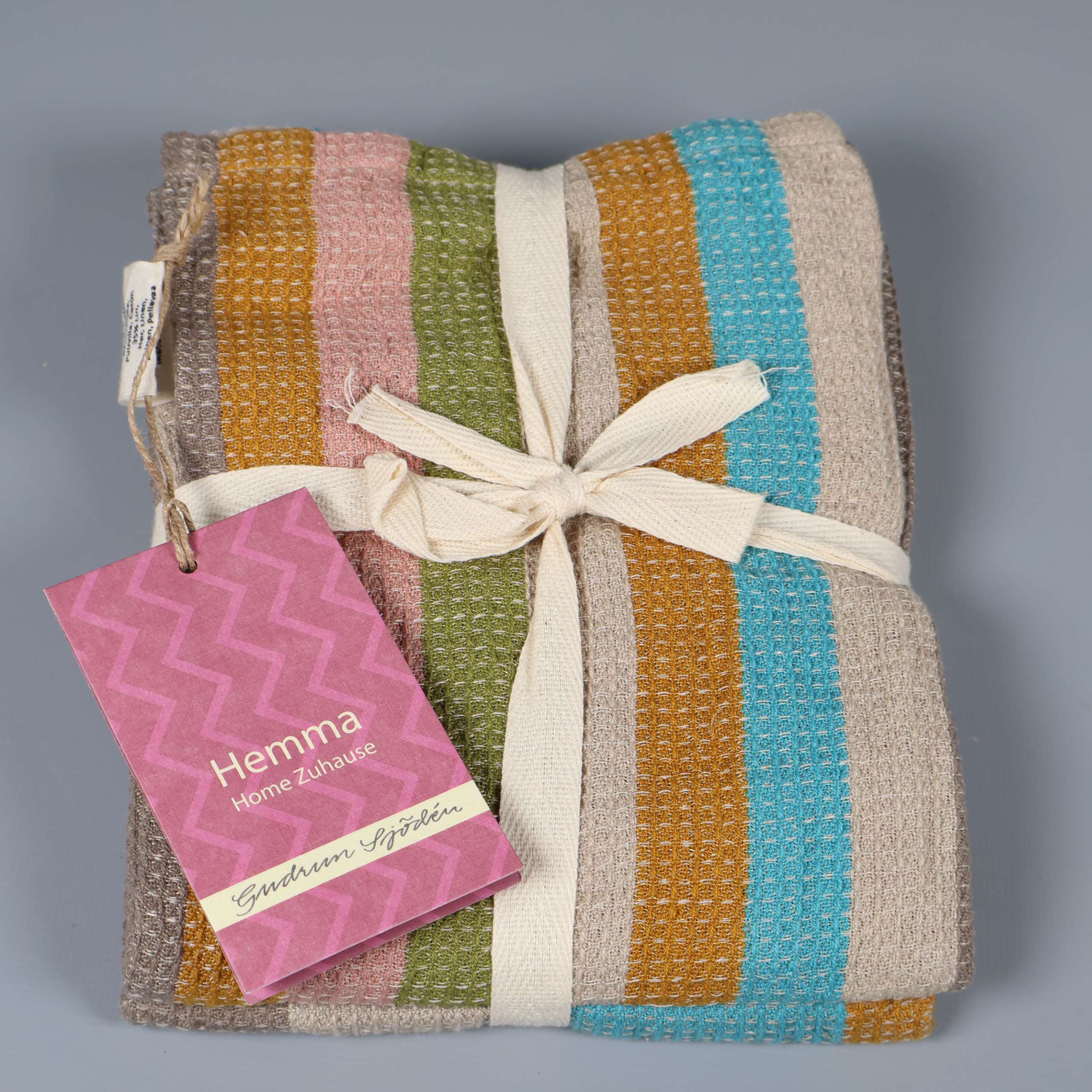 En färgstark kökshandduk i tydligt vävt tyg med breda ränder i beige, turkos, senapsgult, grönt och rosa. Känns mjuk men ändå stadig tack vare mixen av bomull och lin, med en modern och hemtrevlig vibe. Oöppnad förpackning.