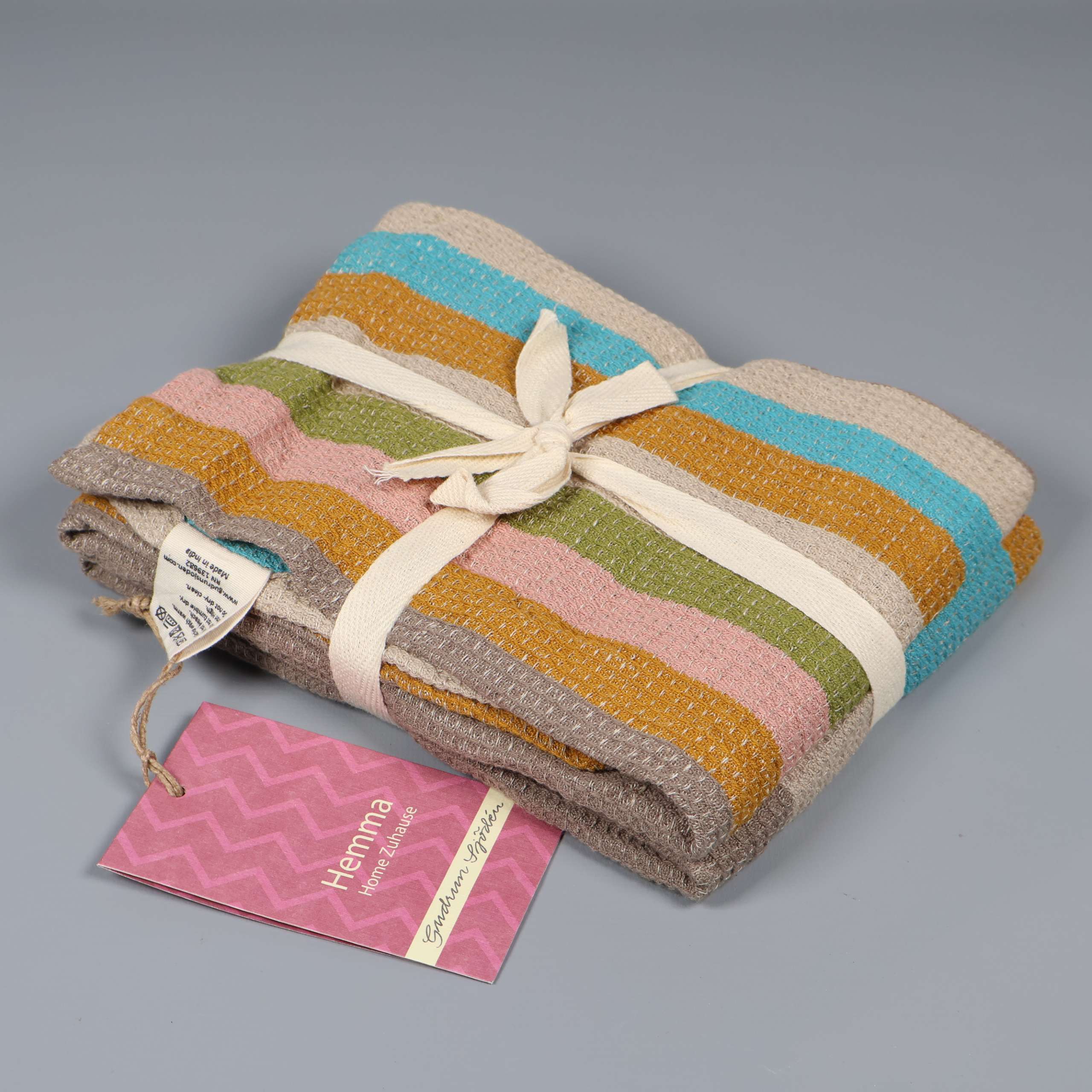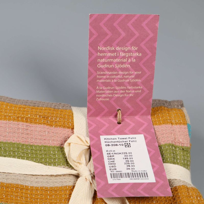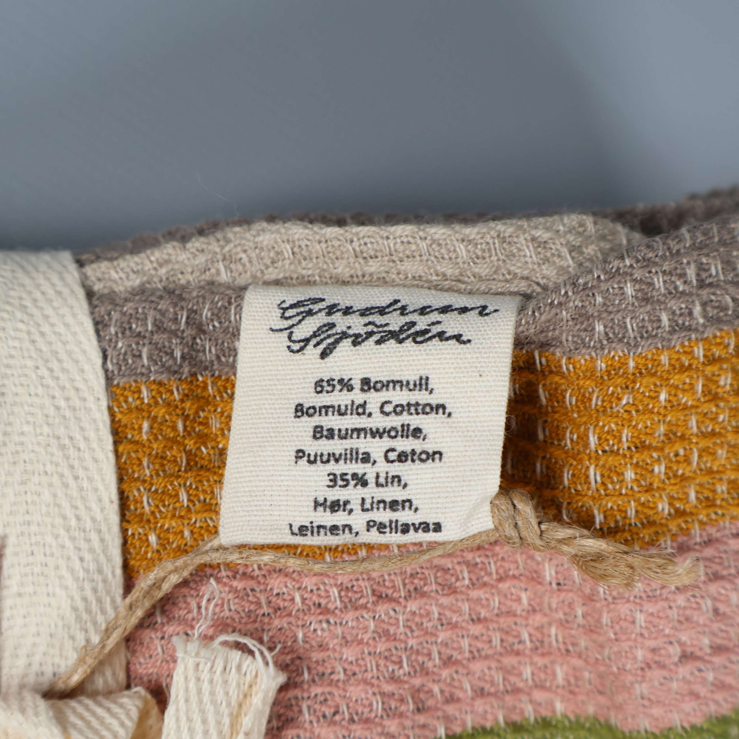 En färgstark kökshandduk i tydligt vävt tyg med breda ränder i beige, turkos, senapsgult, grönt och rosa. Känns mjuk men ändå stadig tack vare mixen av bomull och lin, med en modern och hemtrevlig vibe. Oöppnad förpackning.