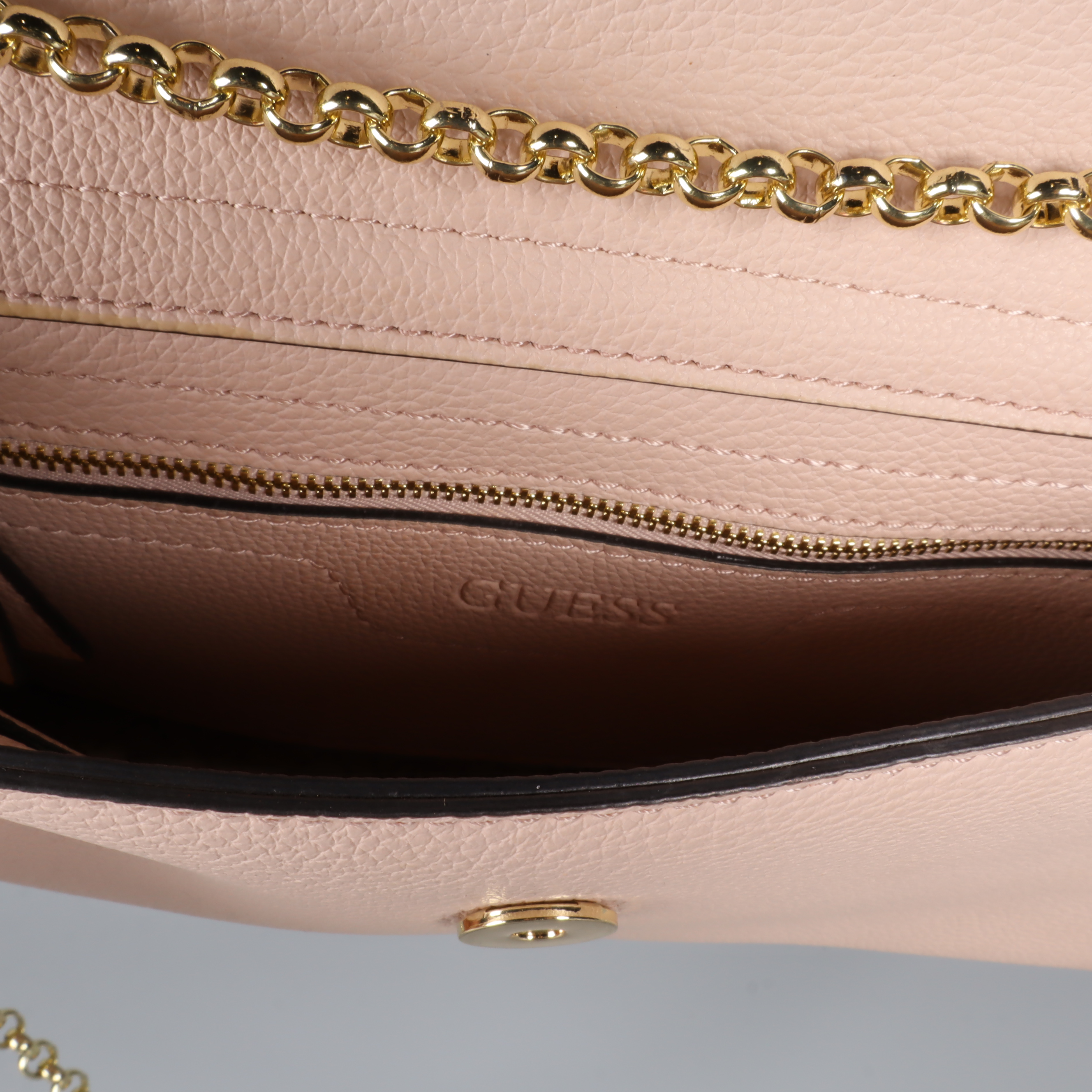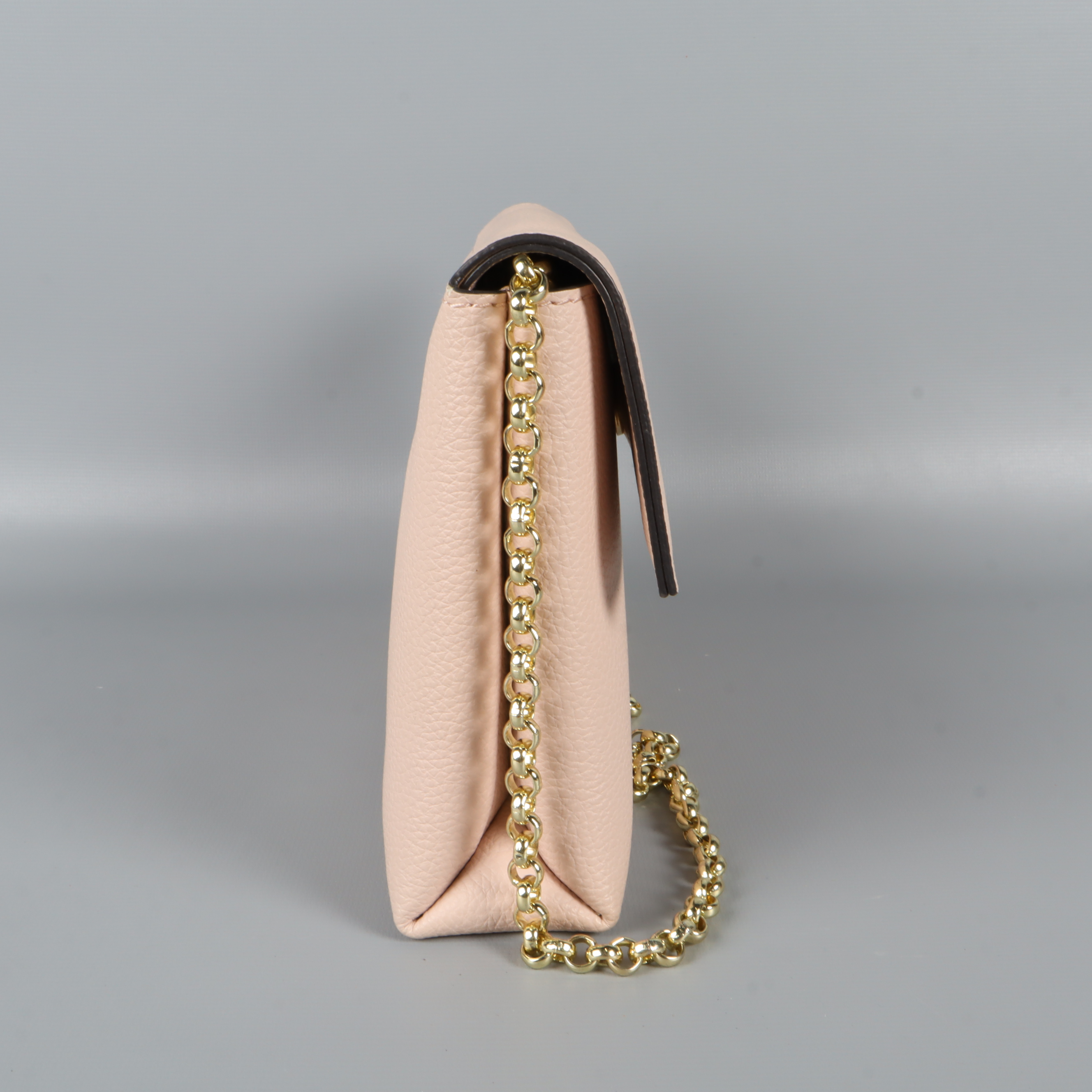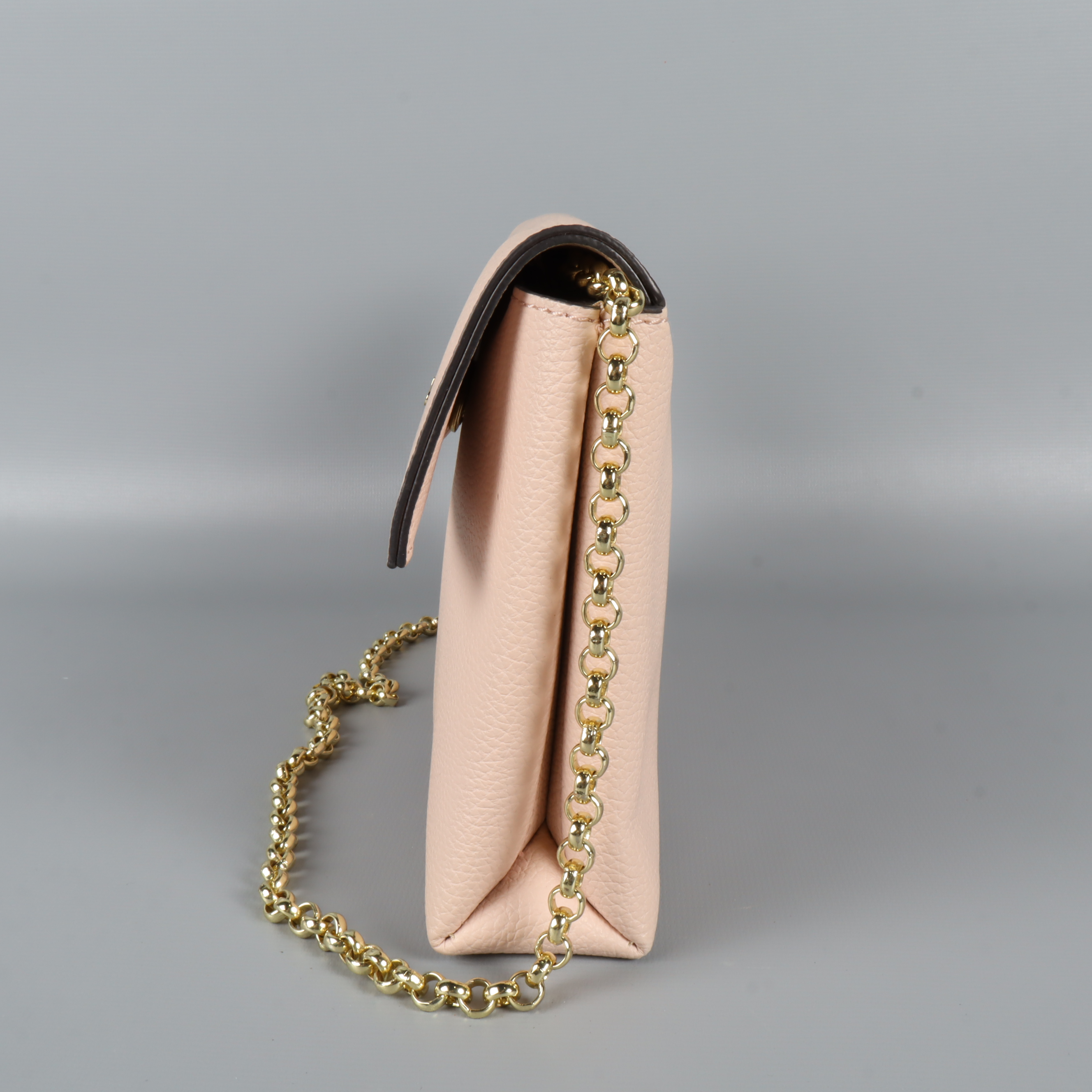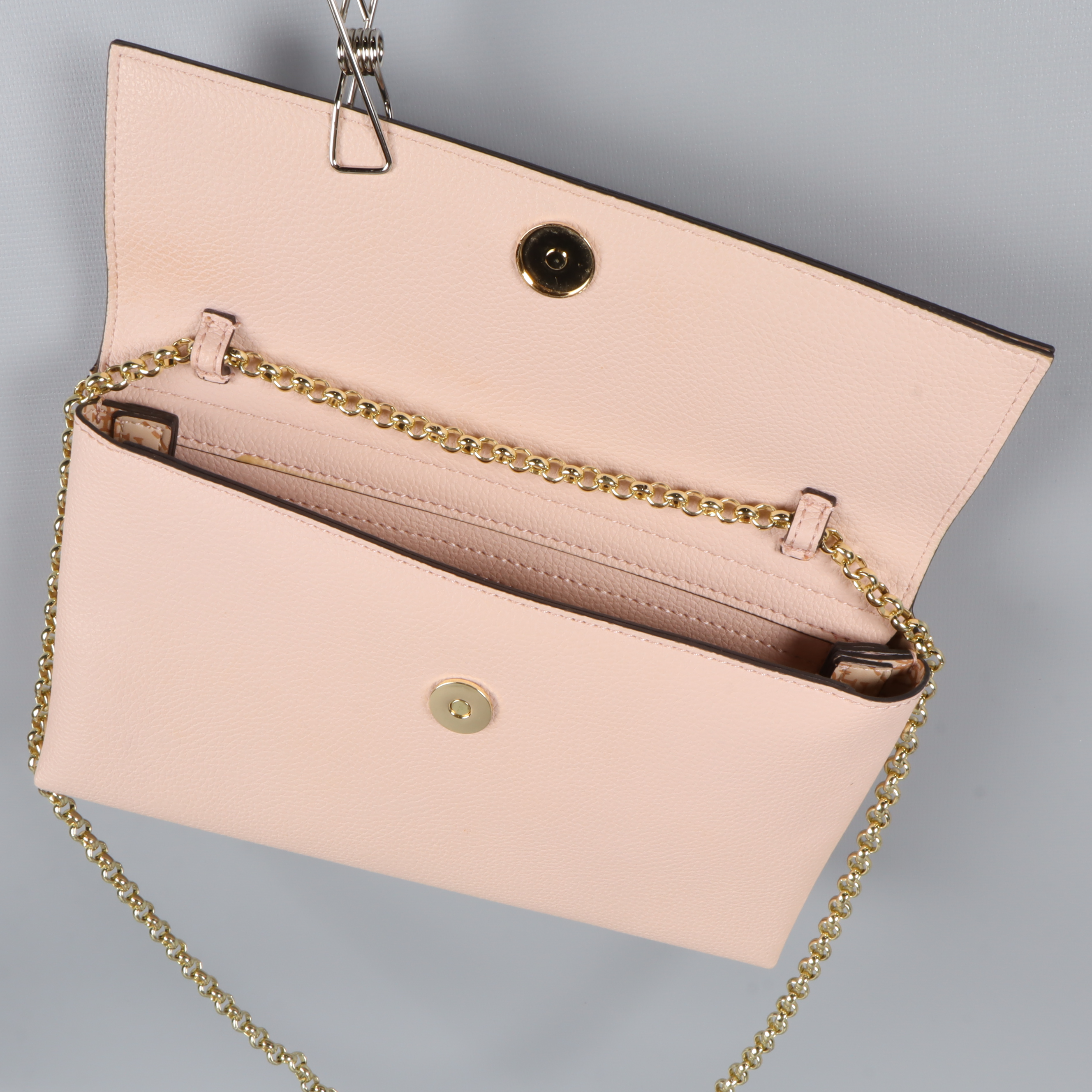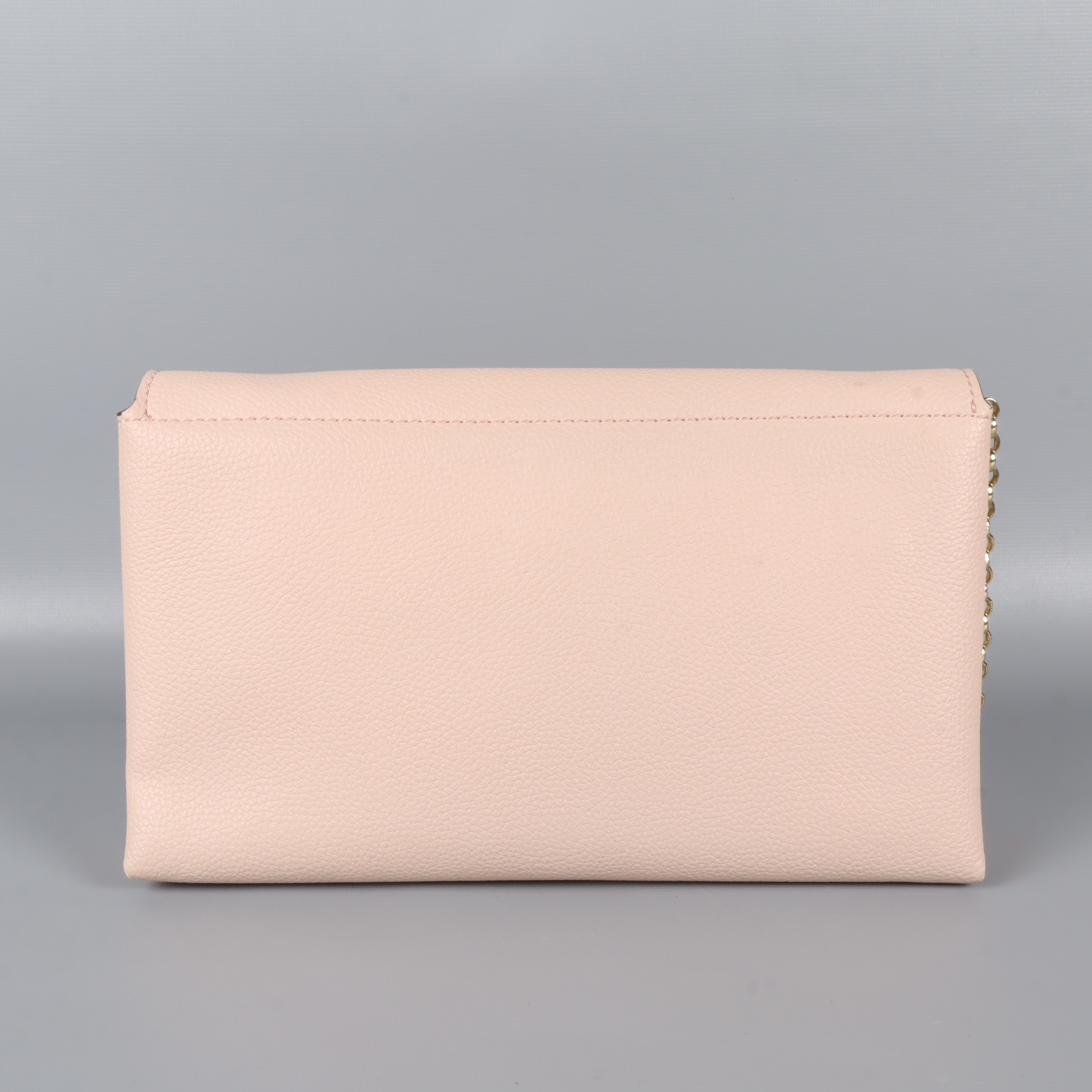 Clutch/axelremsväska i en subtil rosa nyans med guldfärgad kedja. Väskan har en chic och stilren design och en rymlig insida för praktisk förvaring.