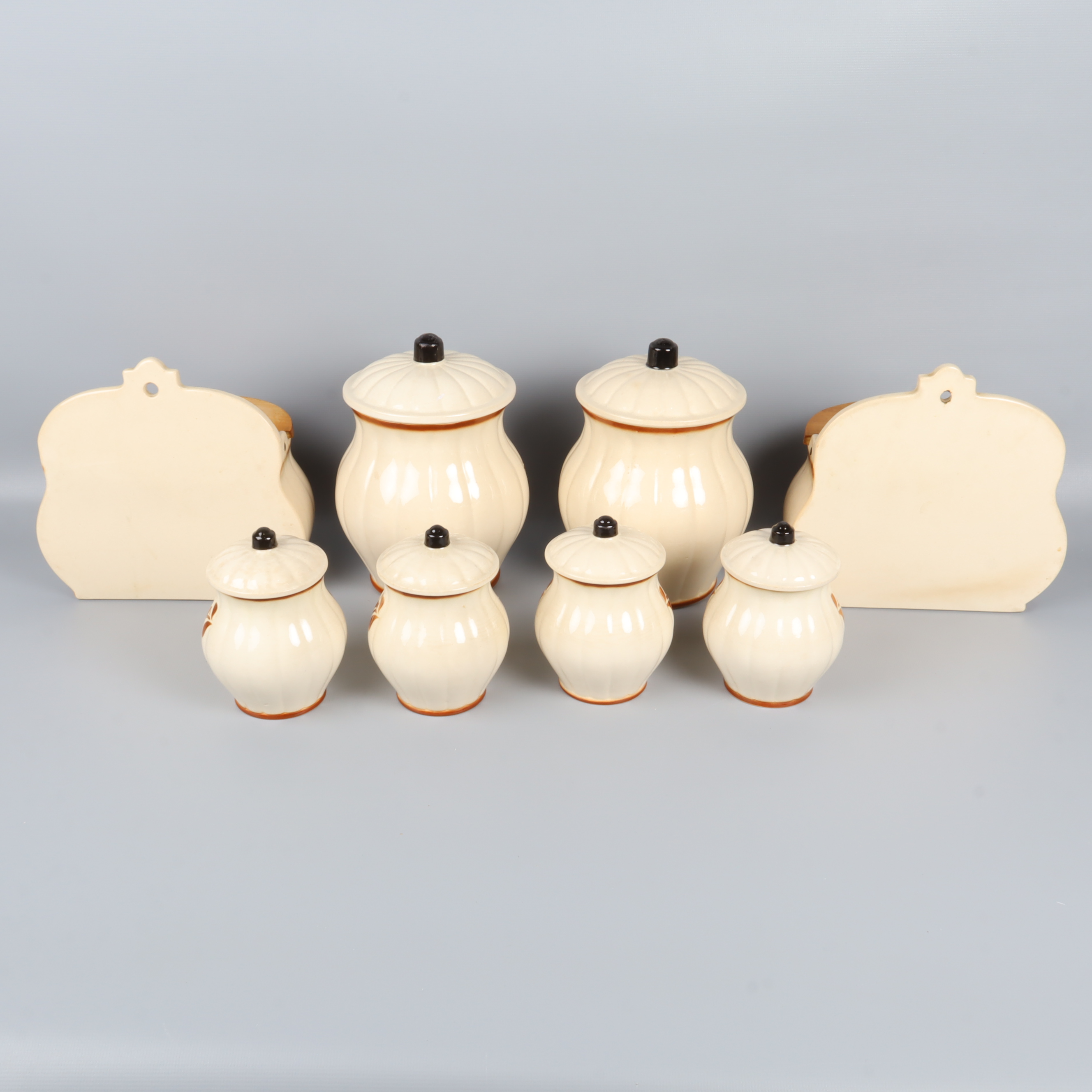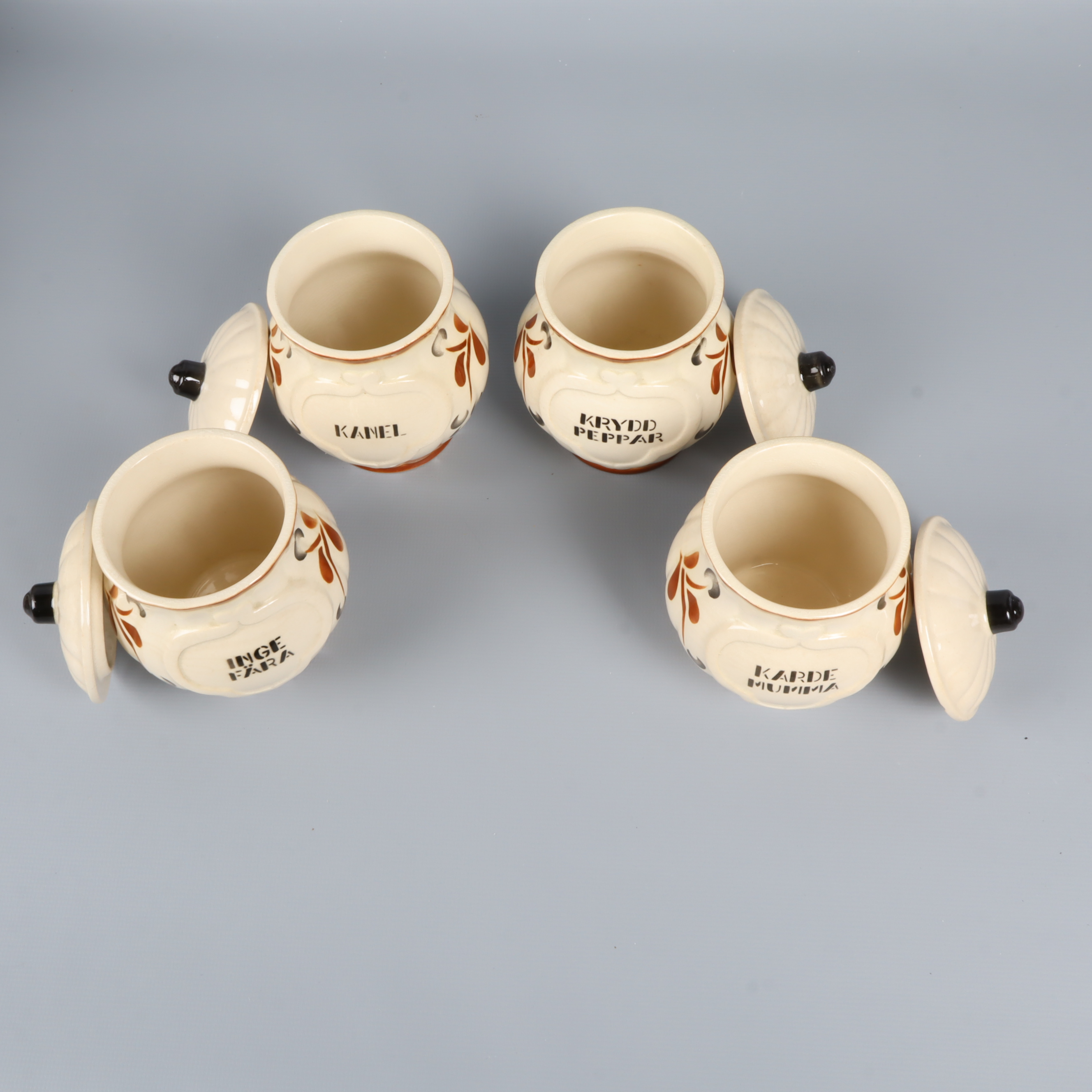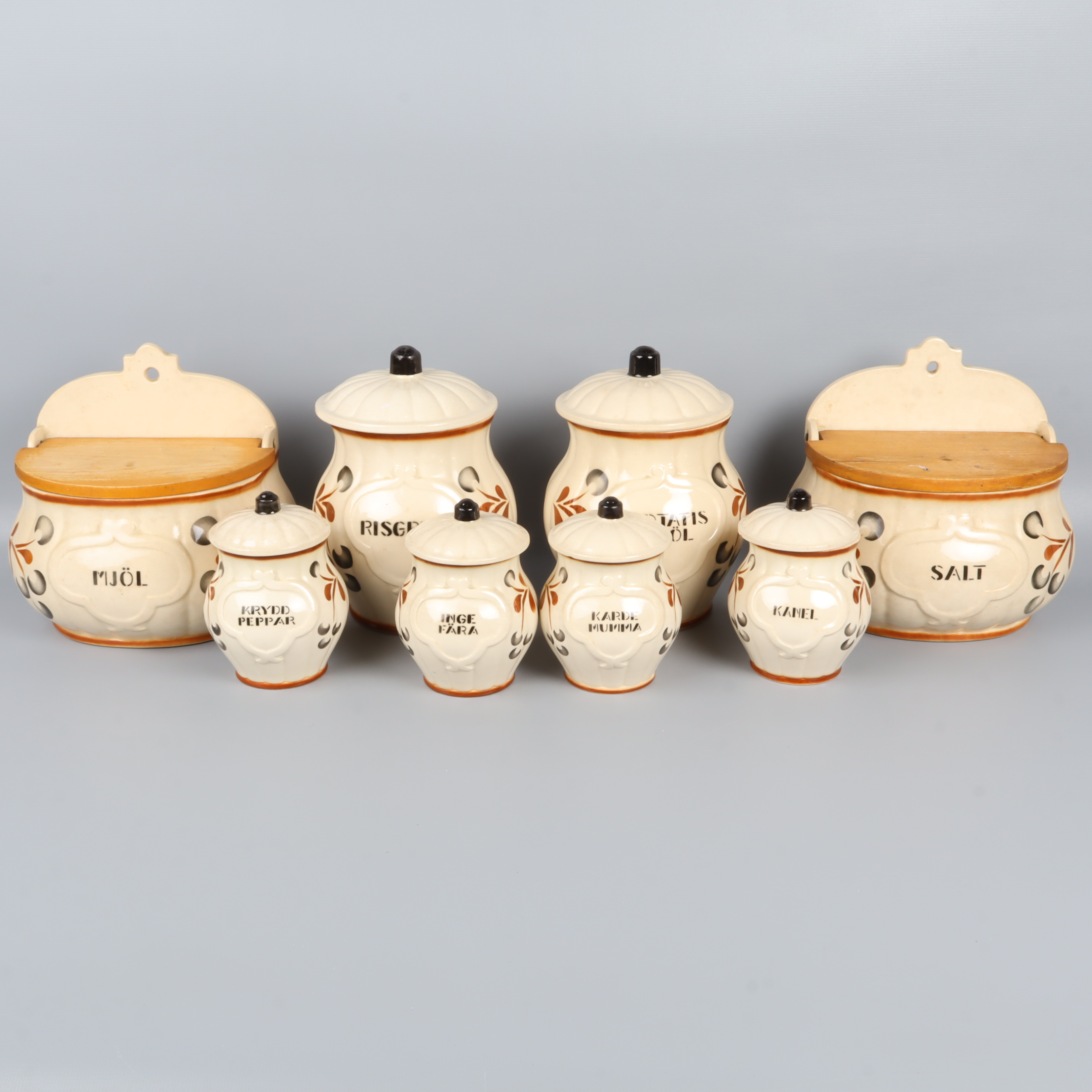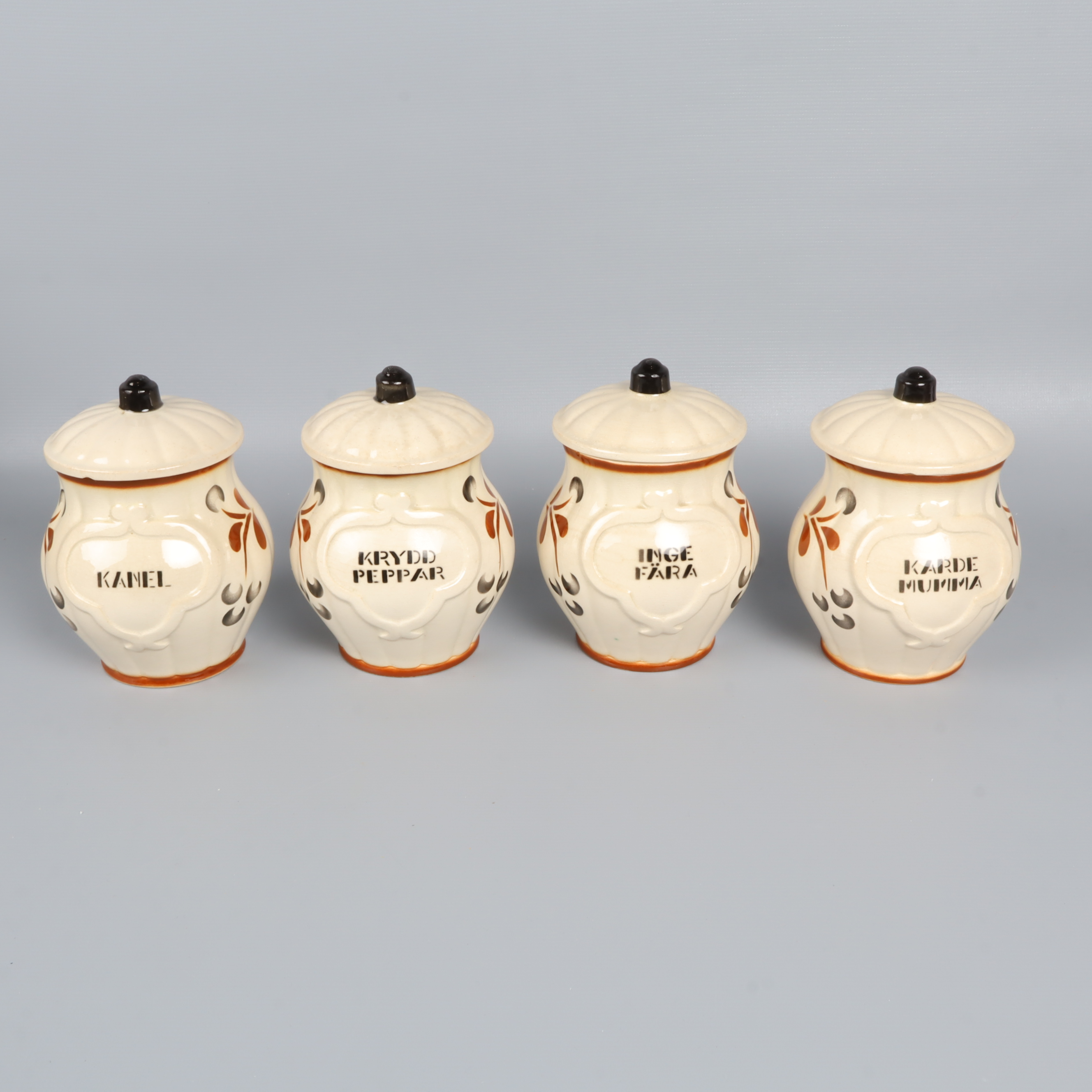 Gustavsberg Gustavsberg Dek 20 kryddburkar med lock retrostil 459 kr Product variation Antal st Beskrivning Åtta fina kryddburkar i keramik, dekorerade med mönster i brunt och orange samt svarta knoppdetaljer. Setet innehåller både större och mindre burkar, några med trälucka och några med lock. En klassisk vintage vibe för köket. Visa all beskrivning Detaljer Höjd: ca 11-19cmDiameter: ca 8-12cmÖvrigt: Nagg på lock (bild 7) Skick Gott skick Produkten har använts men är av fin kvalitet, det kan förekomma mindre förslitningar. Läs mer om hur vi bedömer Dimensions Höjd: ca 11-19cm Diameter: ca 8-12cm Färg Beige Material Keramik Varumärke Gustavsberg Produkten är unik och finns enbart som 1 st i lager. Fri frakt på alla köp över 990 kr. 14 dagars ångerrät.