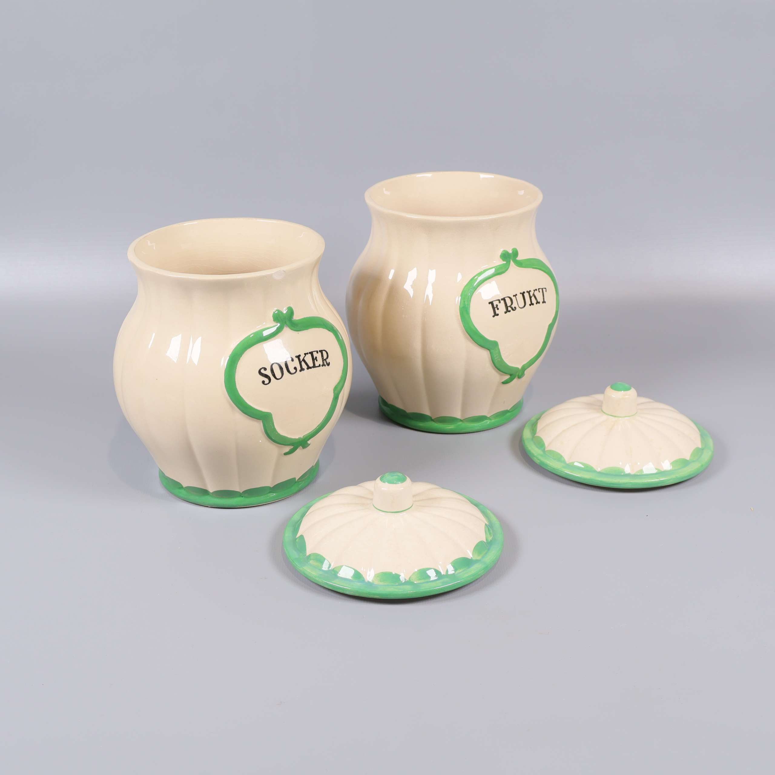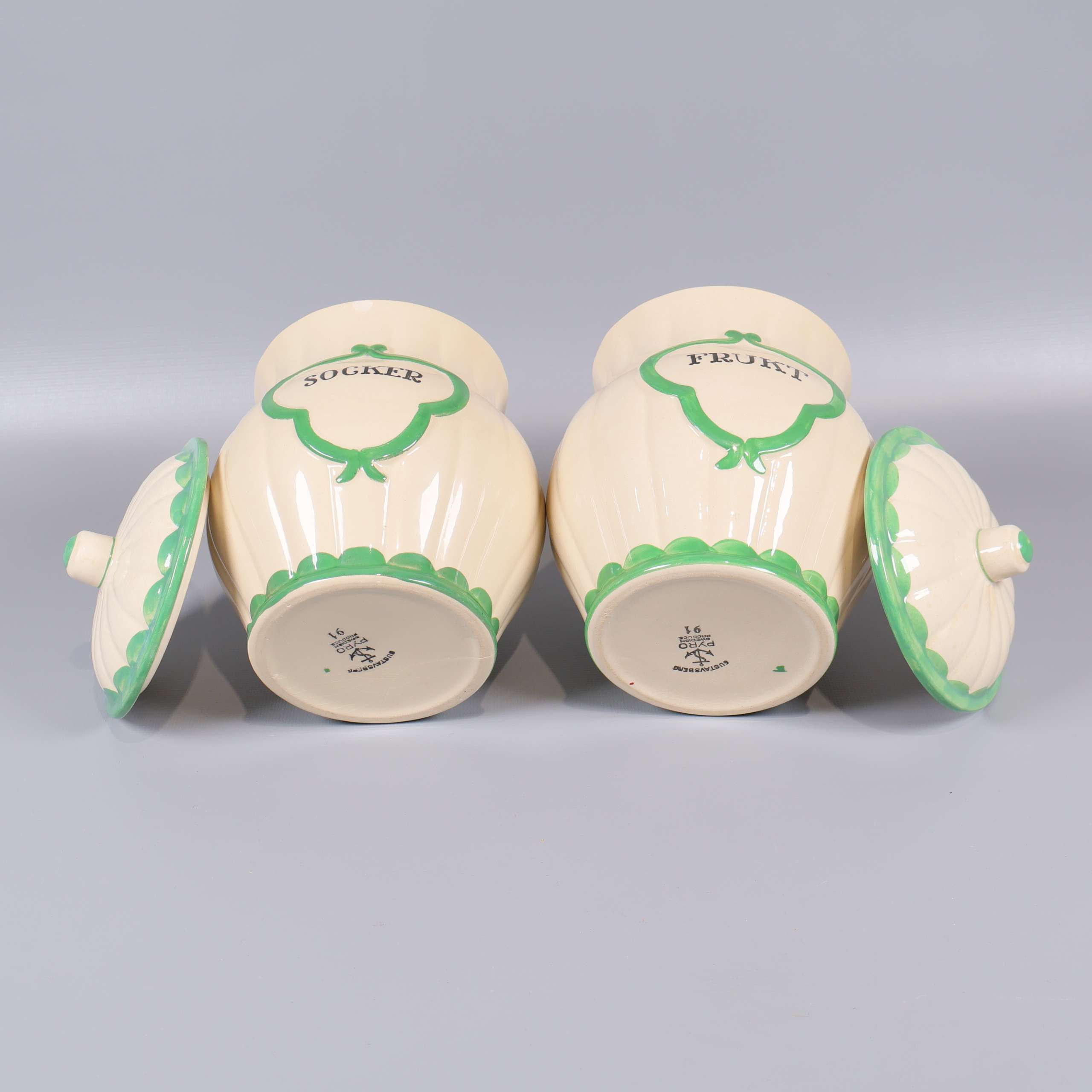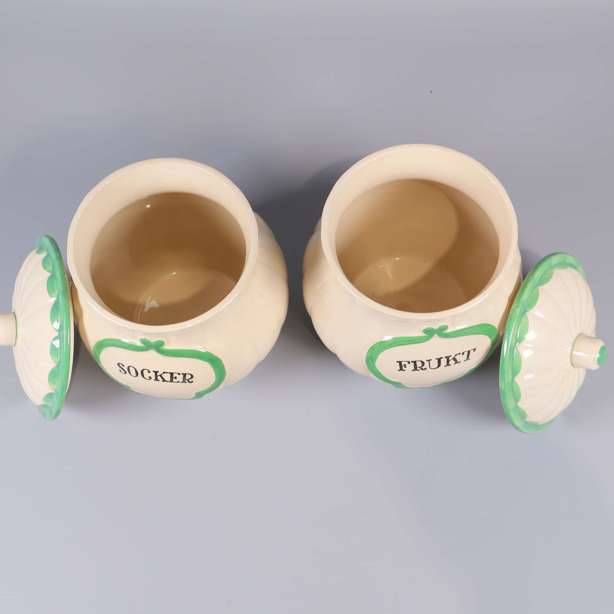 Två klassiska burkar med rundade former och lock, dekorerade med grön bård och tydlig text för socker och frukt på framsidan. Krämvit glaserad yta ger en tidlös känsla och burkarna passar fint som både dekoration och förvaring i köket.