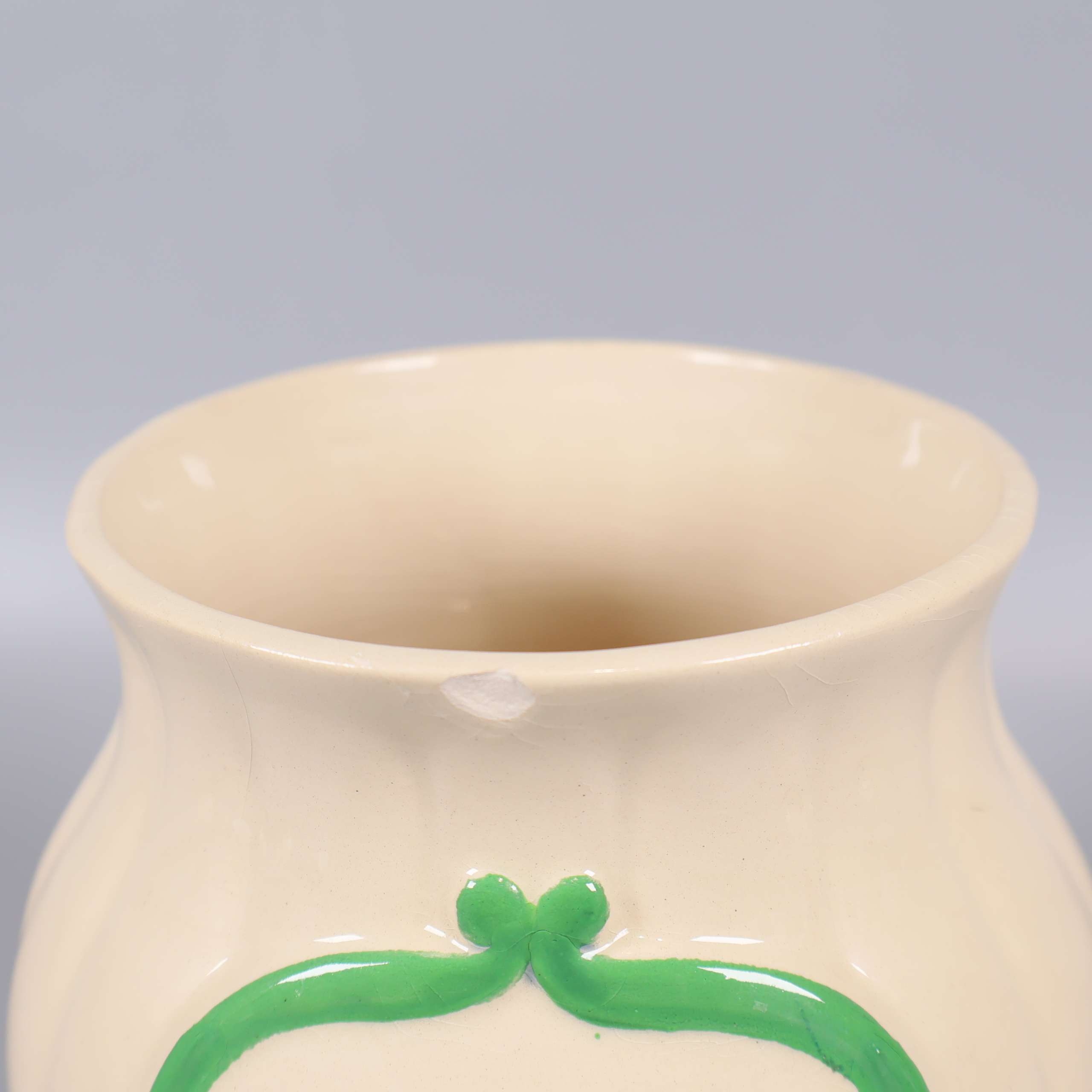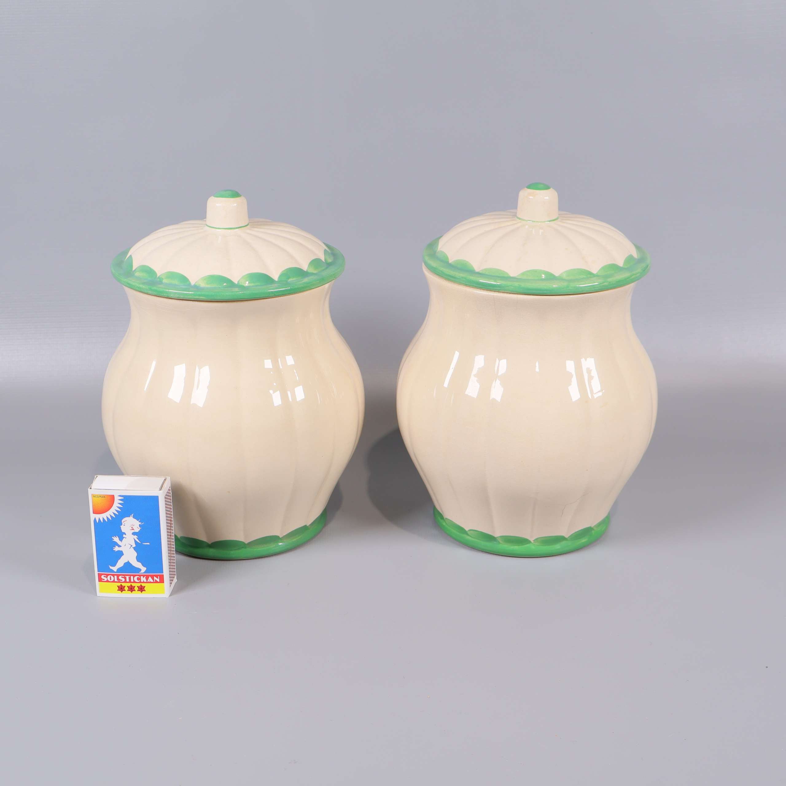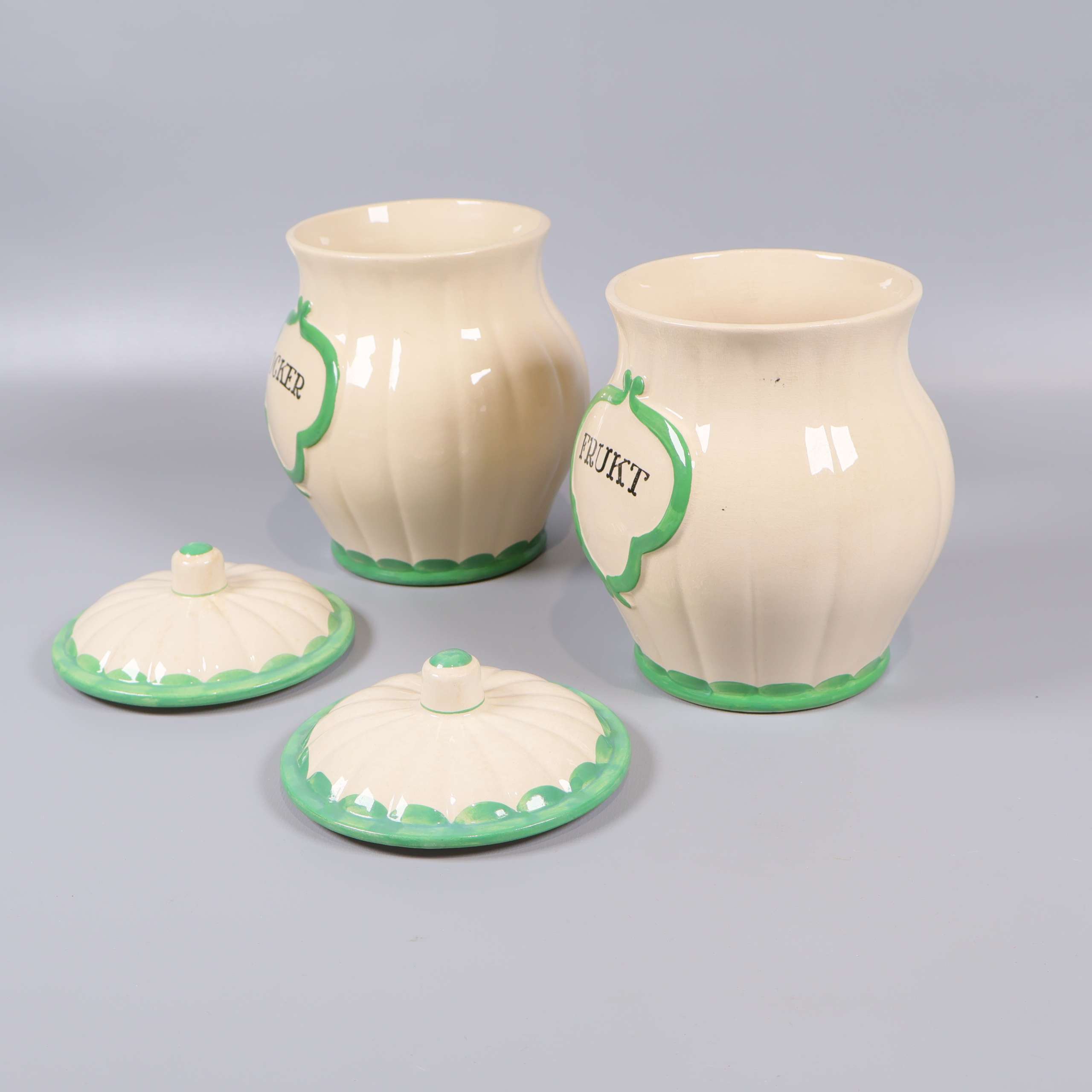 Två klassiska burkar med rundade former och lock, dekorerade med grön bård och tydlig text för socker och frukt på framsidan. Krämvit glaserad yta ger en tidlös känsla och burkarna passar fint som både dekoration och förvaring i köket.