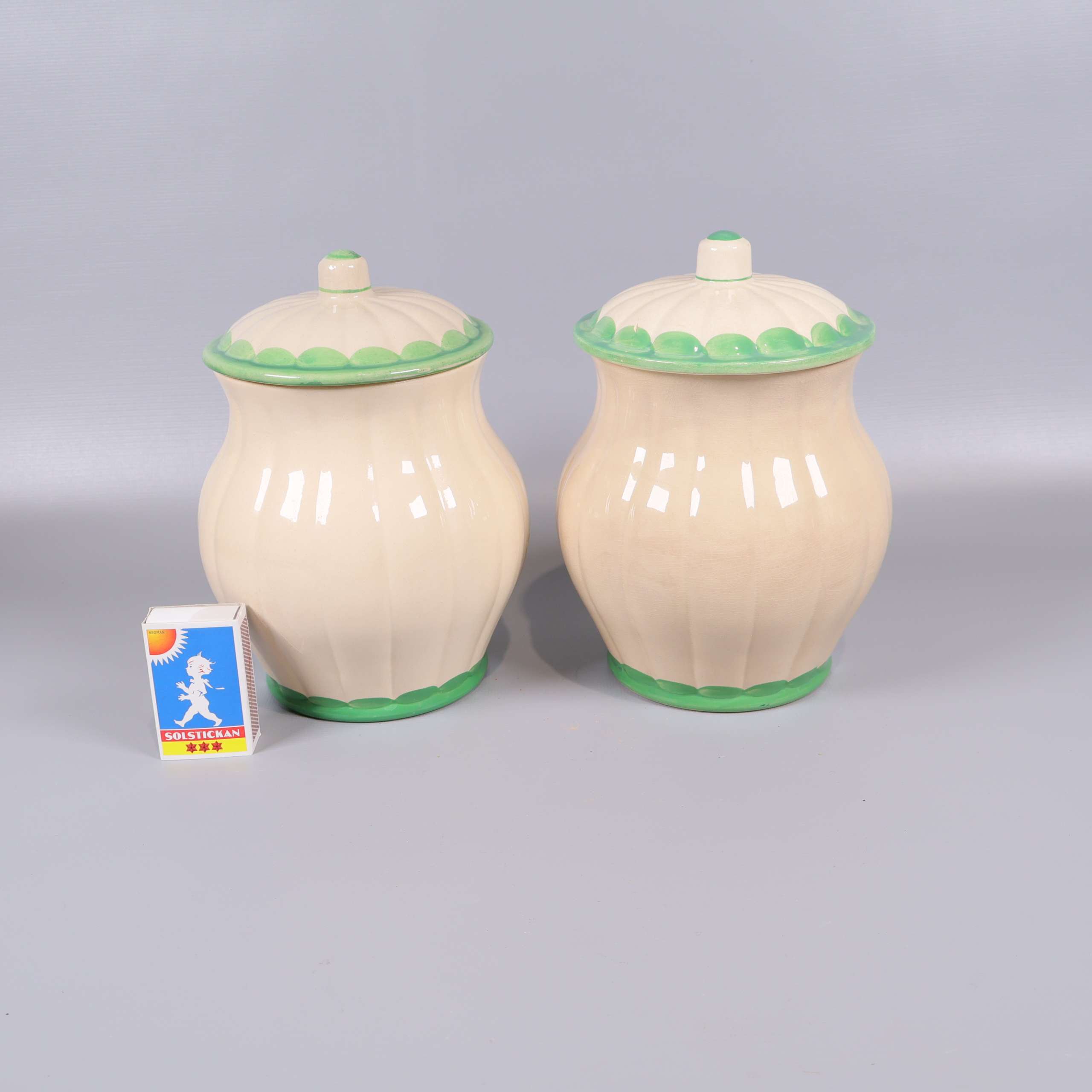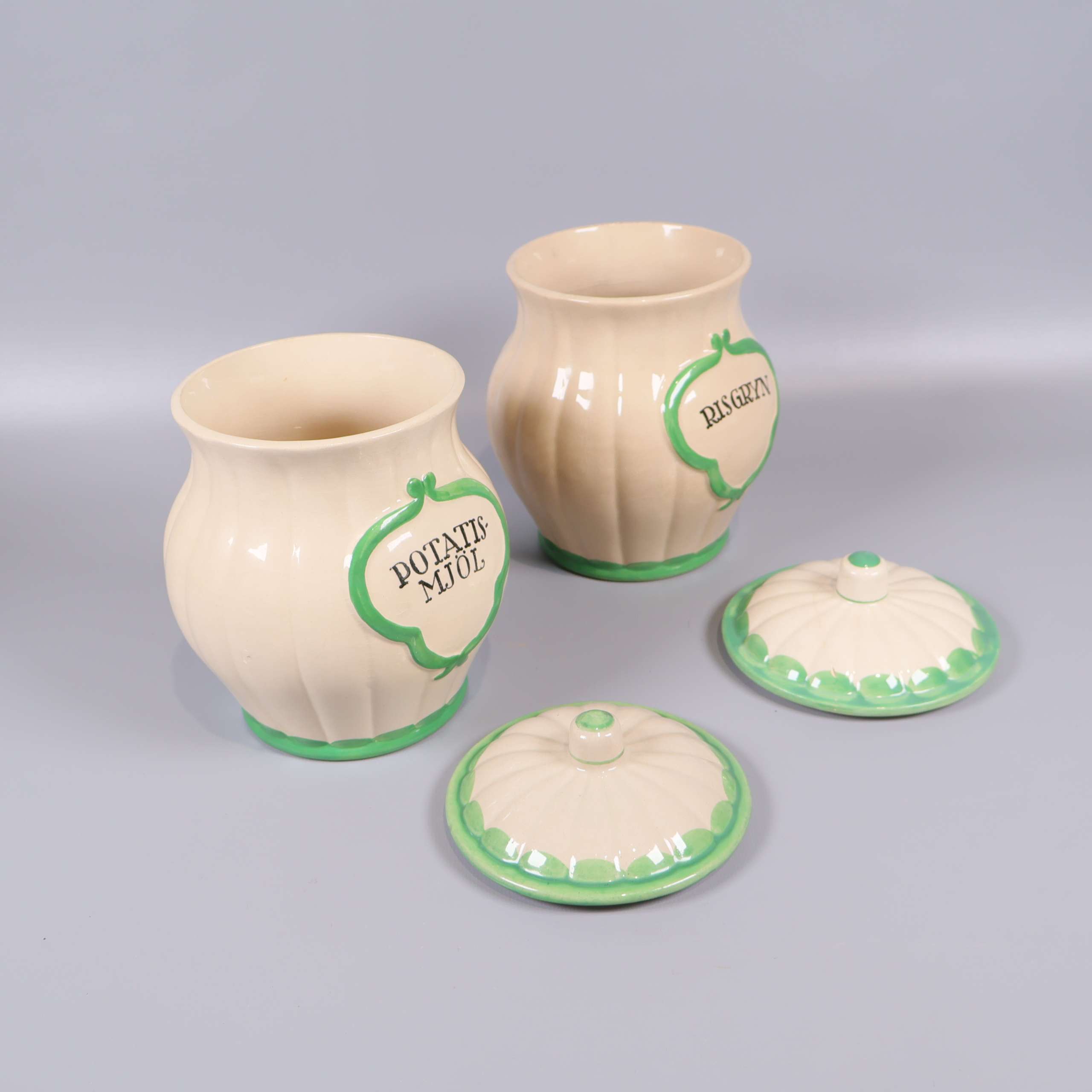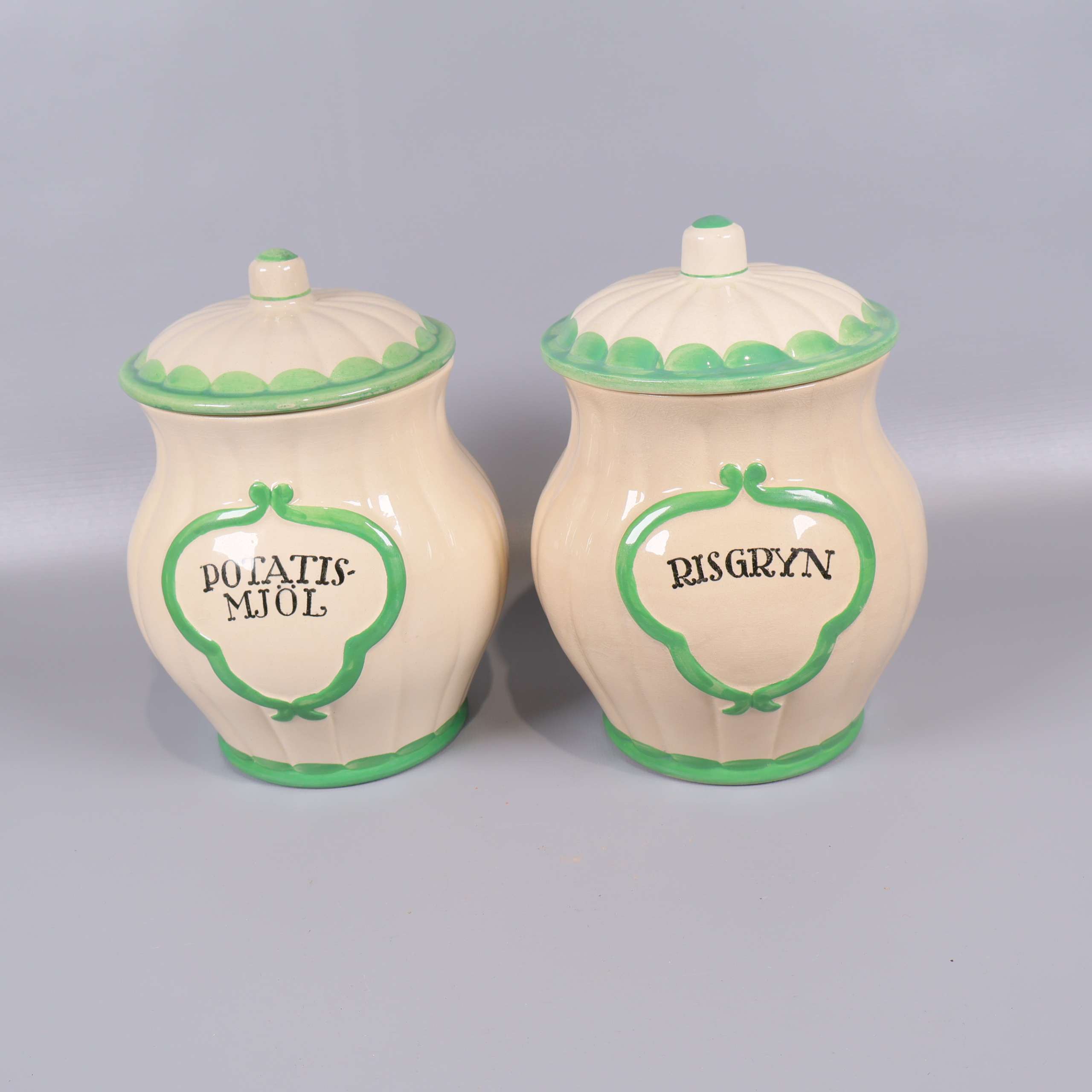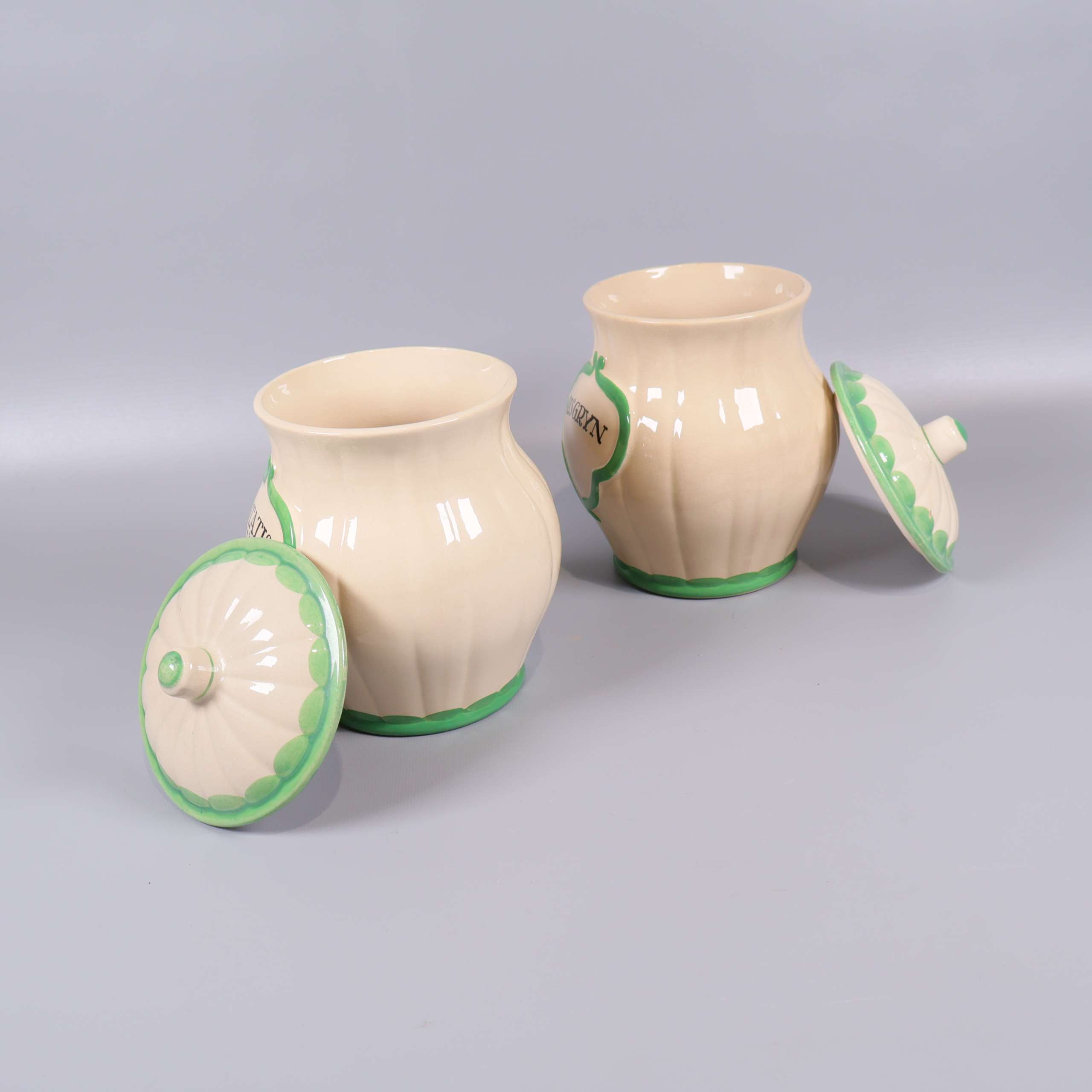 Två burkar i klassisk form med krämvit bas och gröna dekorativa detaljer. Locken följer samma färgtema och båda burkarna har tydlig märkning framtill för innehåll. Retro känsla som passar dig som uppskattar unik och färgglad köksförvaring.