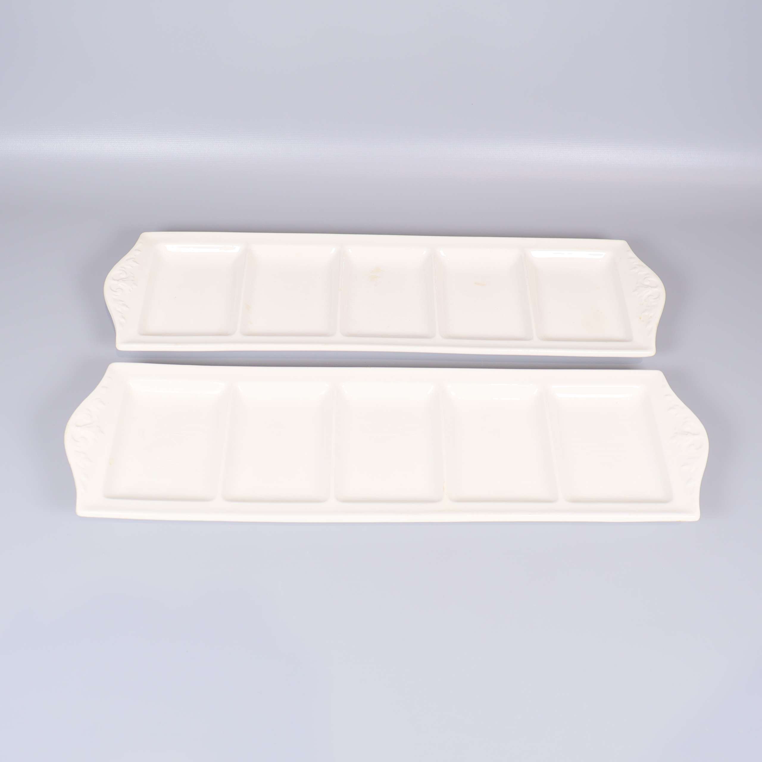 Två rektangulära serveringsfat med sex fack vardera i en mjukt krämvit nyans. Dekorativa lätt upphöjda detaljer på kortsidorna ger en klassisk känsla.