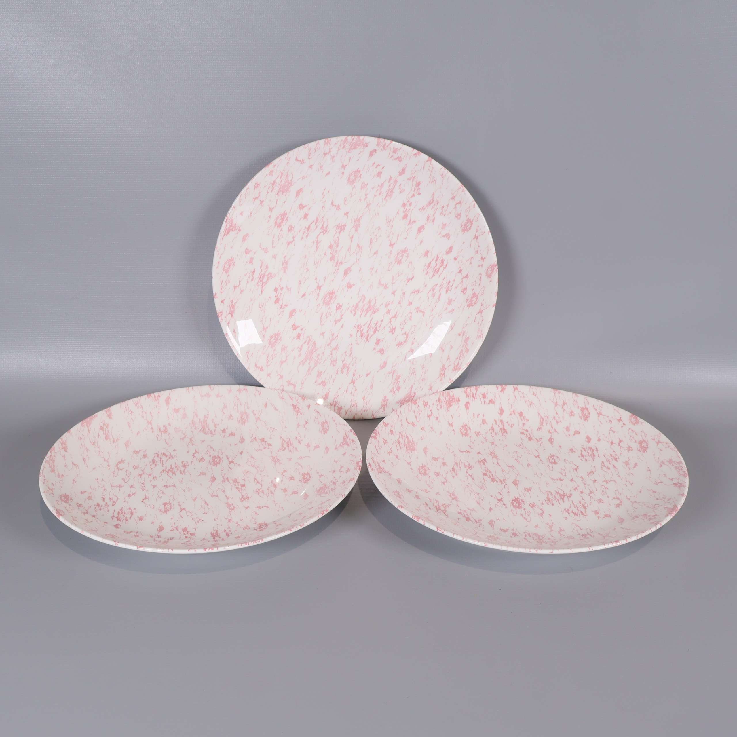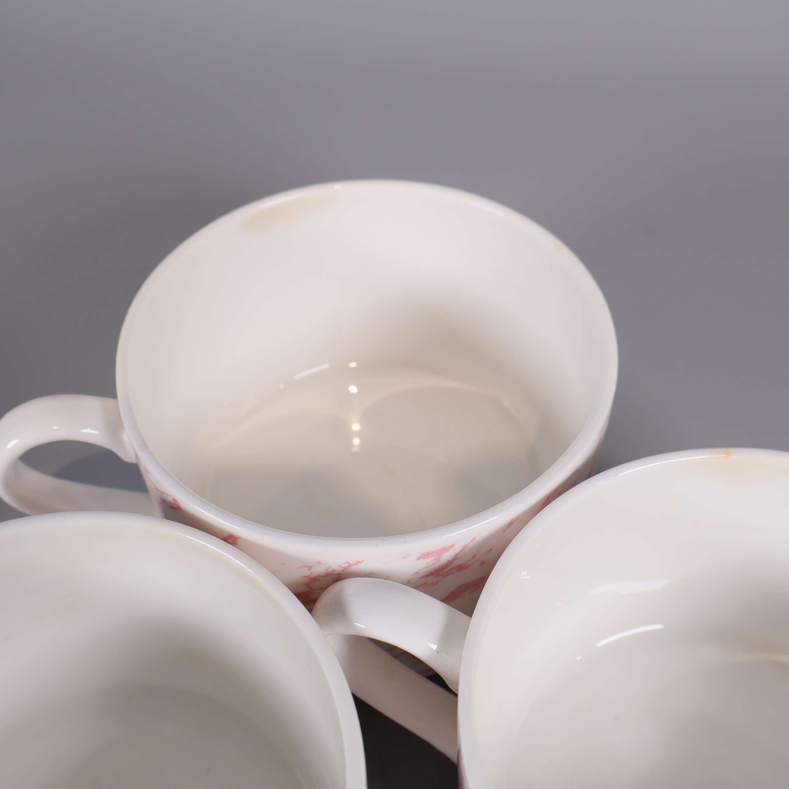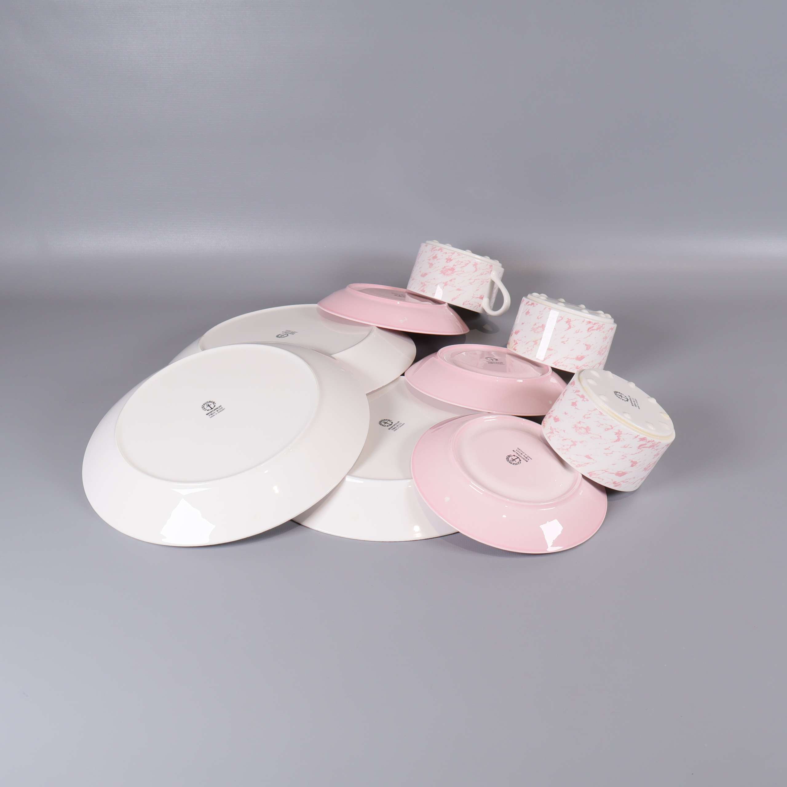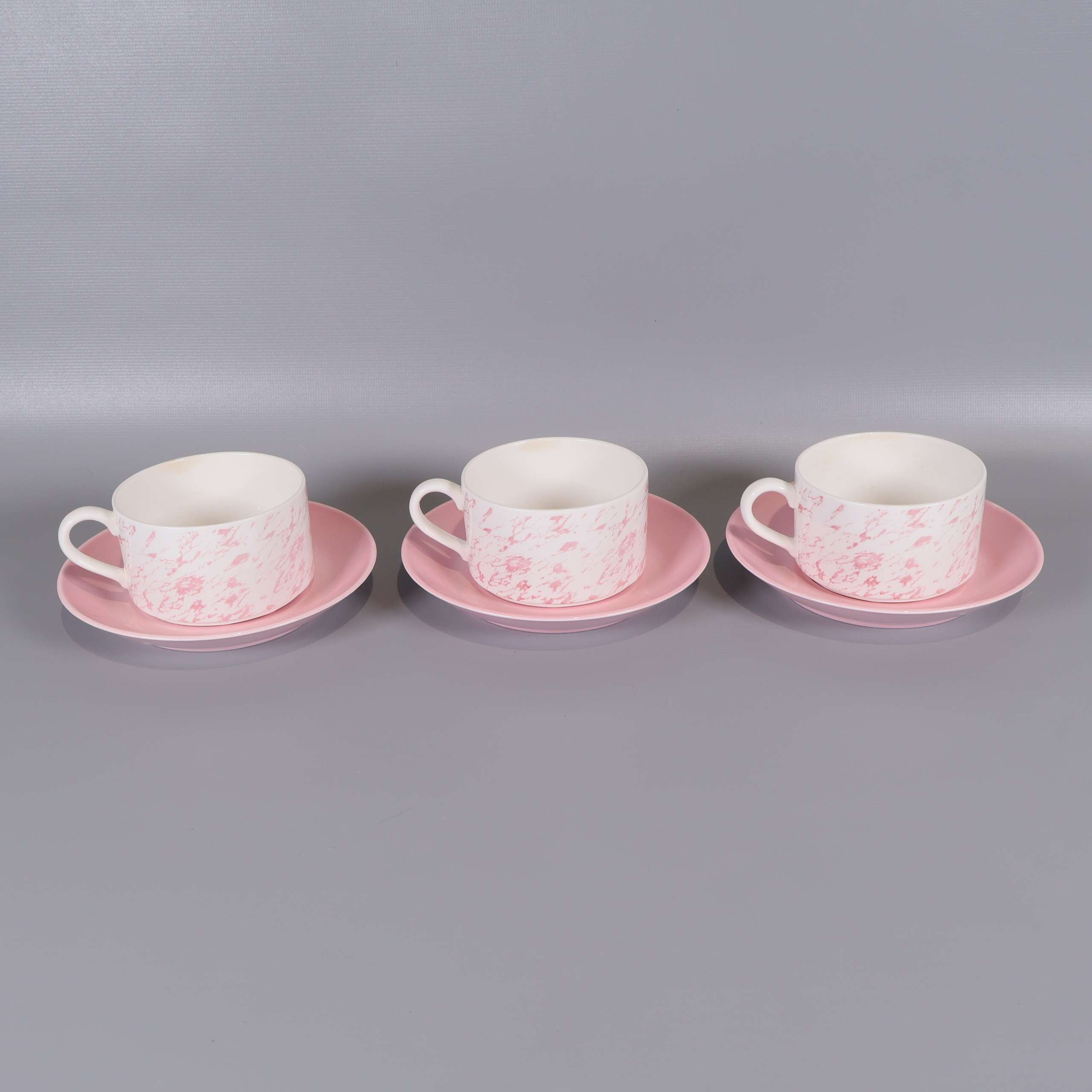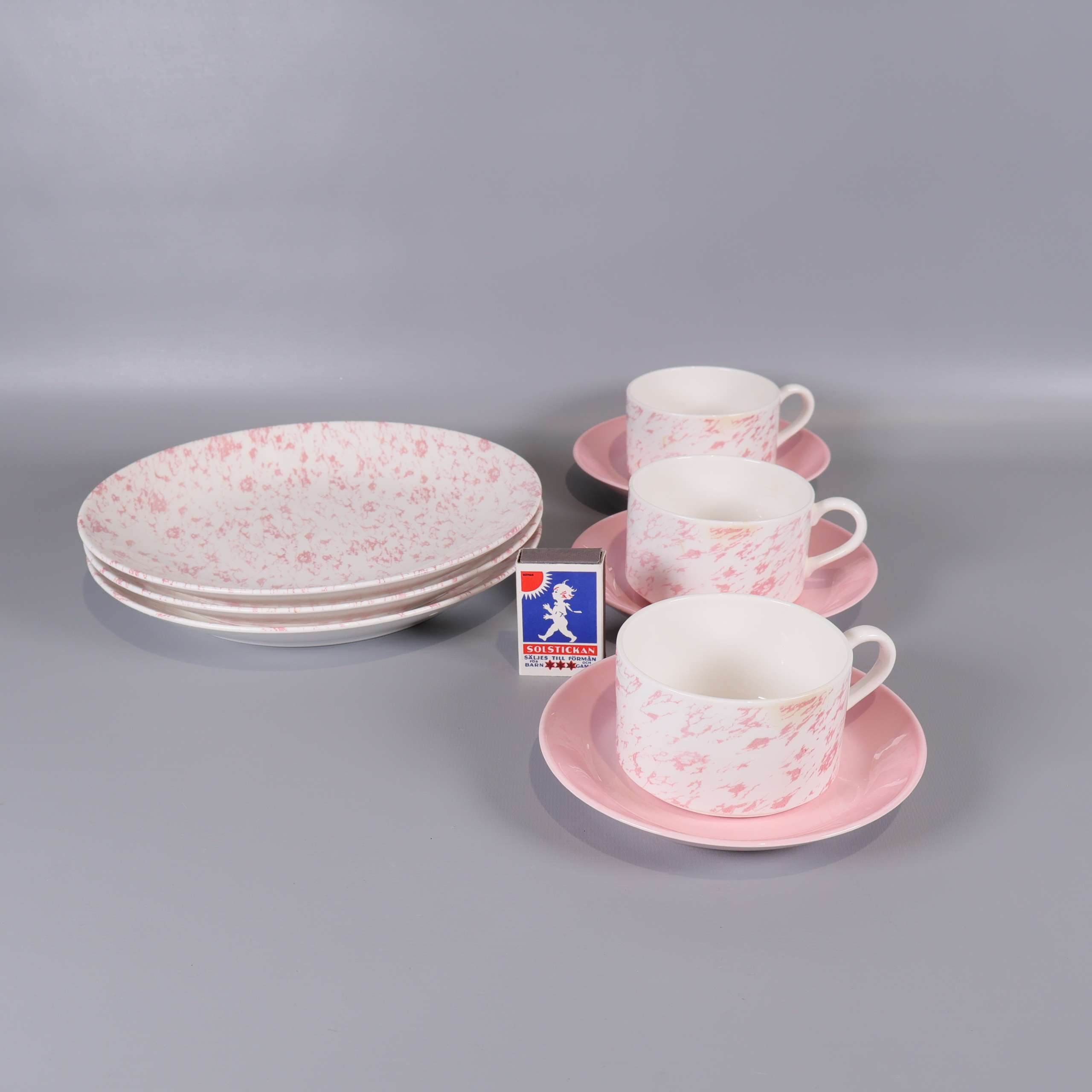 Fin kaffeservis i benporslin med subtilt rosa mönster och vit bas. Setet består av koppar, fat och assietter med elegant glans och lätt design, perfekt för dig som gillar klassisk men lekfull stil.