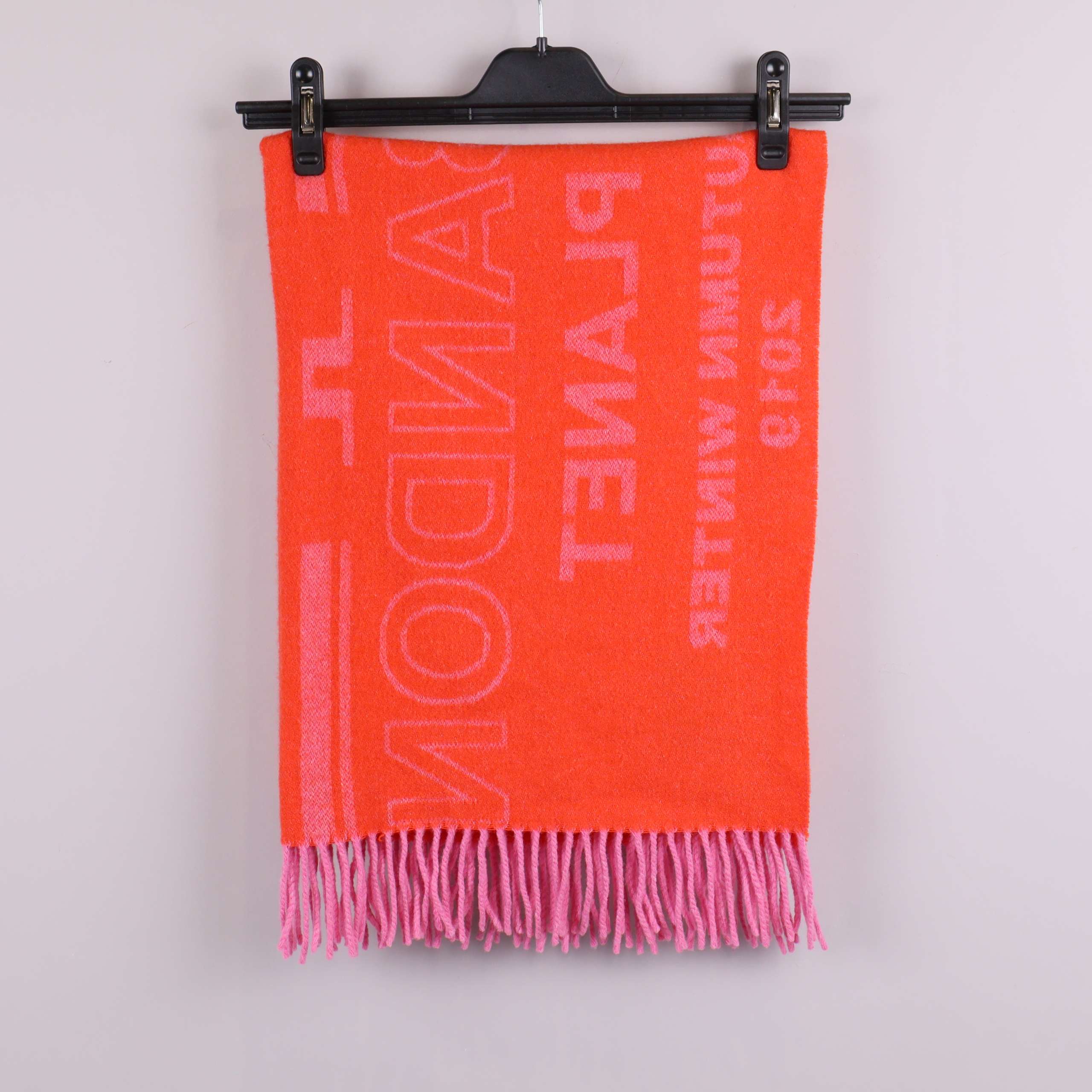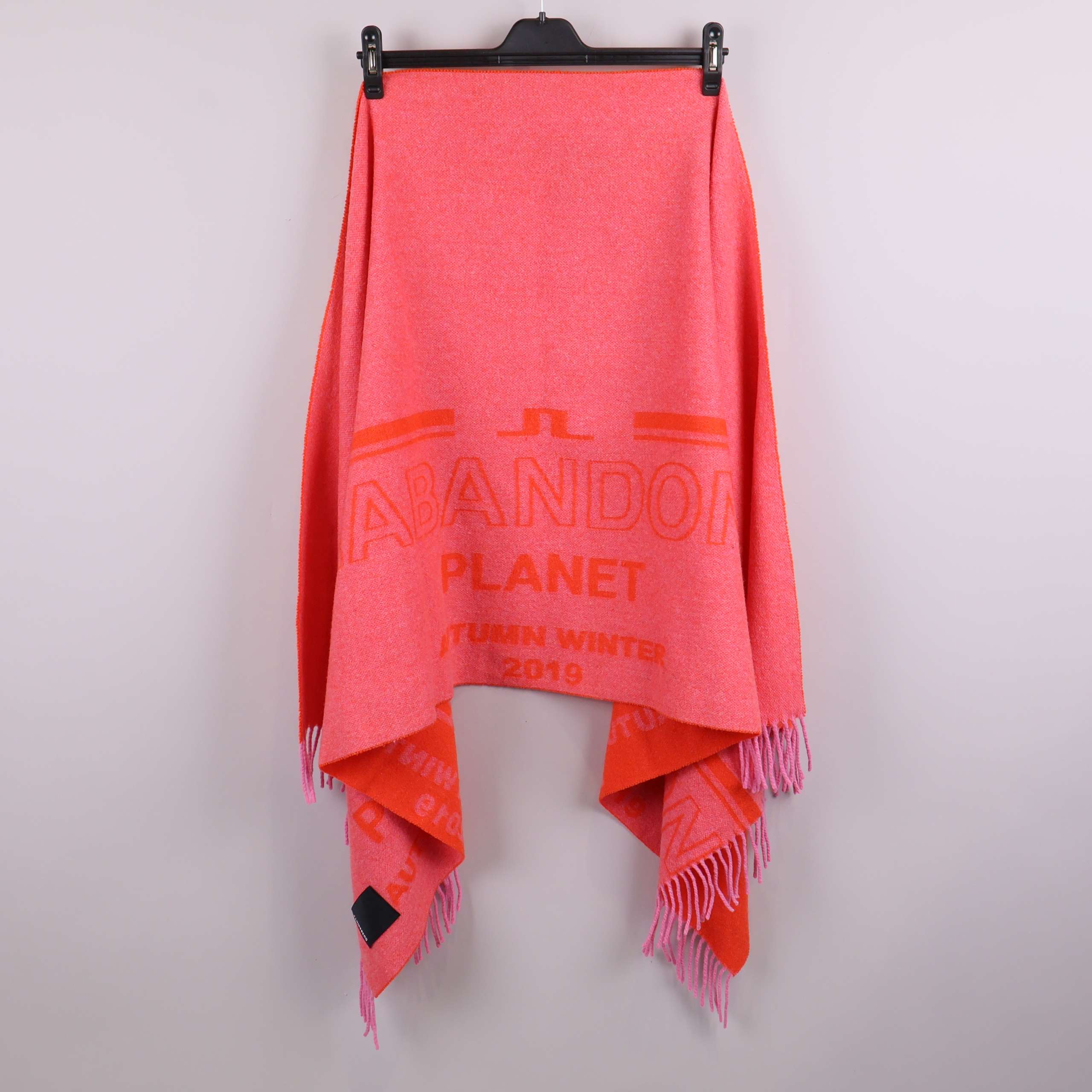 Färgstark halduk med två olika nyanser av rosa och orange samt dekorativa fransar. Stor tryckt text och JL-logo ger en modern touch tillsammans med den blickfångande färgkombon.
