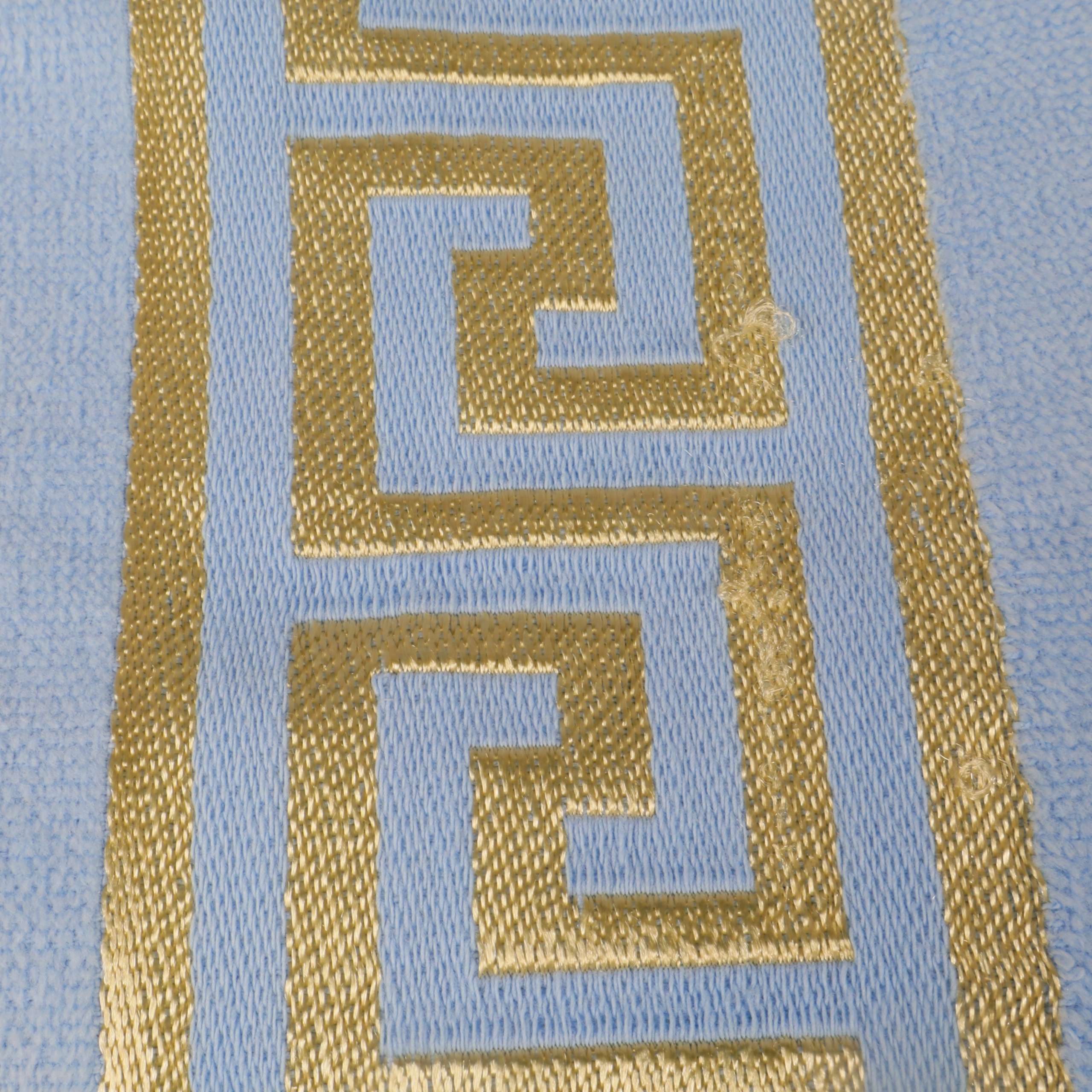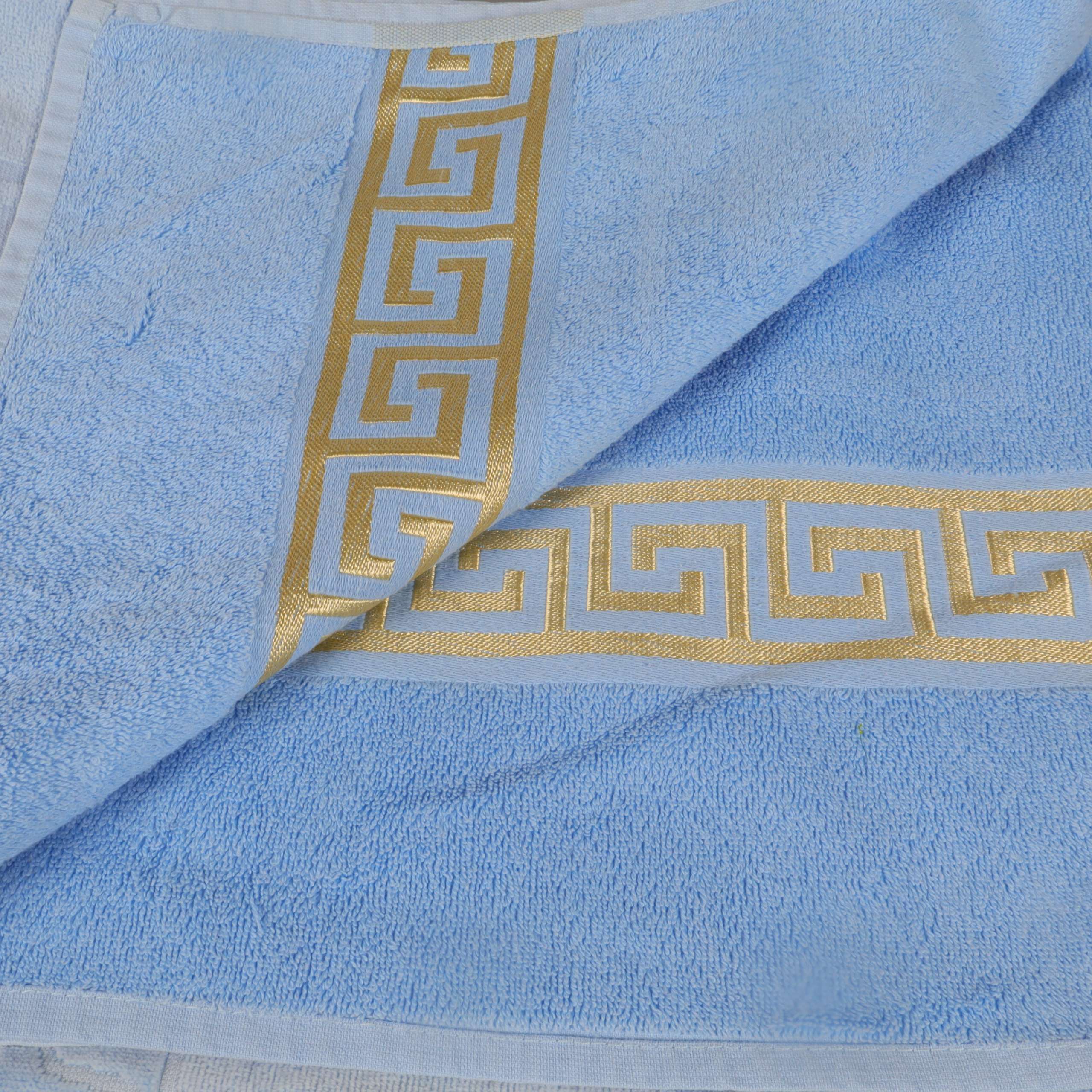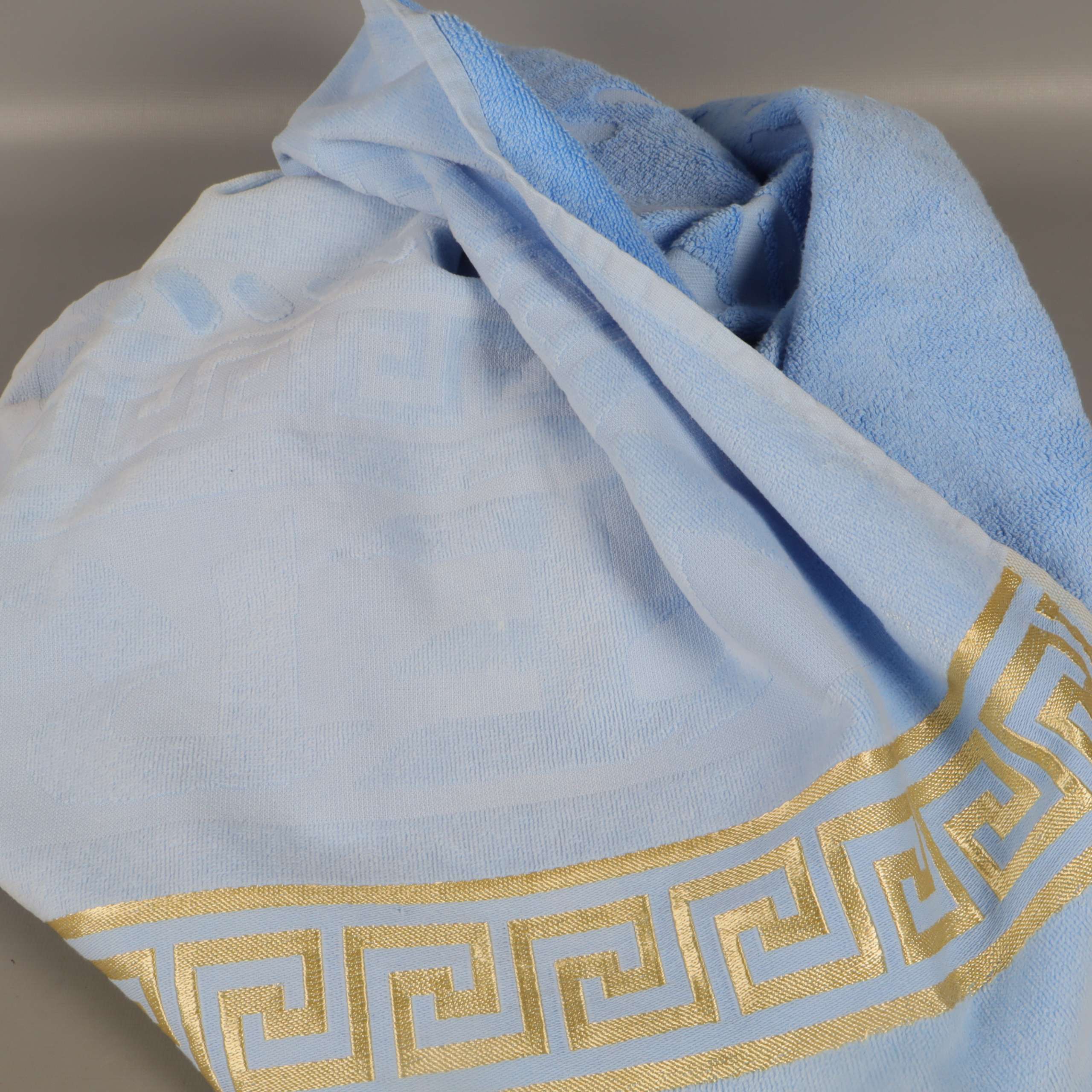Stor ljusblå handduk med elegant dekorbård i guld längs ena kanten och jacquardvävt solmotiv. Mjuk frottékänsla och klassisk design ger ett fräscht intryck i badrummet.