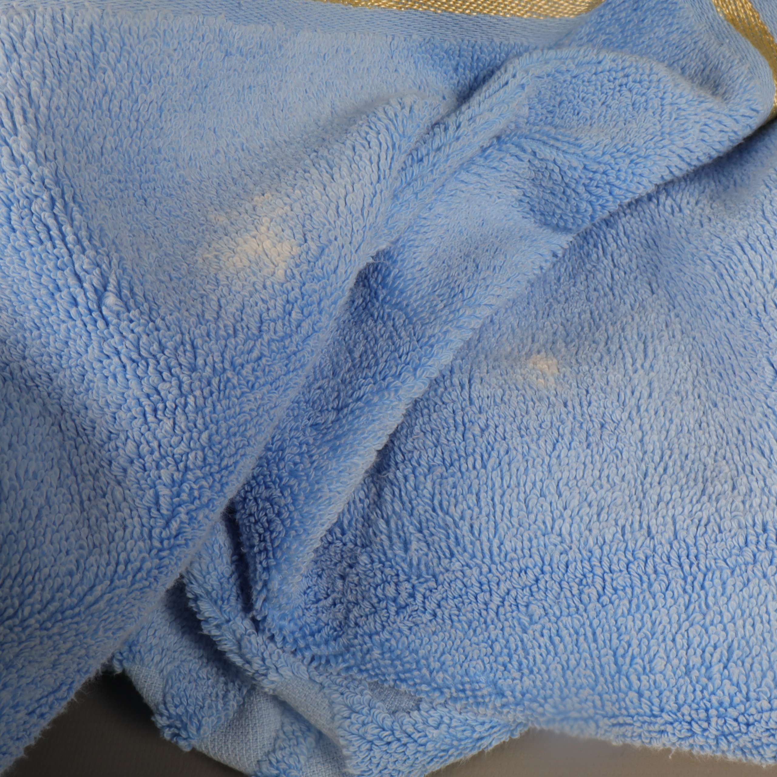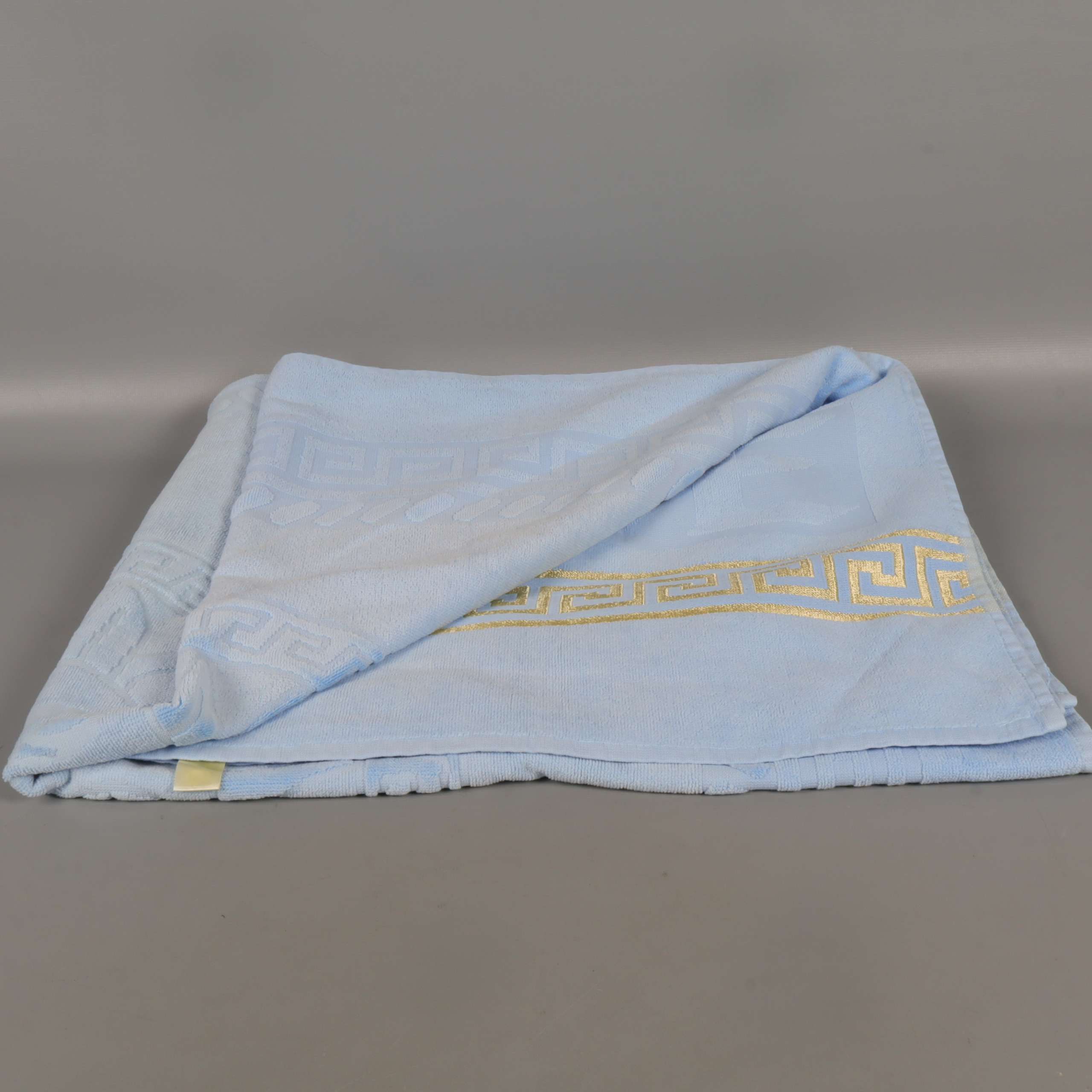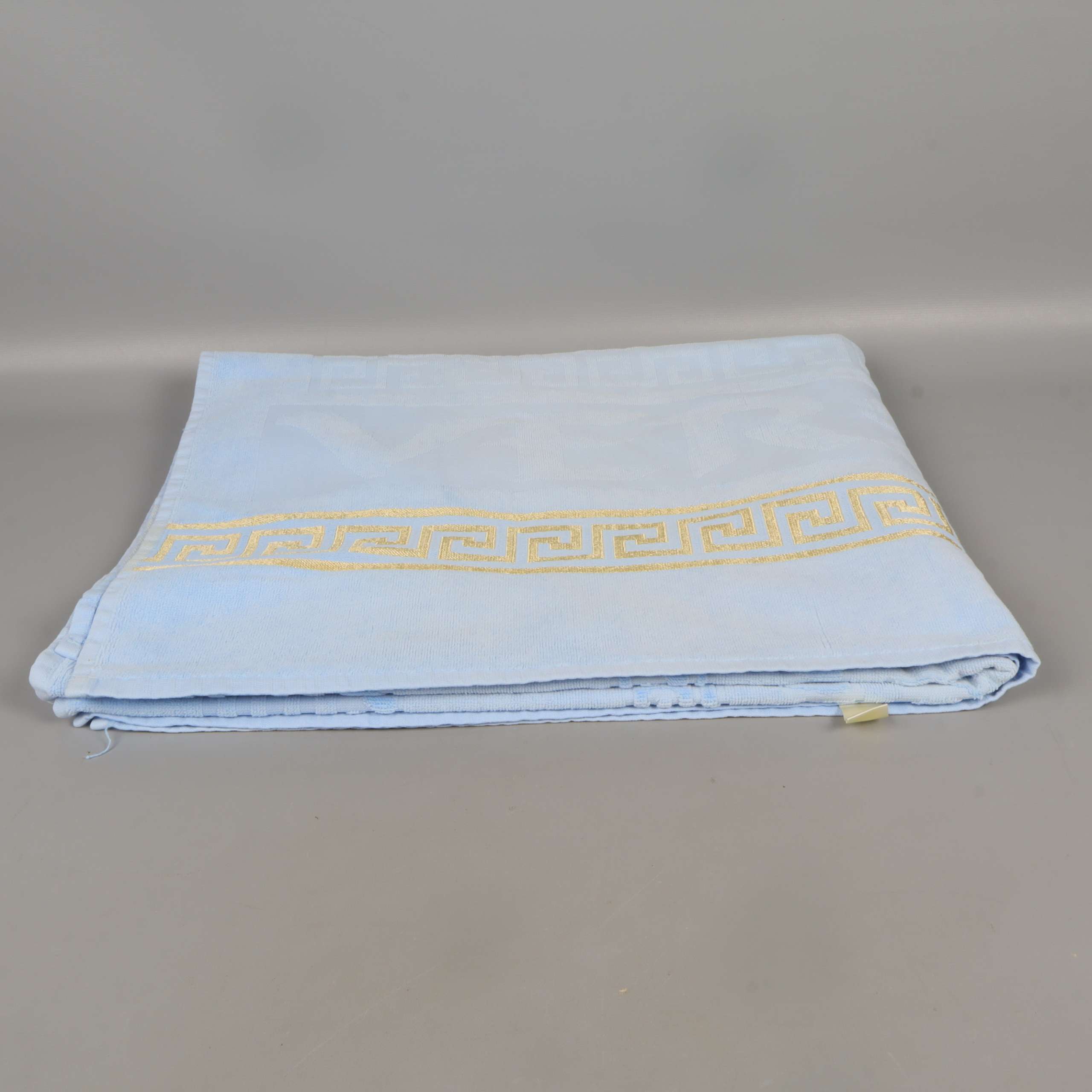 Stor ljusblå handduk med elegant dekorbård i guld längs ena kanten och jacquardvävt solmotiv. Mjuk frottékänsla och klassisk design ger ett fräscht intryck i badrummet.