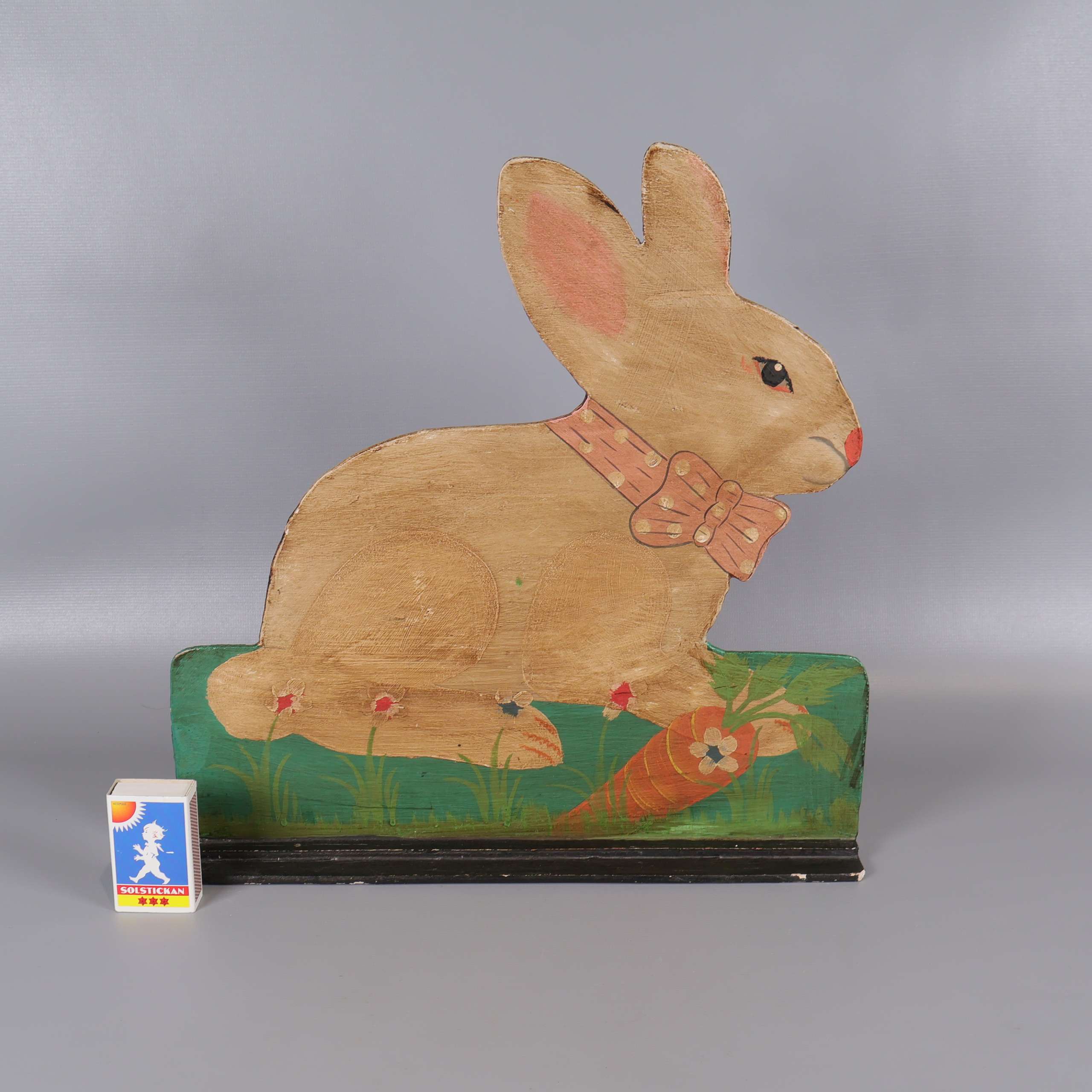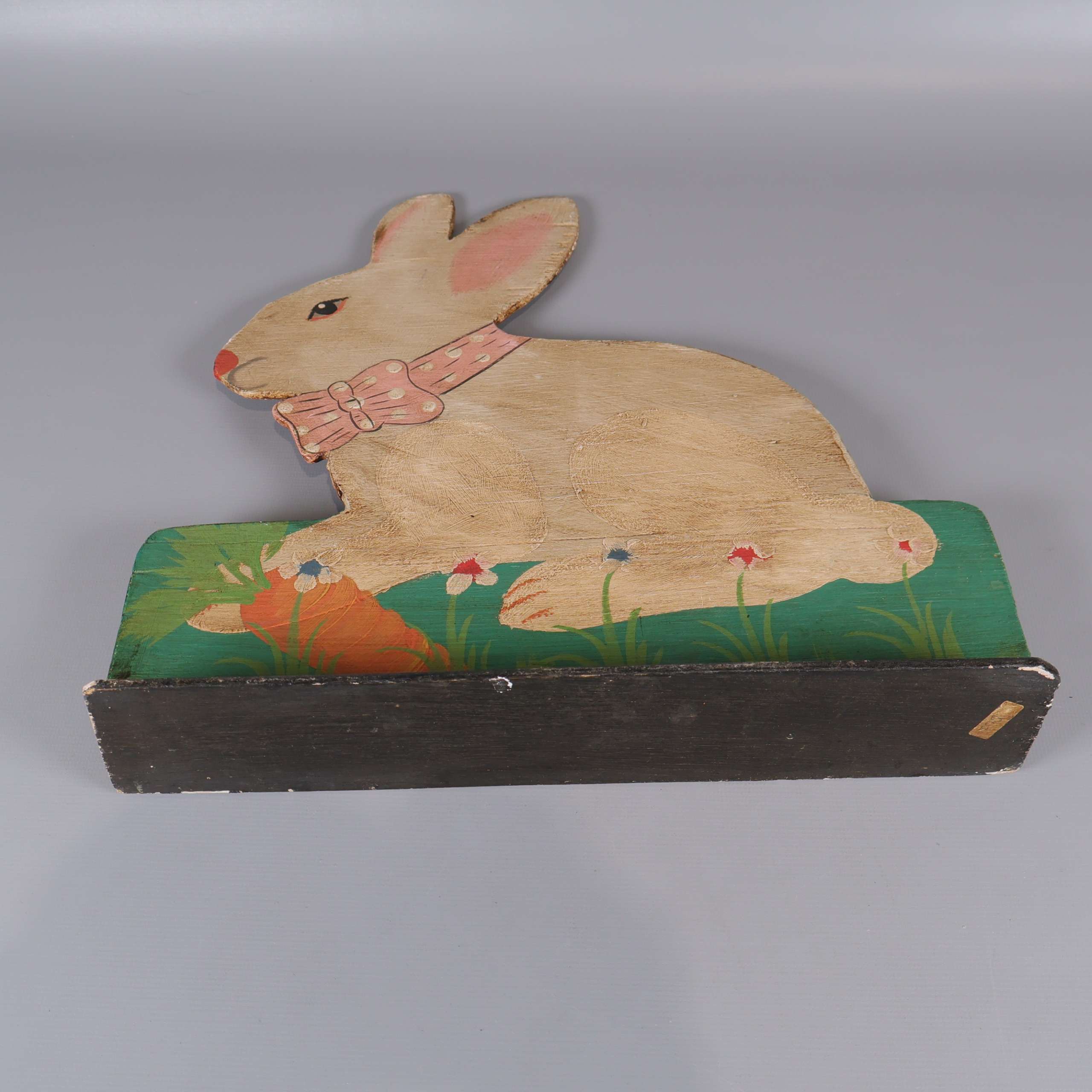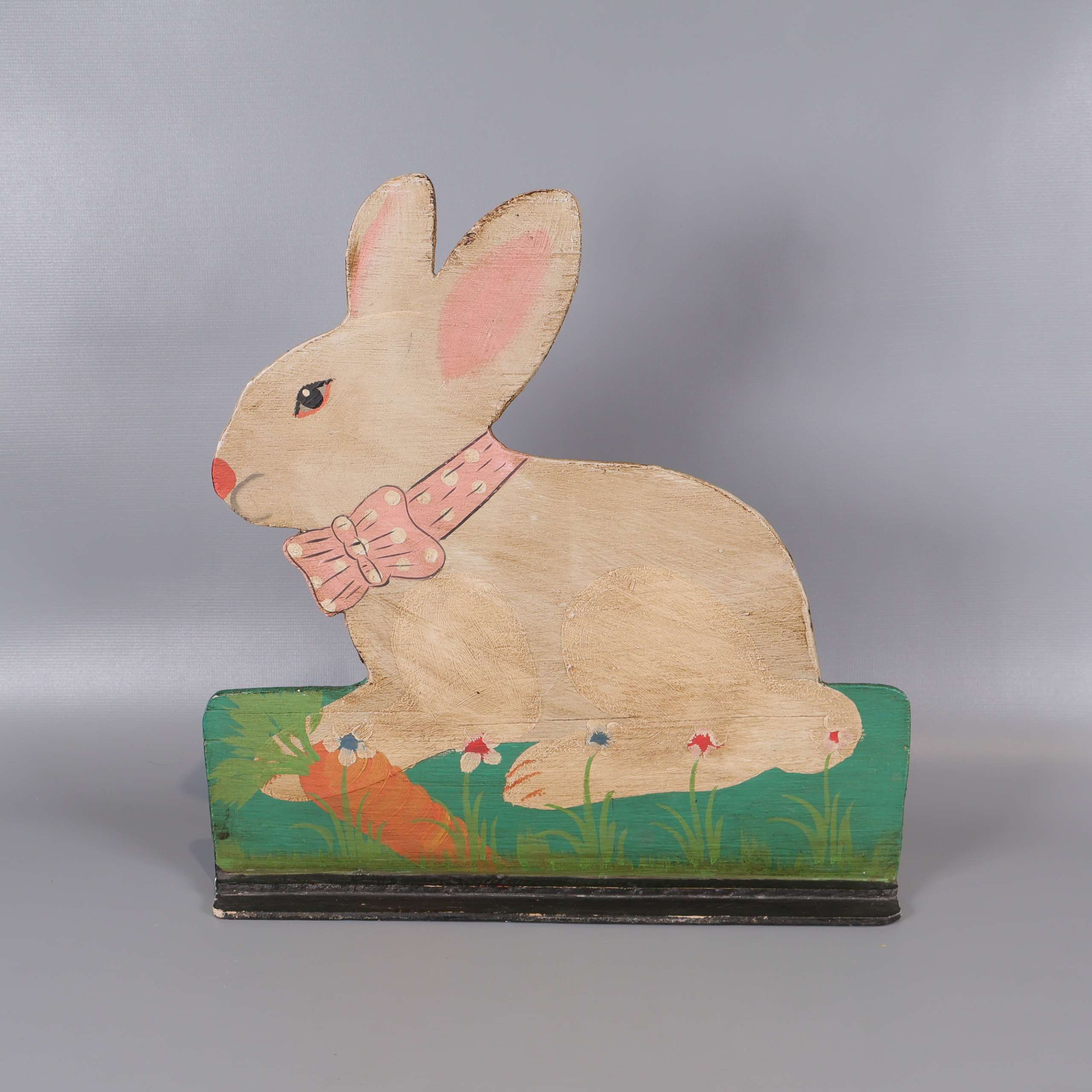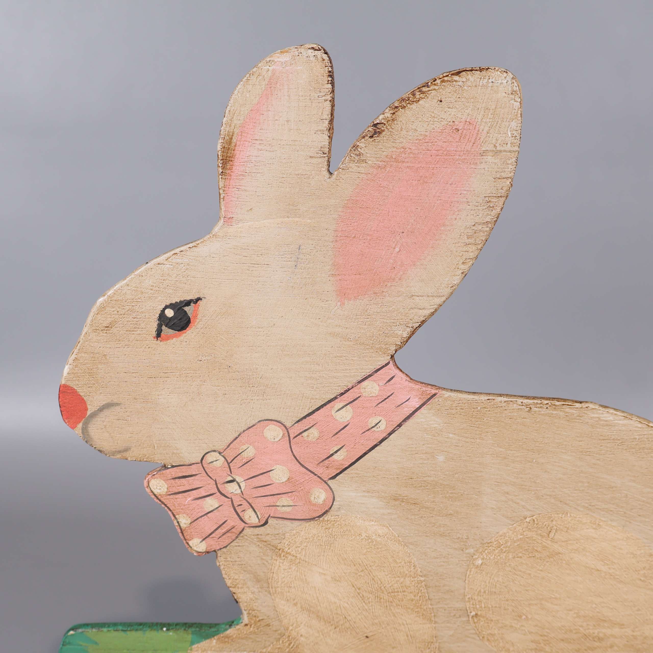 Charmig handmålad dekoration i form av en kanin med rosa detaljer och rosett, stående på en färgglad fot med gräs och morot. Perfekt för dig som gillar unika inredningsdetaljer med vintage vibe och lekfull stil.