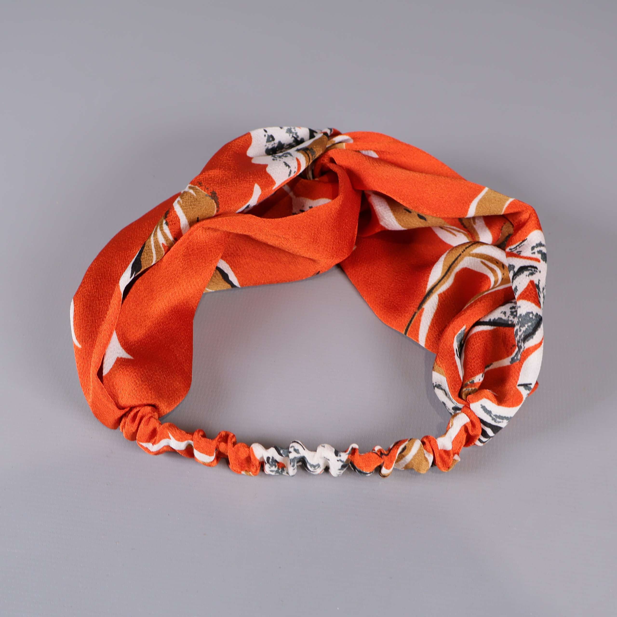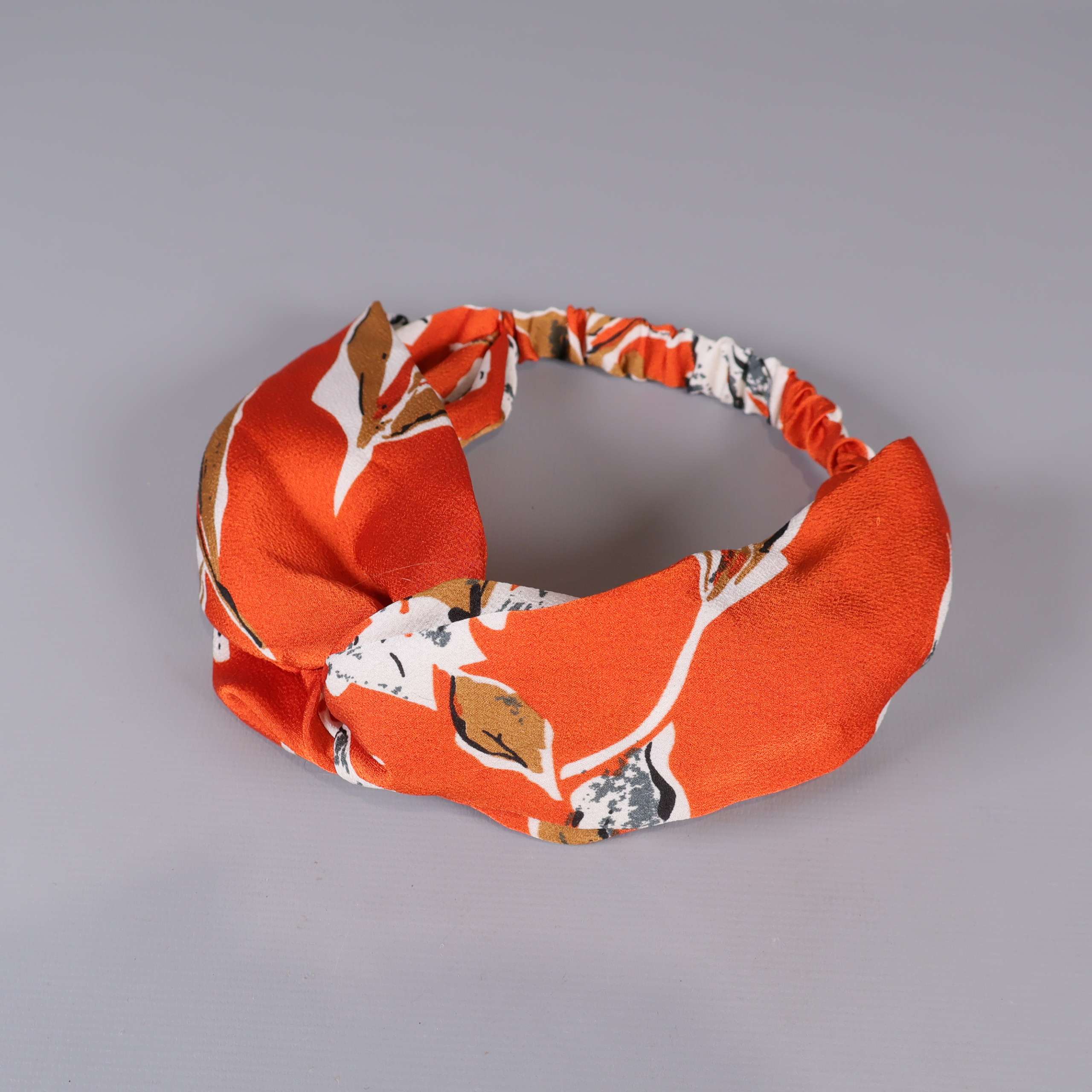 Trendig hårband med bred design i varmt orange tyg med vita och ljusbruna blommiga inslag. Elastisk bakdel för flexibel passform och stilren twist framtill. Passar till att pigga upp vilken look som helst med en touch av retrofeeling och lekfullt blommönster.