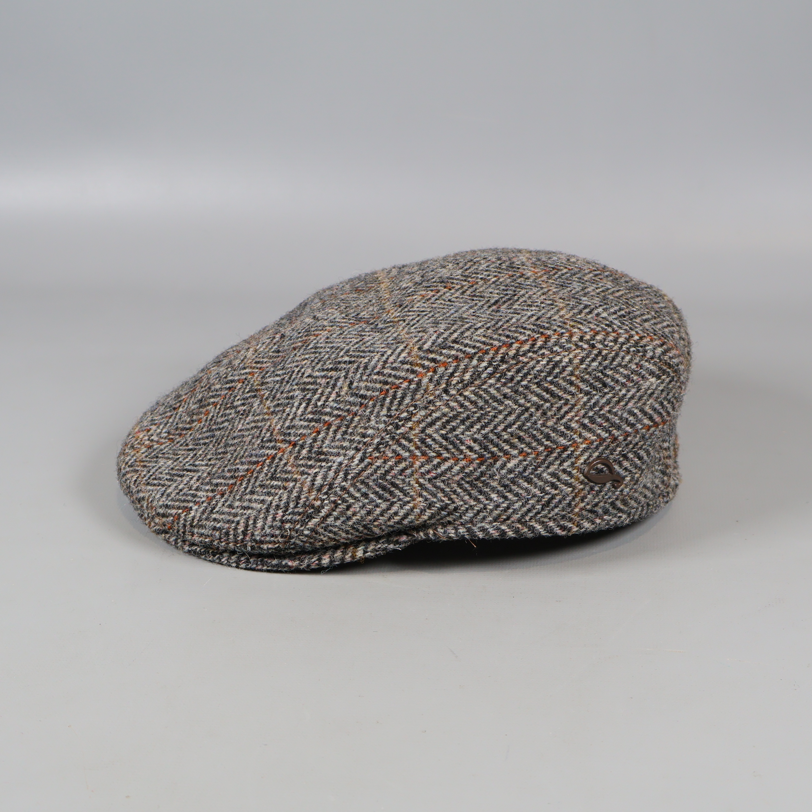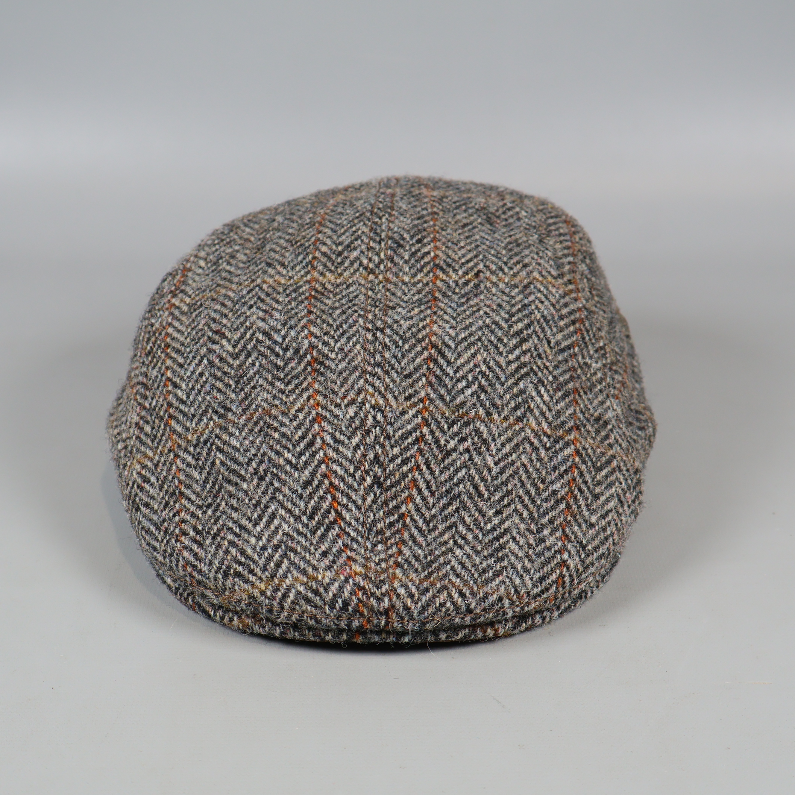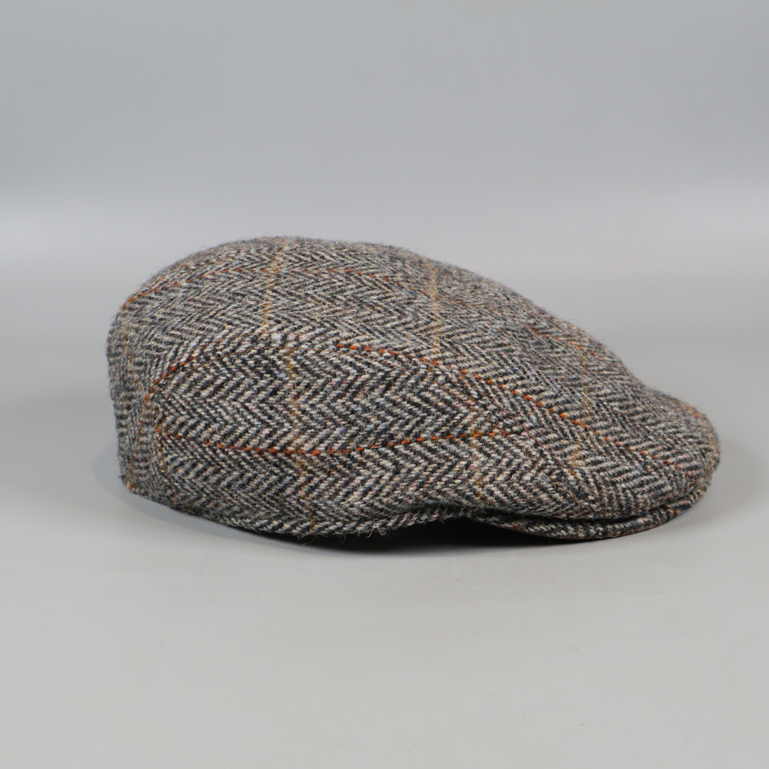 En stilig tweedkeps i klassisk fiskbensmönstring med toner av grått, brunt och inslag av orange.