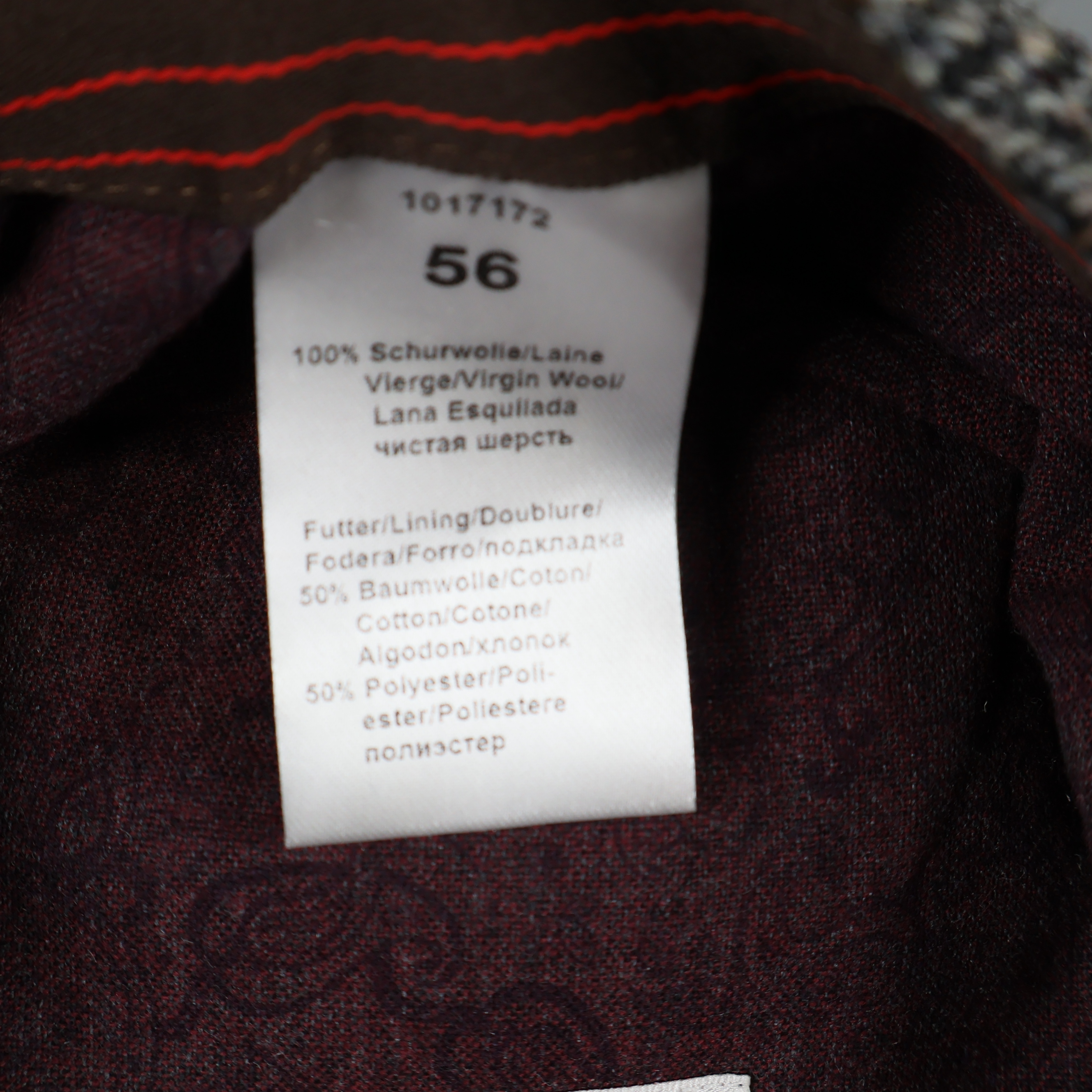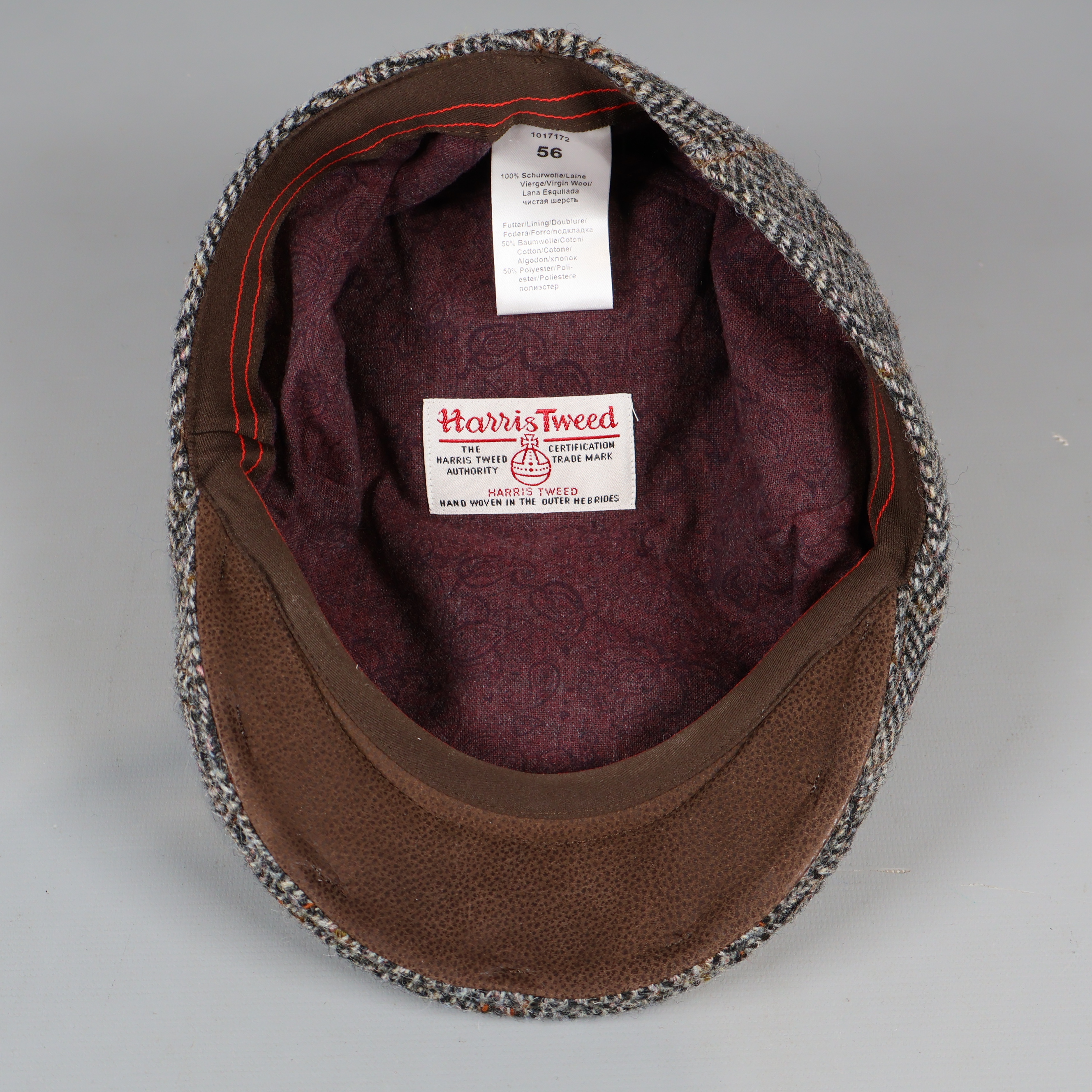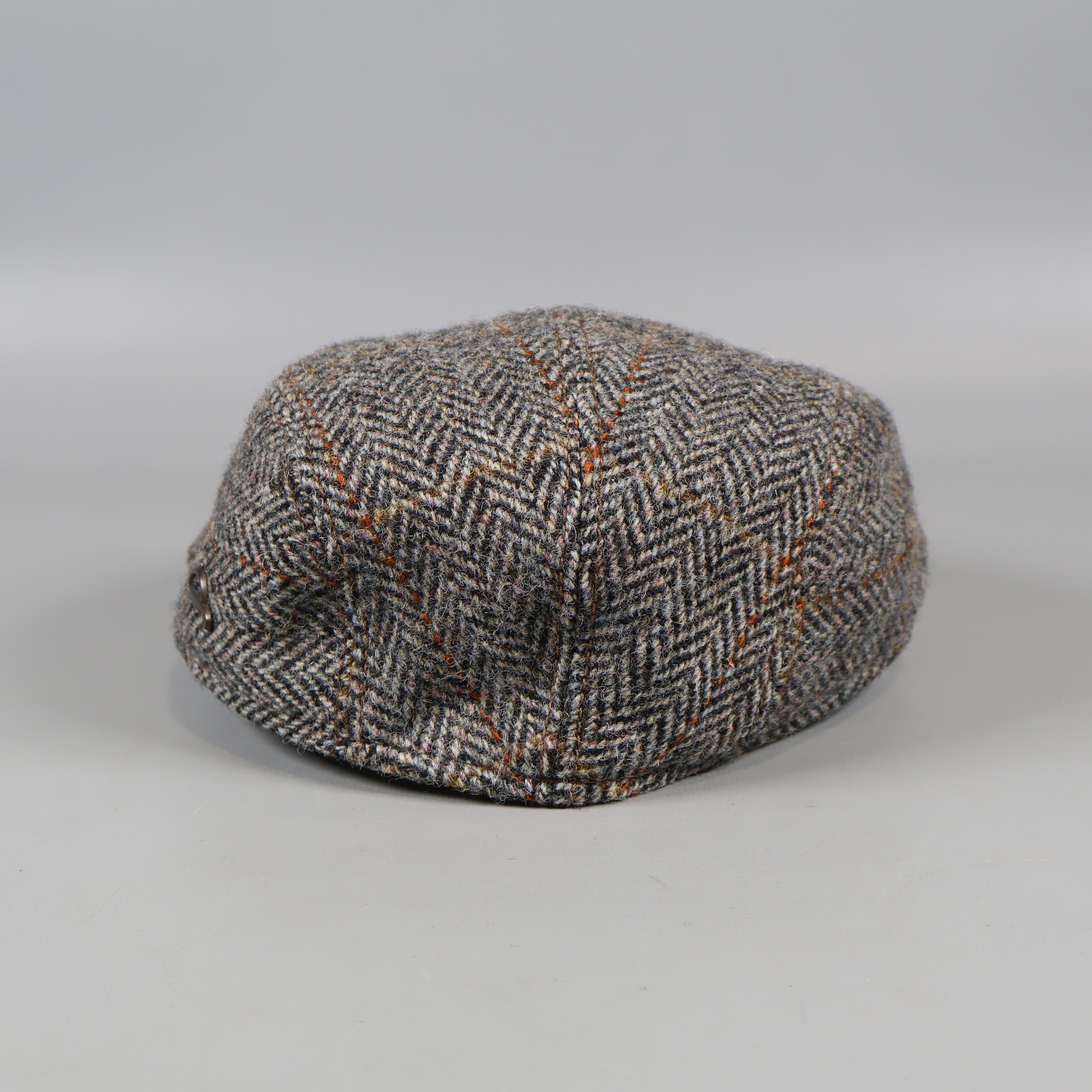 En stilig tweedkeps i klassisk fiskbensmönstring med toner av grått, brunt och inslag av orange.