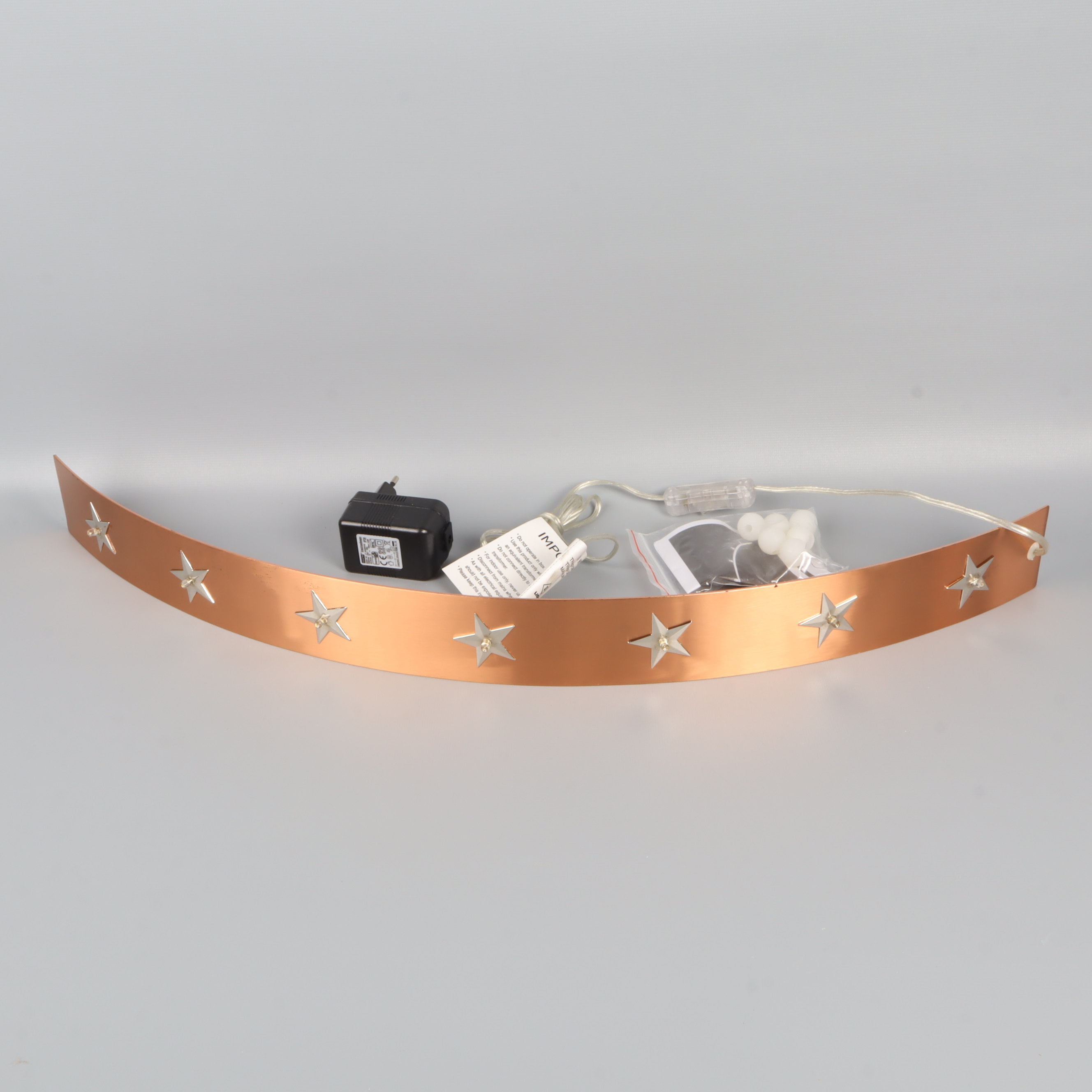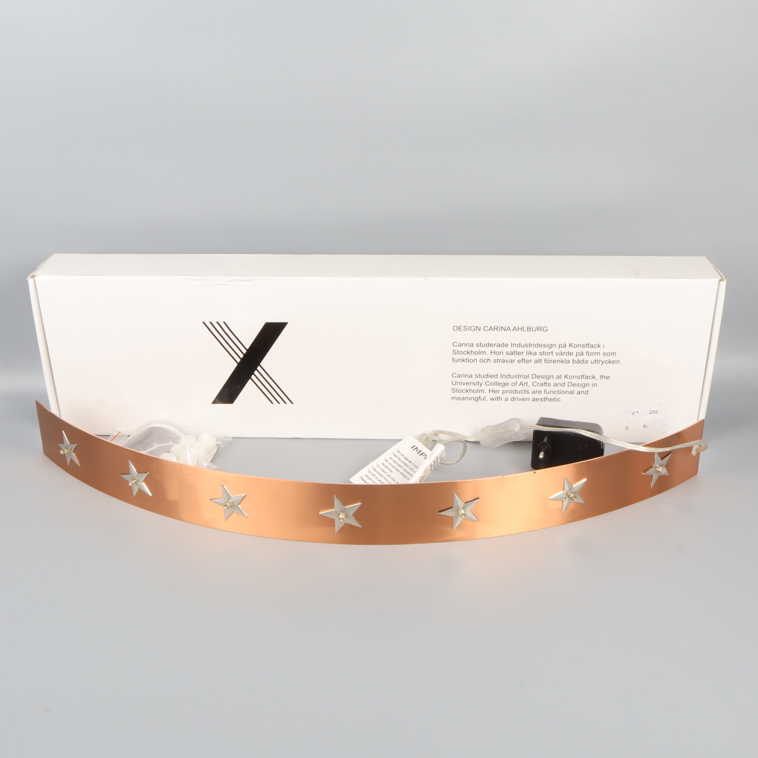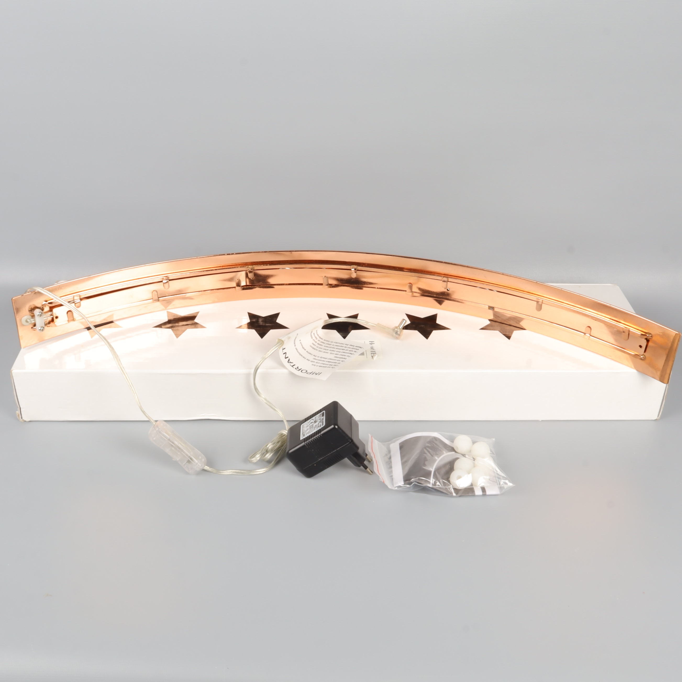 Elektrisk adventsljusstake med bågformad design och dekorativa utskurna stjärnor i metall. Kommer med tillhörande sladd, transformator och originalförpackning.