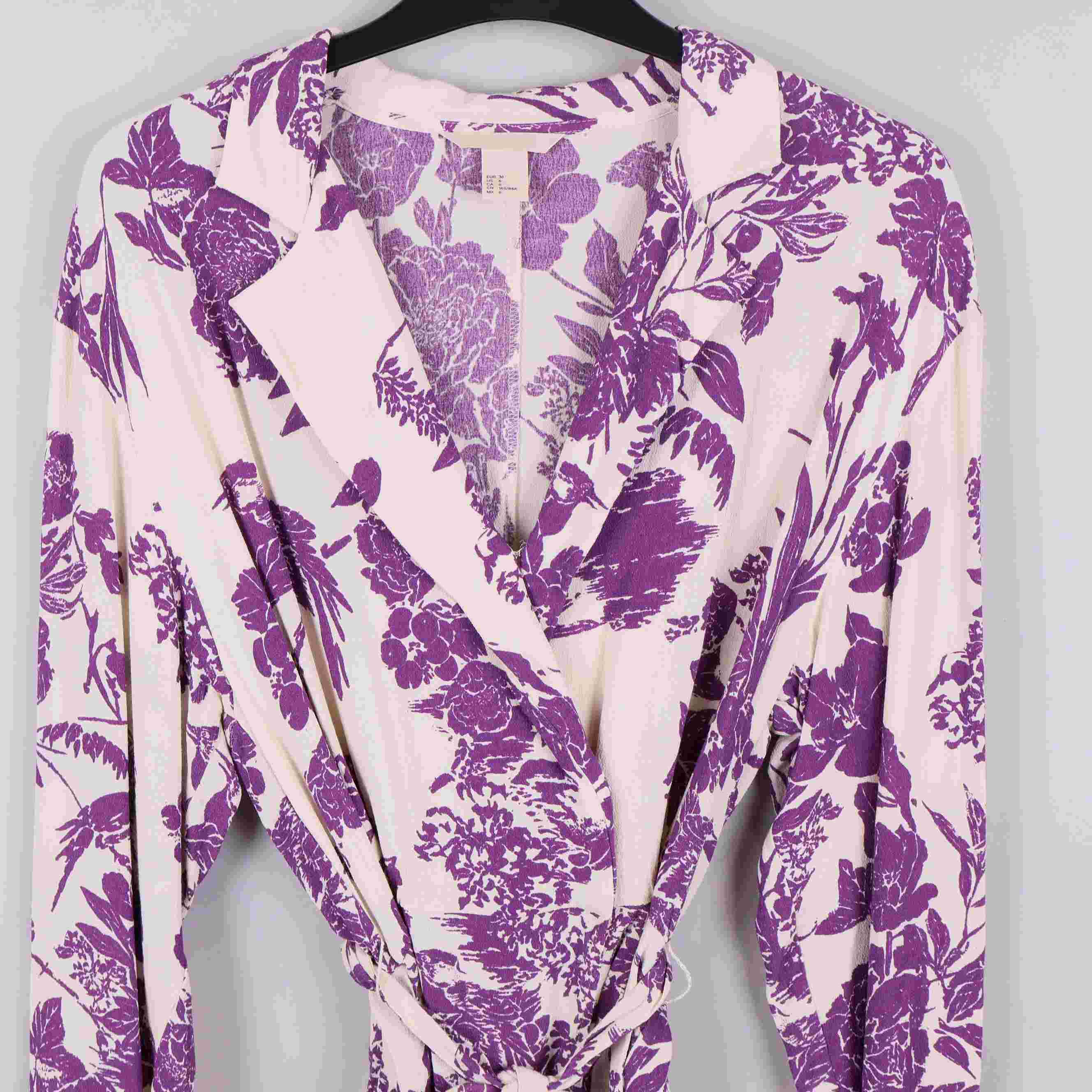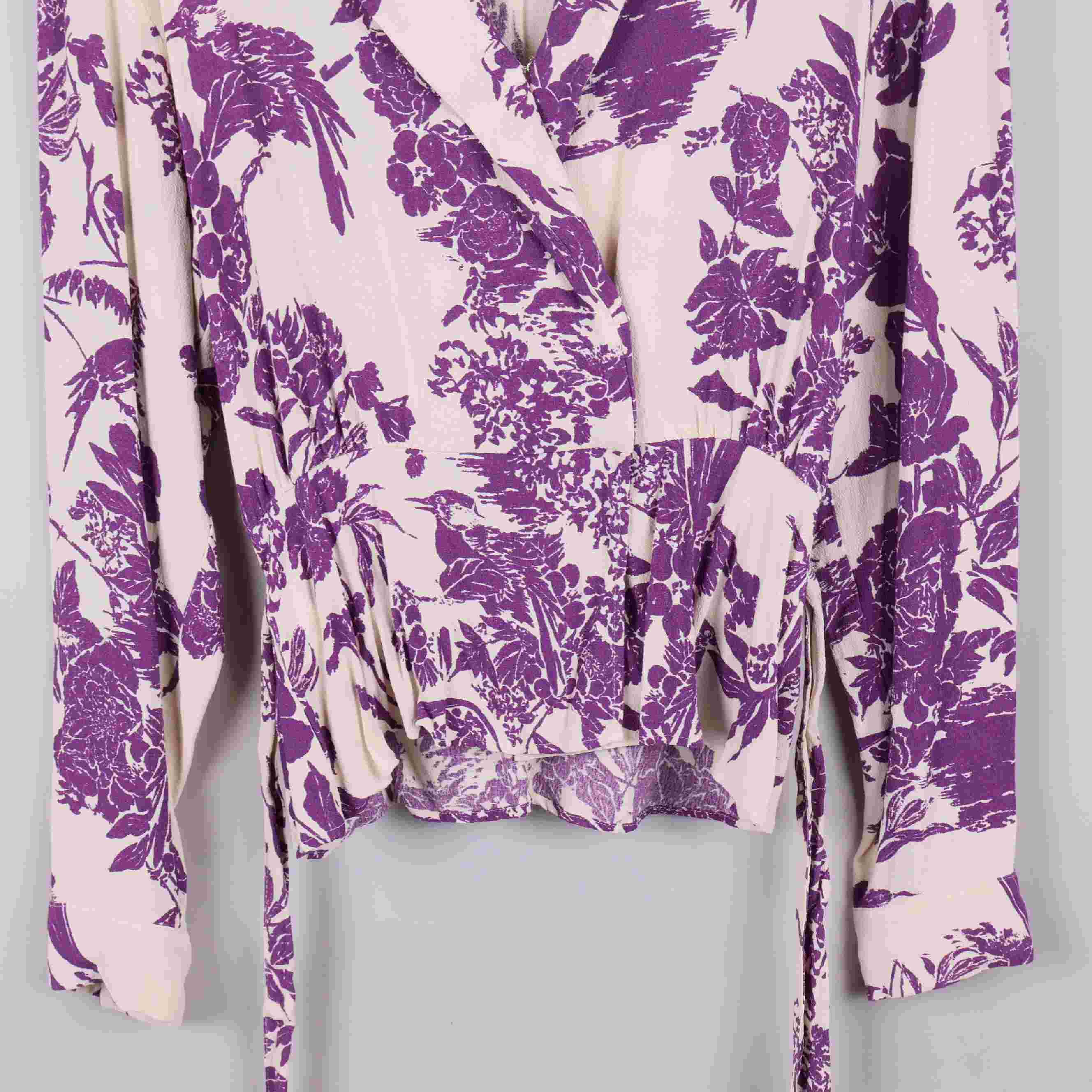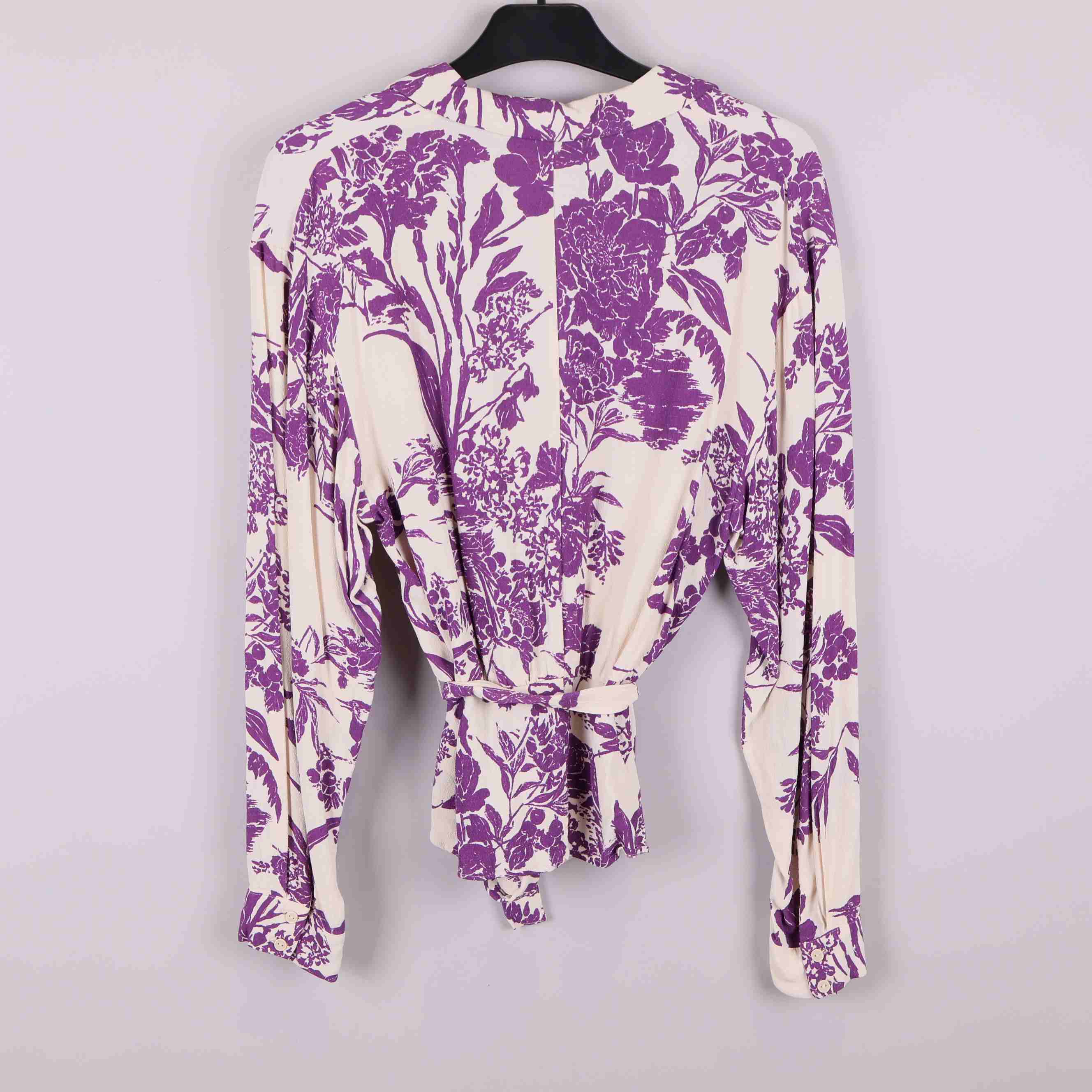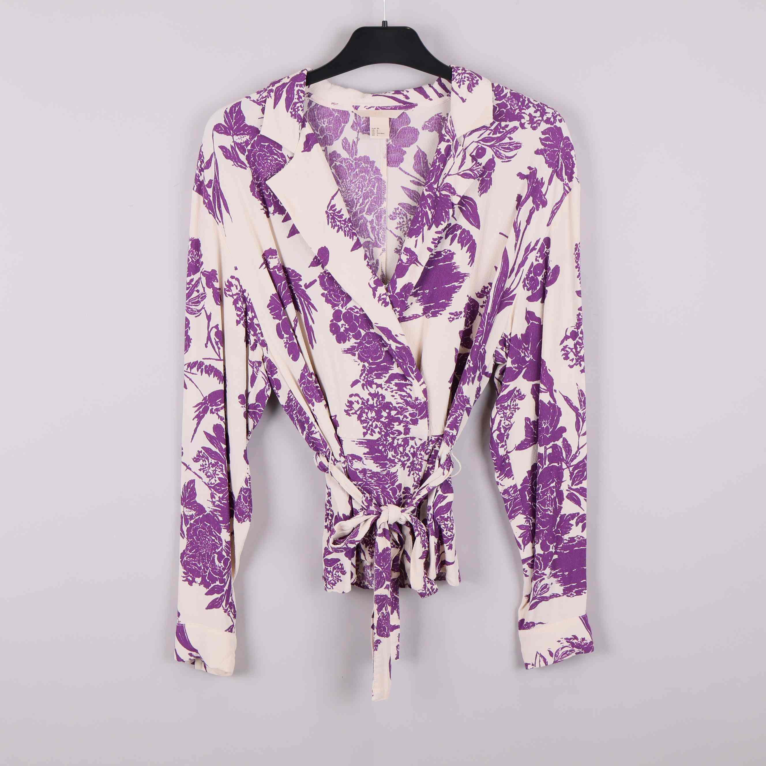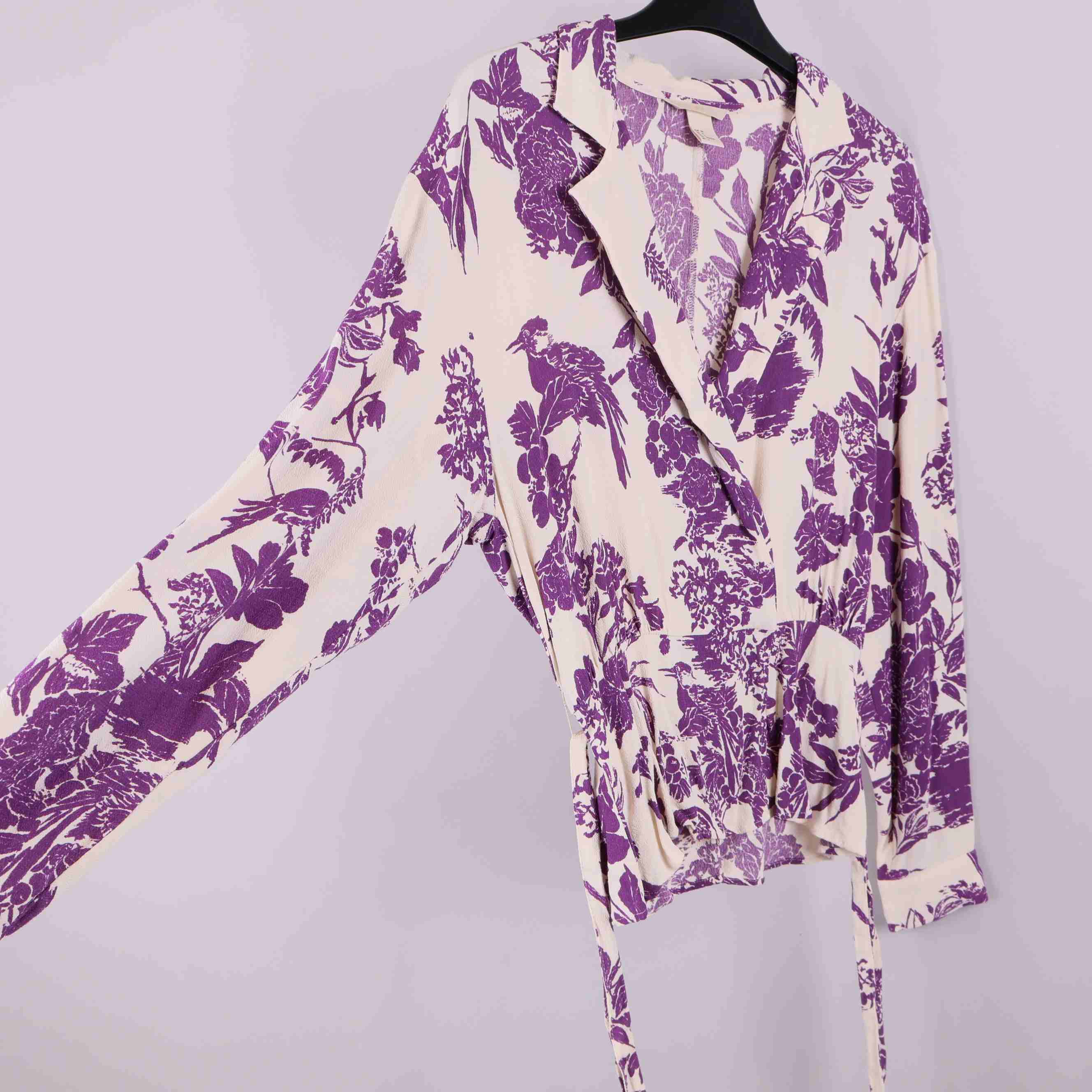 Omlottblus med livfullt blommönster i lila på en ljus botten. Modellen har långa ärmar, klassisk krage och snygg knytning i midjan som ger en smickrande silhuett. Det mjuka viskostyget gör plagget väldigt bekvämt och lättburet.