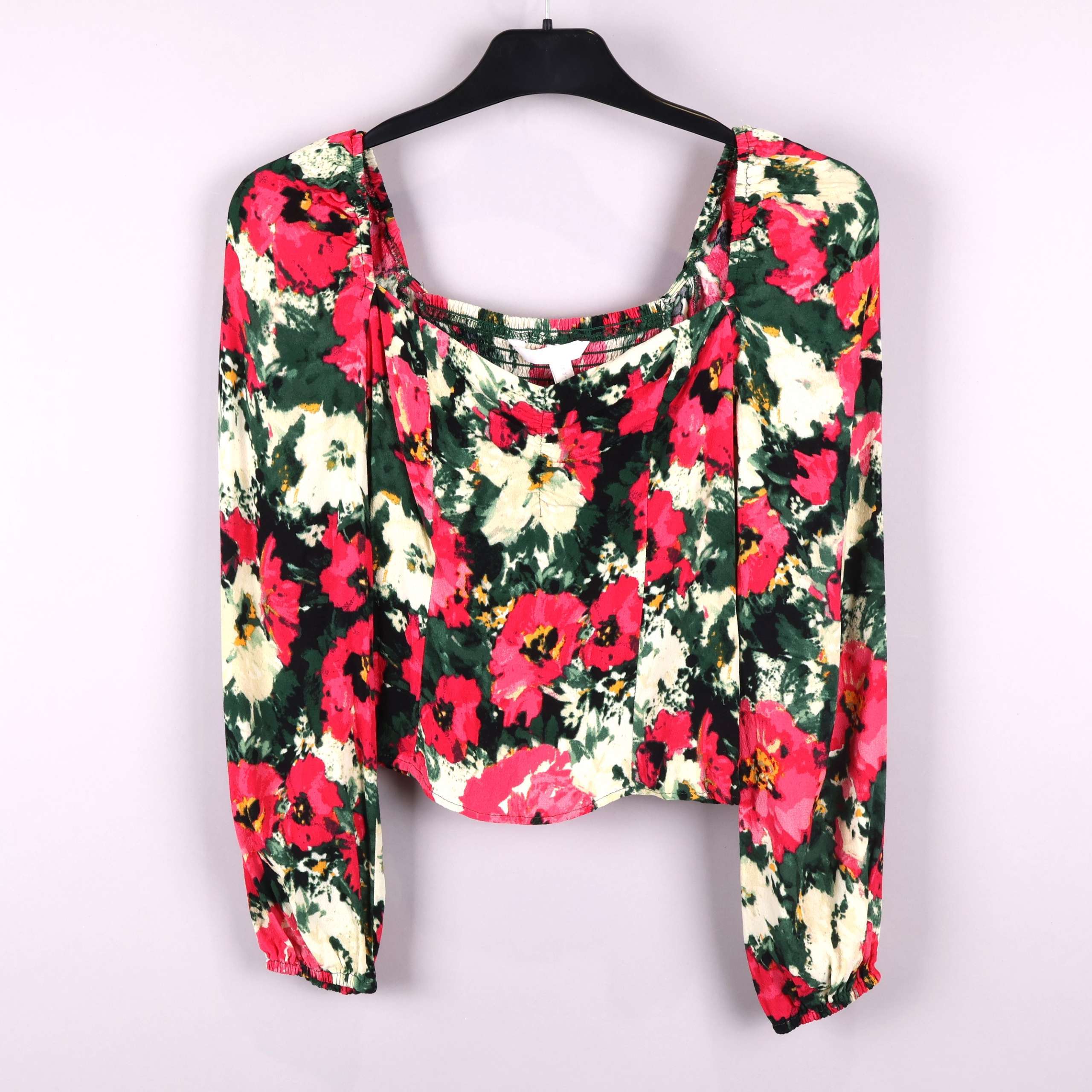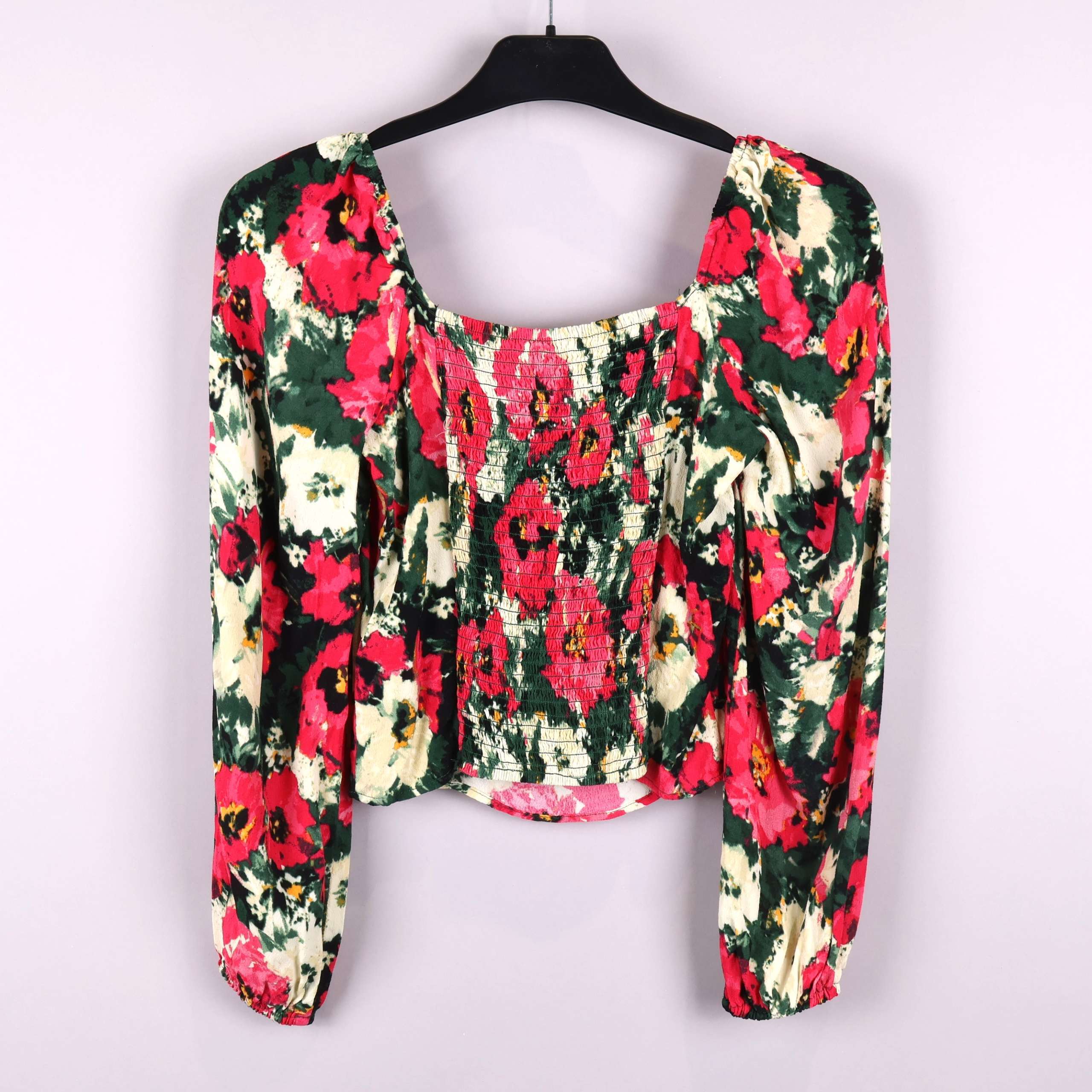 Denna charmiga topp med blommigt mönster i rosa och gröna nyanser har en lös passform och vida ärmar. Den fyrkantiga halsringningen ger en modern look.