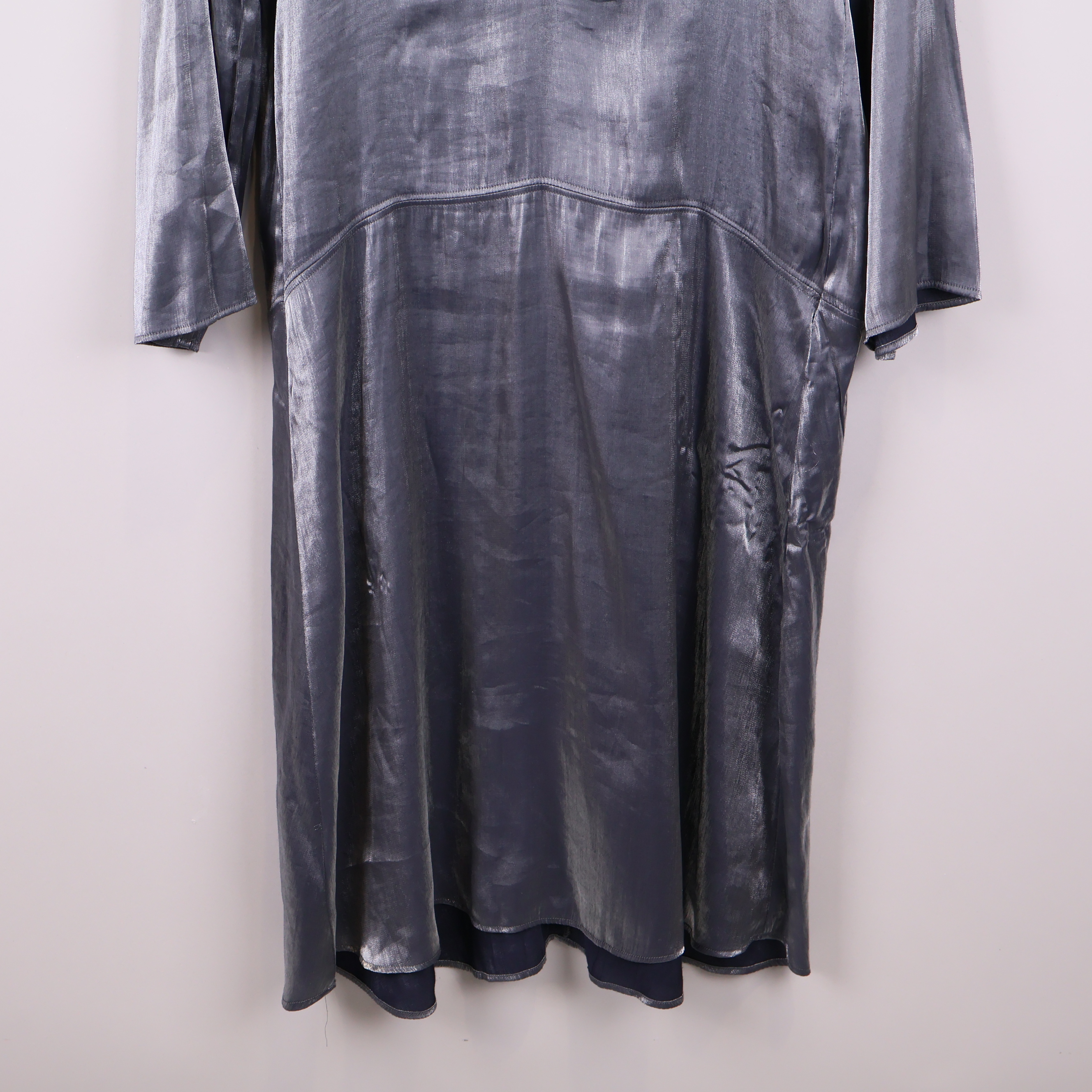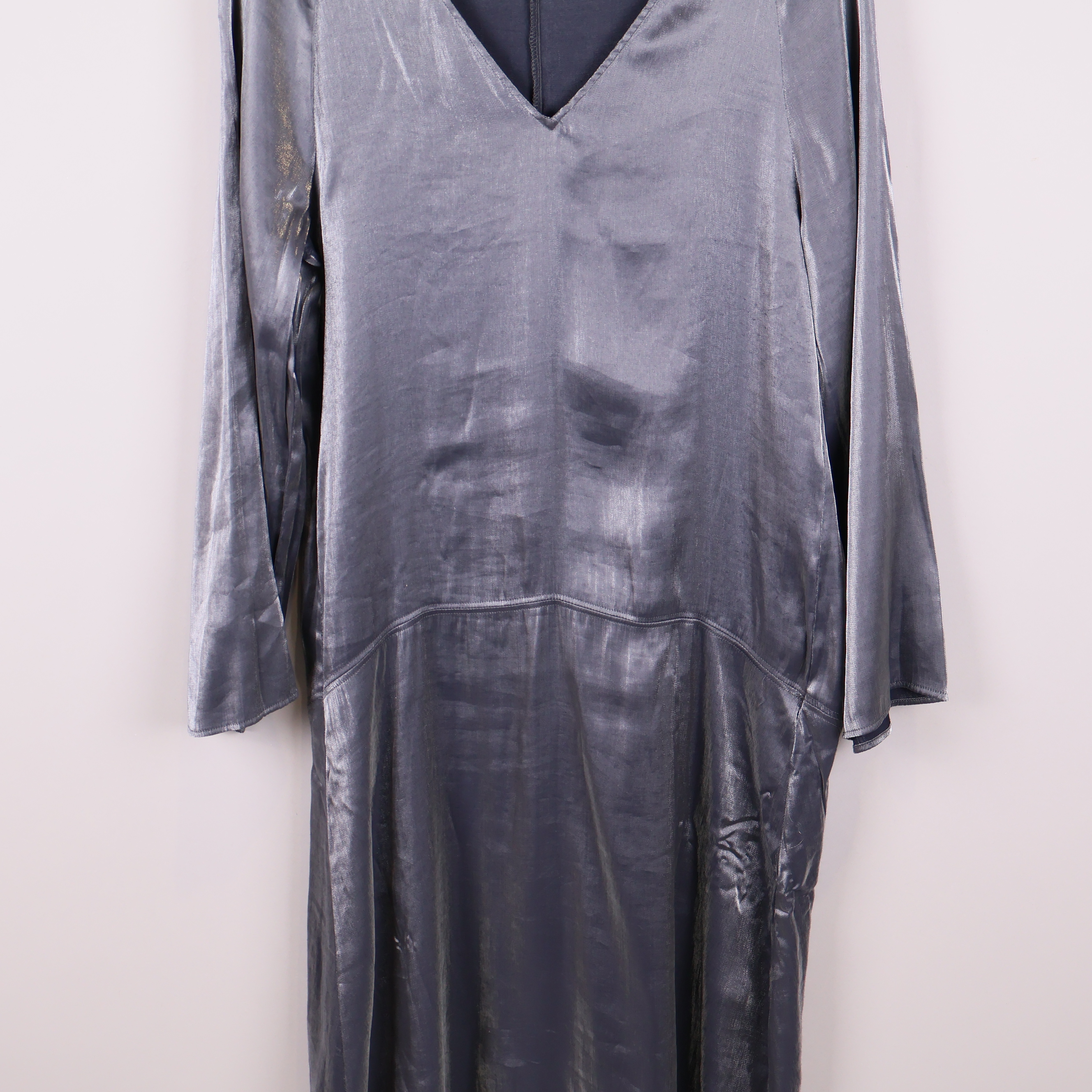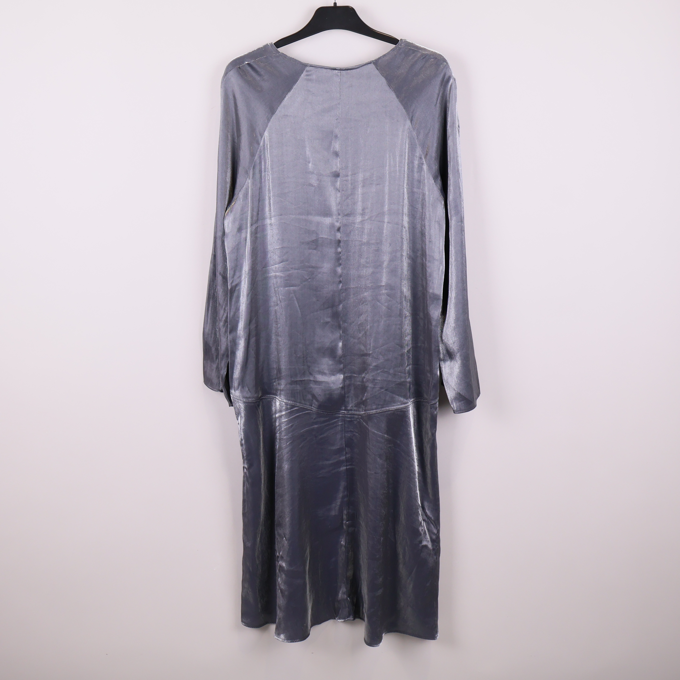 Den här rymliga klänningen har en vacker silvrig och blå glans med mjukt fall och lång ärm. Designen är enkel men modern med en v-ringad hals och avslappnad siluett.