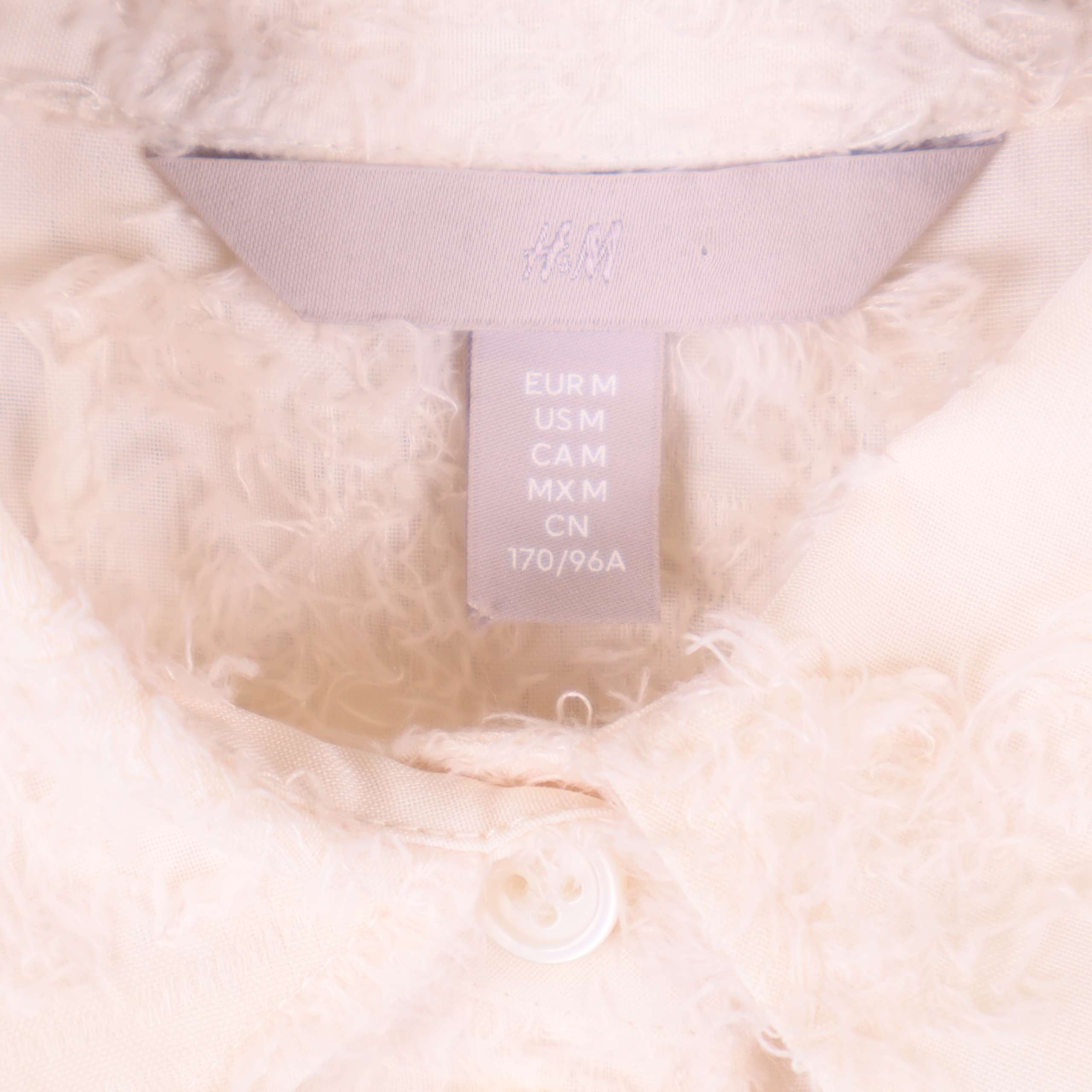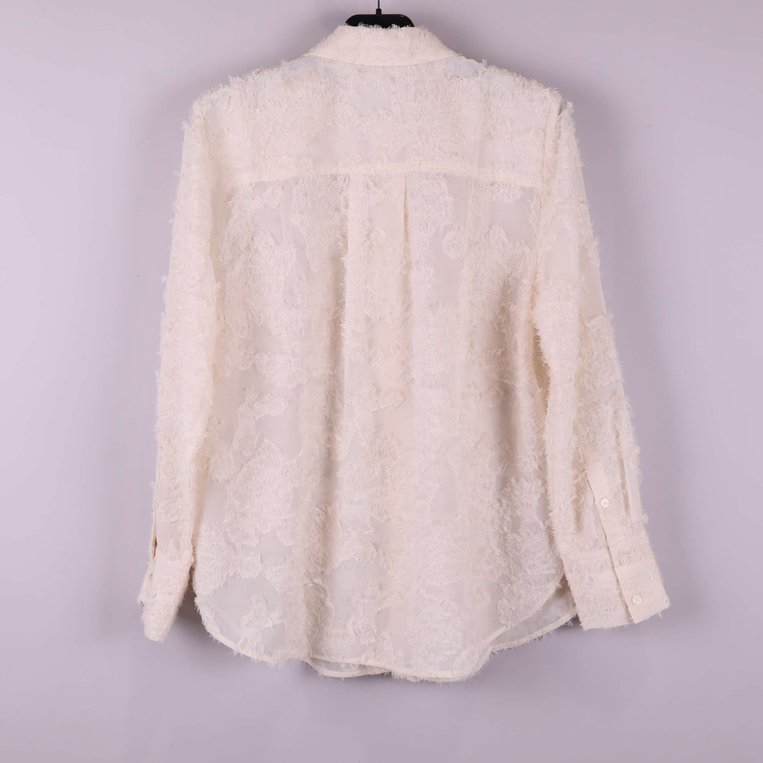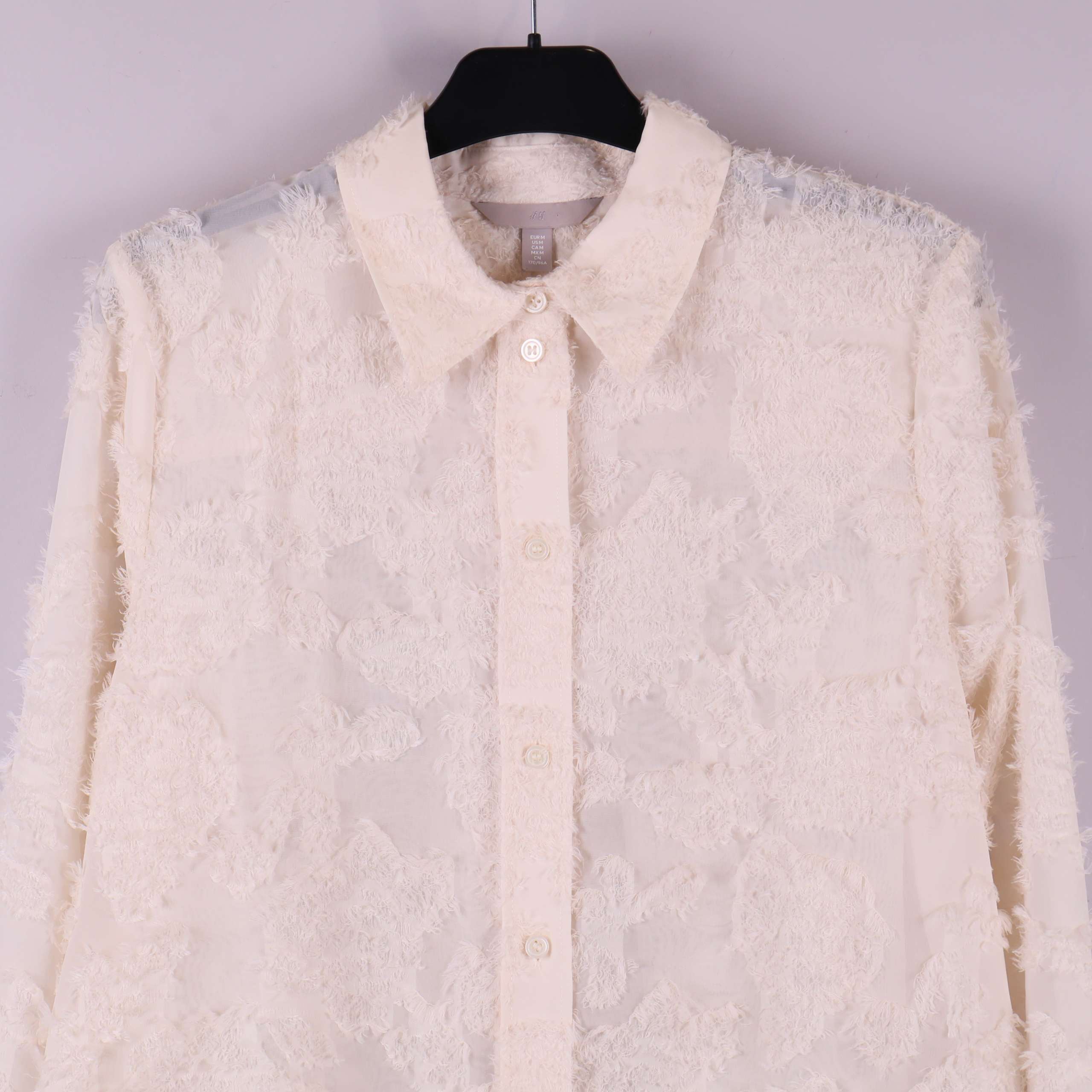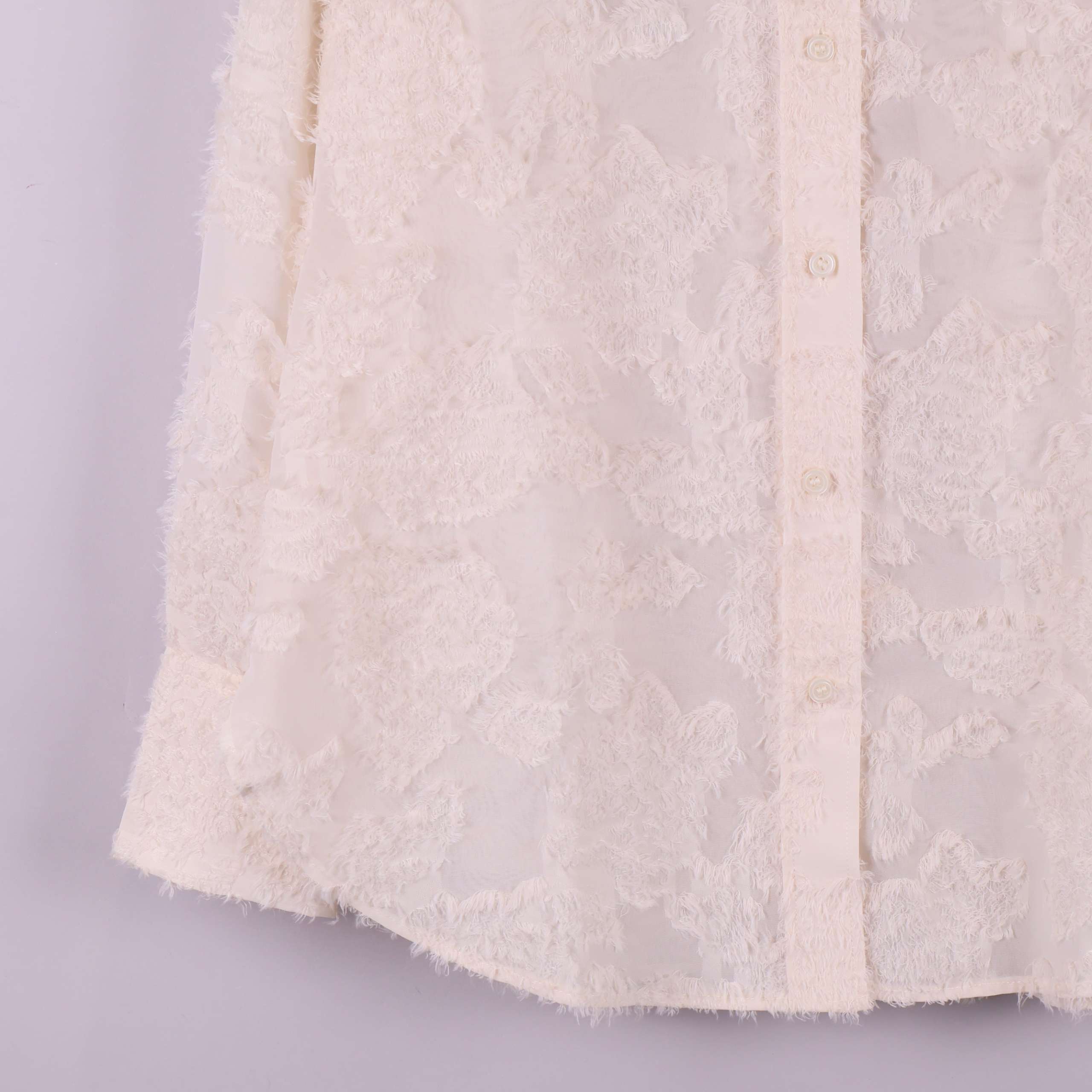 Här är en långärmad skjorta i en ljust beige ton med snygg, fluffig struktur över hela plagget. Skjortan har klassisk krage och knäppning framtill och känns både trendig och lekfull tack vare den unika ytan. De genomskinliga detaljerna ger ett lätt uttryck och den avslappnade passformen gör den perfekt för dig som gillar en modern stil.