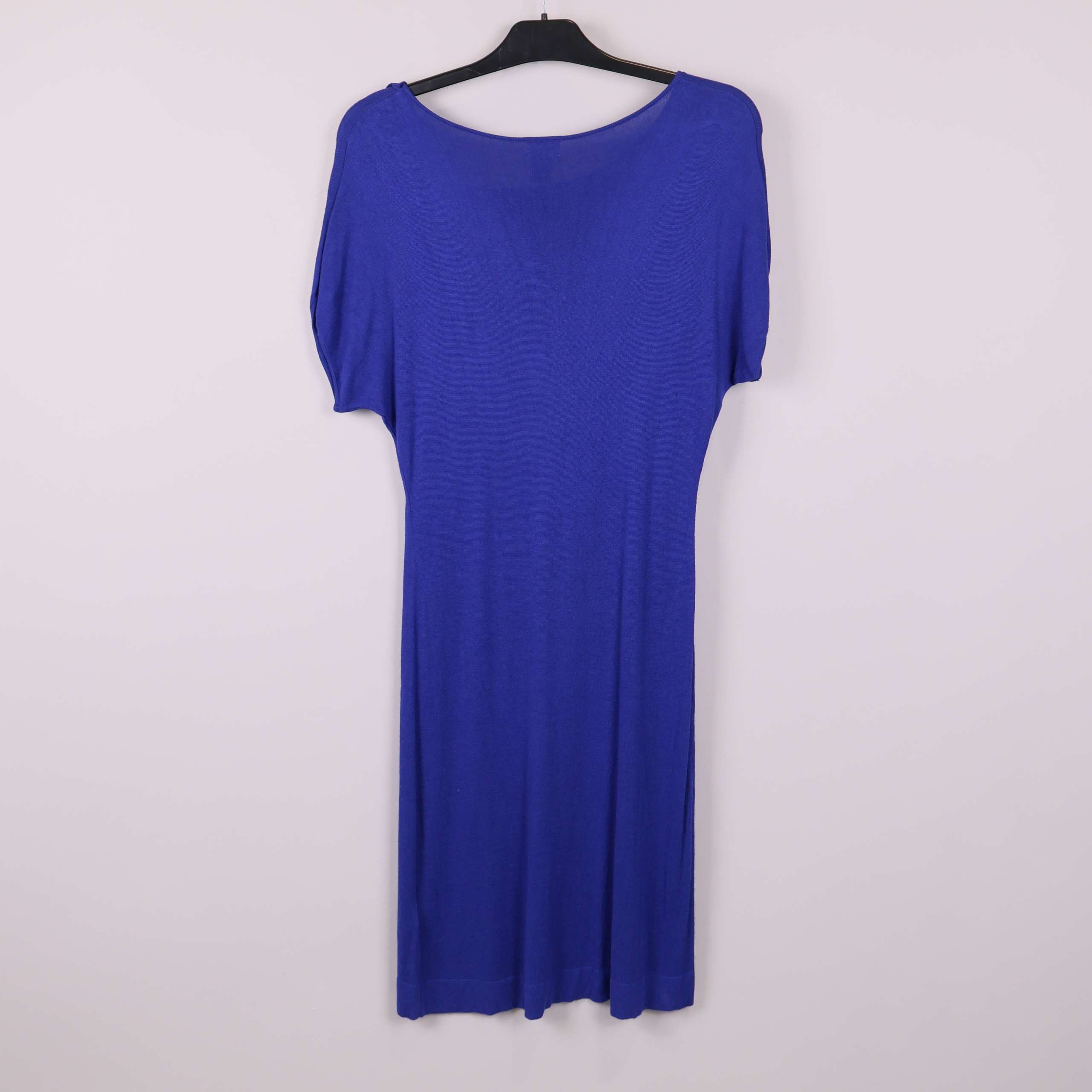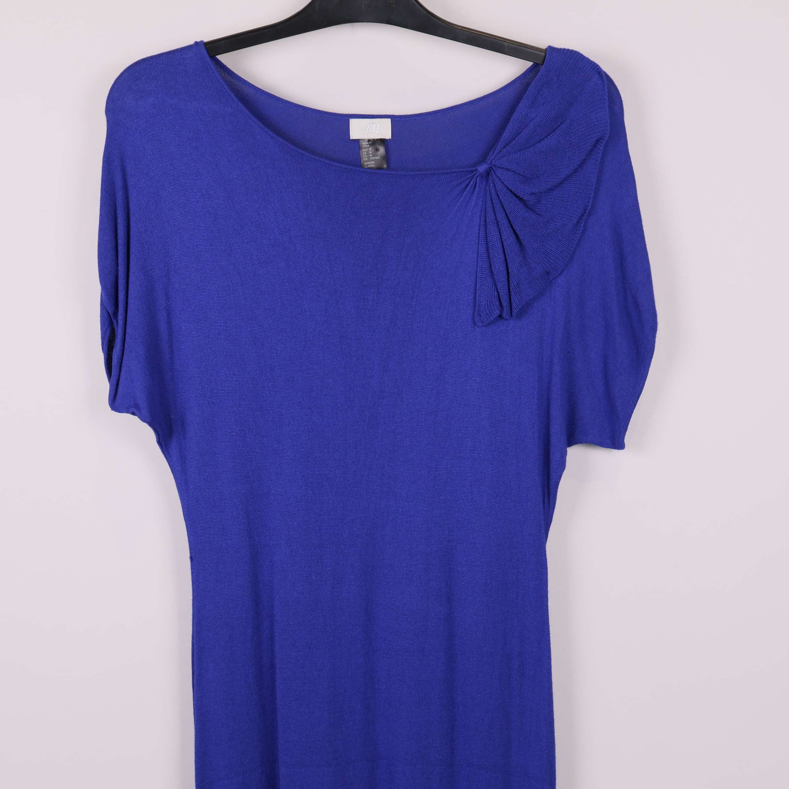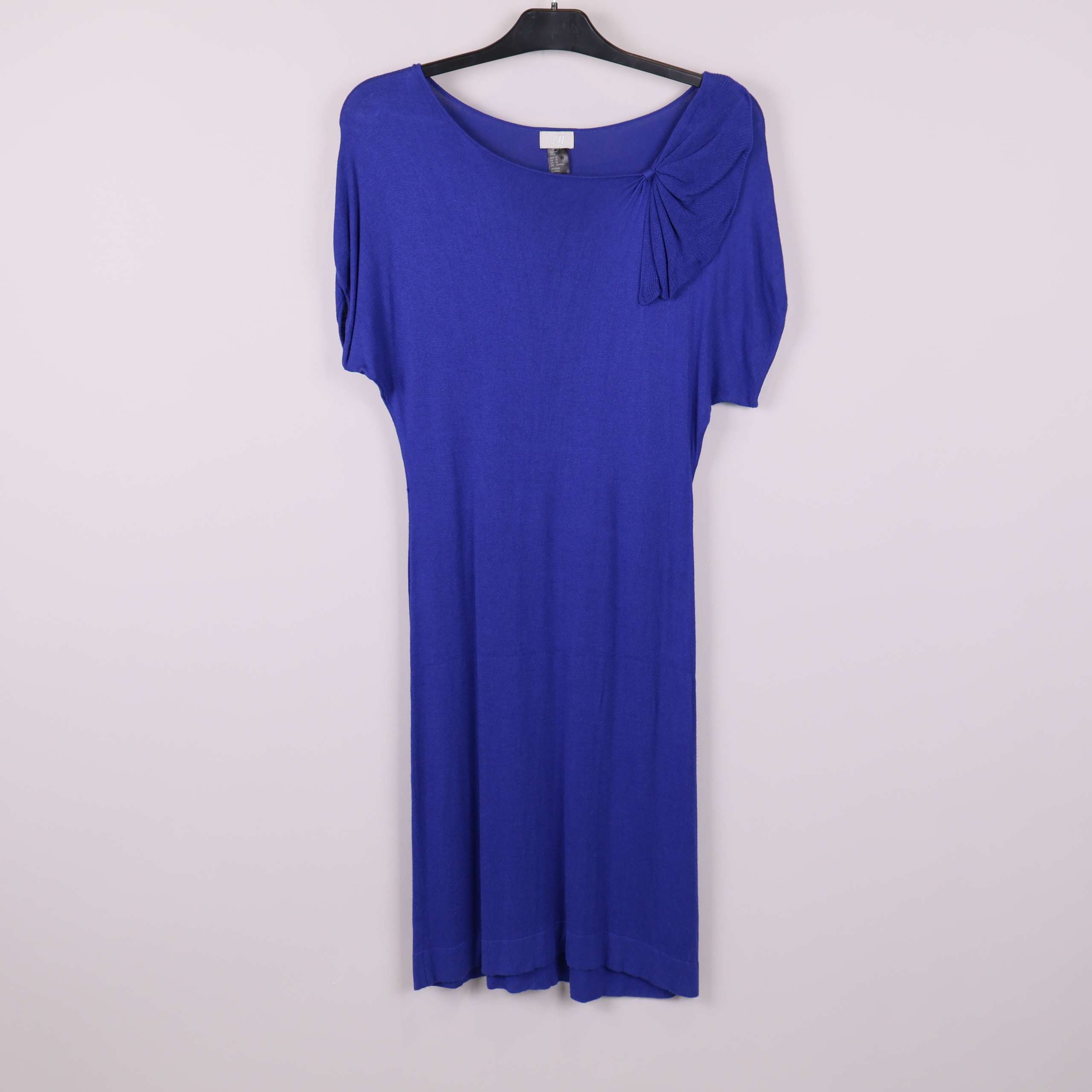 En stilren och mjuk klänning i kornblått från H&M. Modellen har en modern siluett med kort ärm och dekorativ drapering vid axeln som ger extra karaktär. Tyget har en slät yta med lätt stretch.