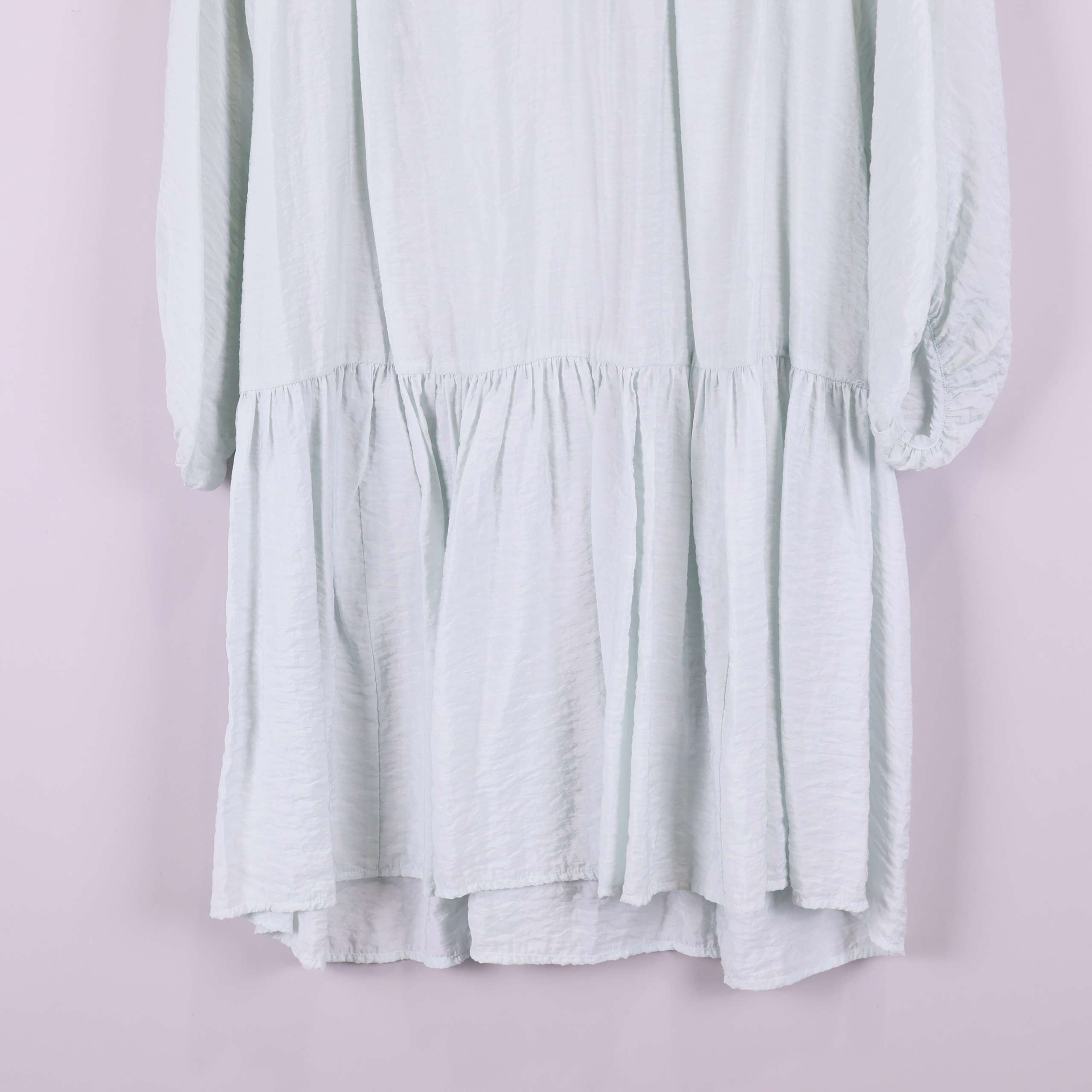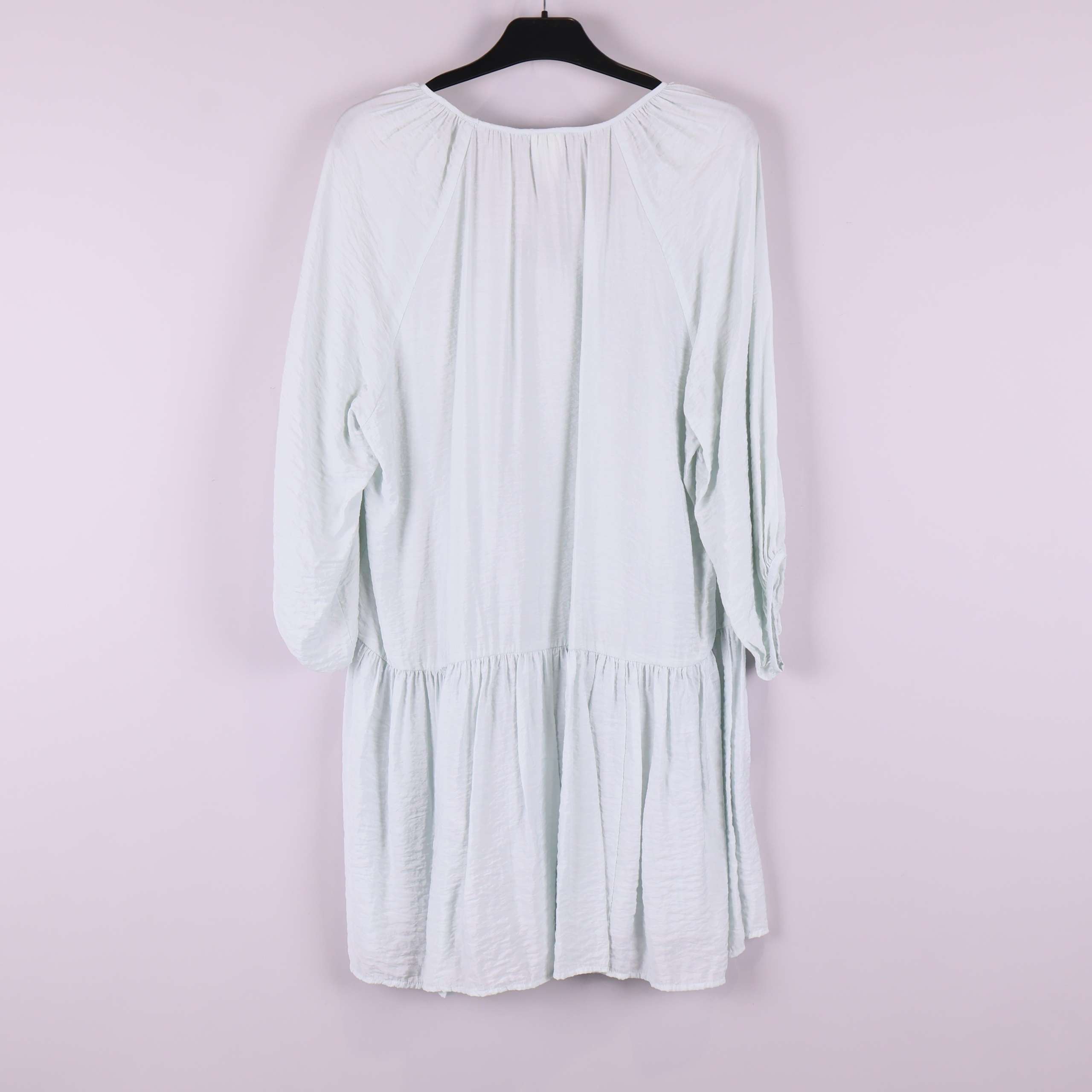 Den här klänningen har en avslappnad silhuett med v-ringning och försiktigt rynkad volang längst ner. Modellen har långa, lätt pösiga ärmar och faller mjukt över kroppen med en något oregelbunden fåll för en chill och modern look. Tillverkad i ett tunt tyg med behaglig känsla och mjuk struktur.