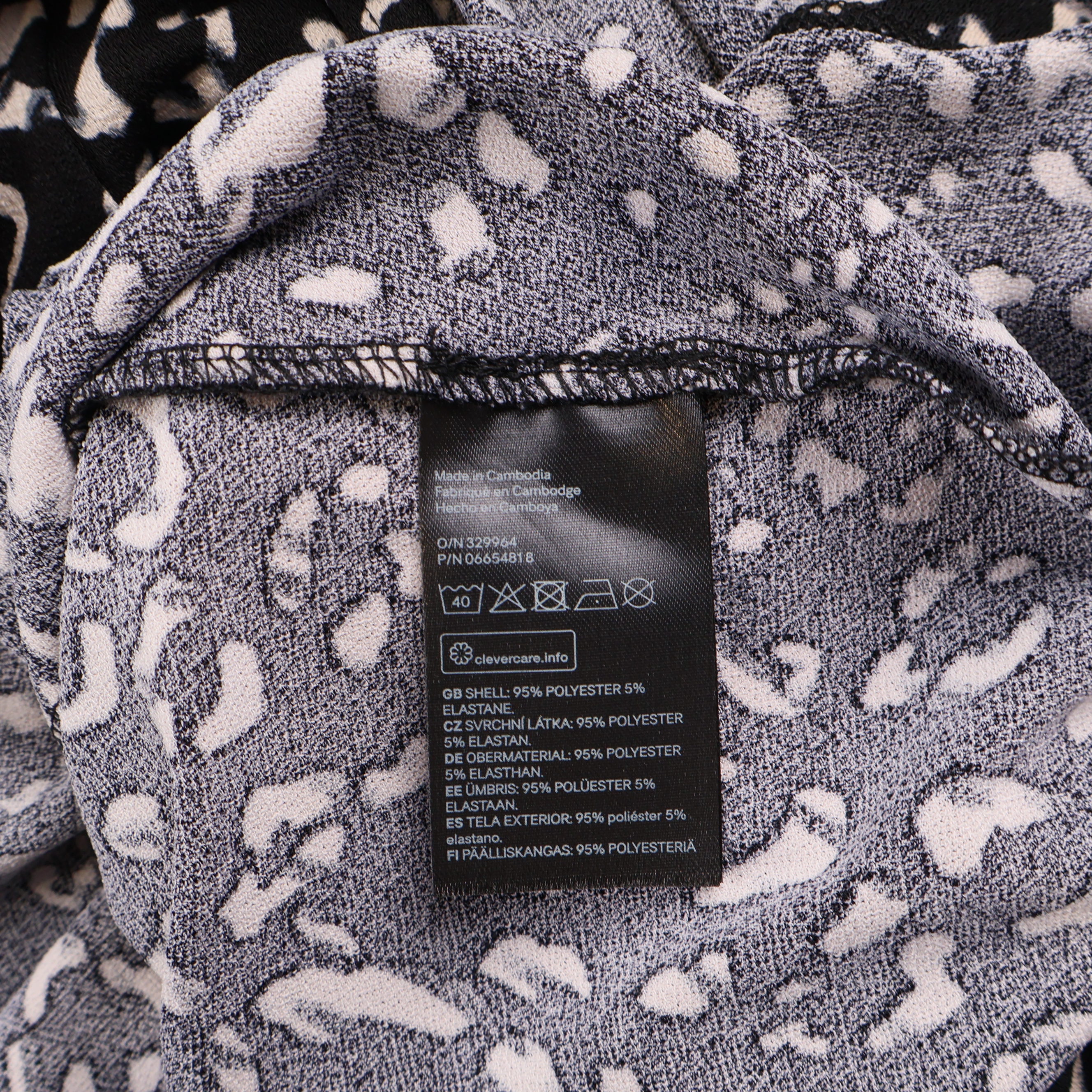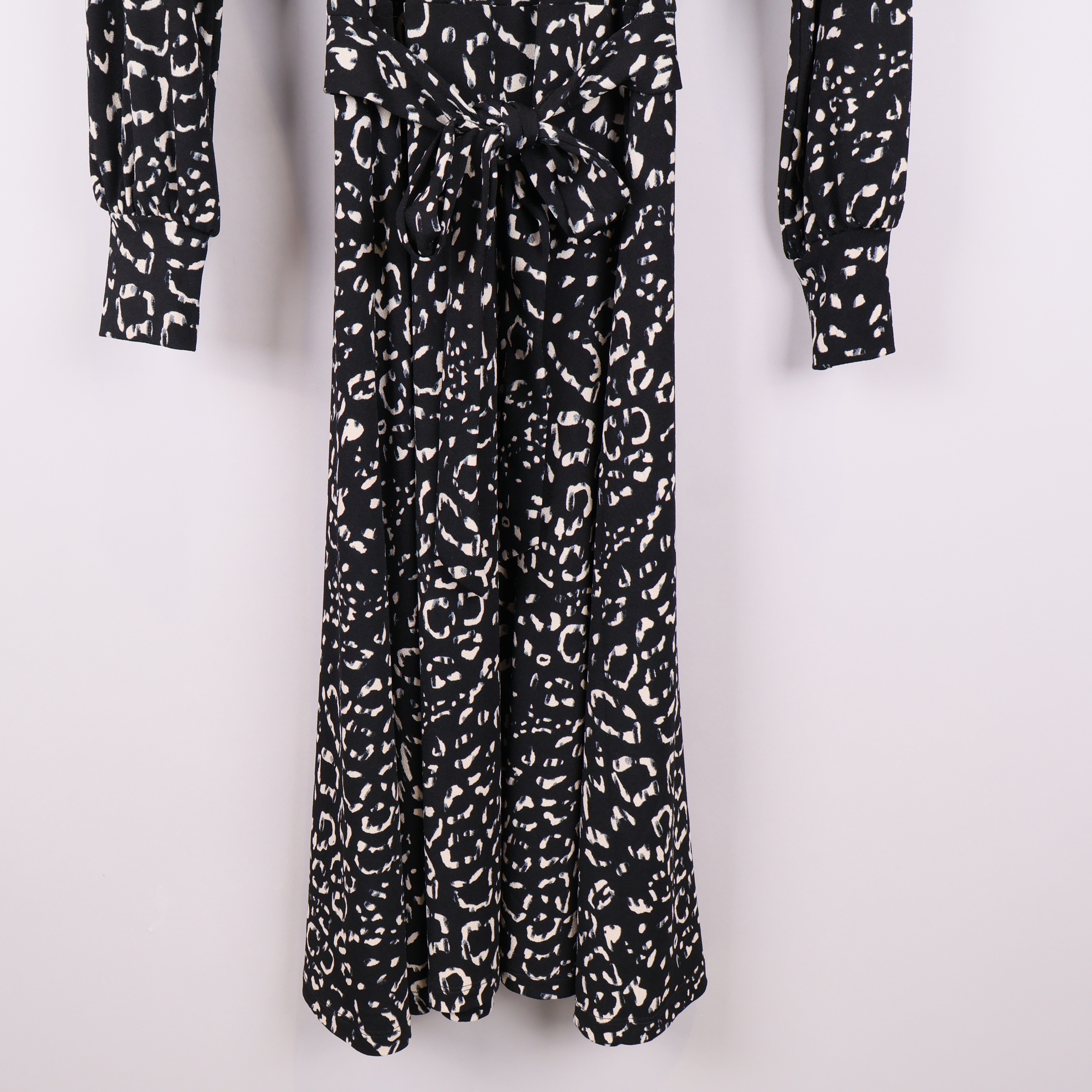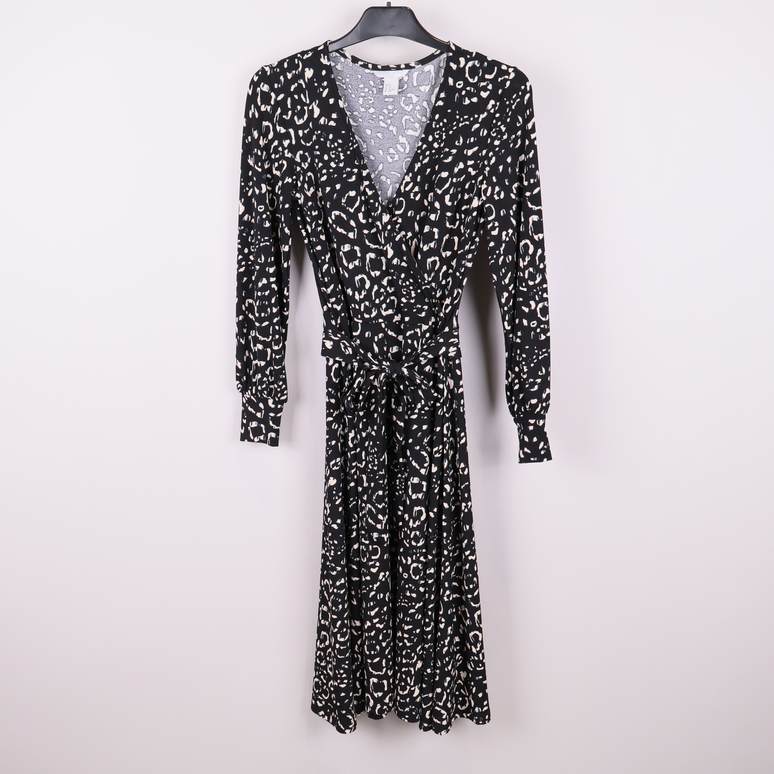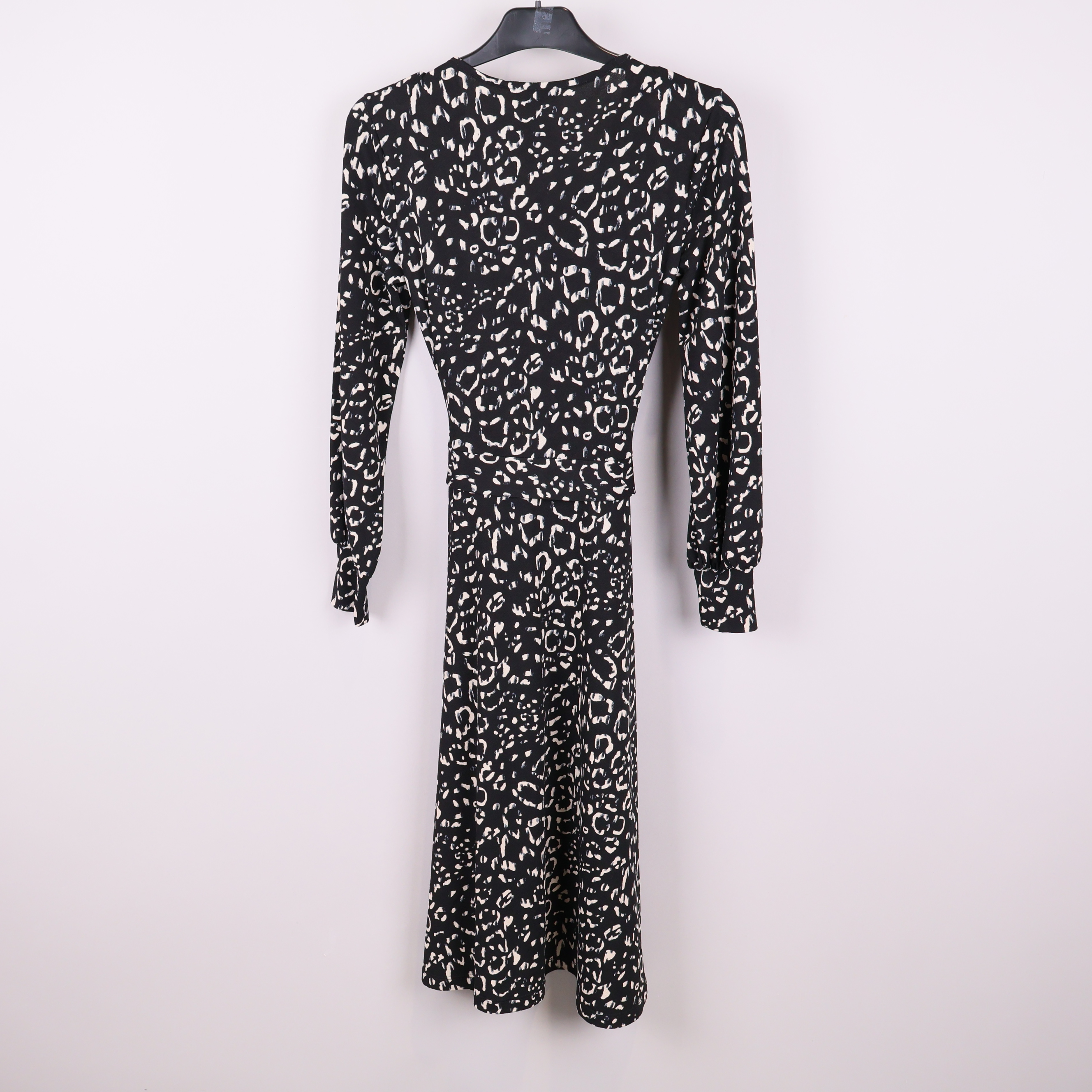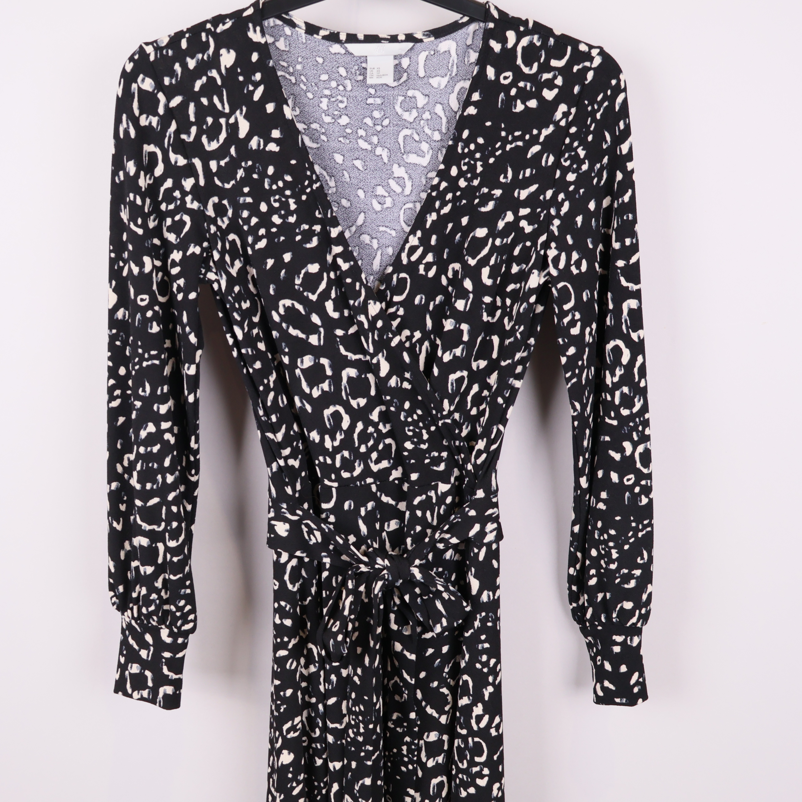Den här klänningen har ett snyggt leopardmönster i svart och ljusa toner som ger en trendig känsla. Modellen är omlottinspirerad med knytband i midjan och långa ärmar med bredare muddar. Tyget känns mjukt och stretchigt för extra komfort.