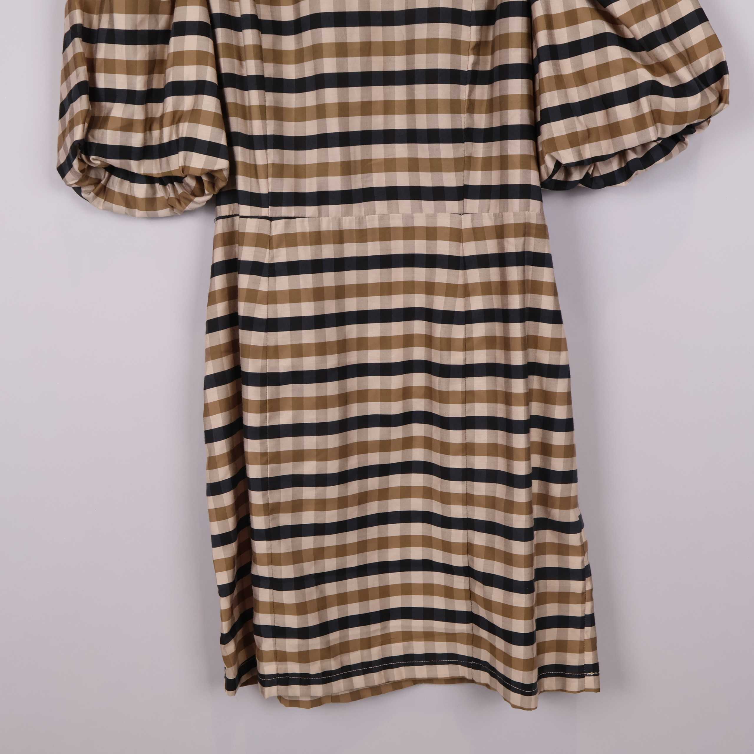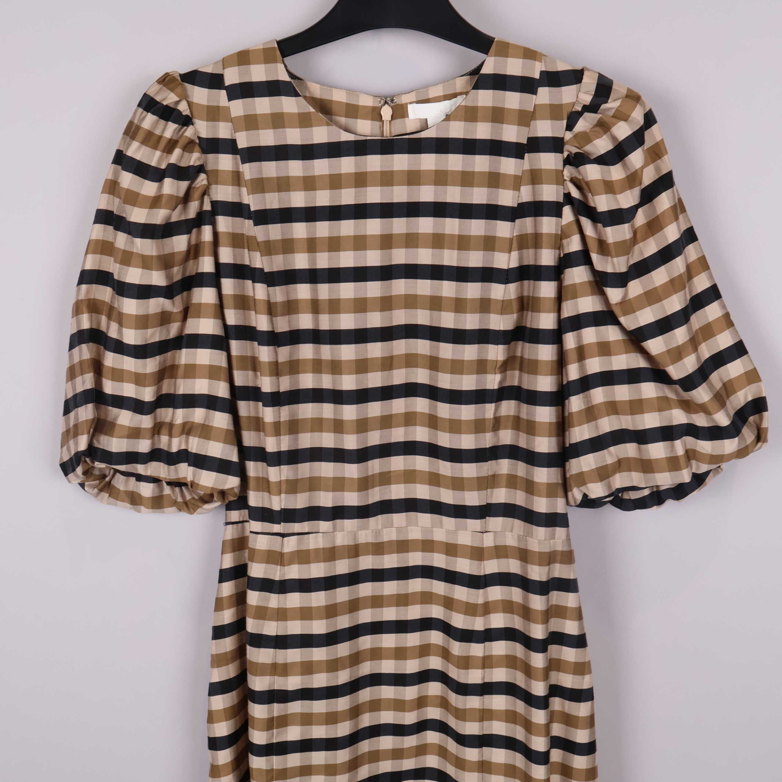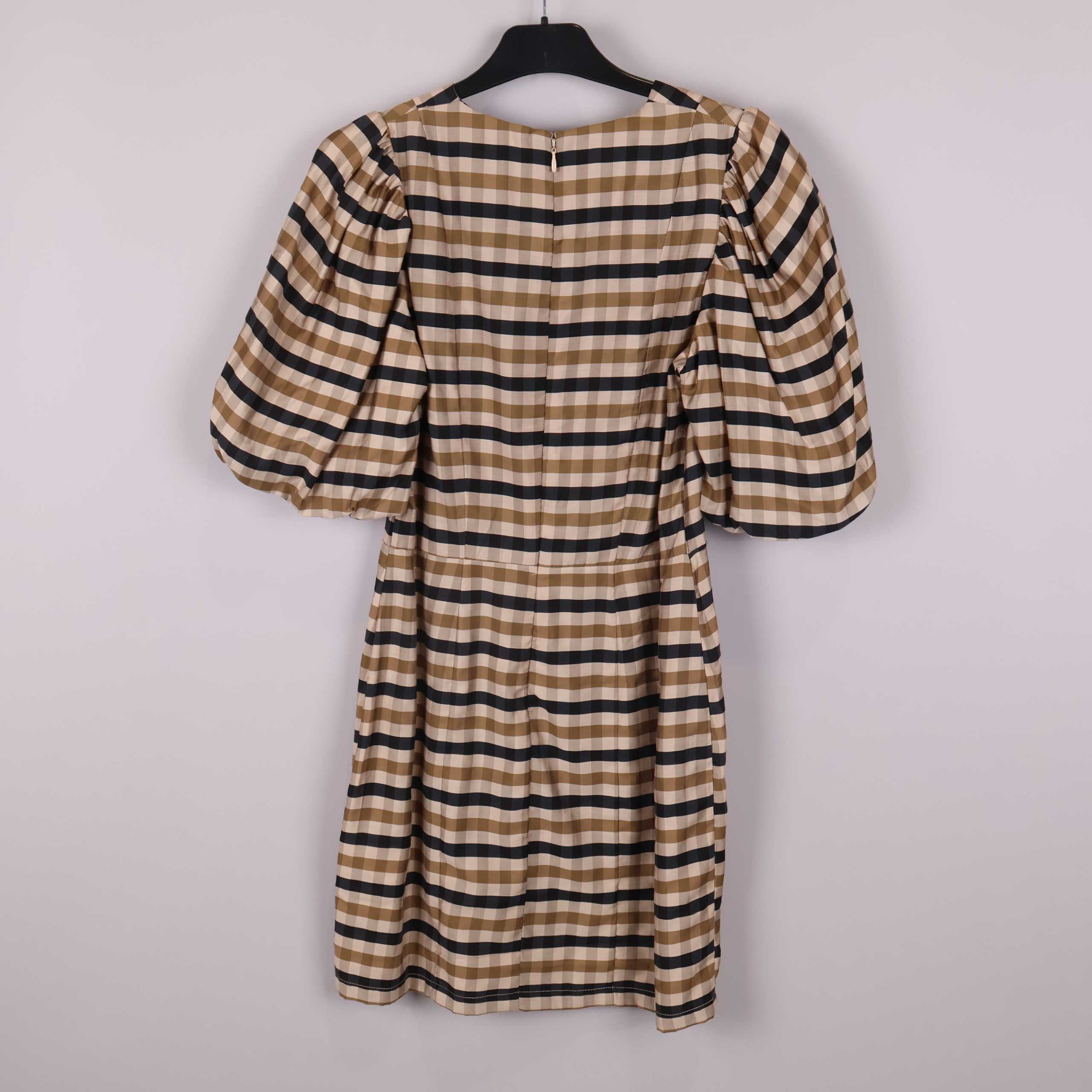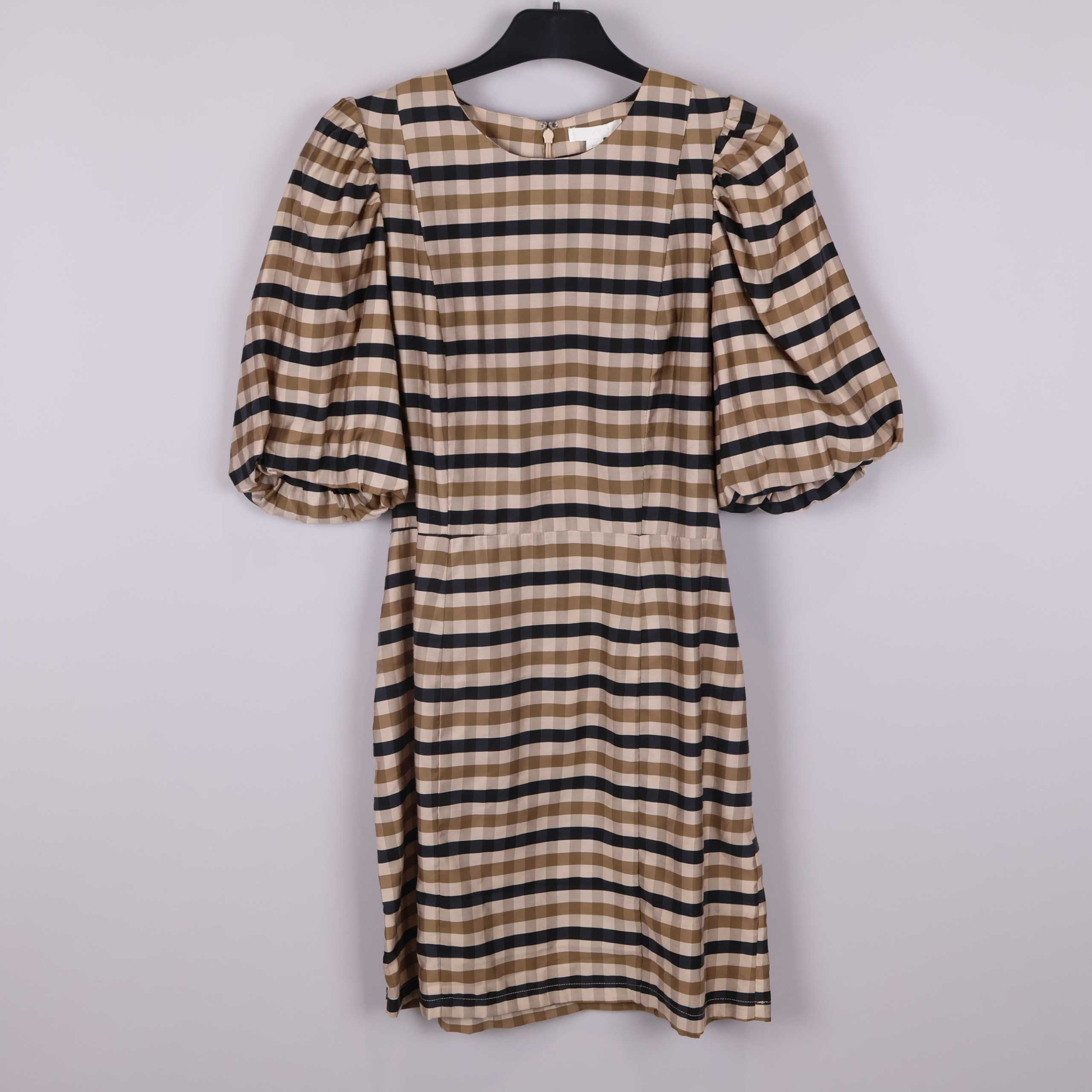 Kort klänning med rutigt mönster i beige och mörka nyanser, designad med rund halsringning och puffiga halvlånga ärmar. Lätt och smidig kvalitet, diskret dragkedja bak och följsam passform som ger ett modernt och lekfullt intryck. Perfekt för dig som gillar statement sleeves och tidlös stil.