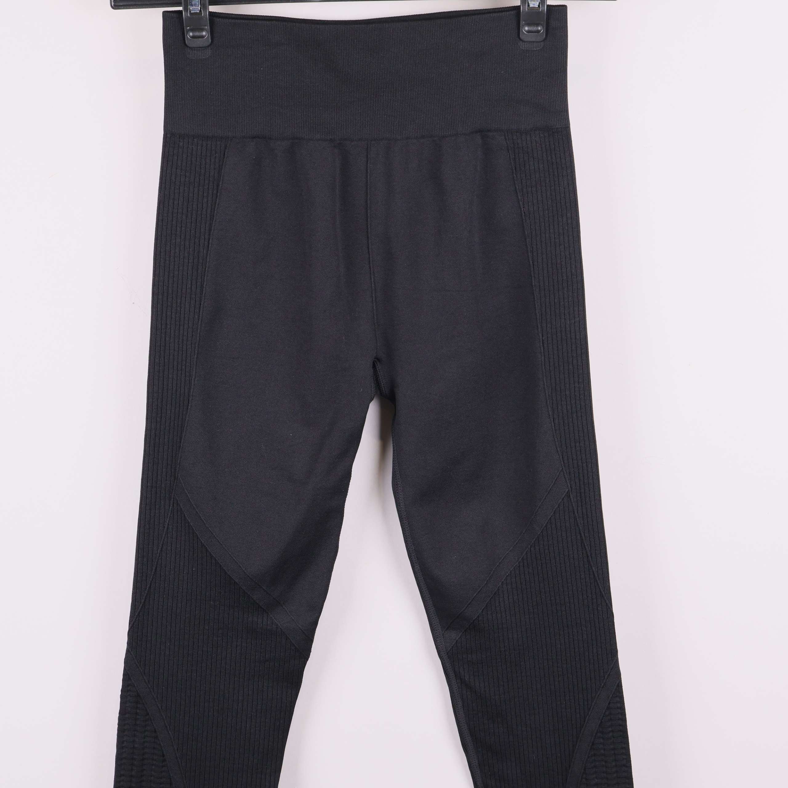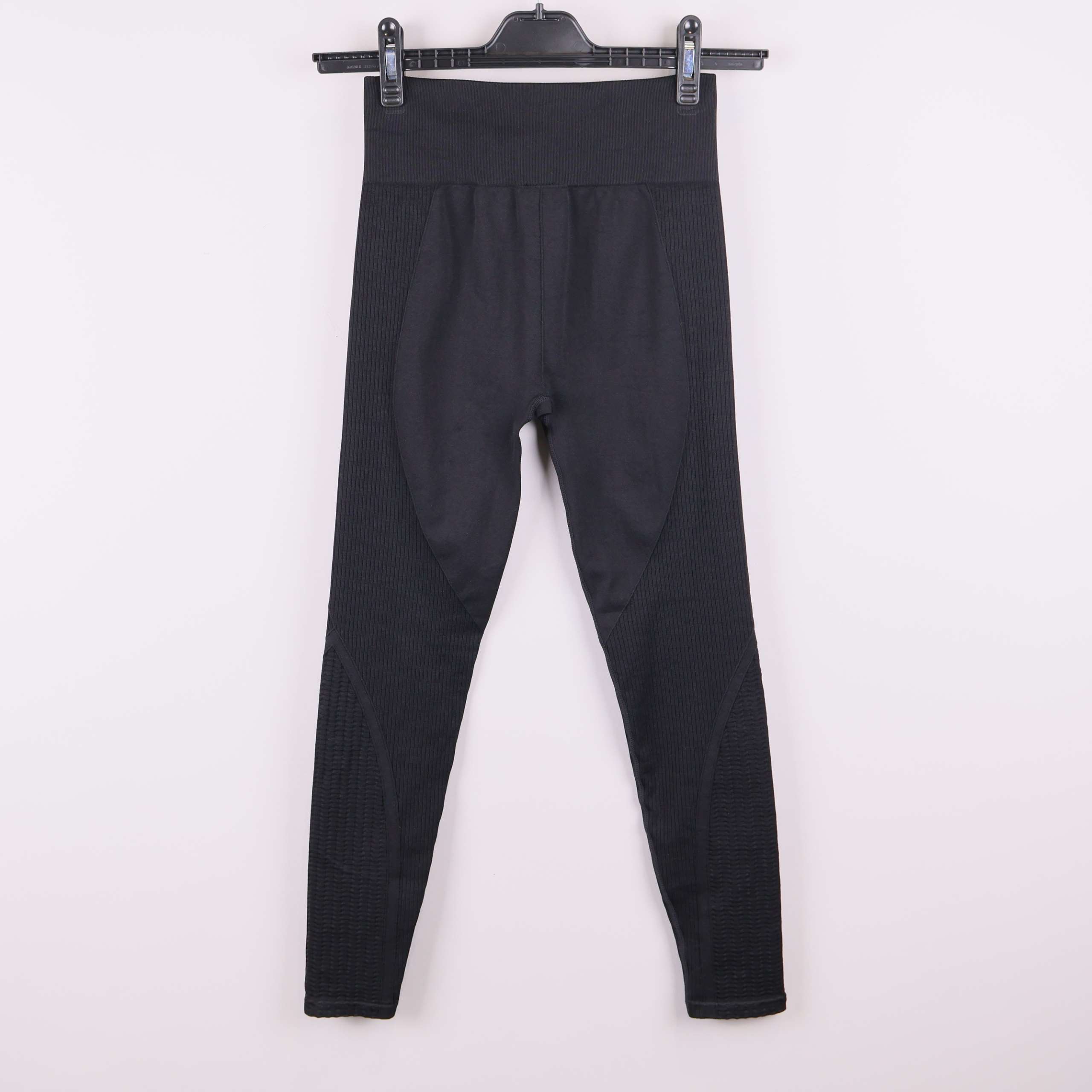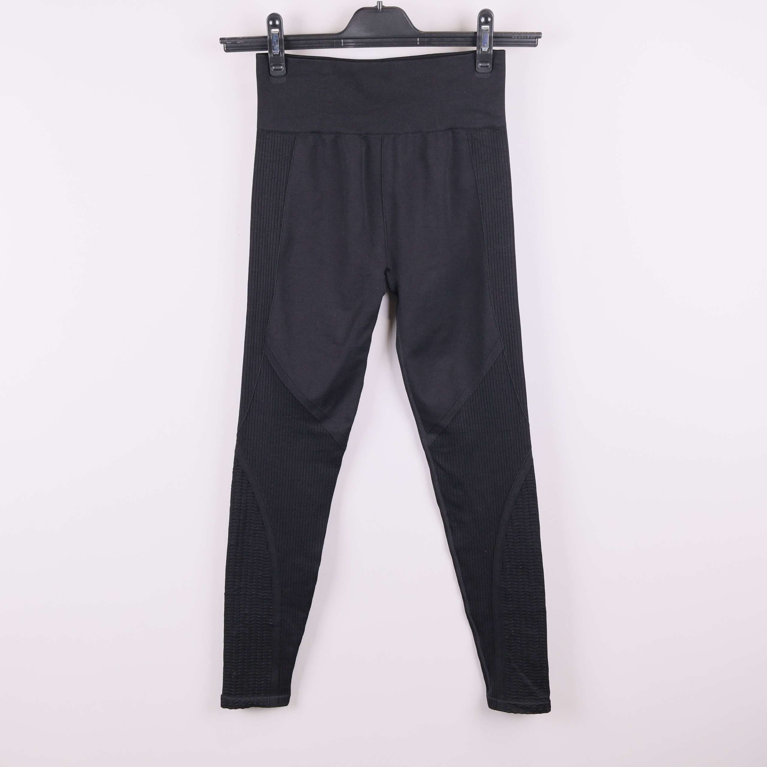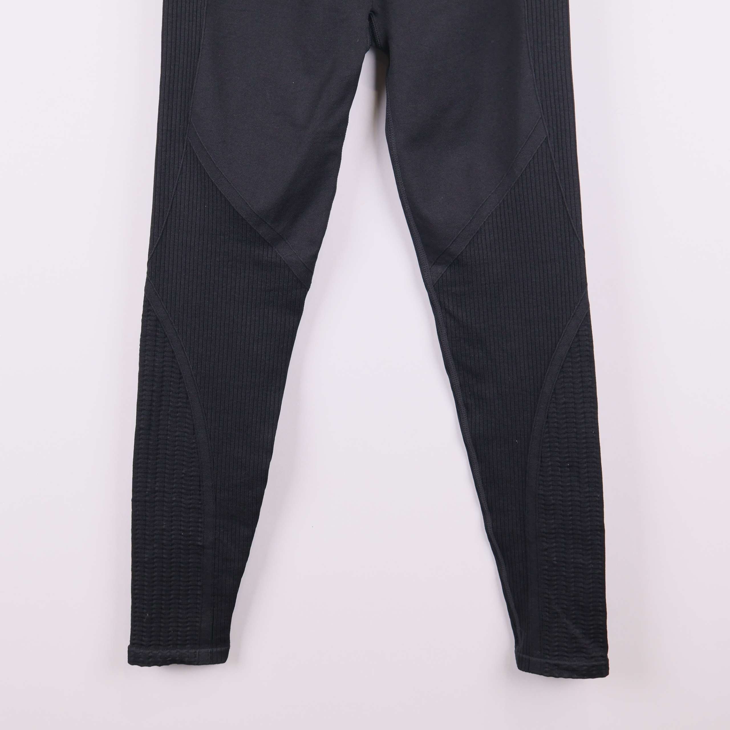 Svarta sportleggings med hög midja och ribbade partier längs benen för extra komfort och passform. Sömlös design gör dem mjuka mot huden och bidrar till en smidig, flexibel känsla när du rör dig.