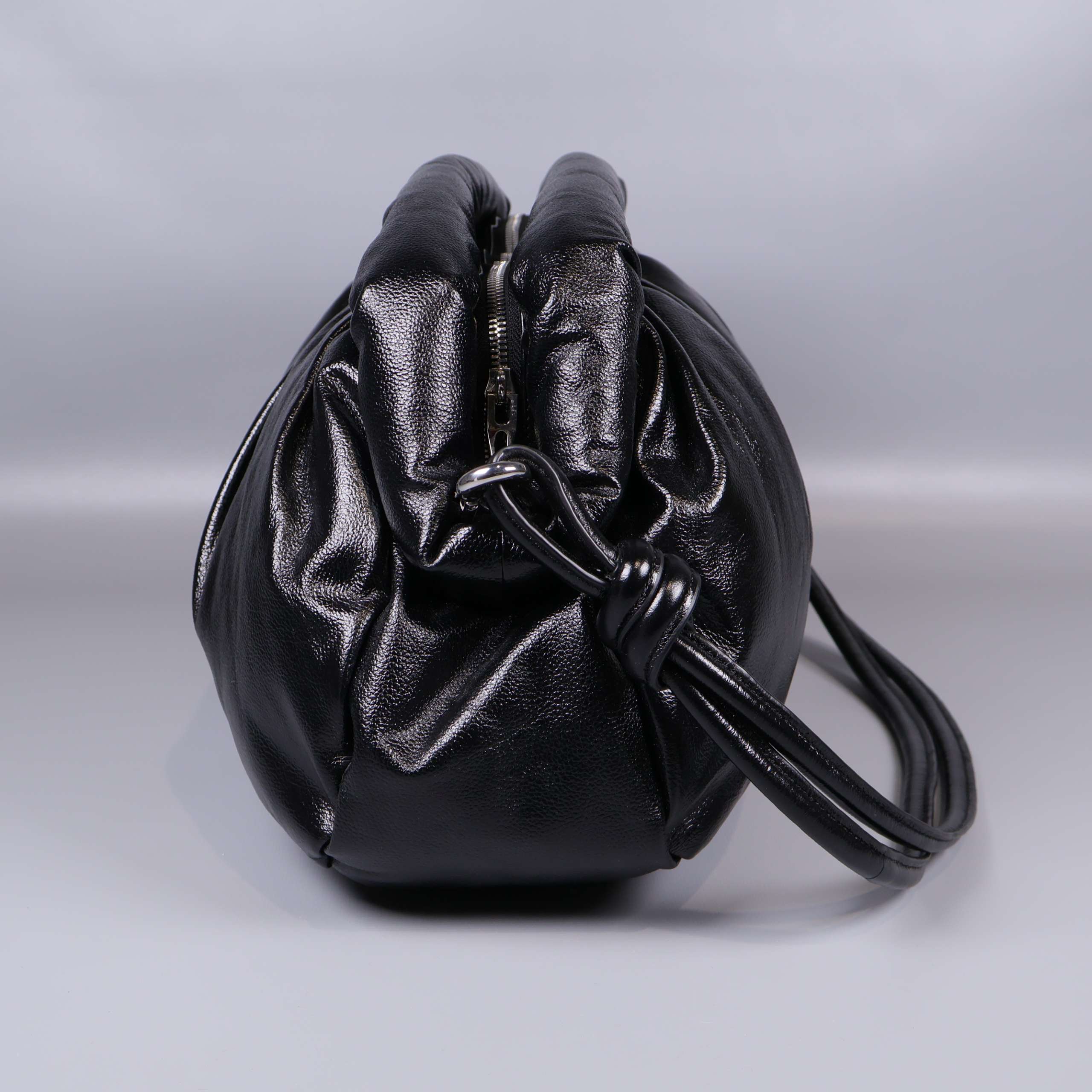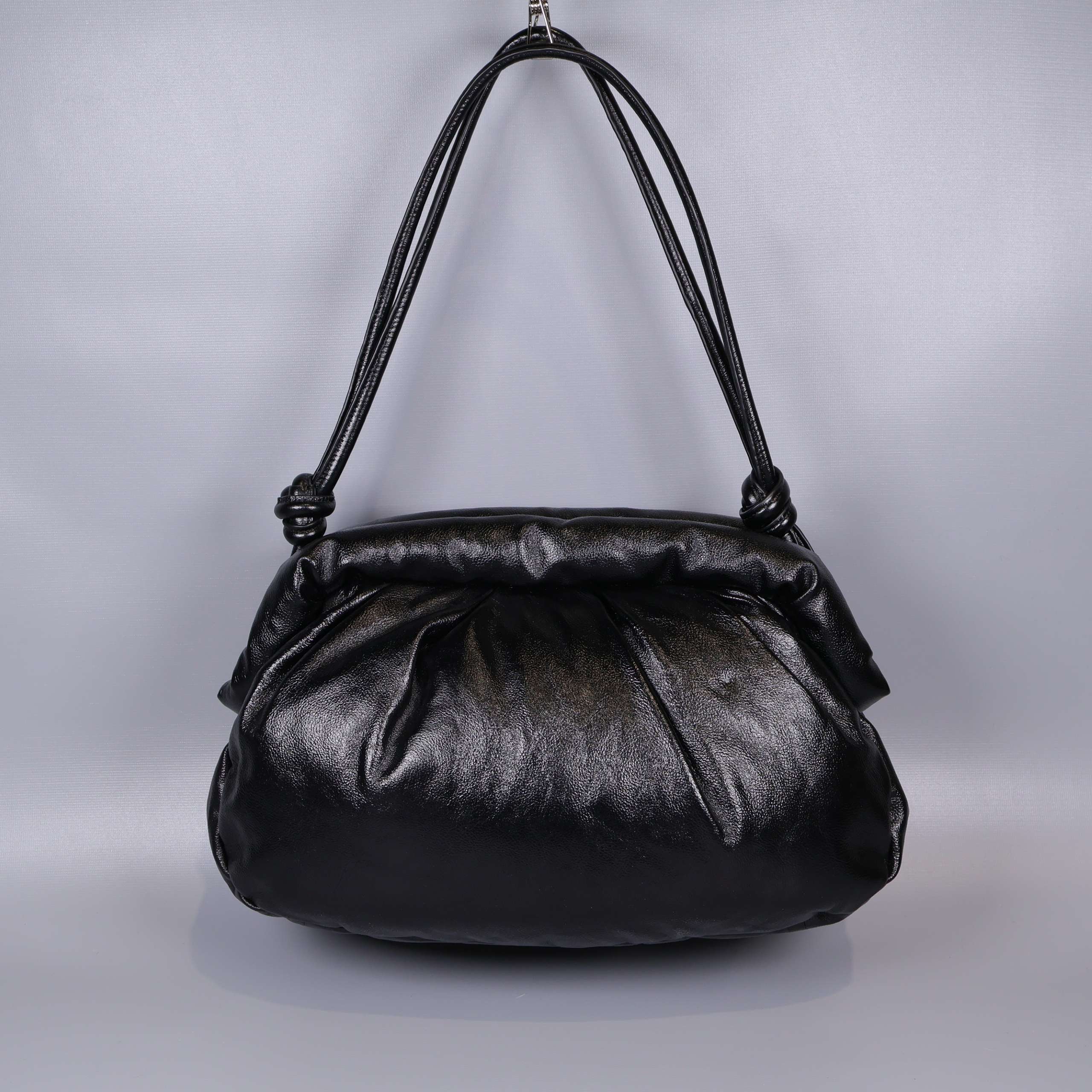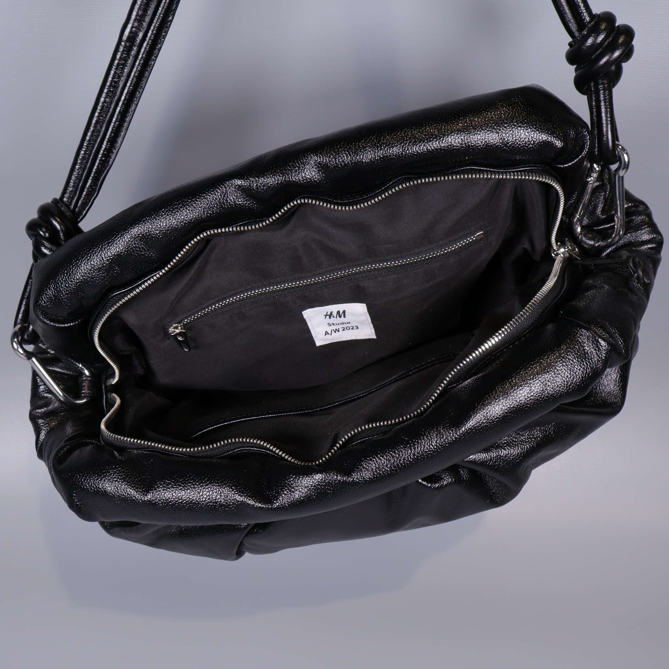 Den här axelremsväskan har en mjuk och puffig design med vackra knutdetaljer på remmarna. Väskan är helsvart med en lätt glansig finish och har gott om plats för dina saker. Invändigt finns både dragkedjefack och öppna fack för praktisk organisering. En tidlös väska med modern känsla som passar till det mesta i garderoben.