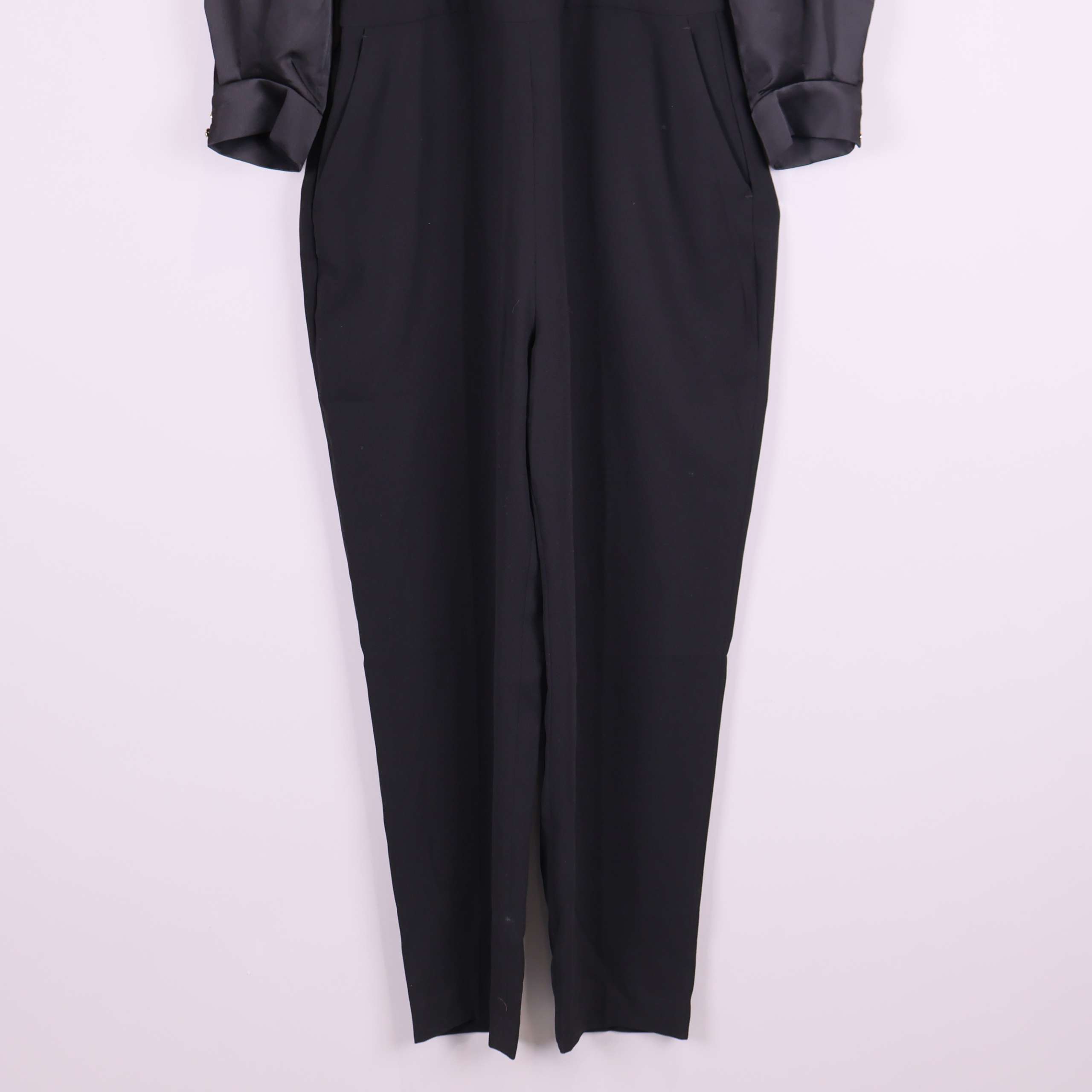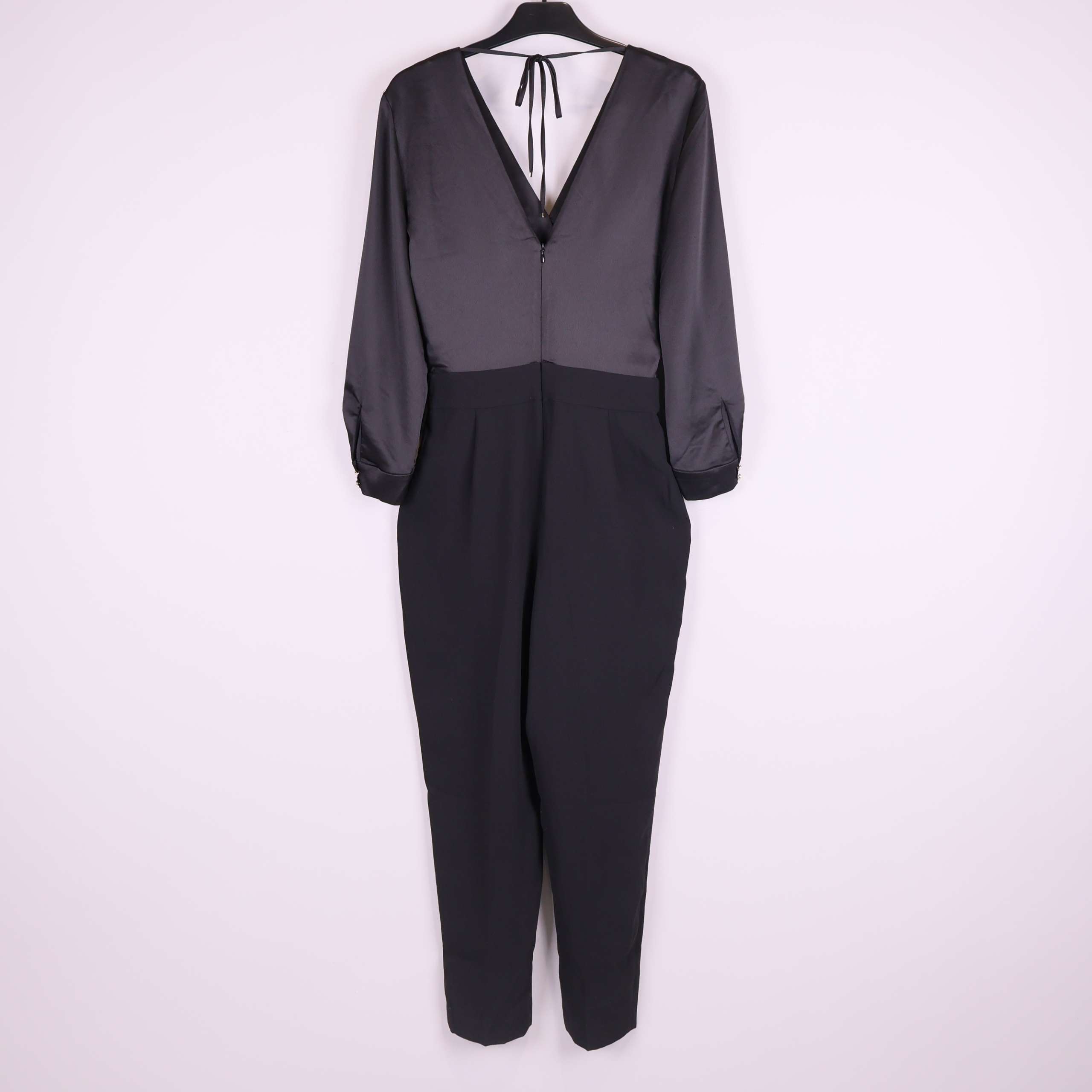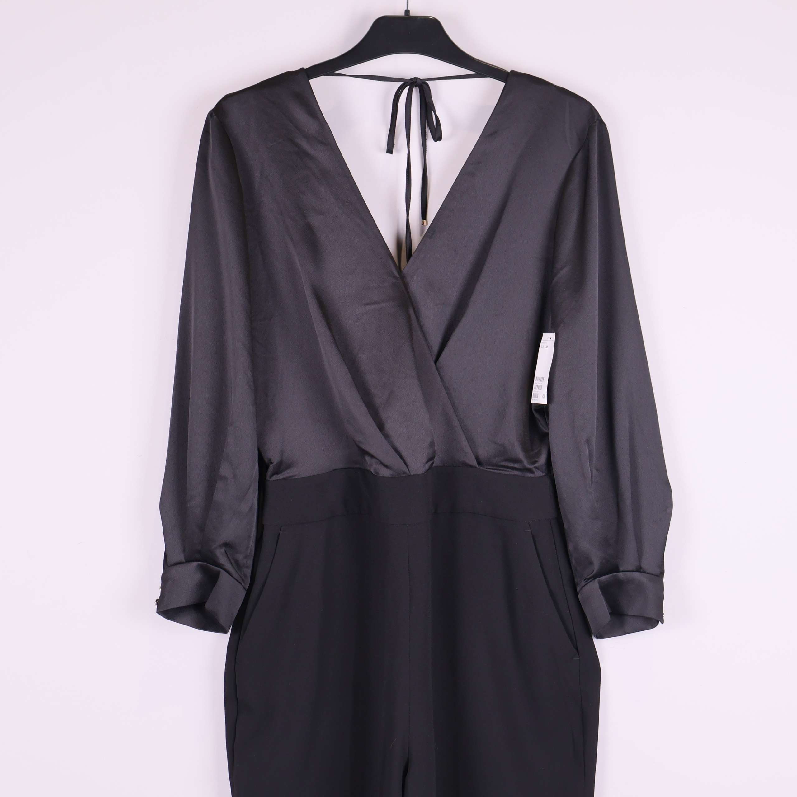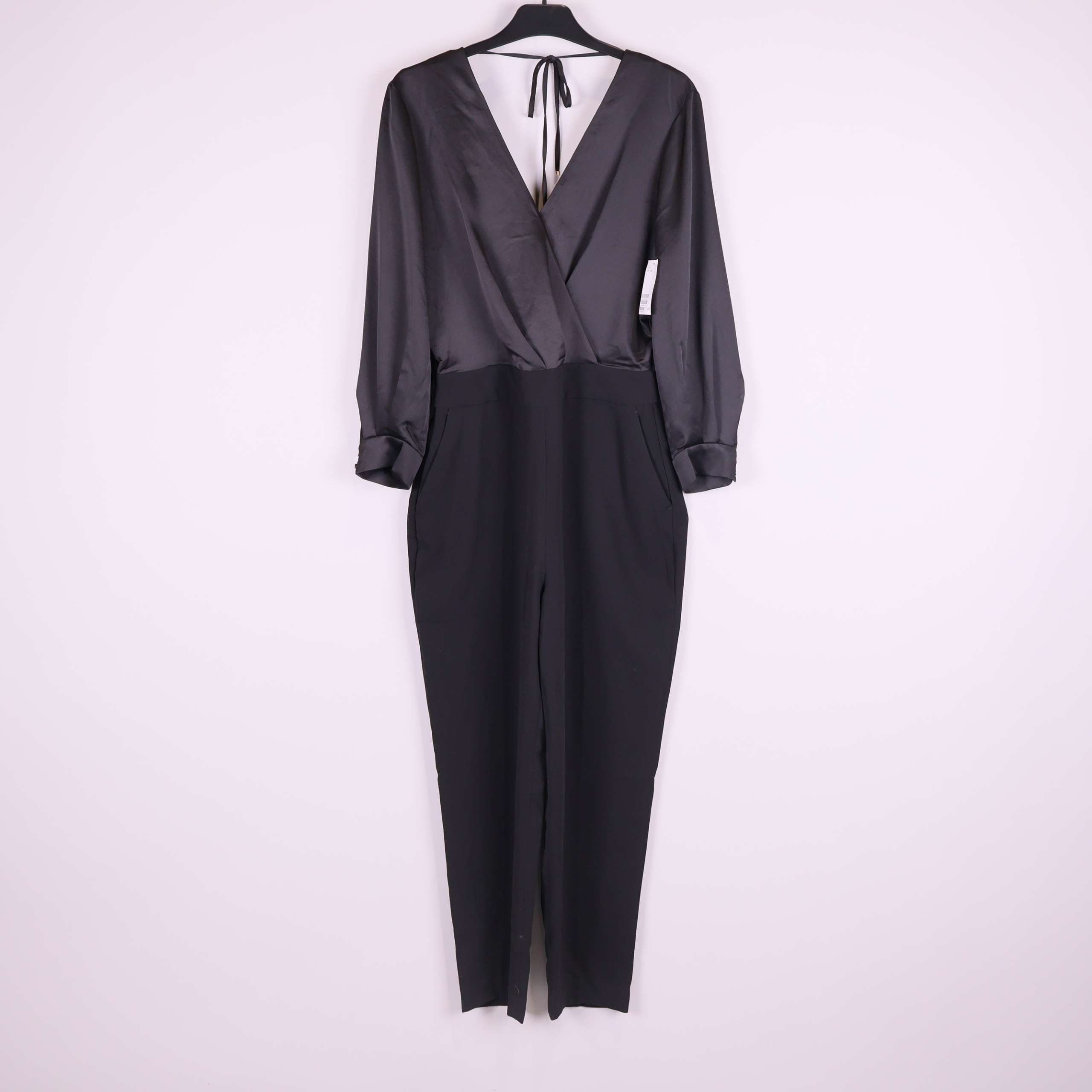 Elegant svart jumpsuit med lång ärm och omlottliv framtill samt djup v-ringning i ryggen med knytband. Överdel i mjukt glansigt tyg som kontrasterar mot de matta, avsmalnande byxbenen. Lätt veck framtill, dolda fickor i sidorna och snygg passform. Materialet ger en lyxig och dressad känsla – perfekt för både vardag och fest.