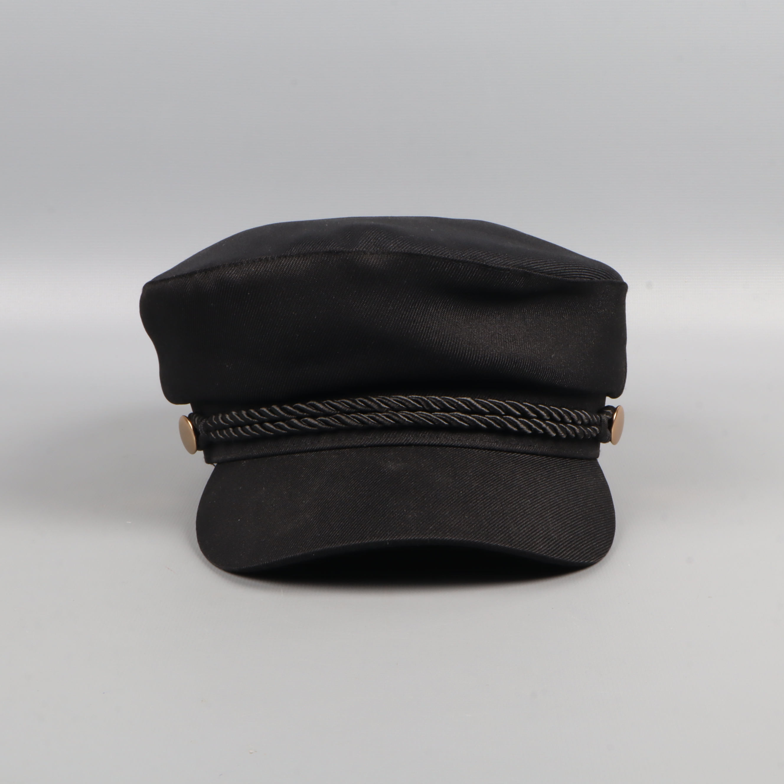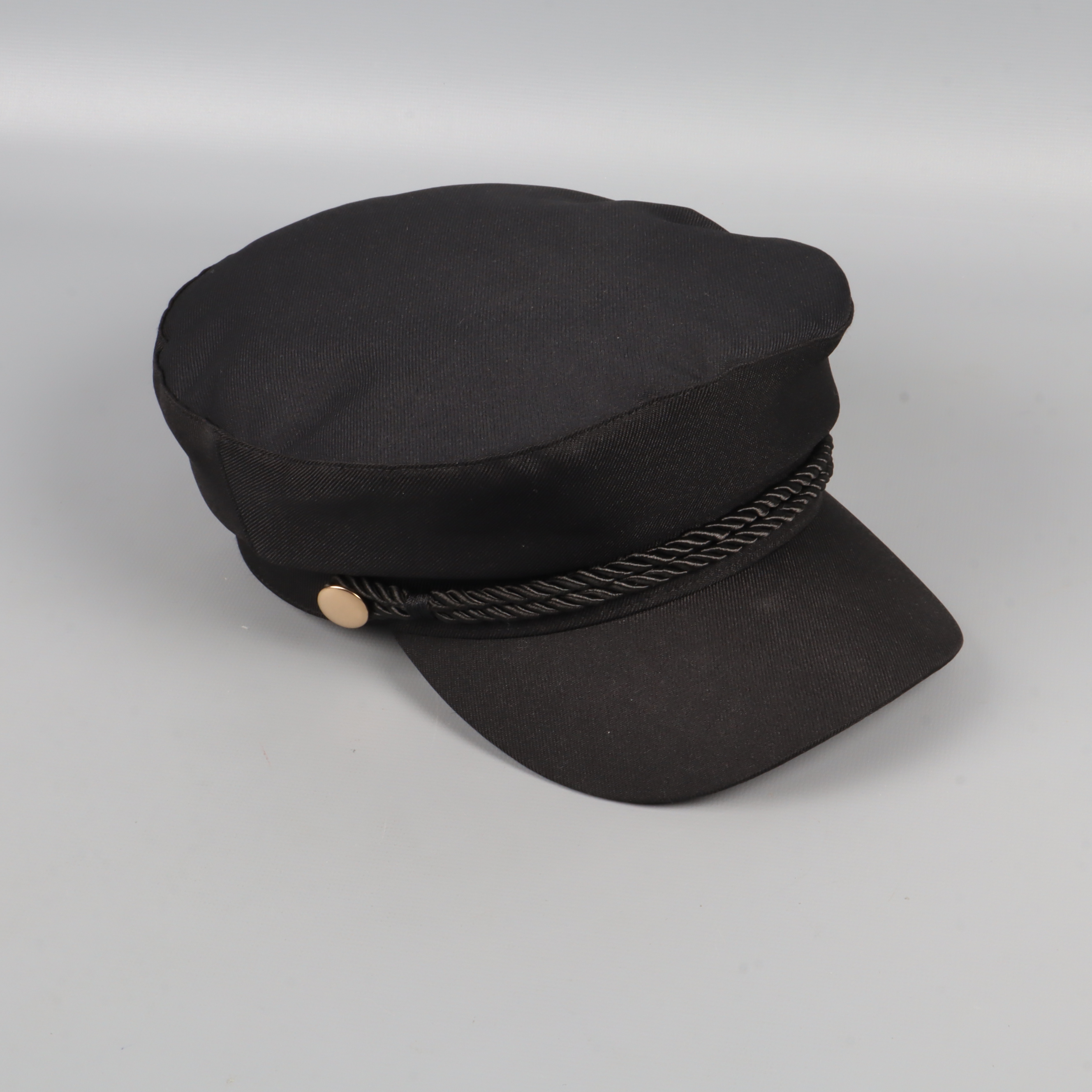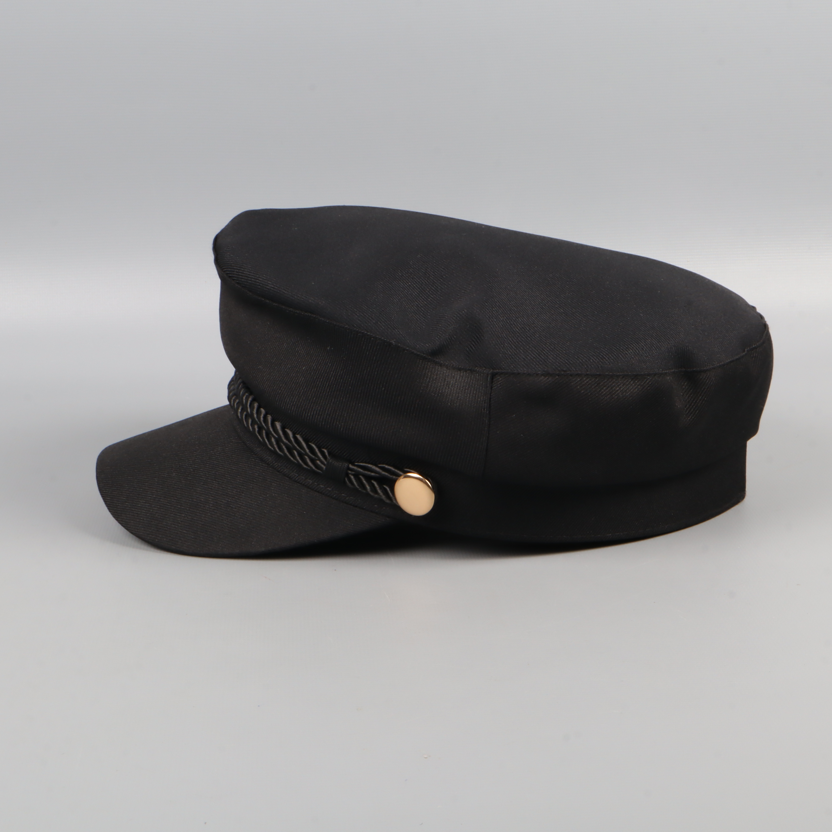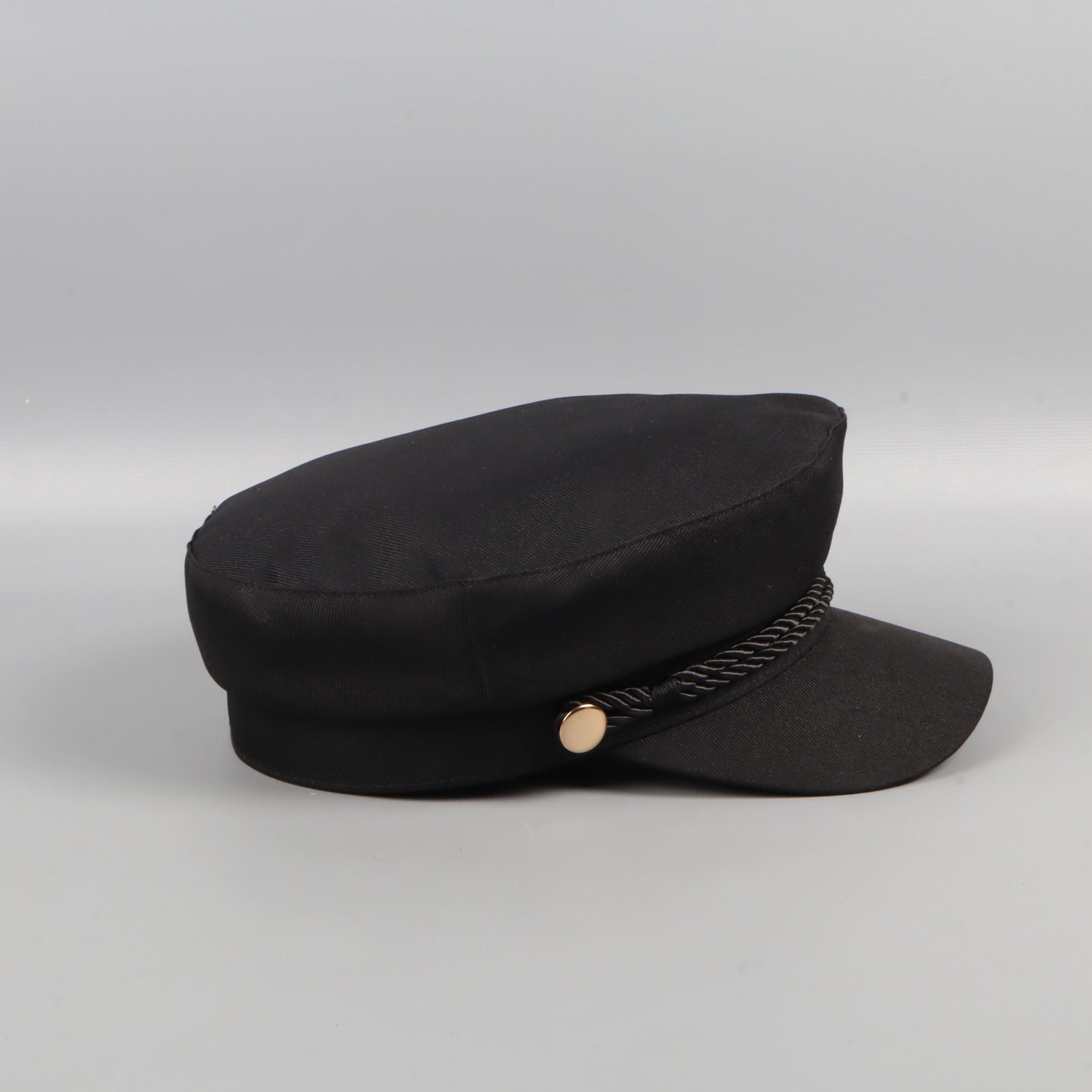 Modern svart kaptenskeps med dekorativt snörband över skärmen och detaljer i guldton. Insidan är fodrad med quiltat tyg för extra komfort. Passar perfekt för dig som gillar accessoarer med klassisk och tidlös look.