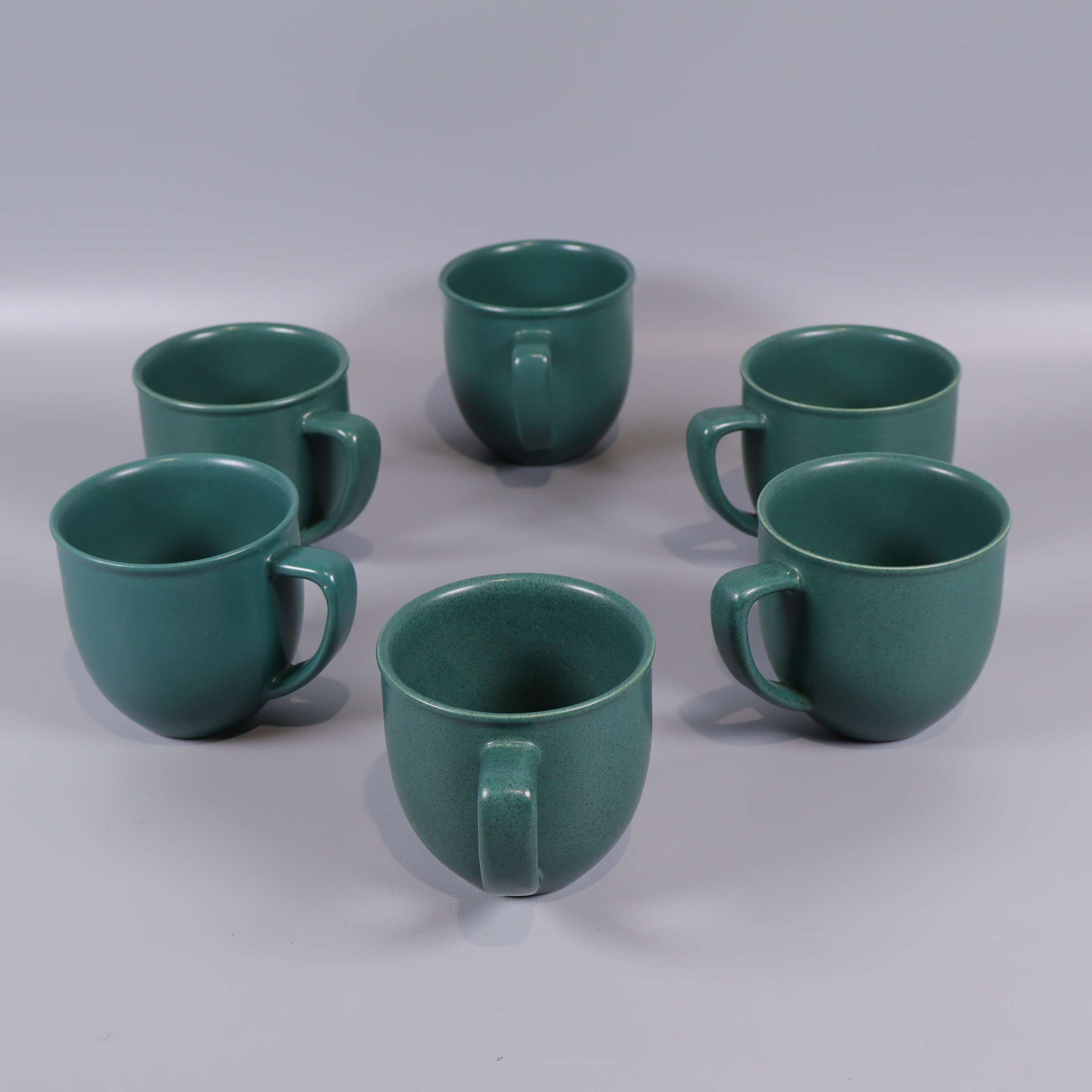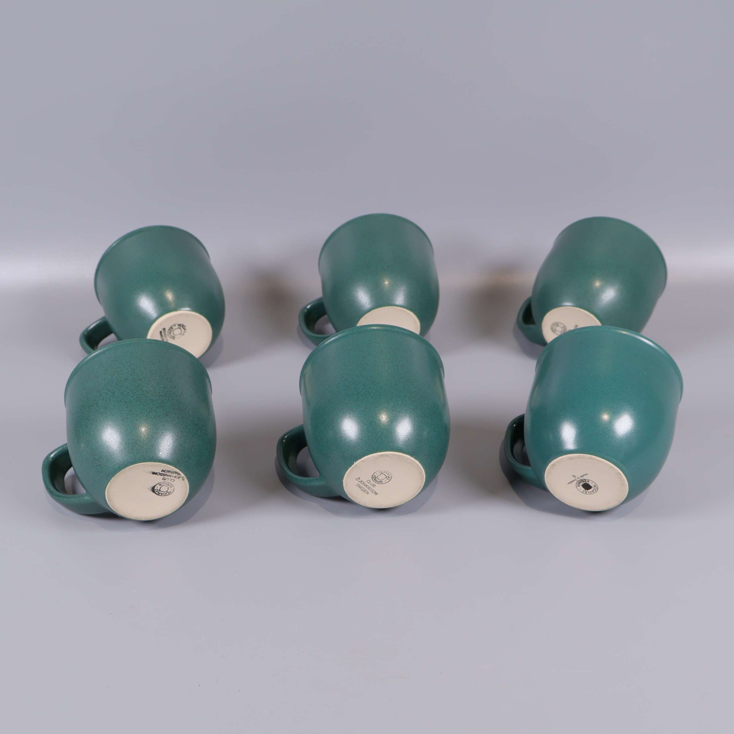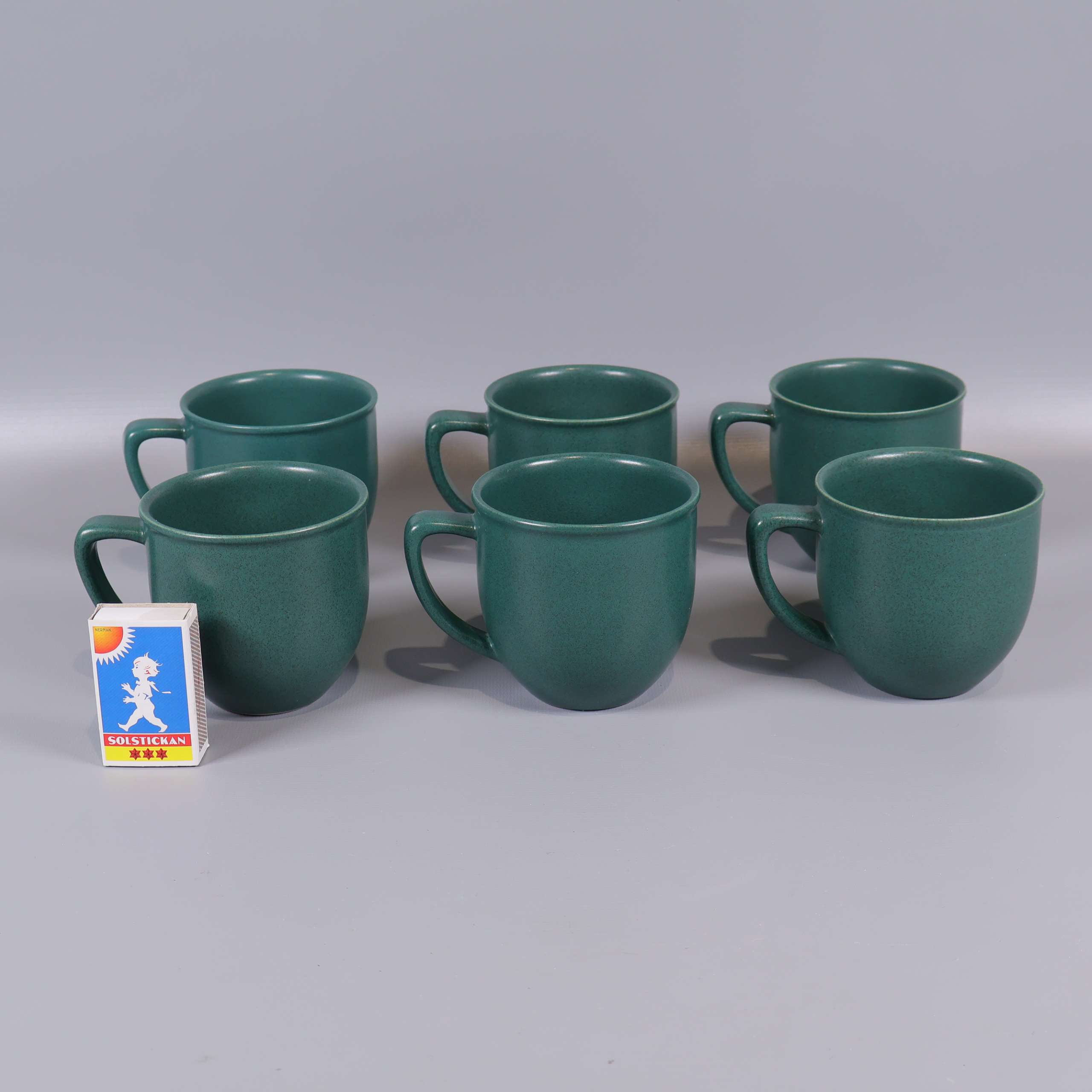 Set med sex keramikmuggar i dämpad grön nyans från Höganäs Keramik, serien Club designad av Örjan Johansson.