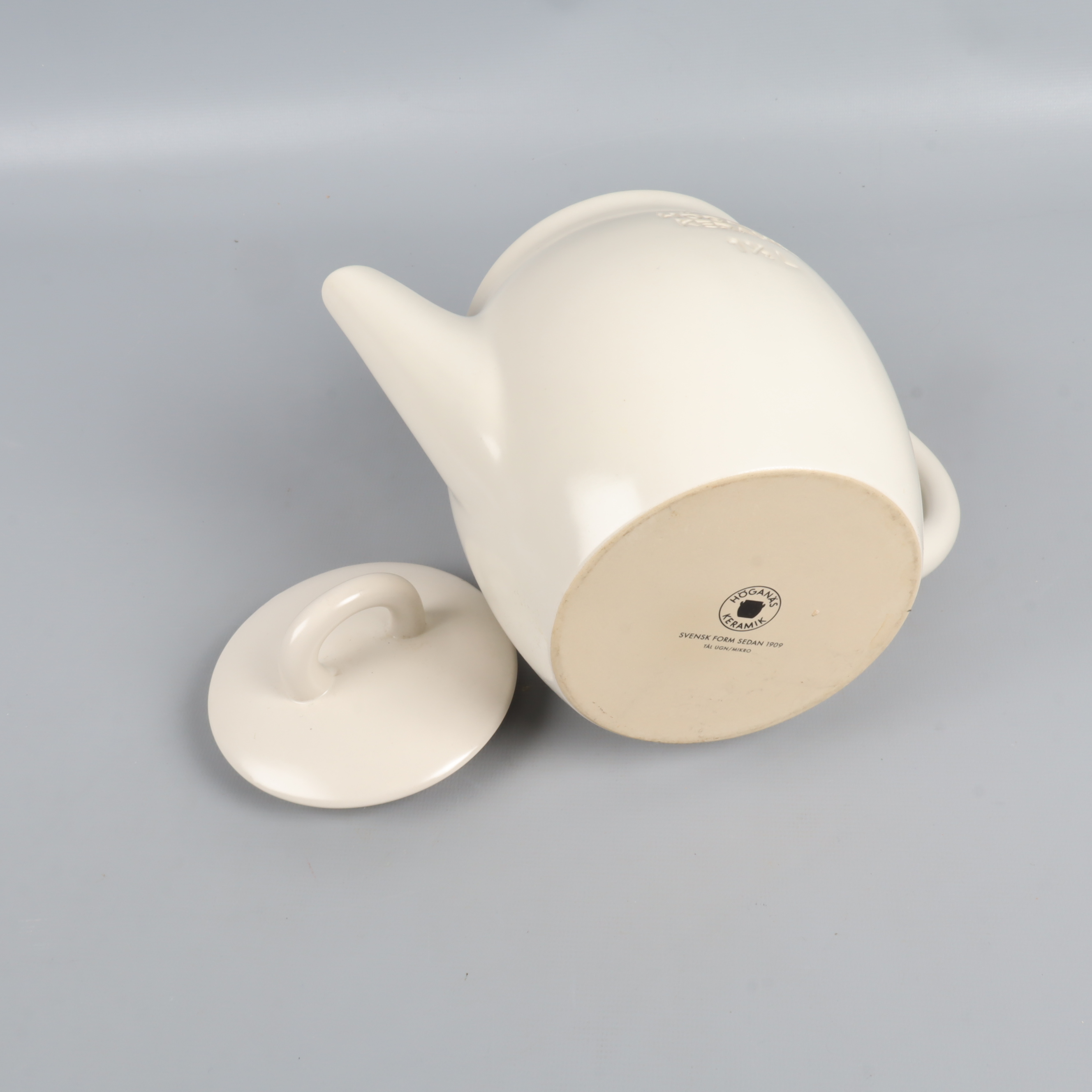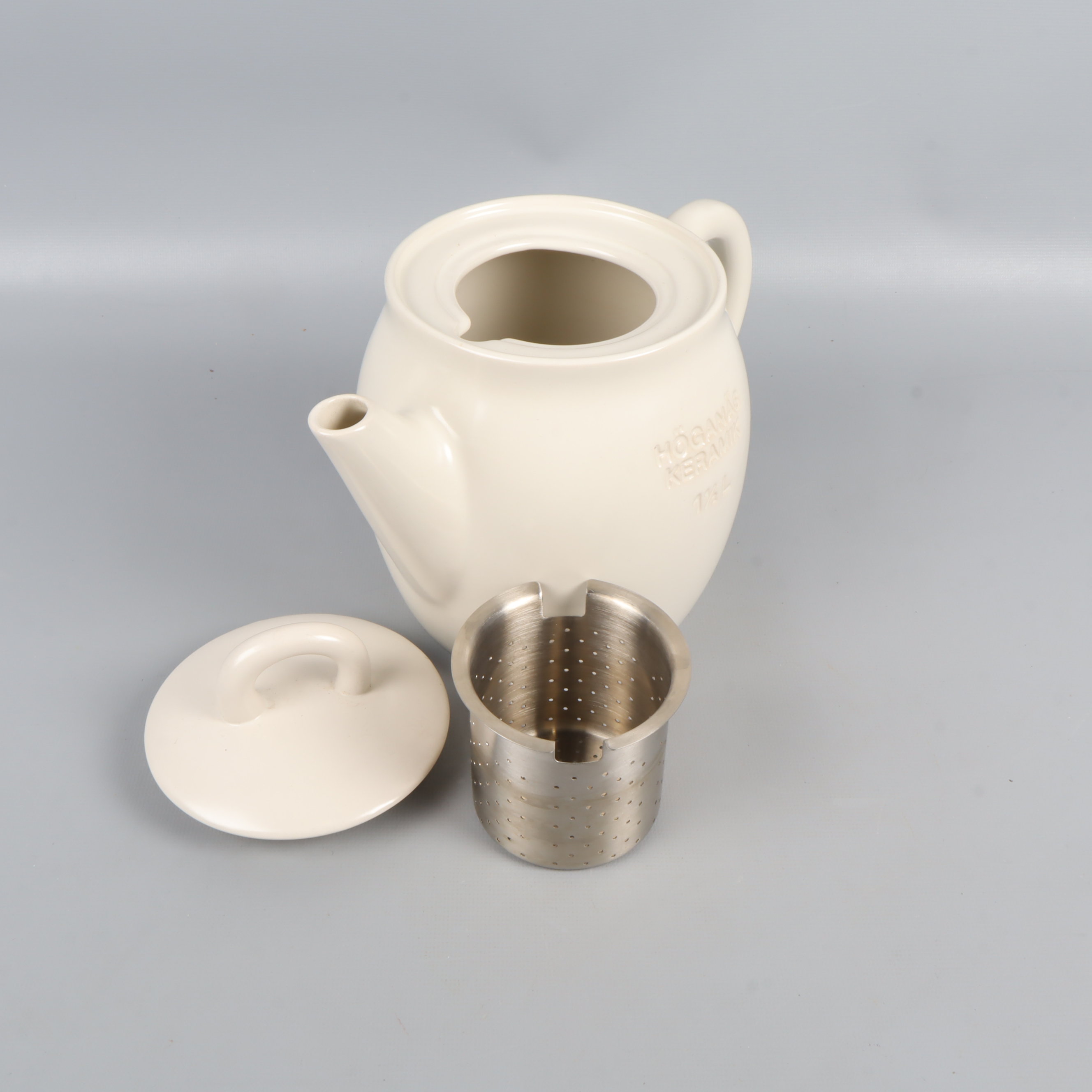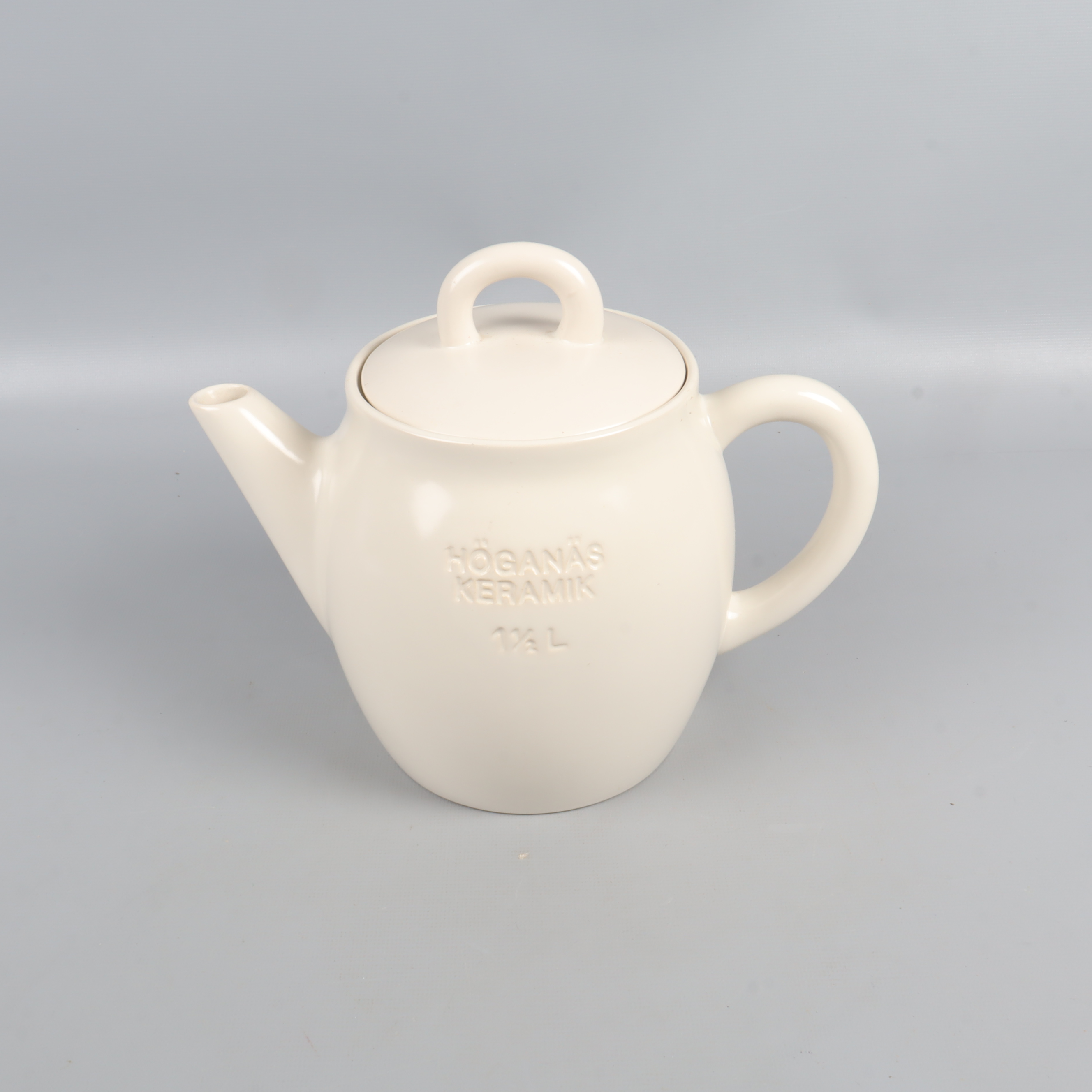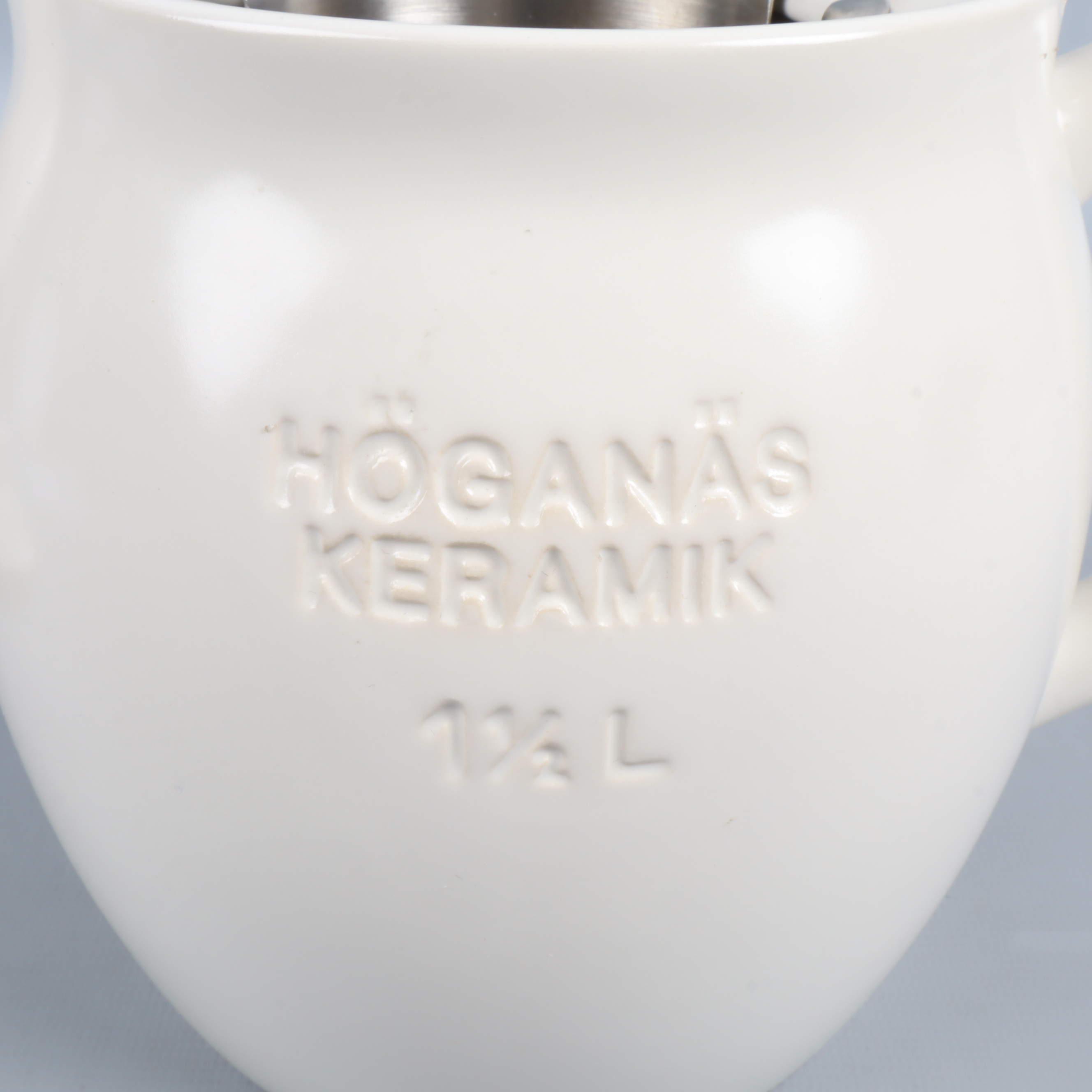 Elegant och tidlös tekanna i ljus keramik med generös volym på 1,5 liter och praktisk metallinsats för teblad. Tydlig logotyp från Höganäs Keramik präglar framsidan.