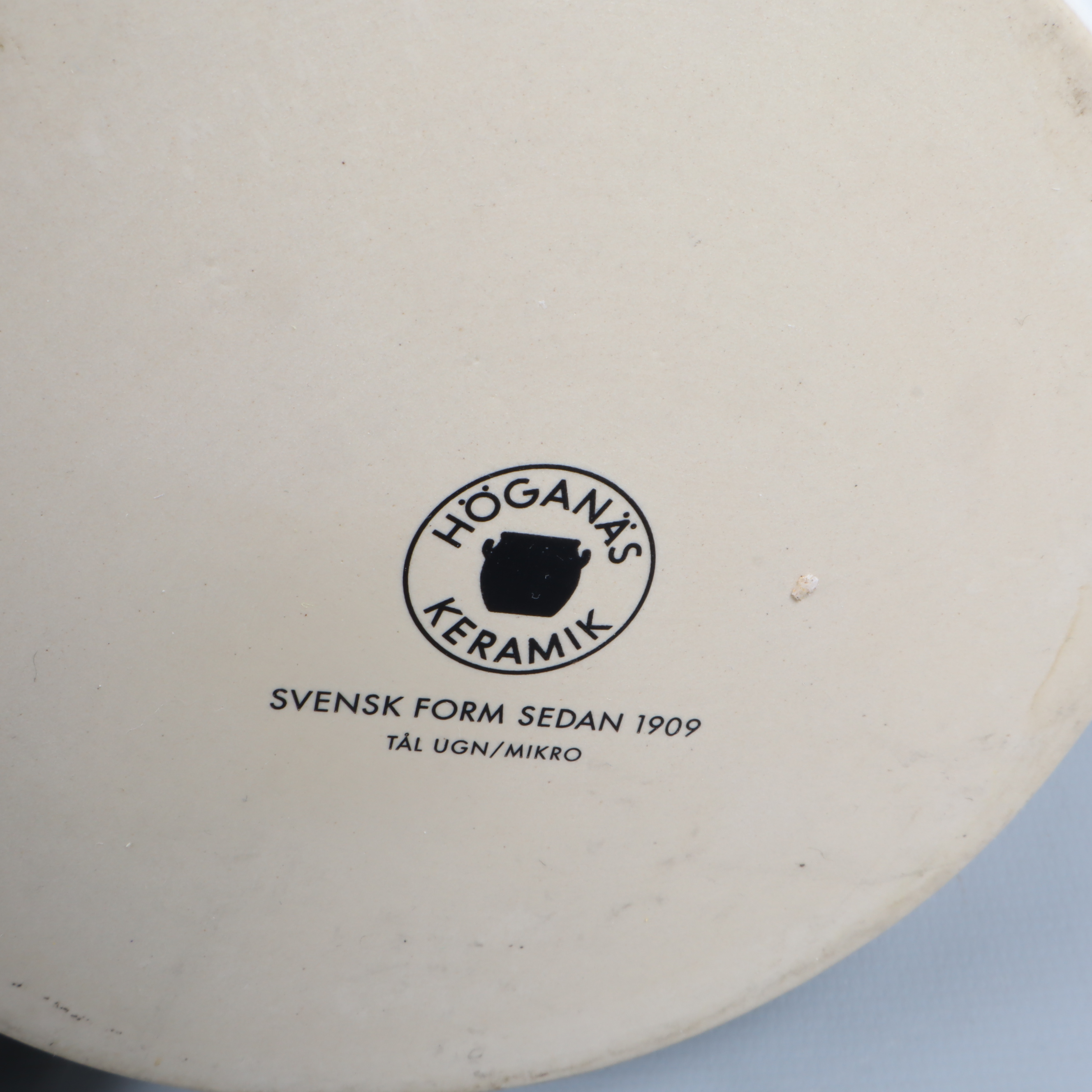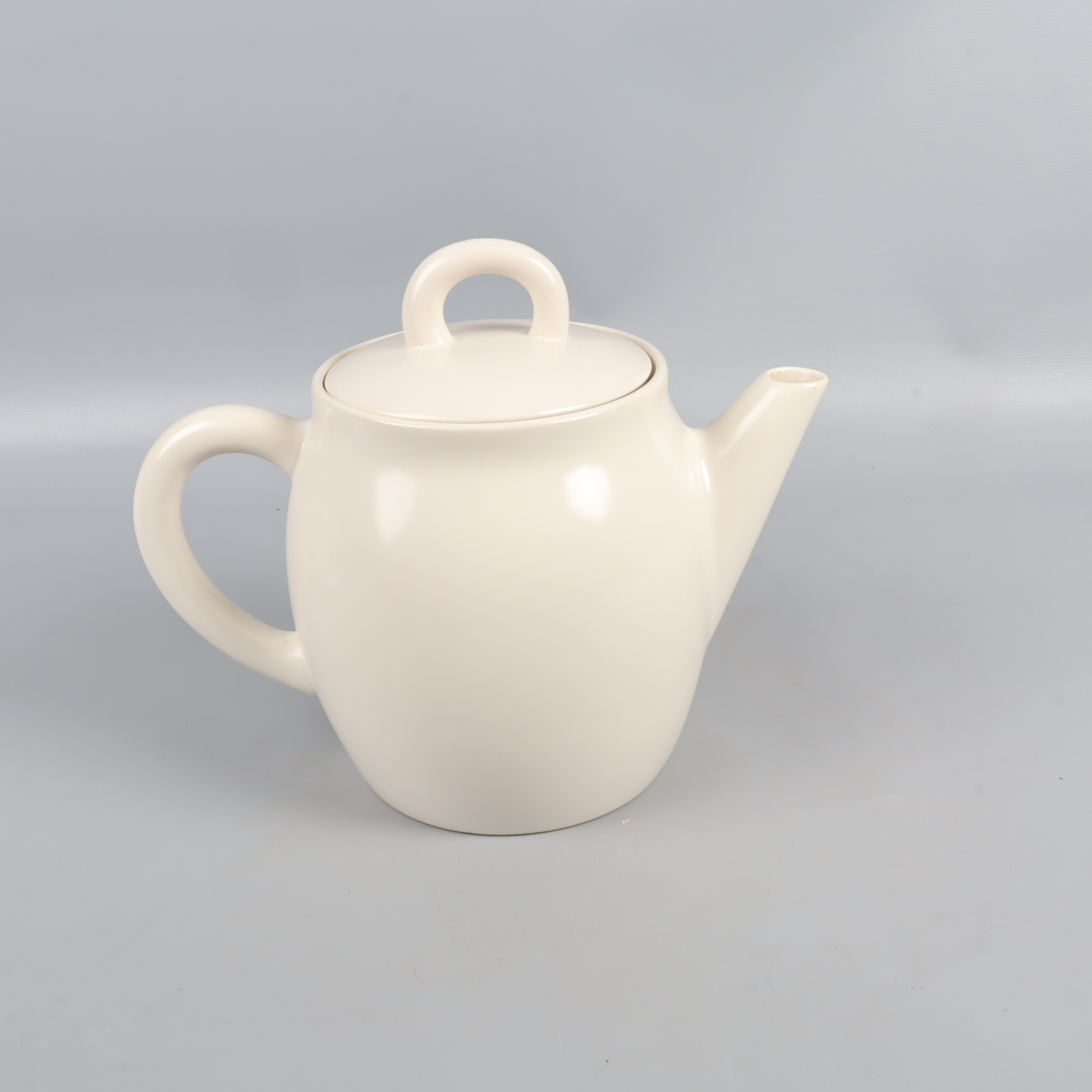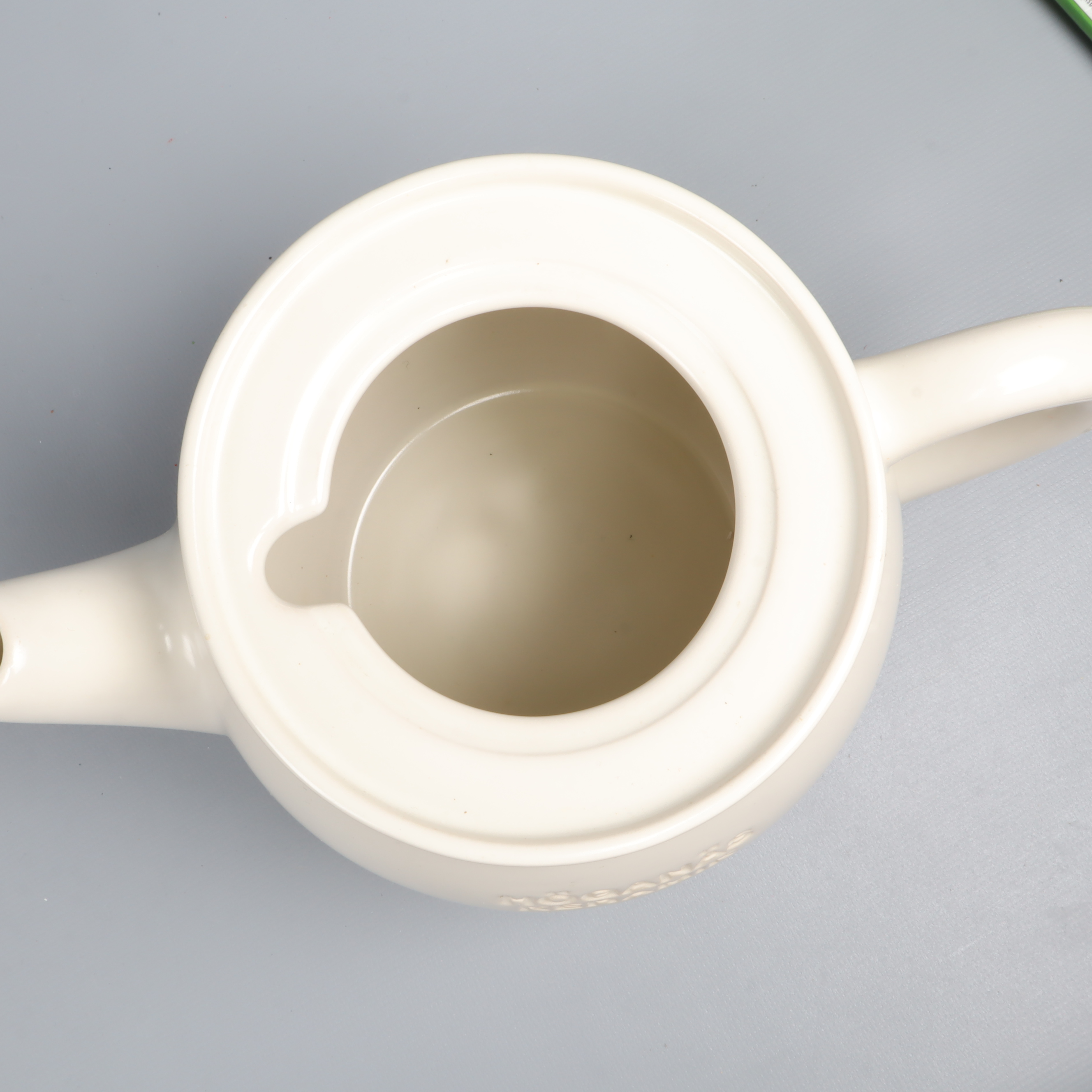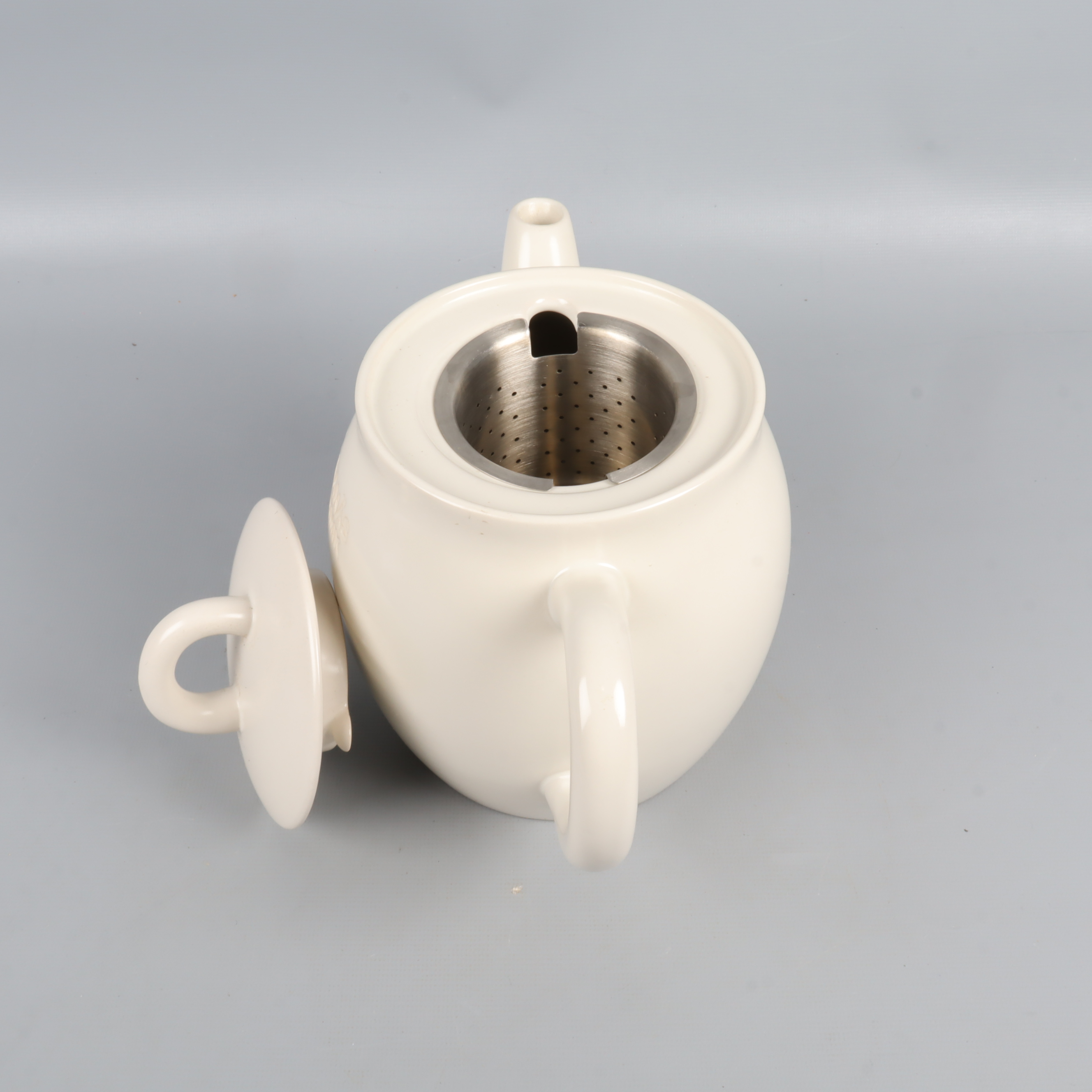 Elegant och tidlös tekanna i ljus keramik med generös volym på 1,5 liter och praktisk metallinsats för teblad. Tydlig logotyp från Höganäs Keramik präglar framsidan.