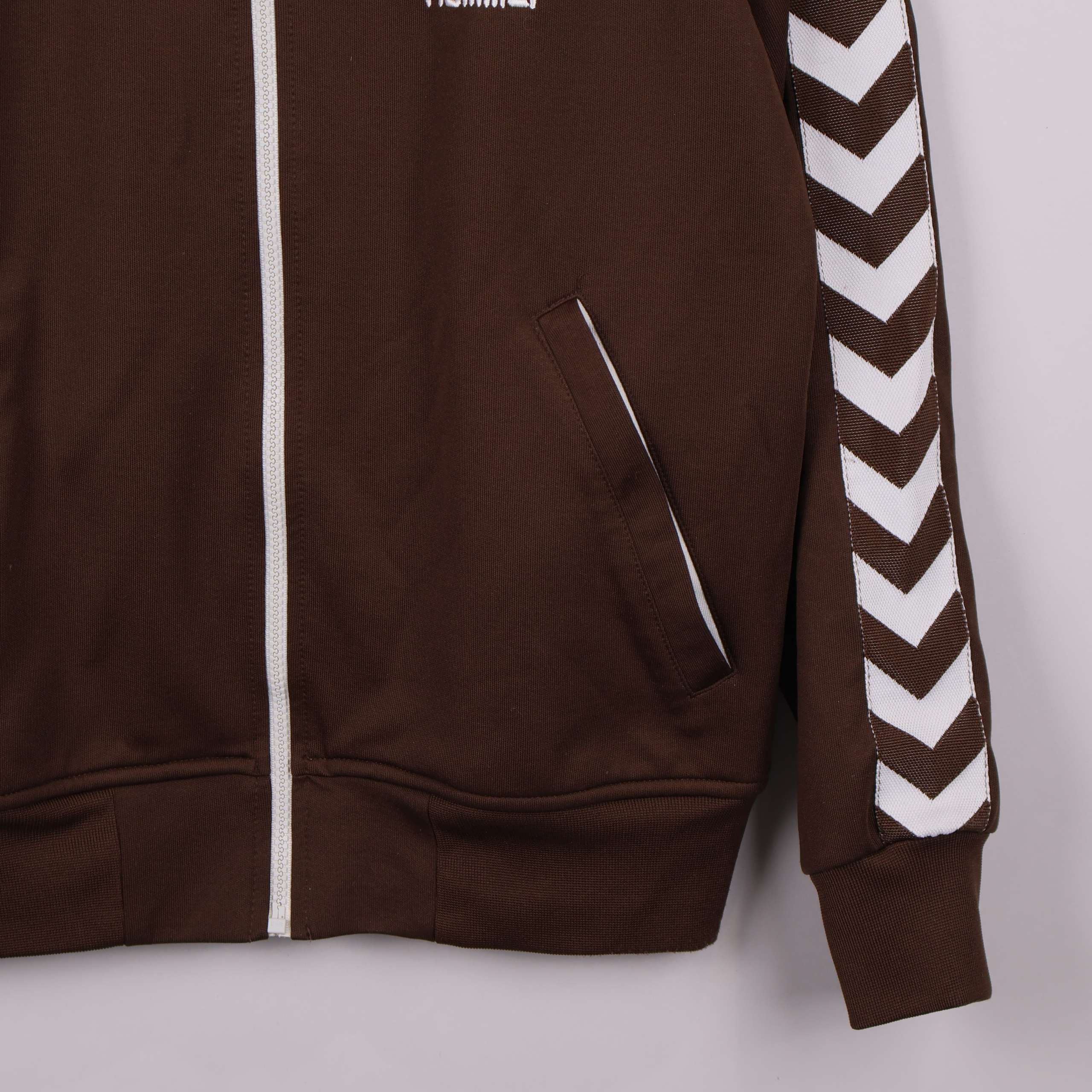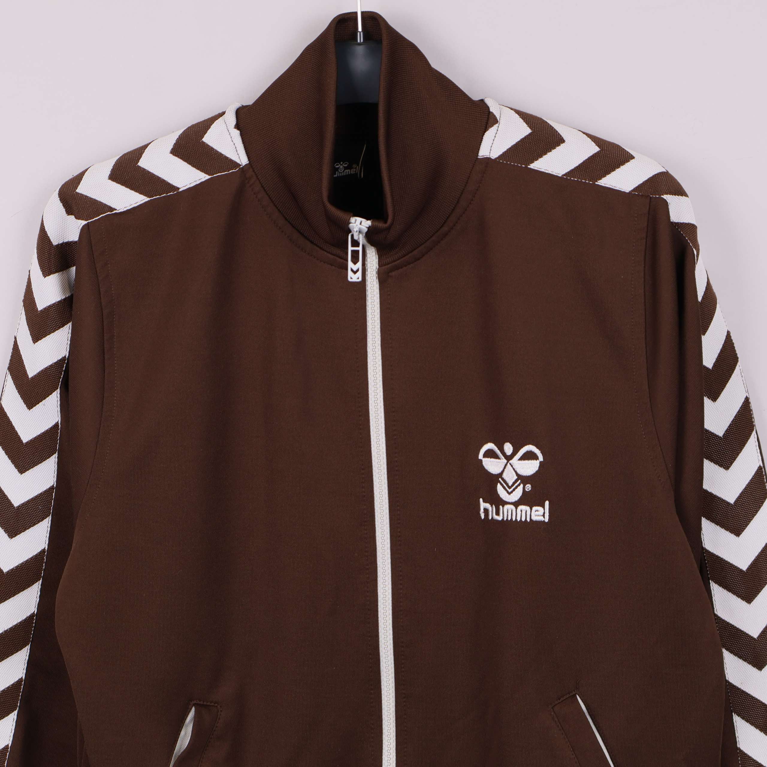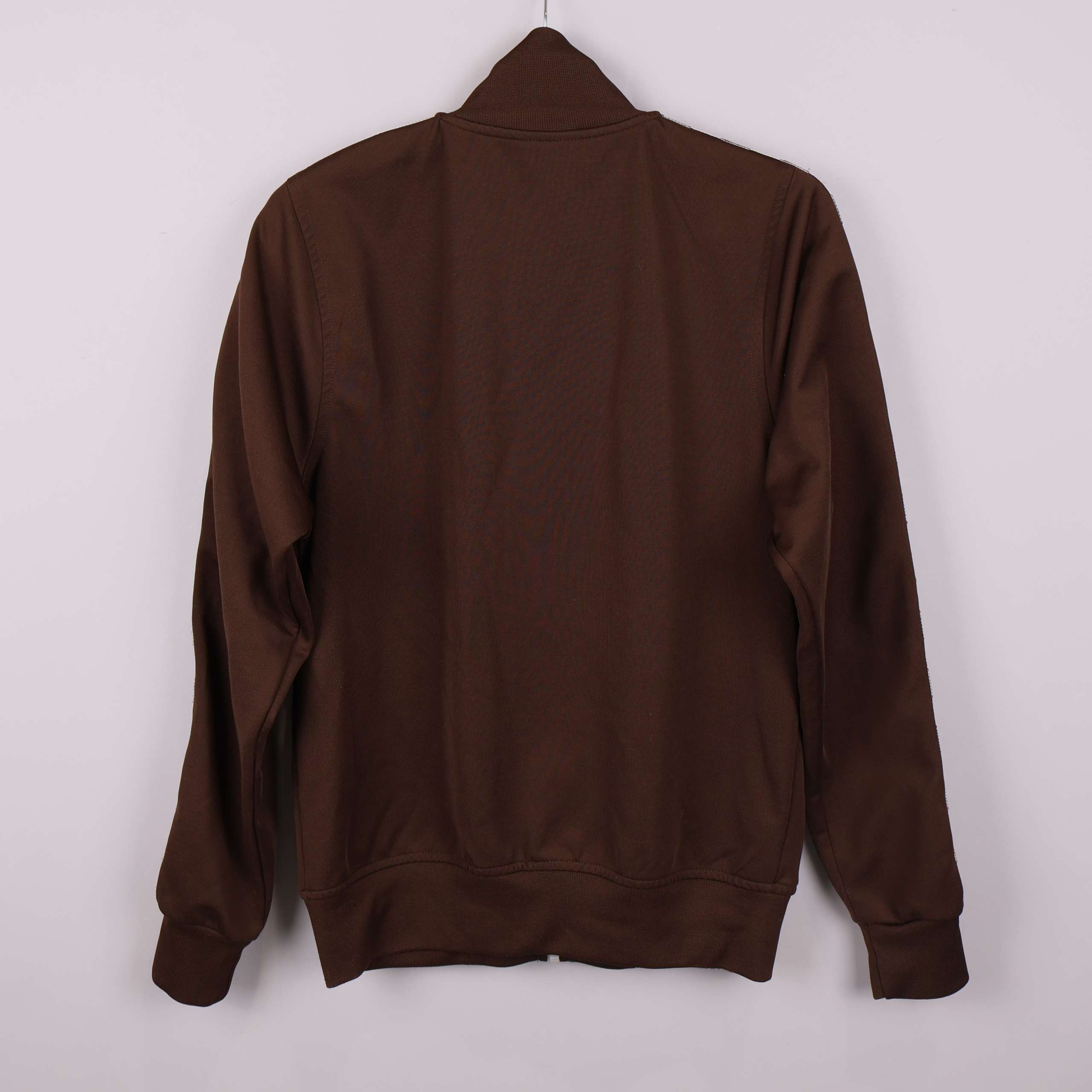 Sportig track jacket i brun färg med vita chevron-detaljer längs ärmarna för en klassisk retrostil. Jackan har ståkrage, vita dragkedjor och fickor framtill. Mjuka muddavslut ger en bekväm känsla och plagget har en avslappnad, urbana vibe. Materialet i jackan är mix av polyester och bomull för lättstretch och lättskött känsla. Perfekt när du vill ha en sportinspirerad look.