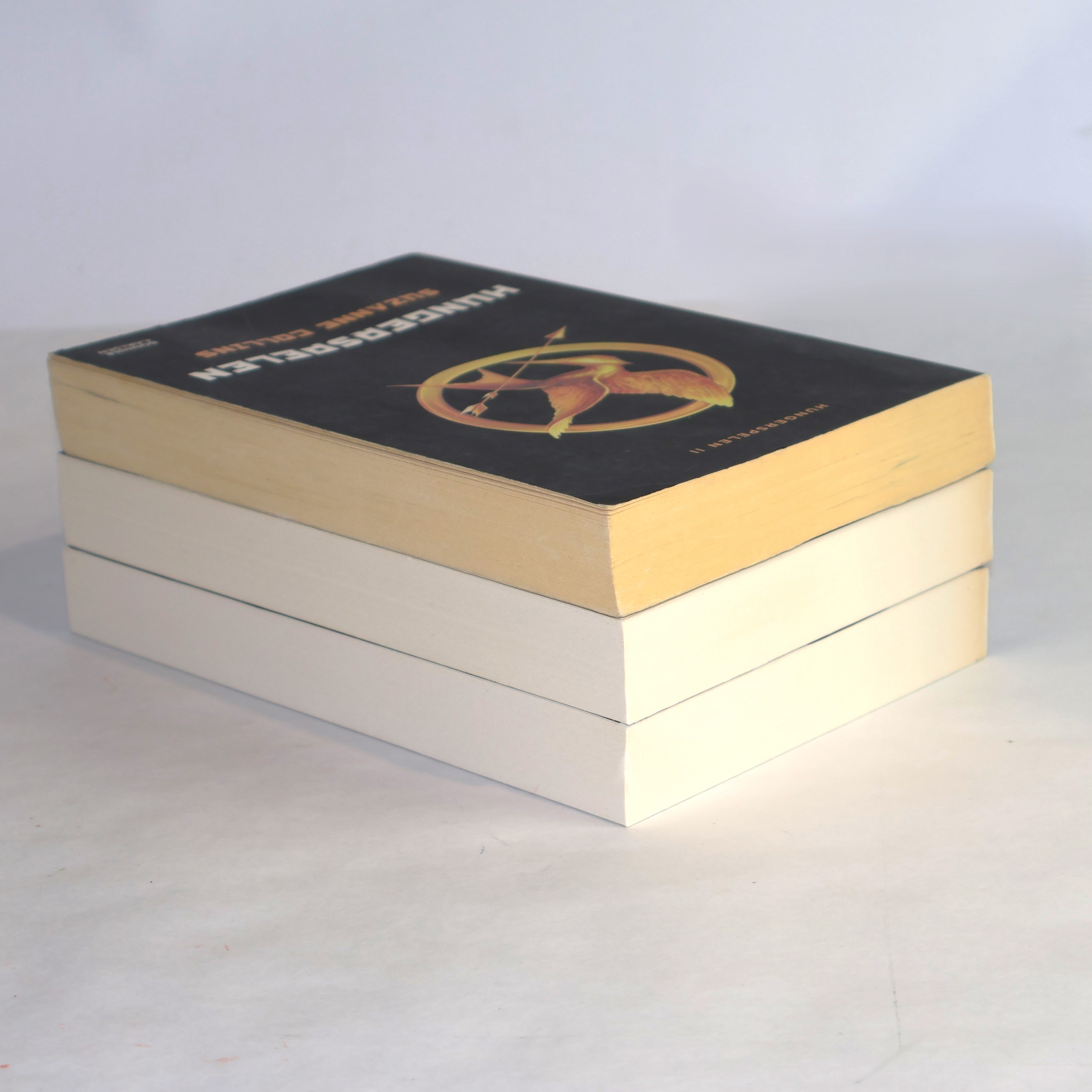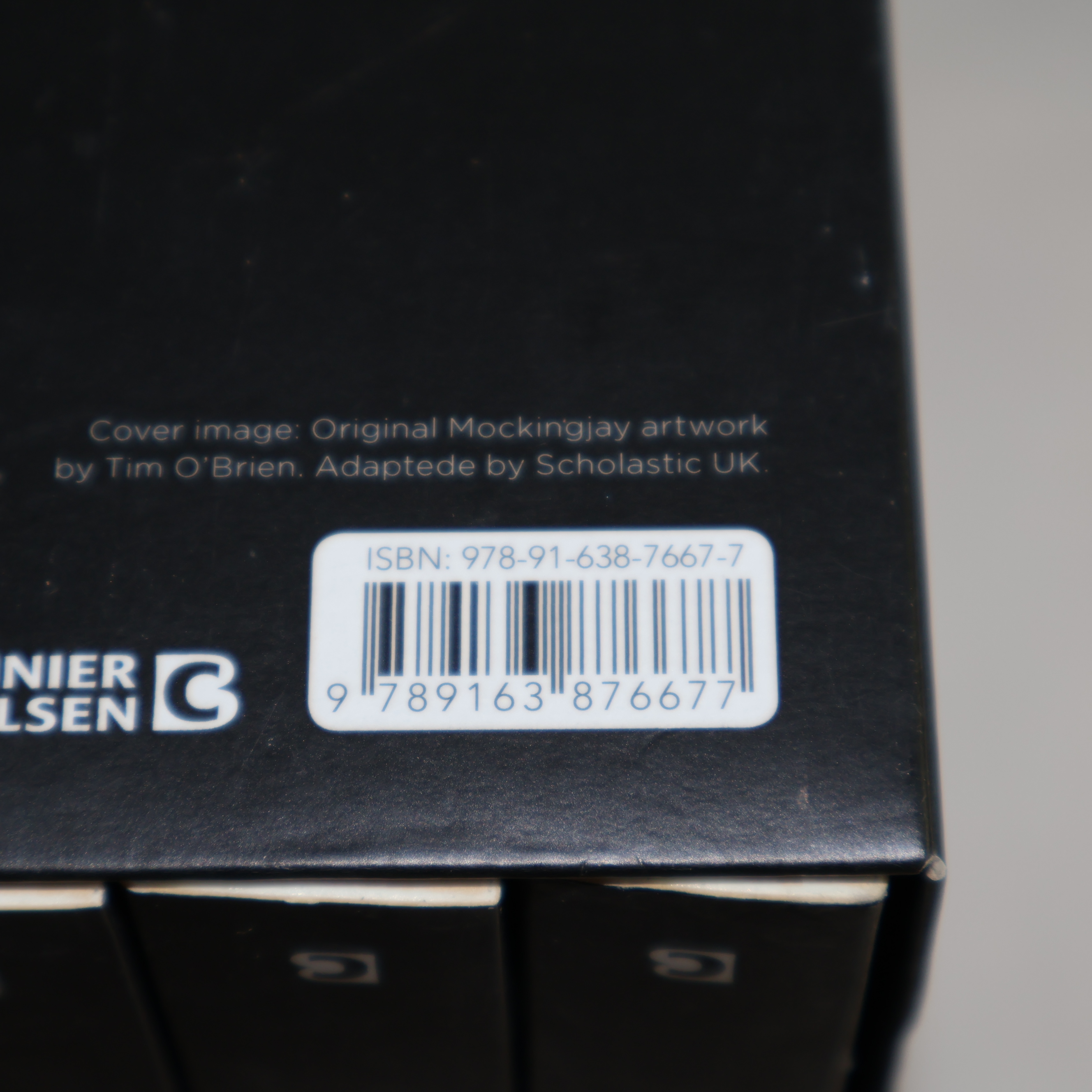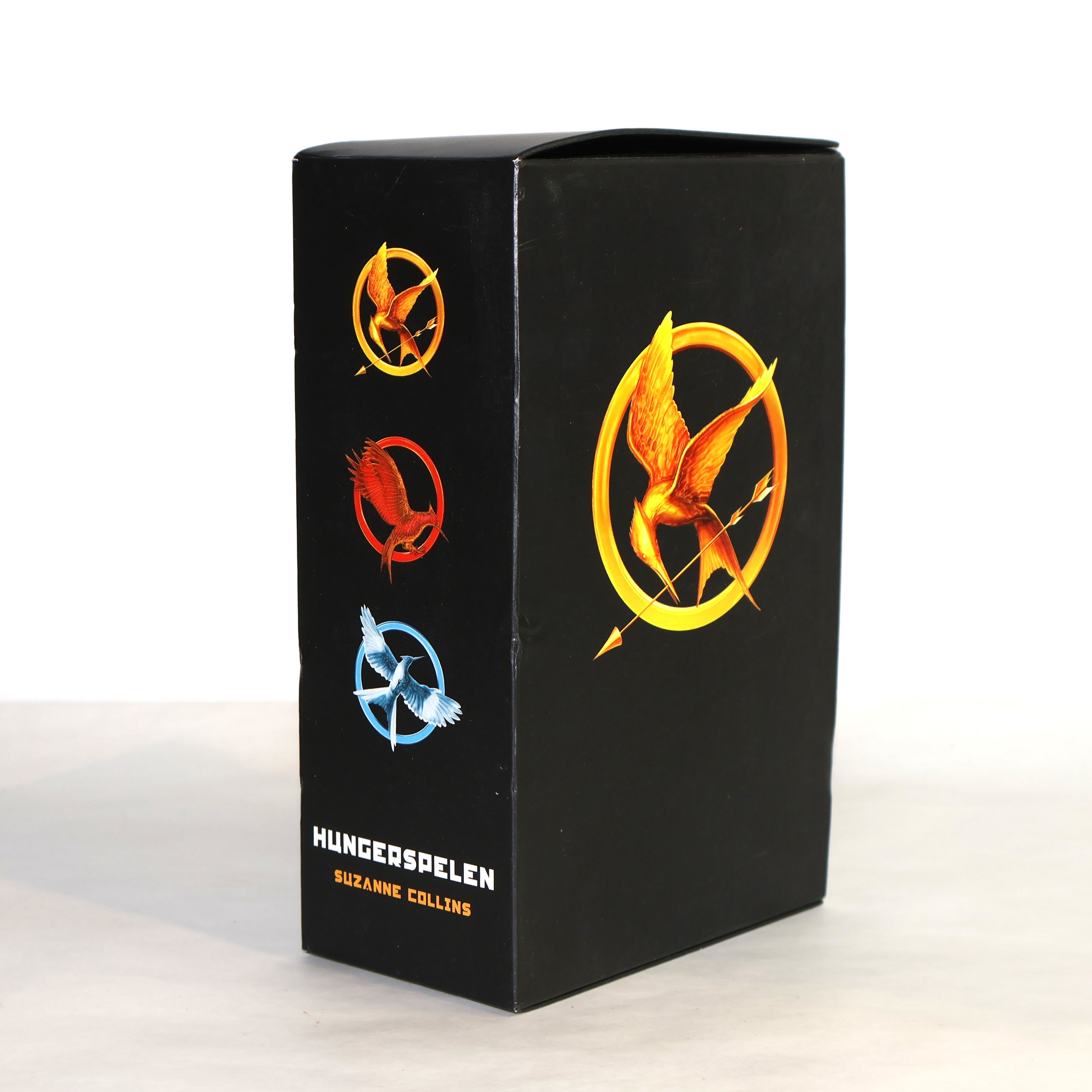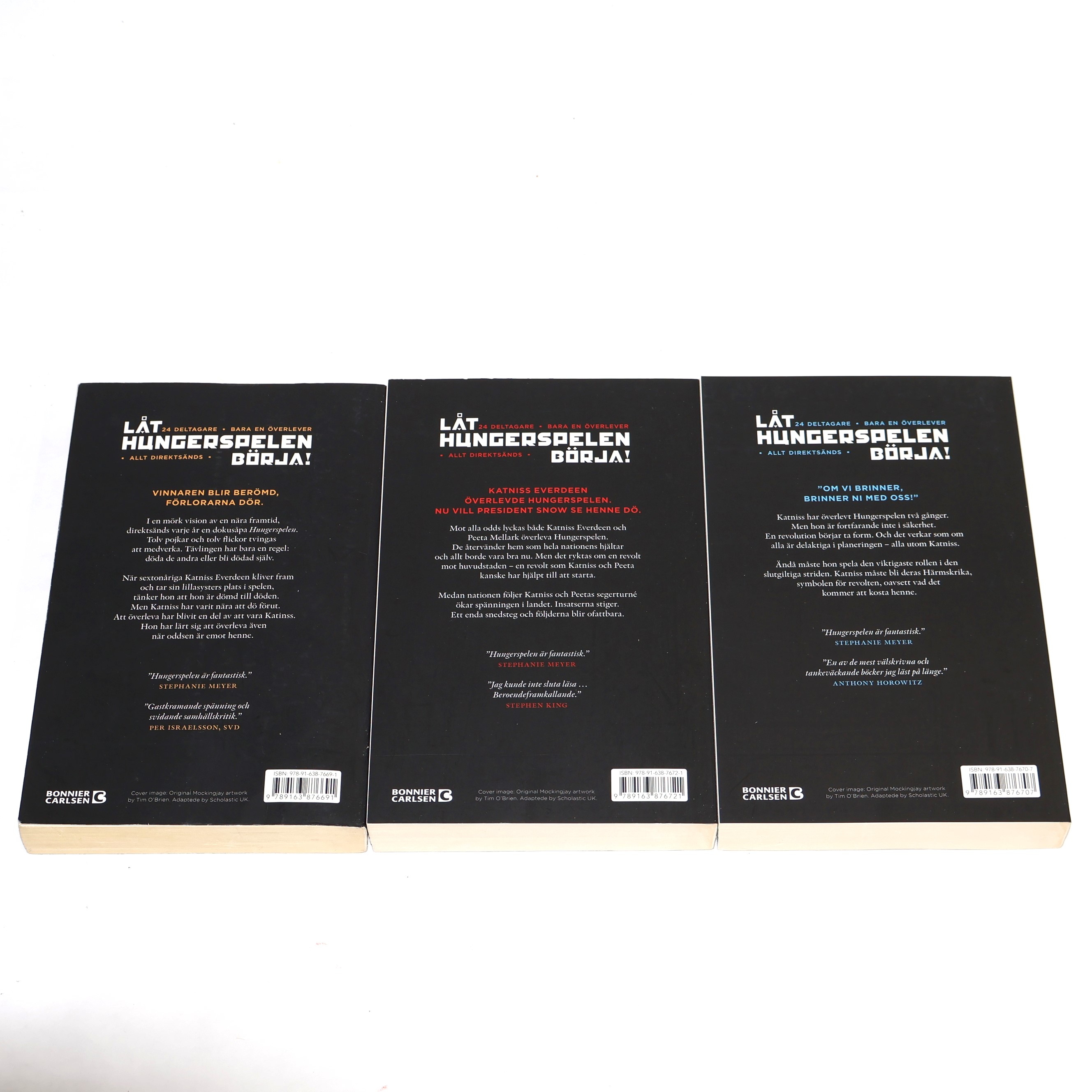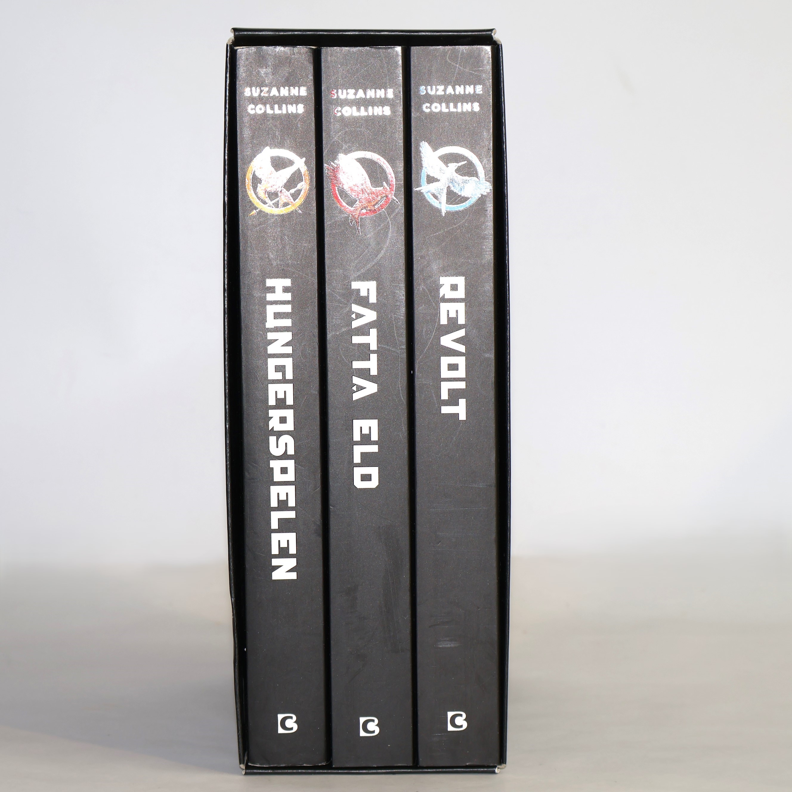 Samlarbox med Hungerspelen-trilogin av Suzanne Collins: Hungerspelen, Fatta eld och Revolt. Stilrena svarta omslag med färgstarka symboler på framsidan och ryggen, perfekt för dig som vill ha hela serien i en enhetlig look. Både böckerna och boxen ger en modern och snygg känsla i bokhyllan.