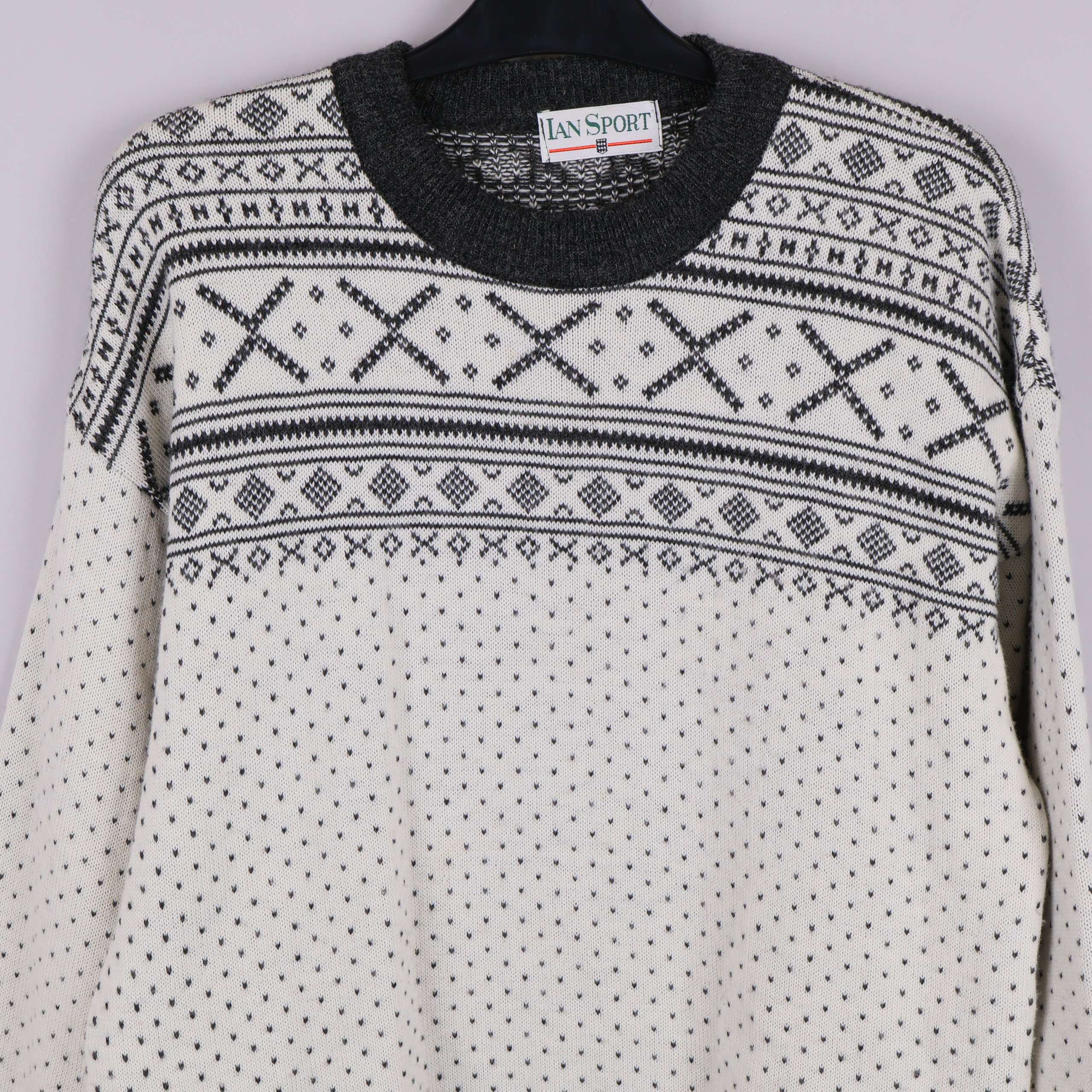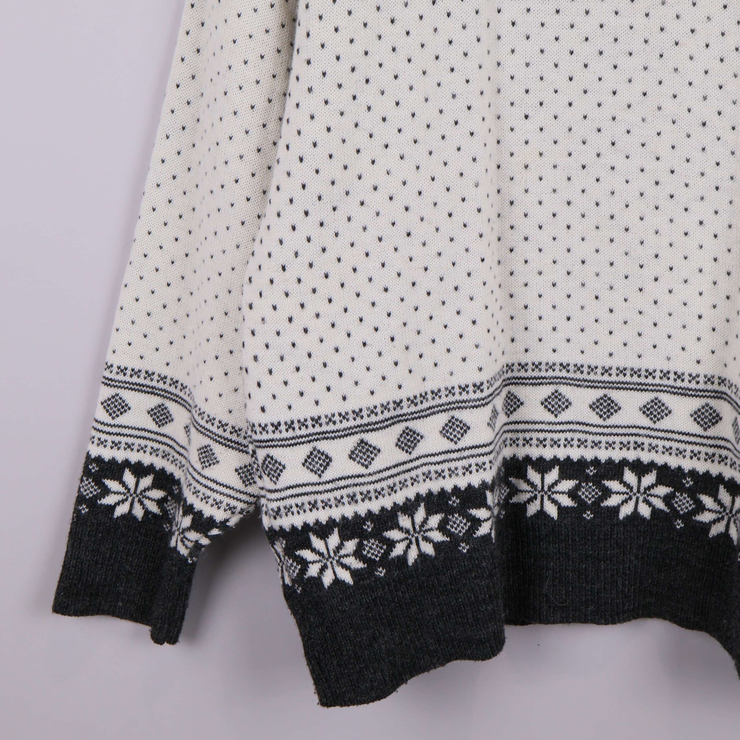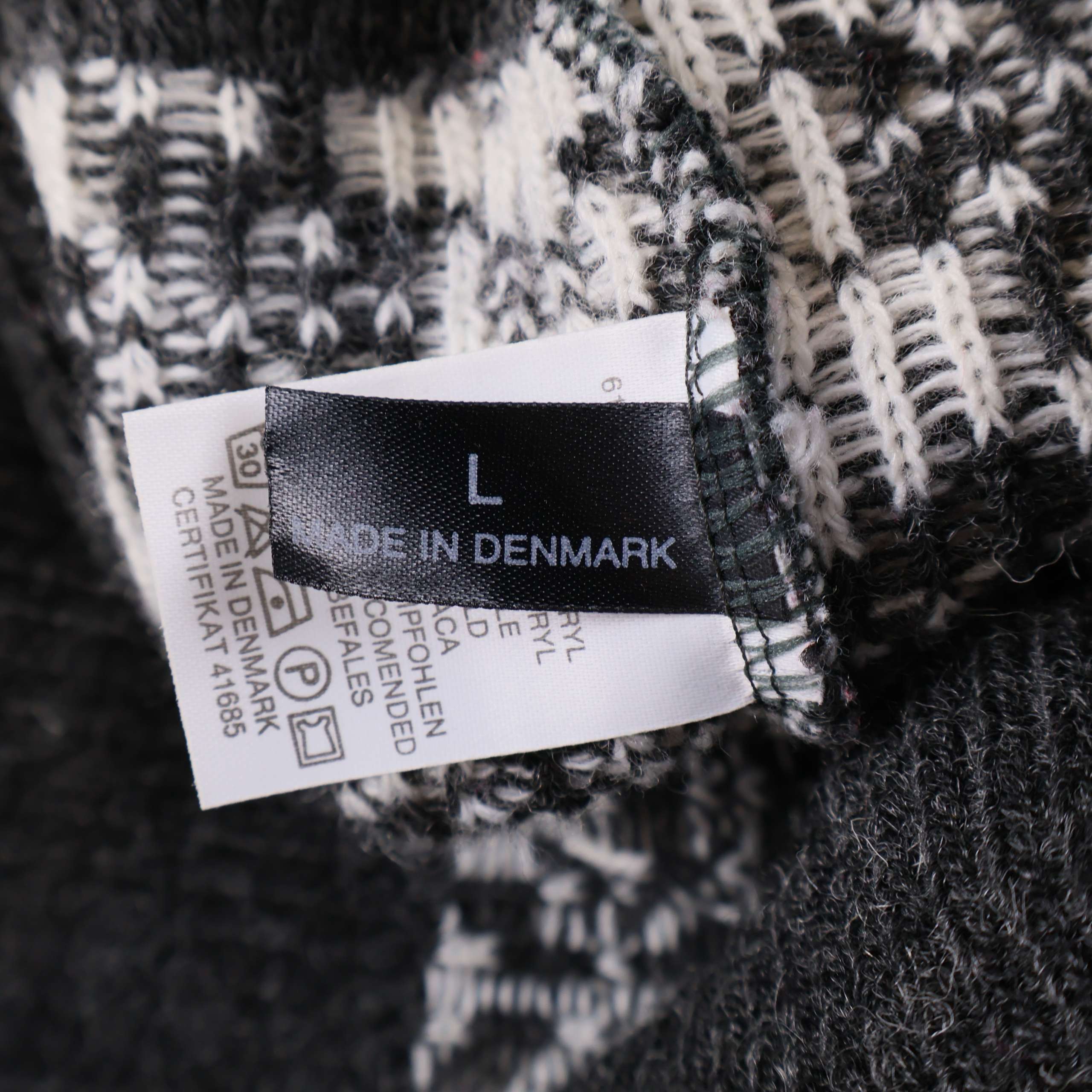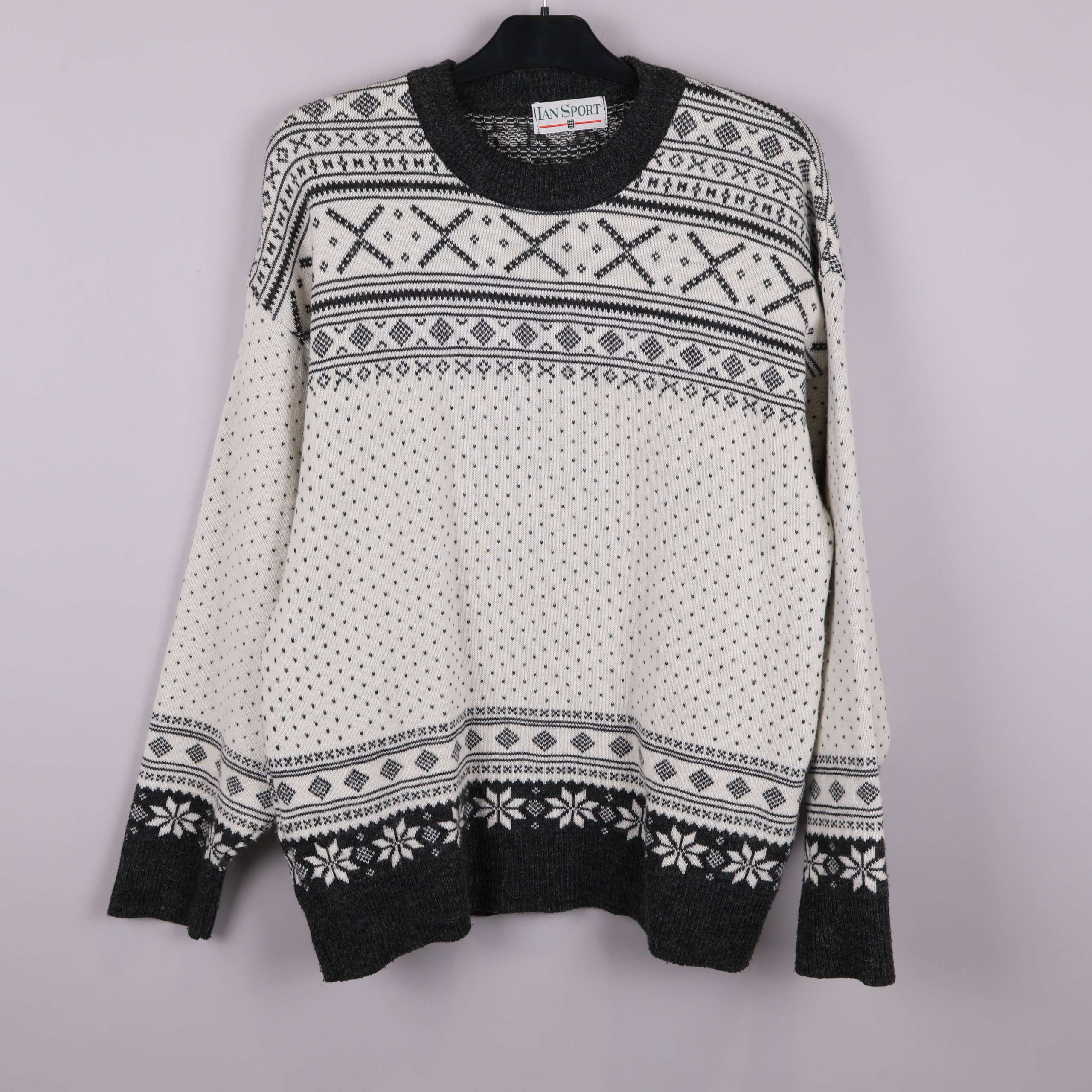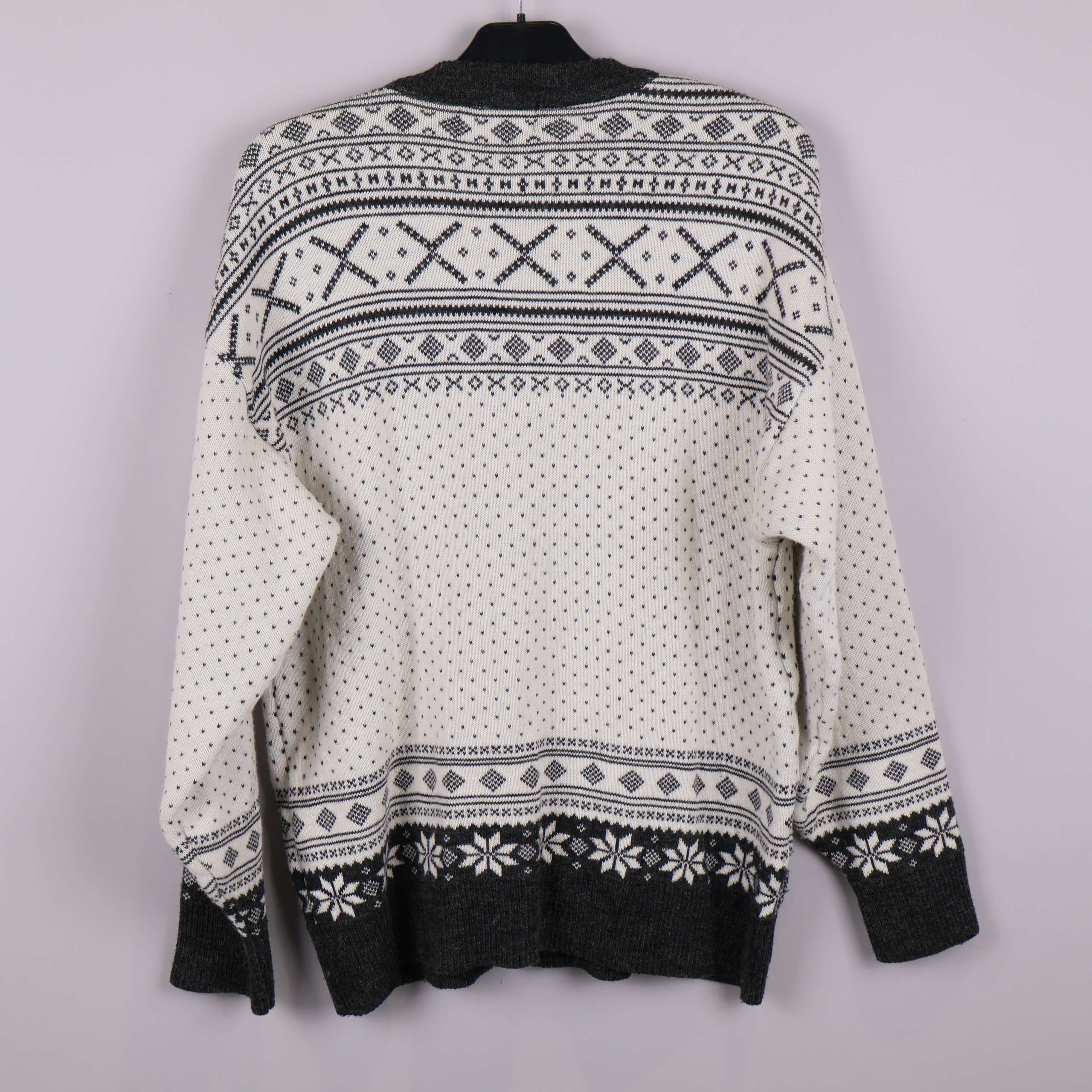 Stickad tröja med klassiskt nordiskt mönster i svart och vitt. Mjuka muddar och ribbad halsringning ger en bekväm känsla.