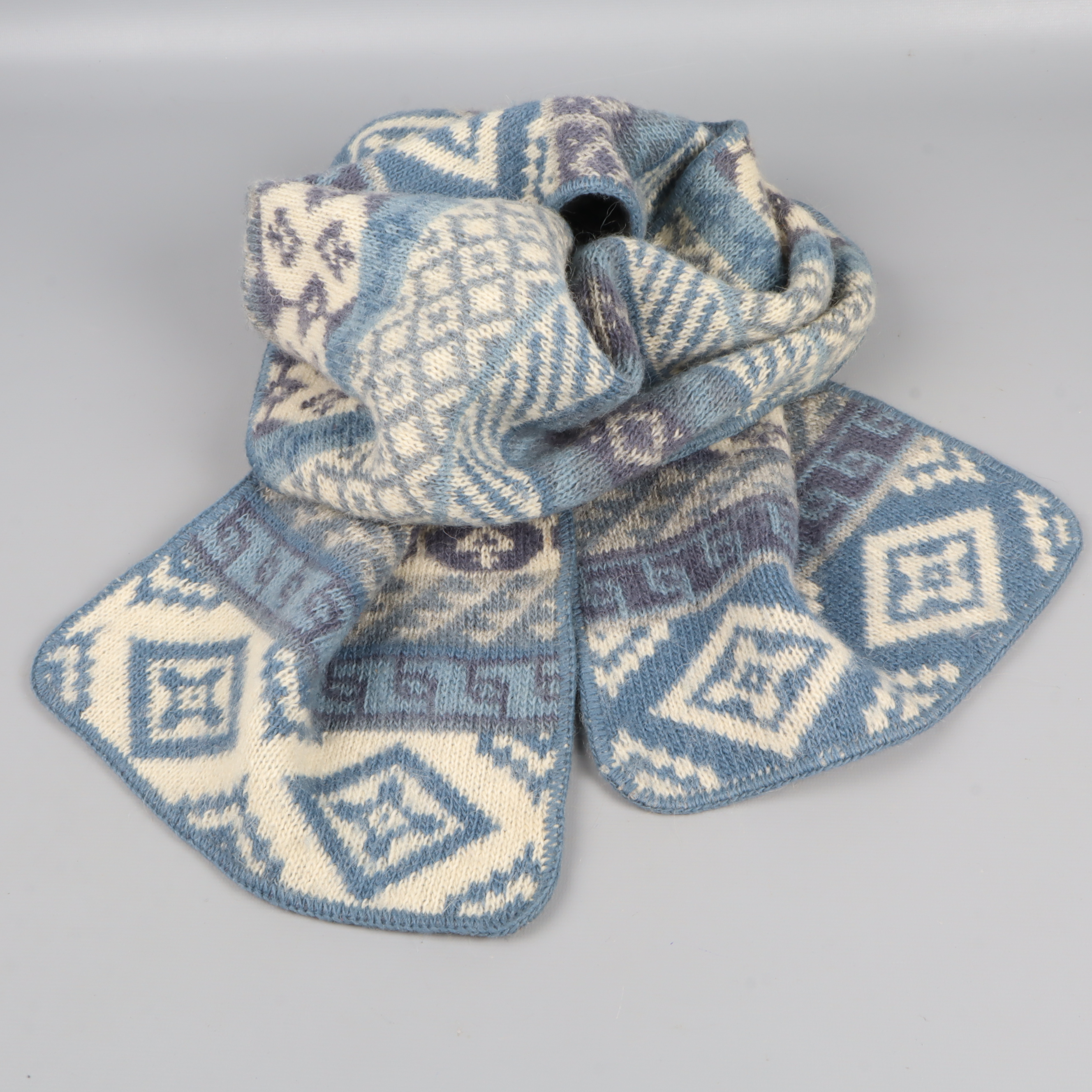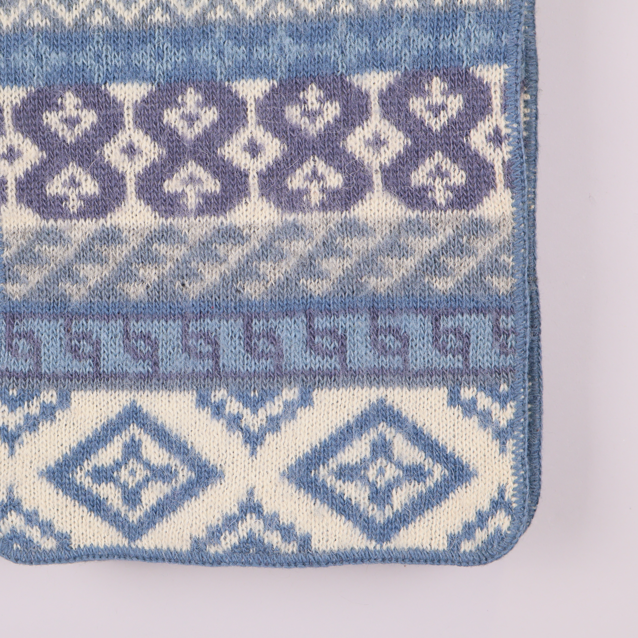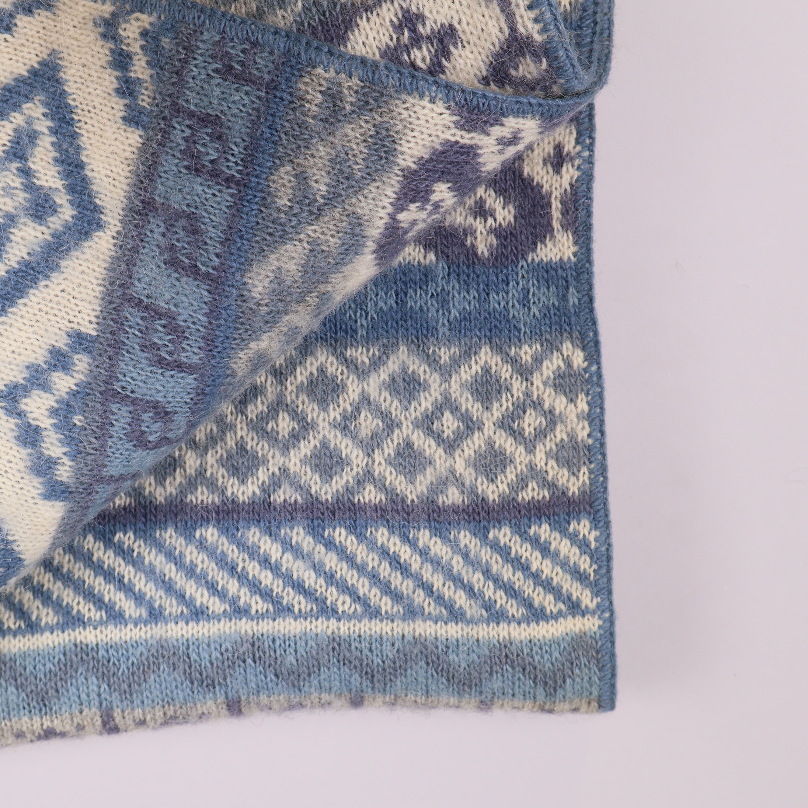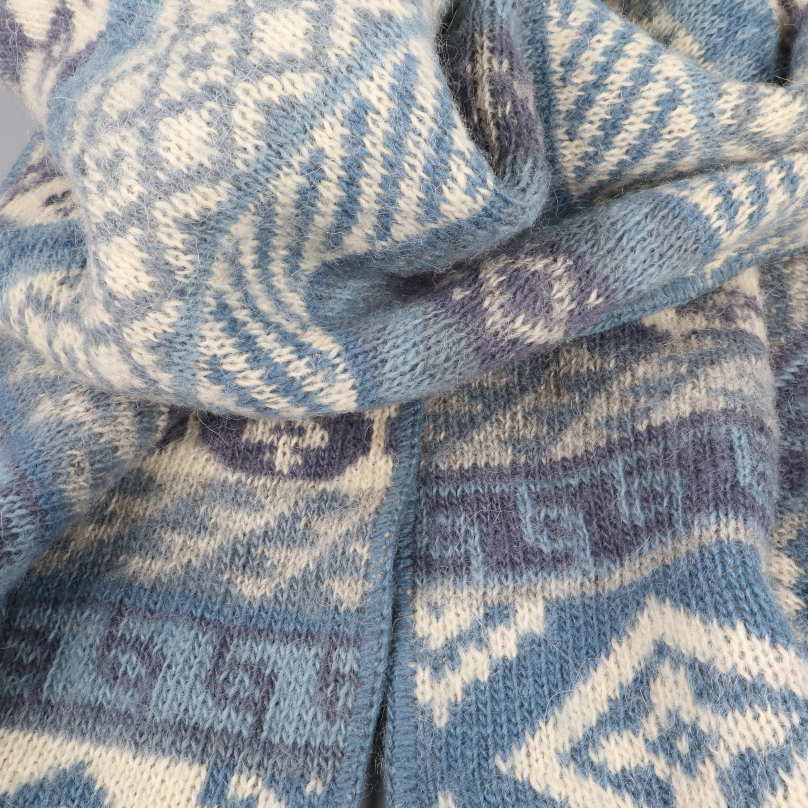 Mjuk halsduk från Icewear med dekorativt stickat mönster i blått och vitt. Den har en klassisk look med flera olika geometriska och traditionella ränder som ger en stilren och nordisk känsla.