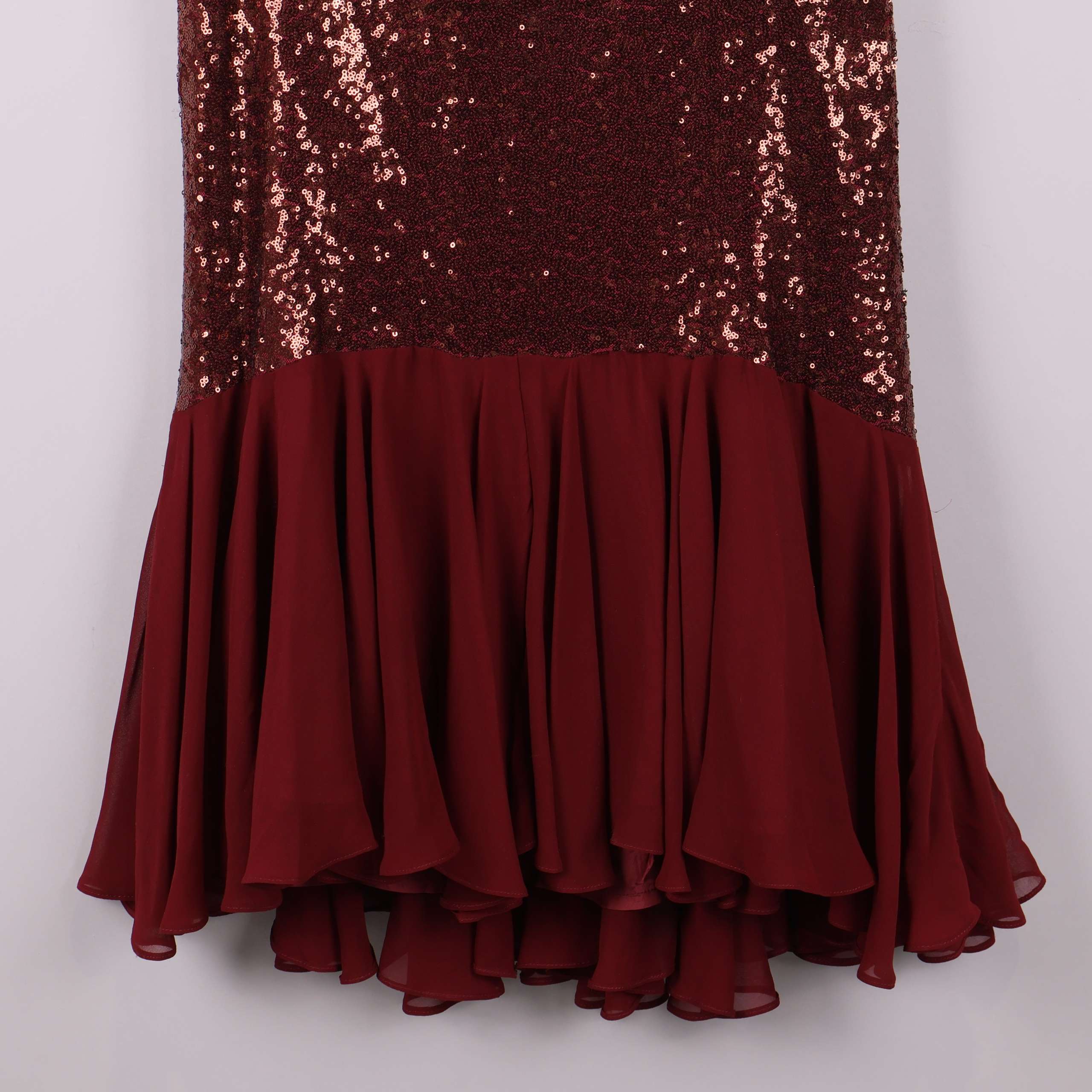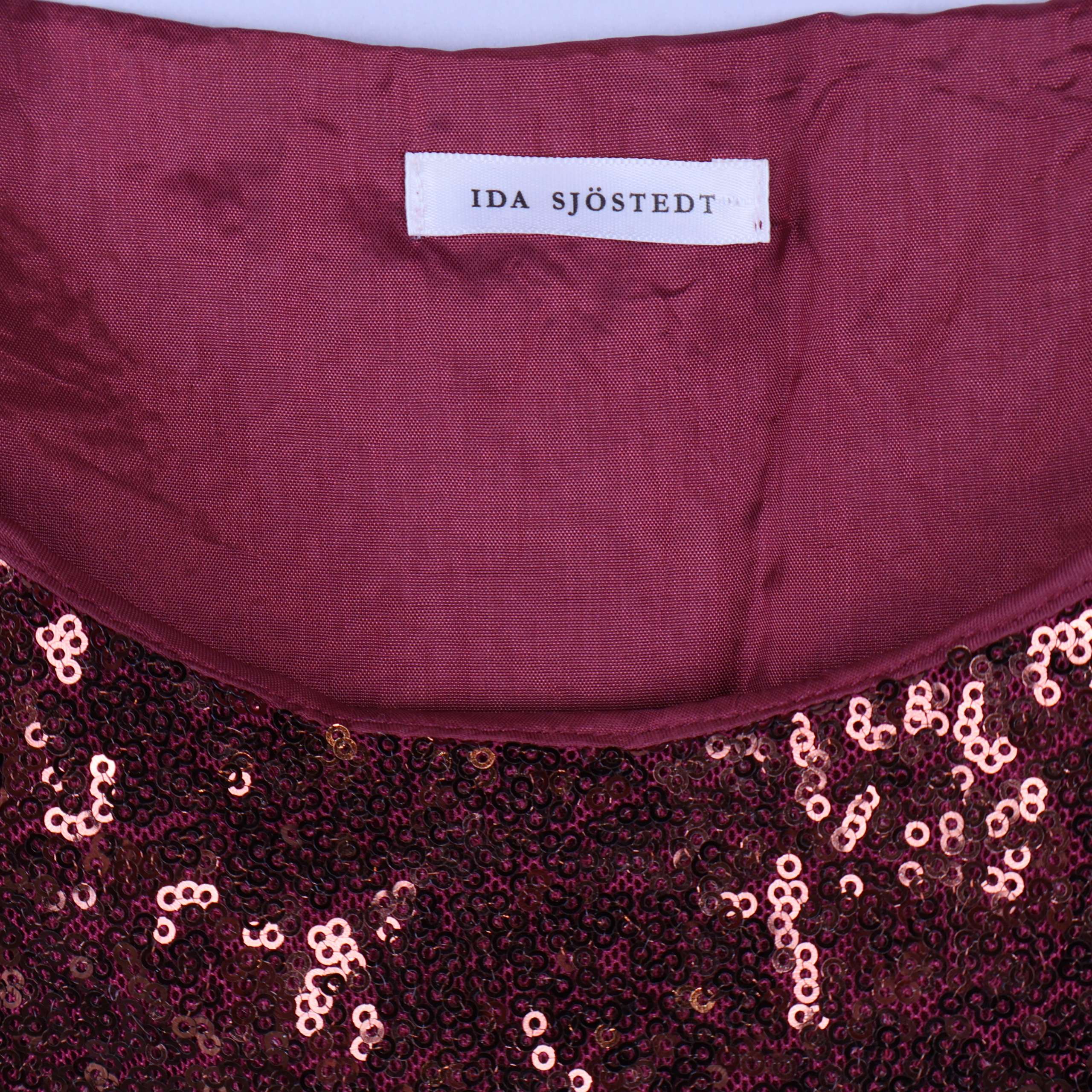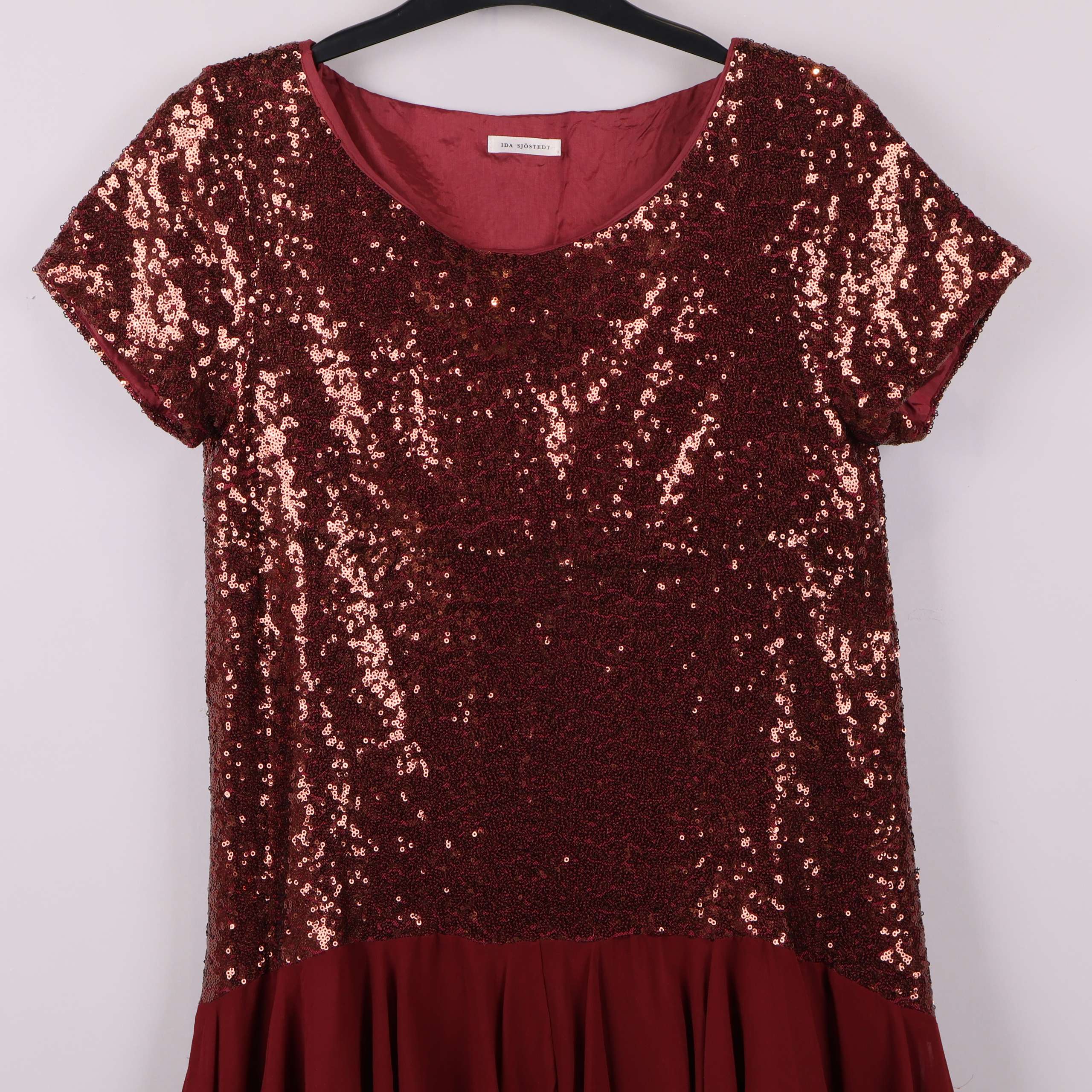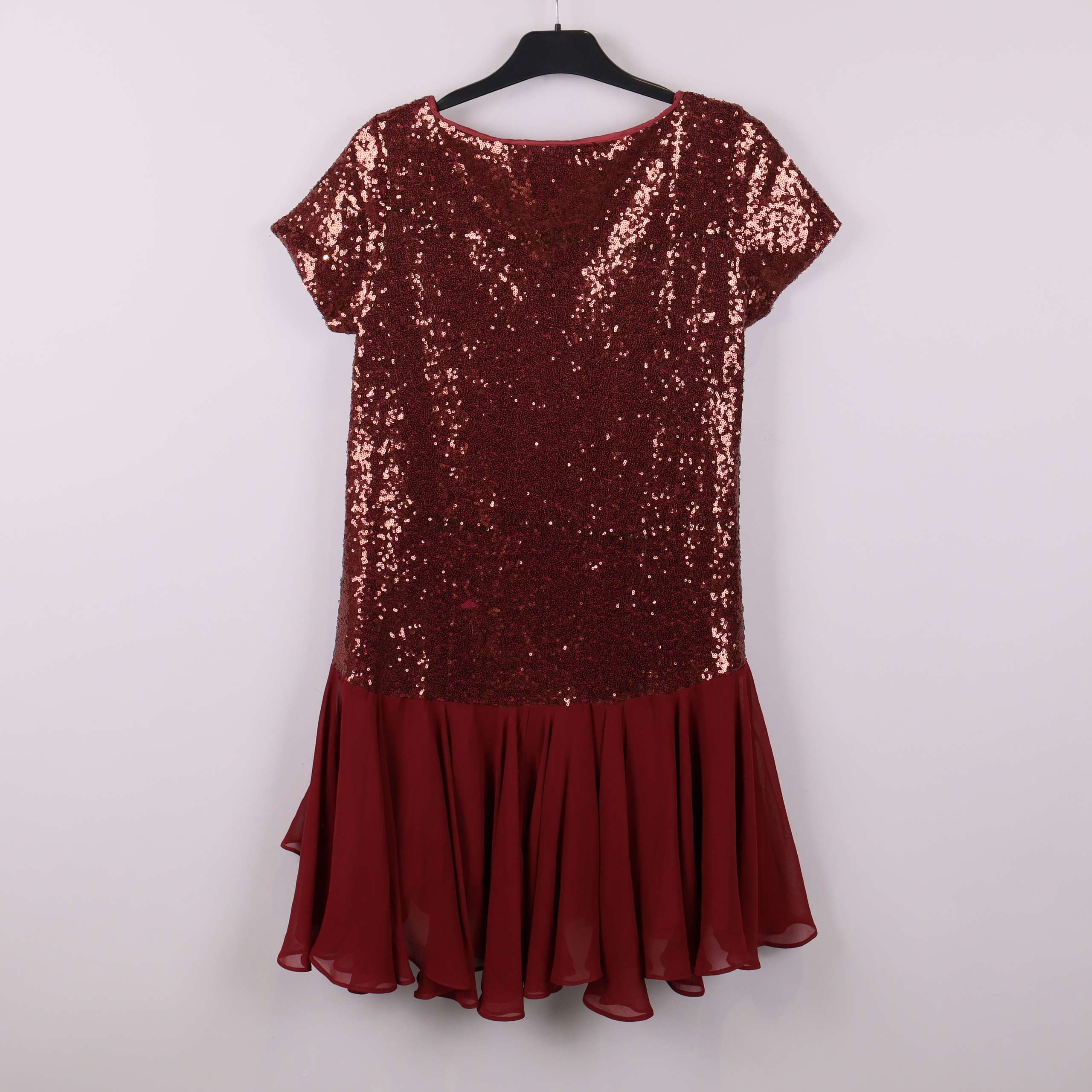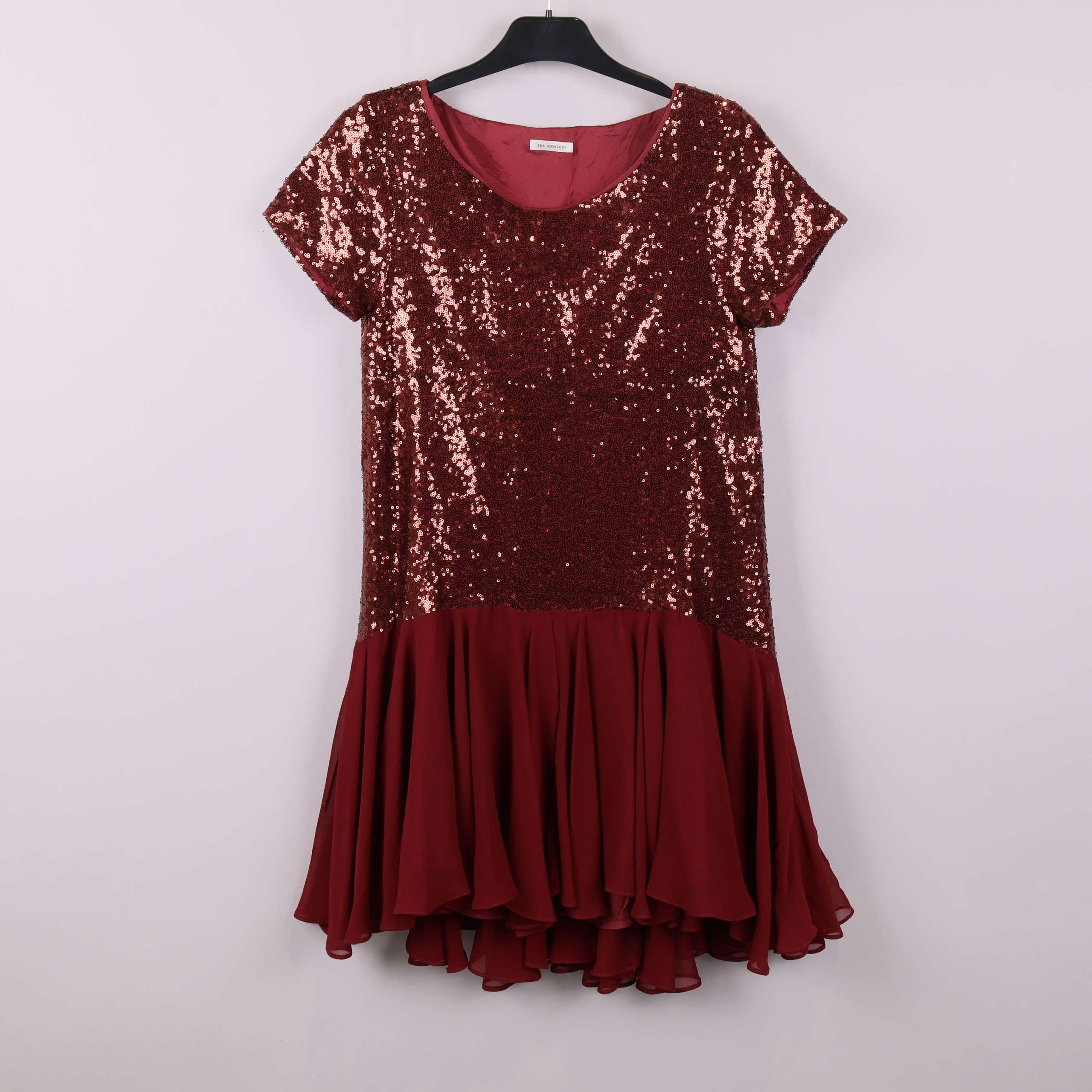 Festlig klänning från Ida Sjöstedt med glittrande paljetter upptill och lätt volangig kjol. Färgen går i en djup röd-bronsig ton med glänsande yta och mjukt fall.