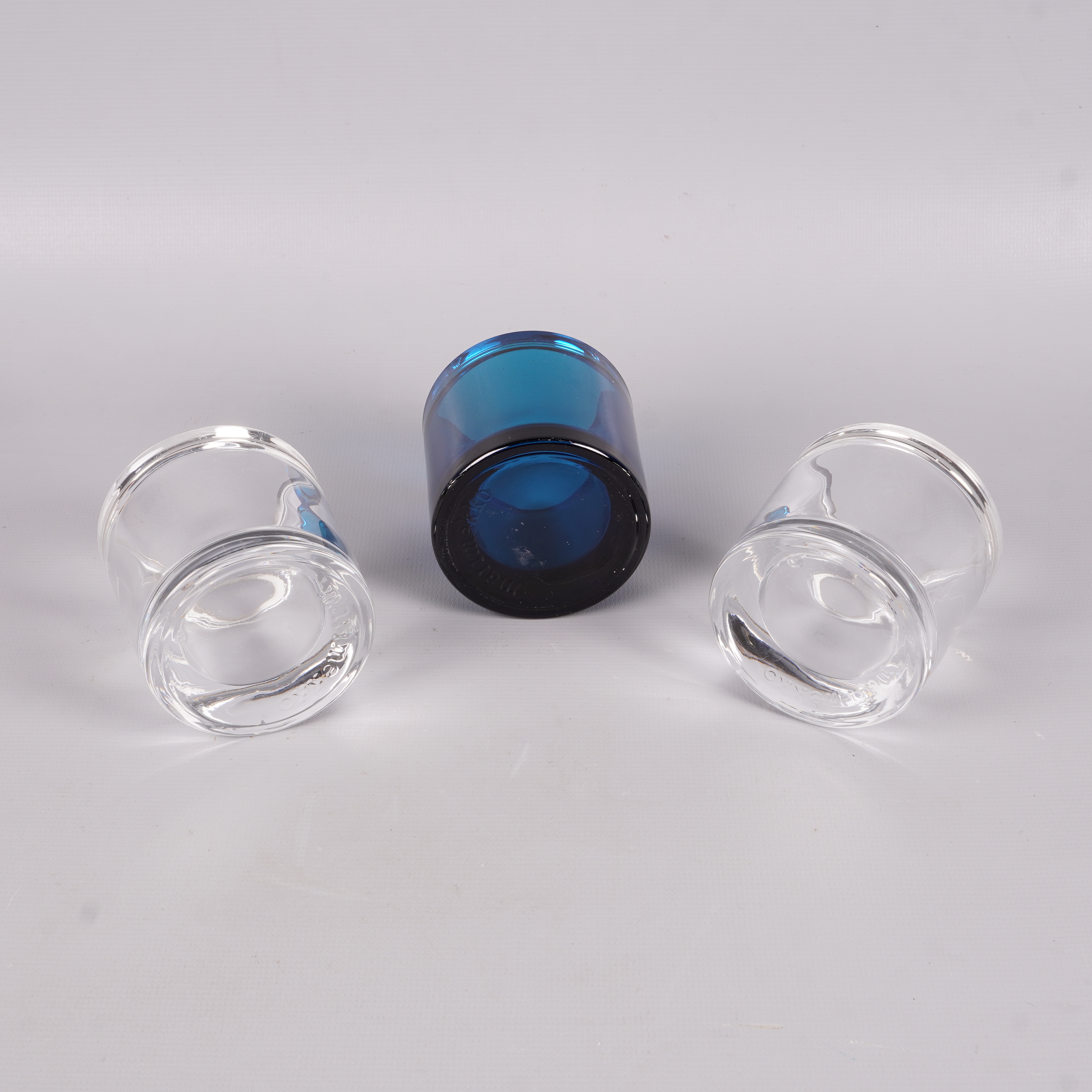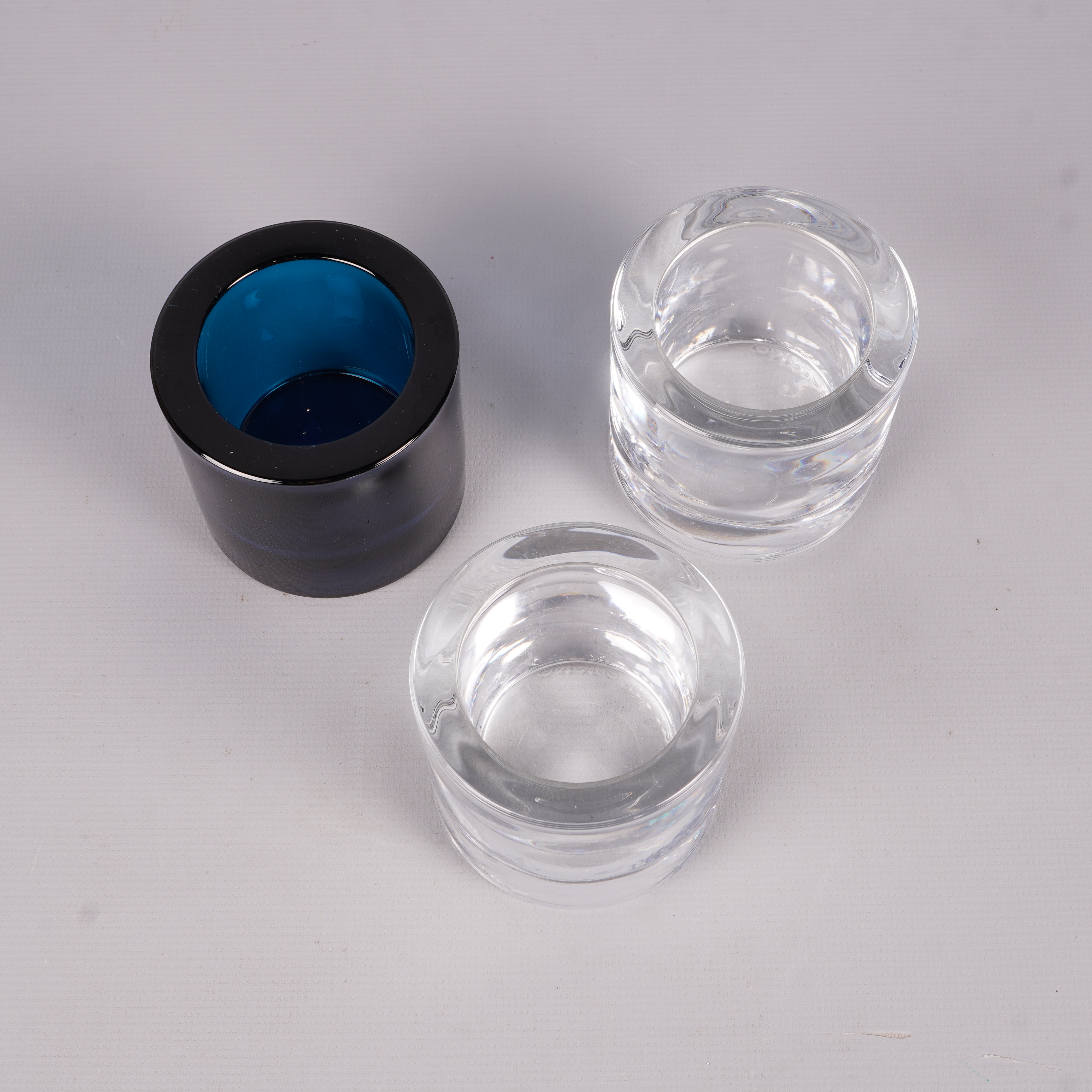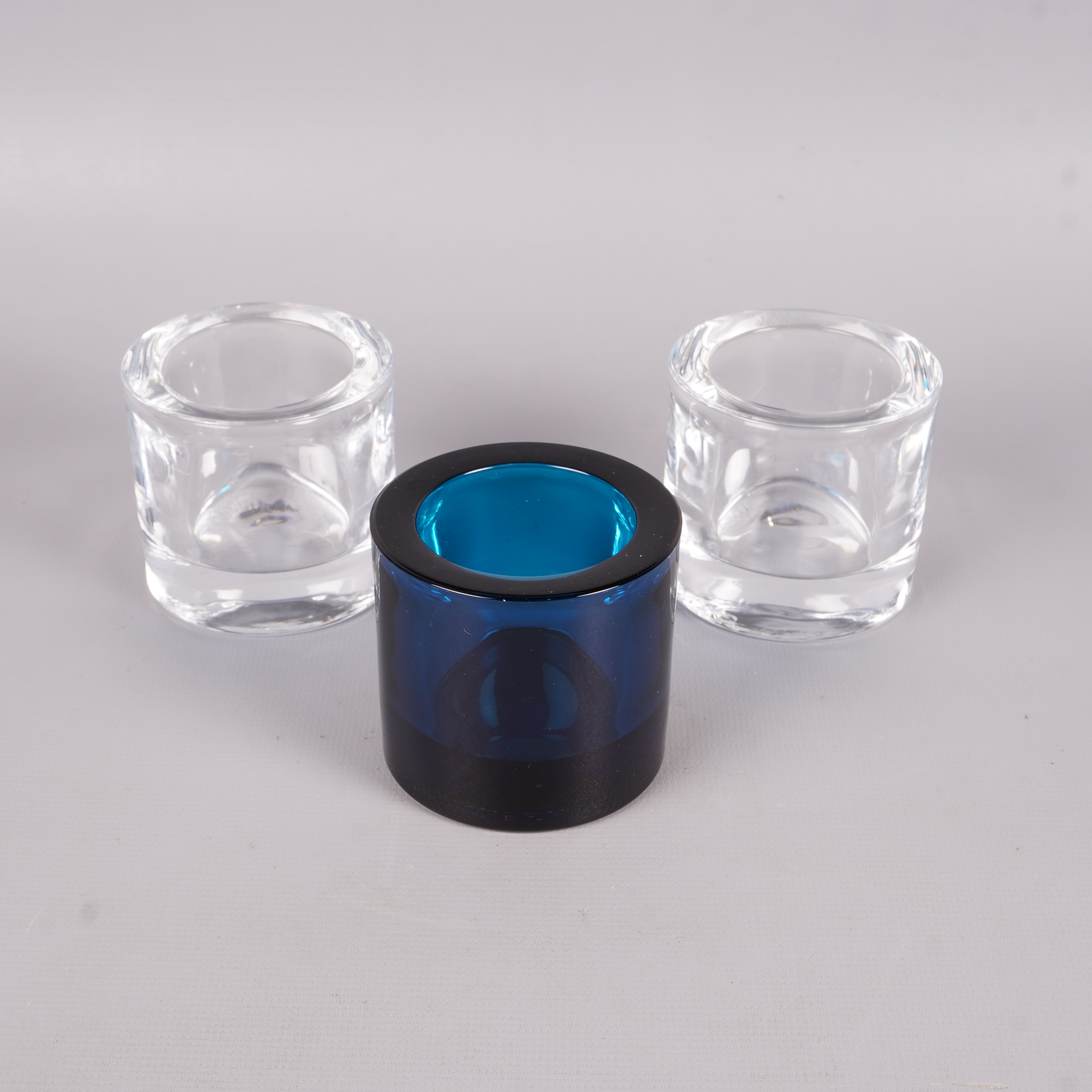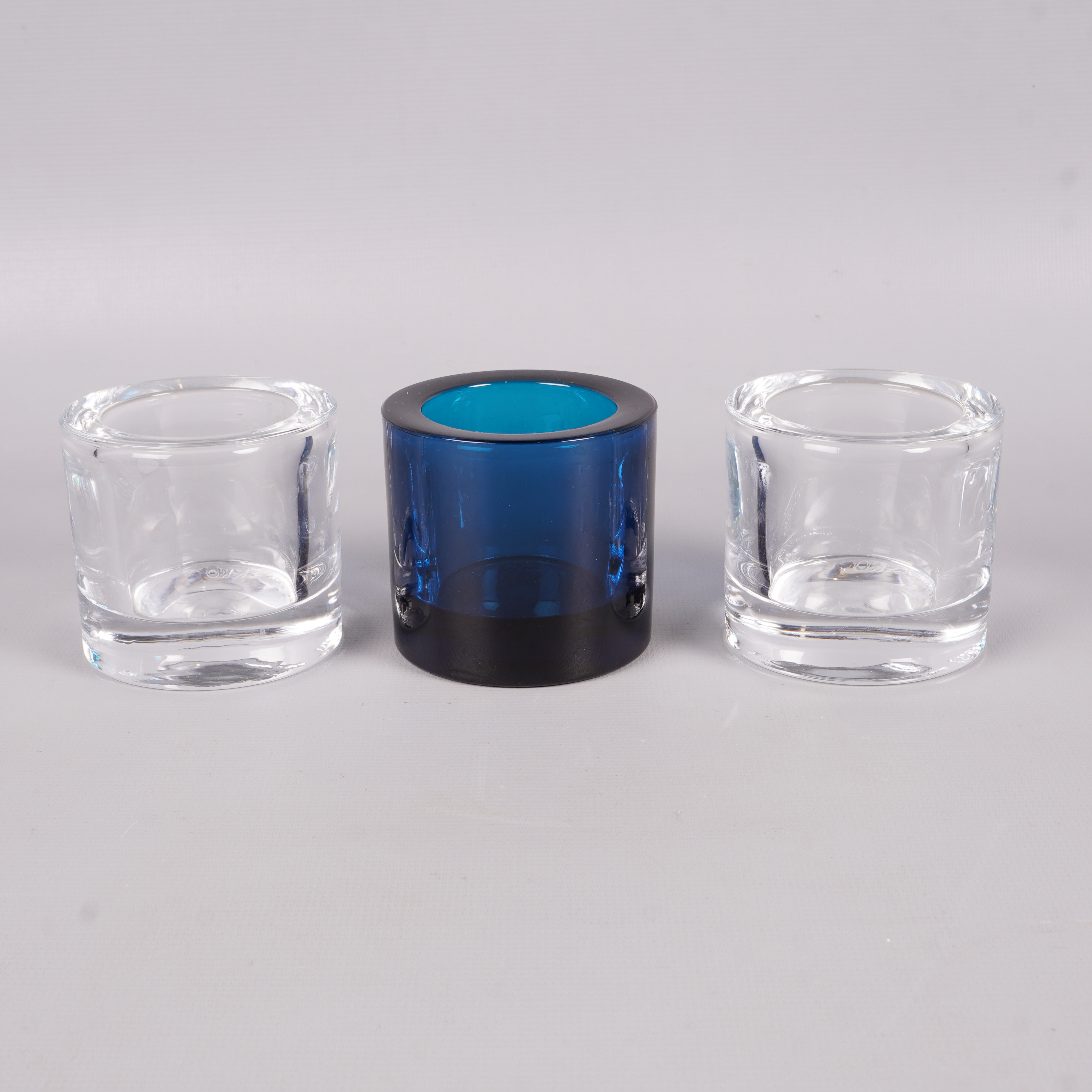 Set med tre stilrena ljushållare i massiv glasdesign, två helt klara och en i blått. Dessa håller en tidlös look och skapar en mysig atmosfär.
