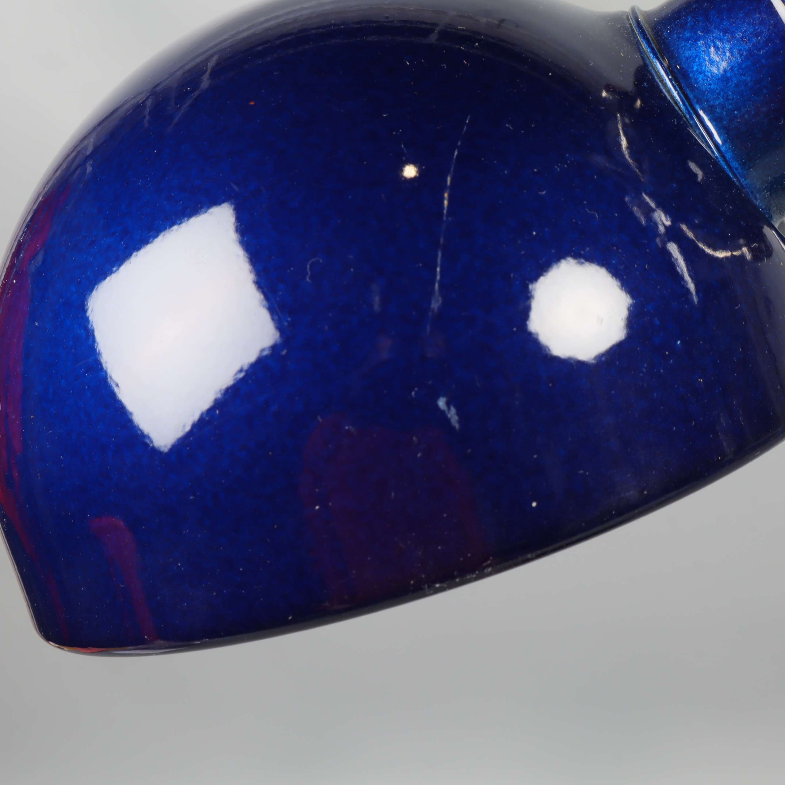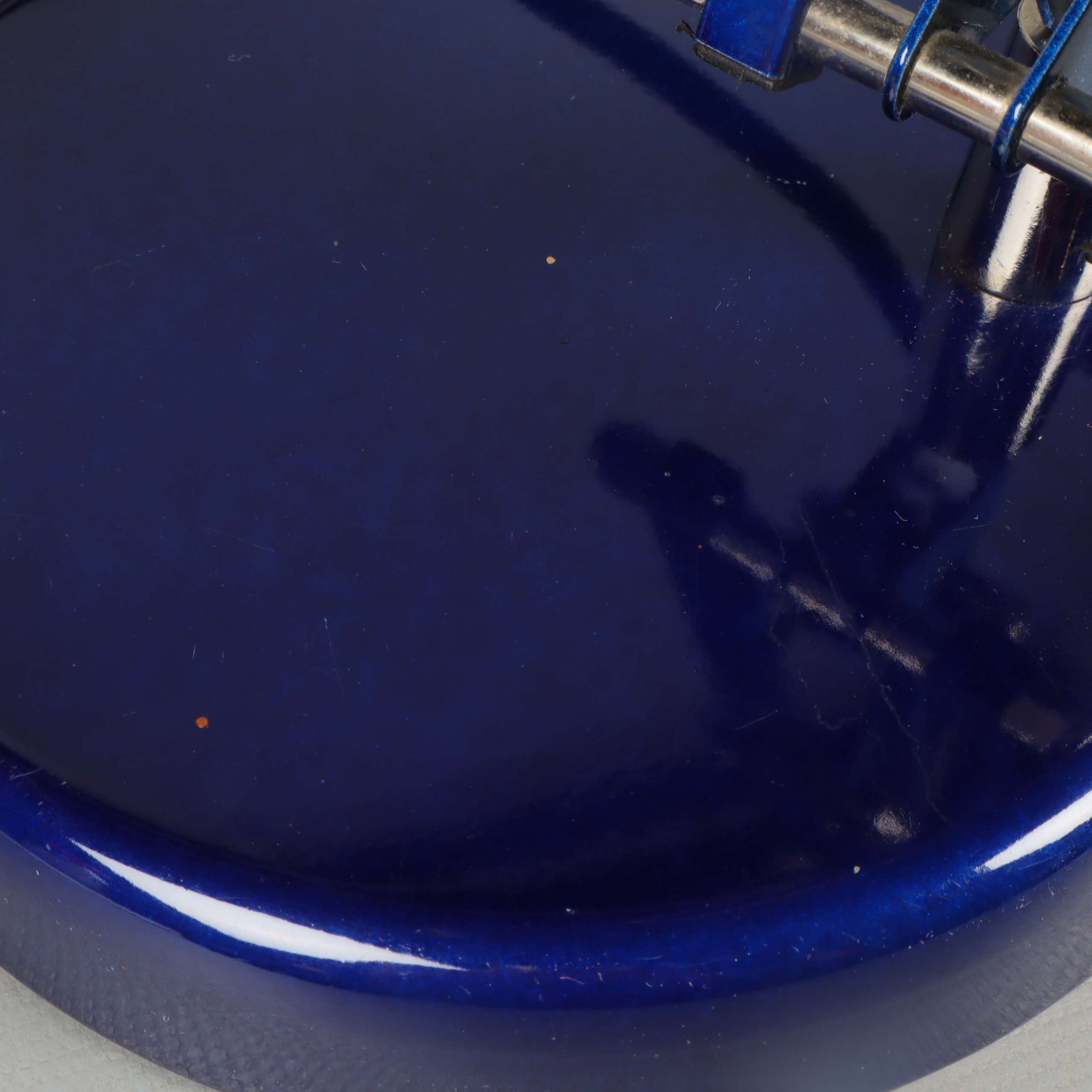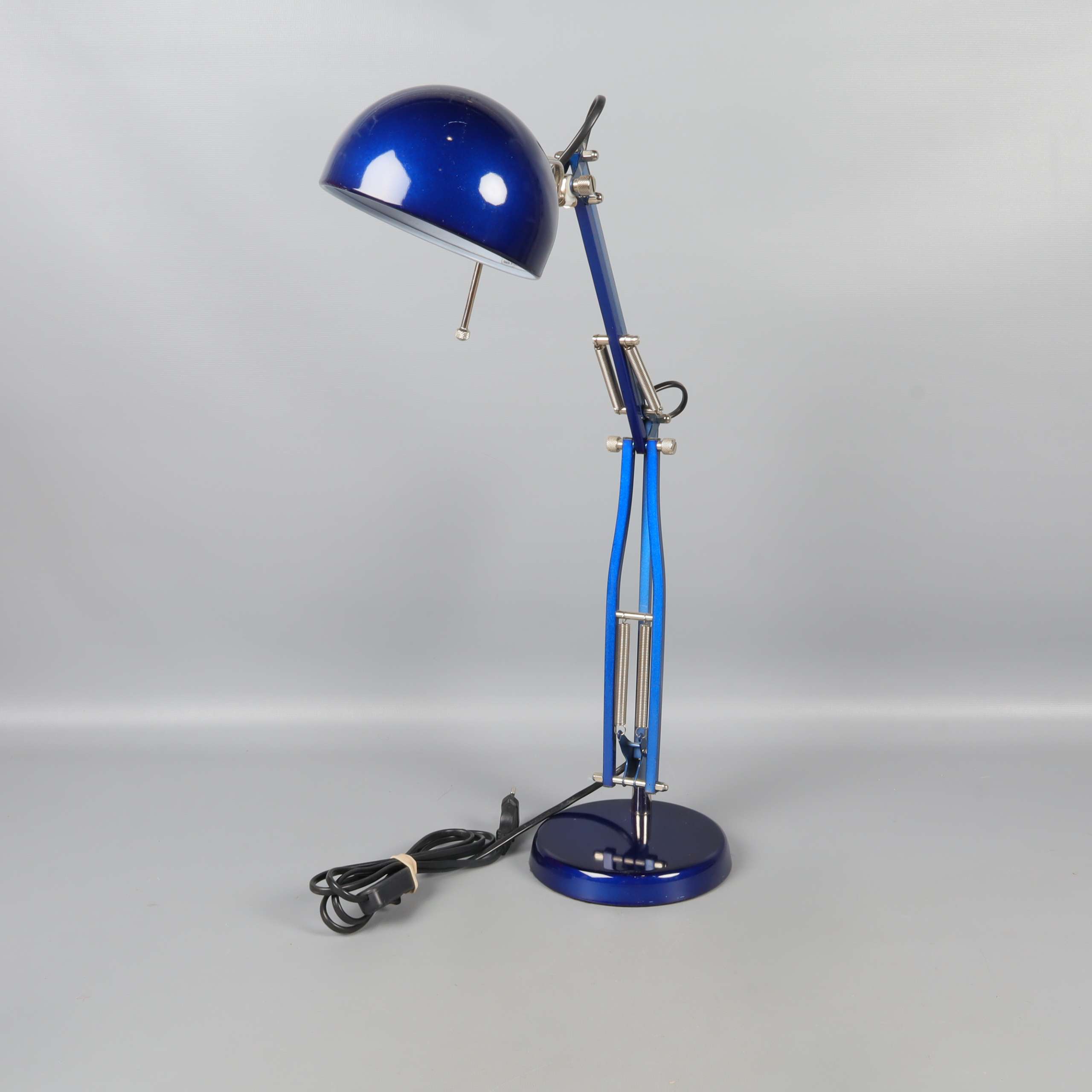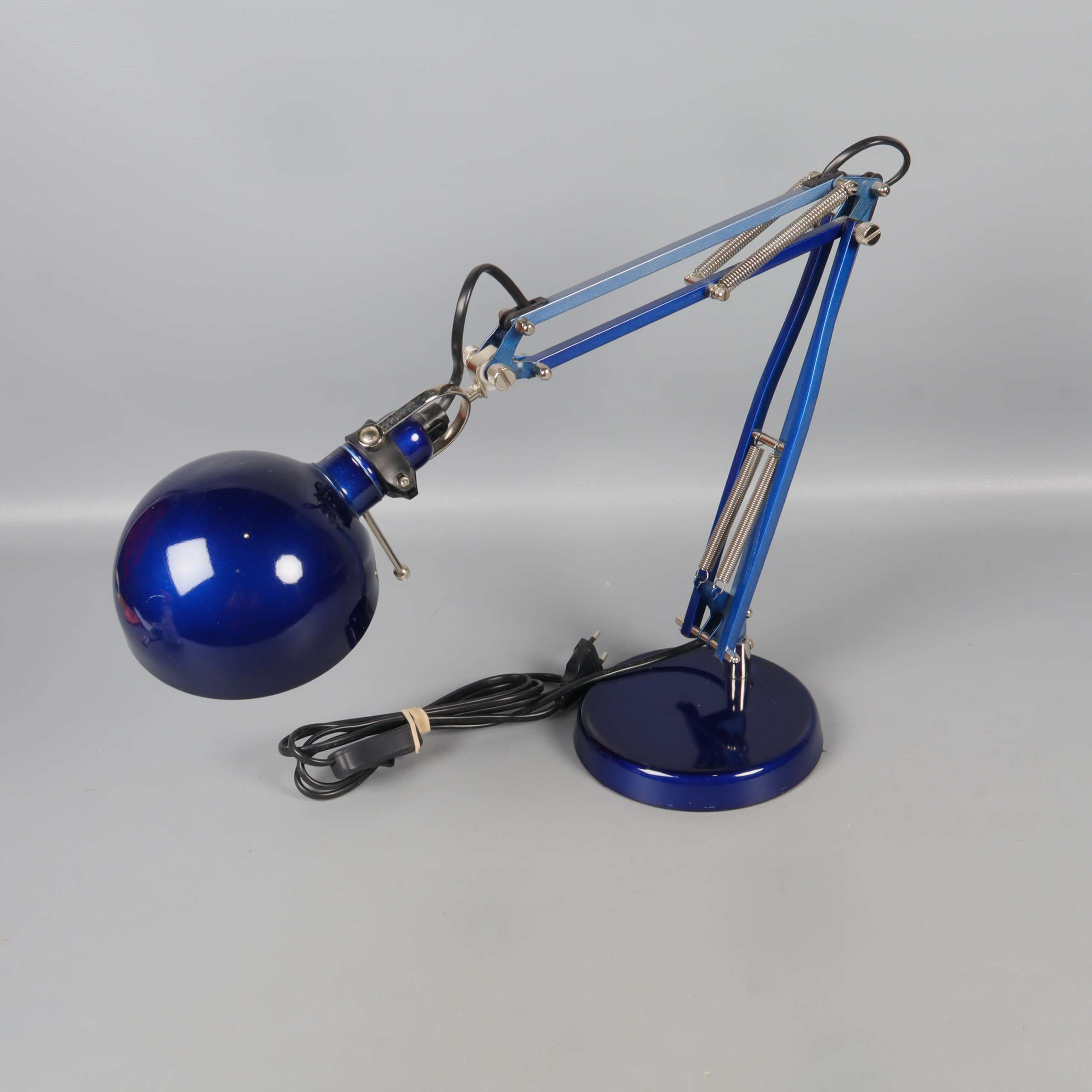 Stilren bordslampa i blank blå kulör med justerbar arm och klassisk industridesign. Både lampfot och skärm har slät finish, och konstruktionen bjuder på robust och flexibel känsla.