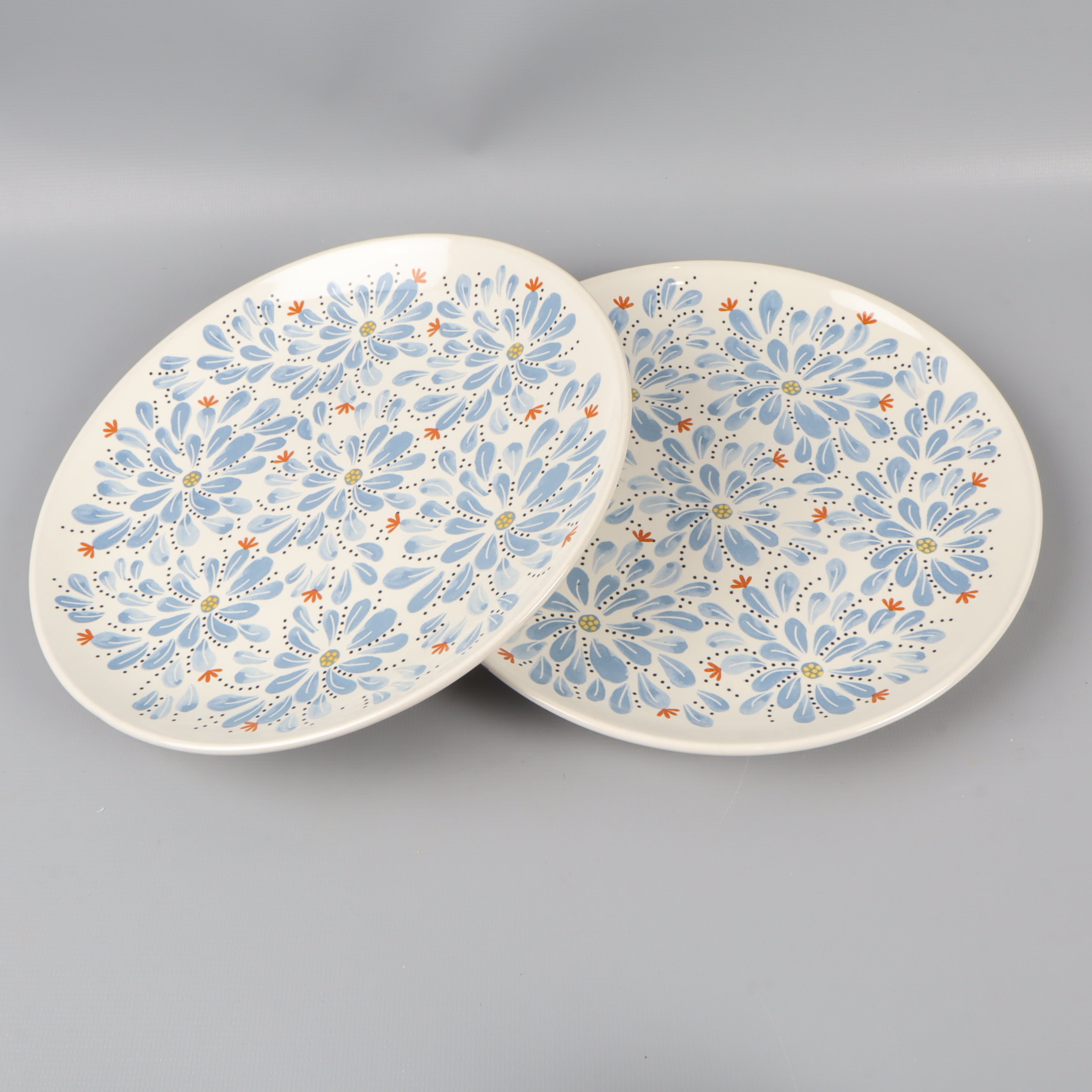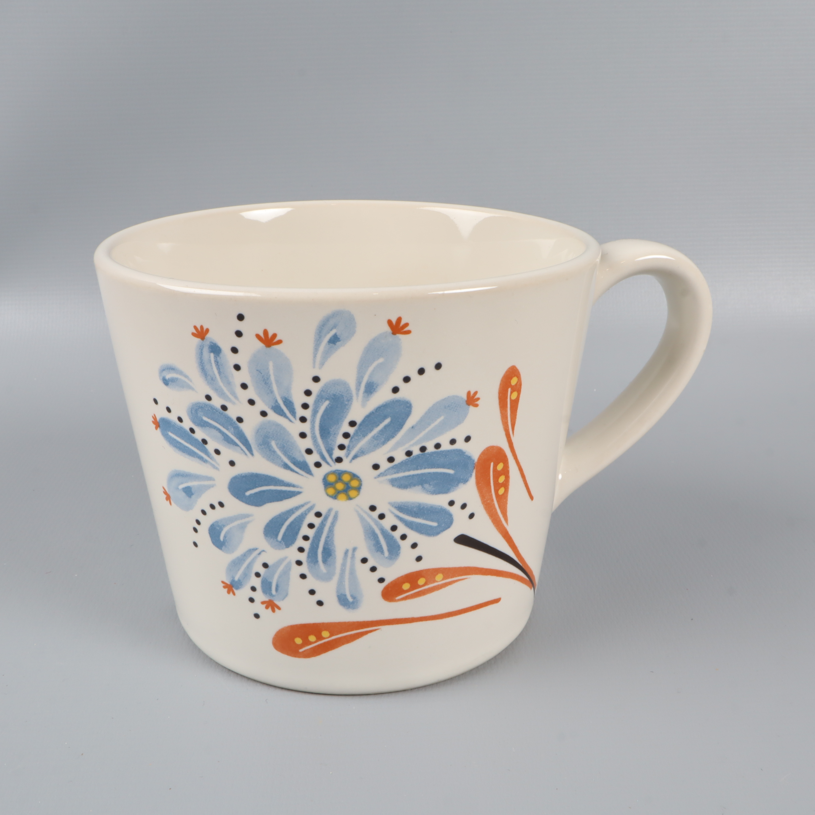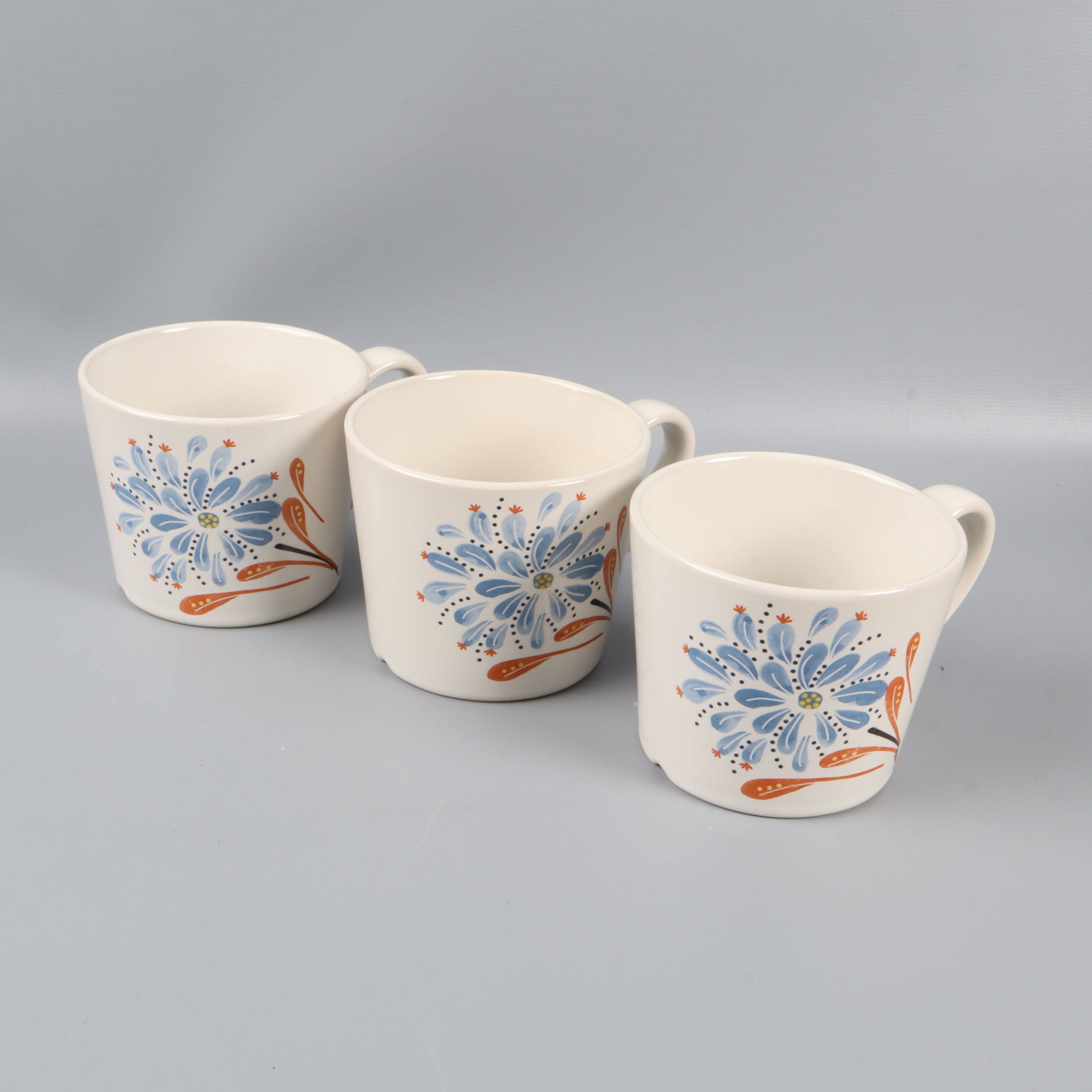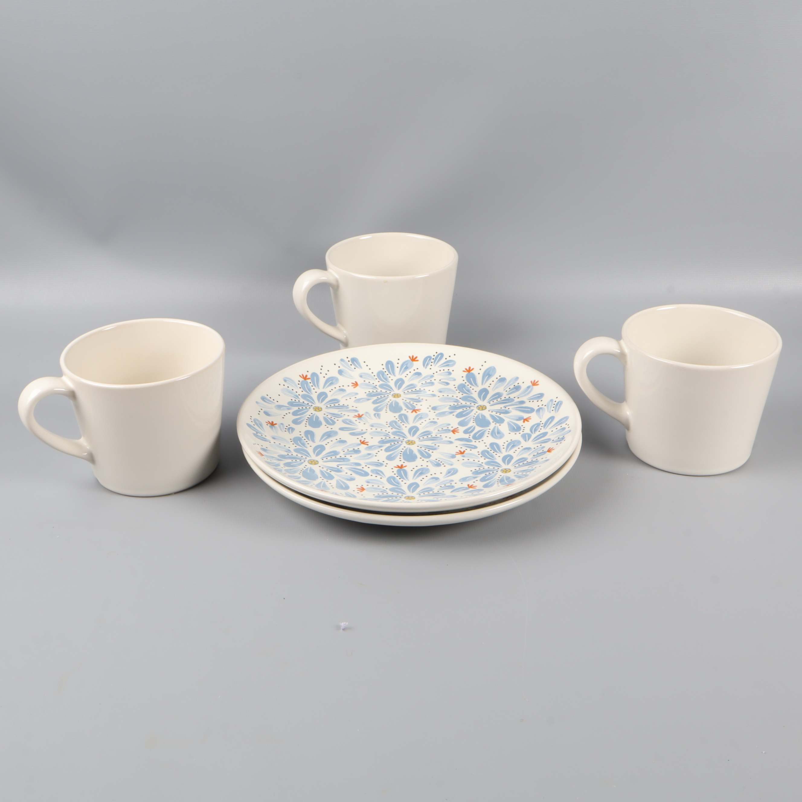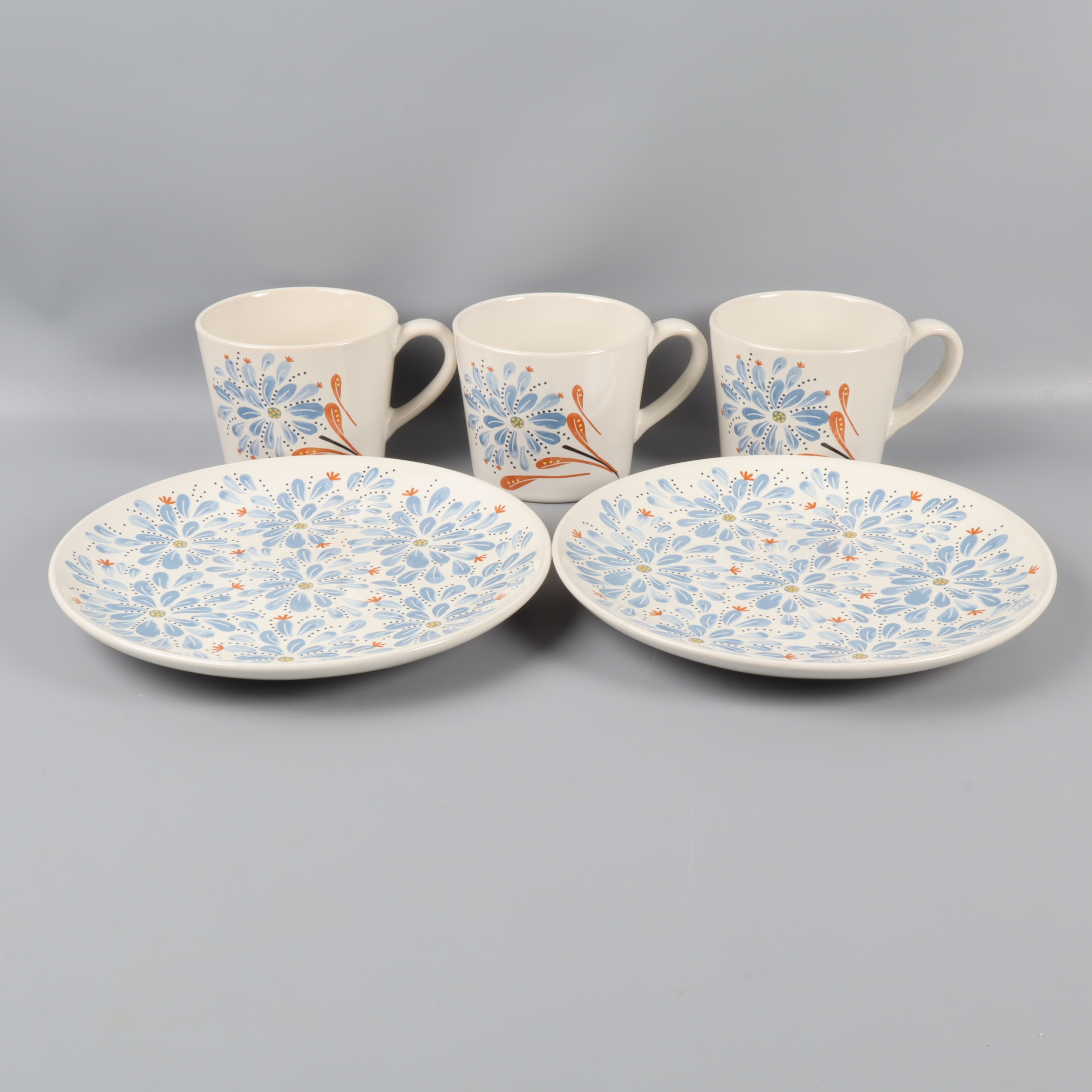 Charmig kaffeservis bestående av tre koppar och två assietter med stilrent blommönster i blått och orange. Setet har mjuka former och en vit bas, vilket ger en tidlös och färgglad känsla till din dukning. Perfekt för dig som gillar dekorativa detaljer.
