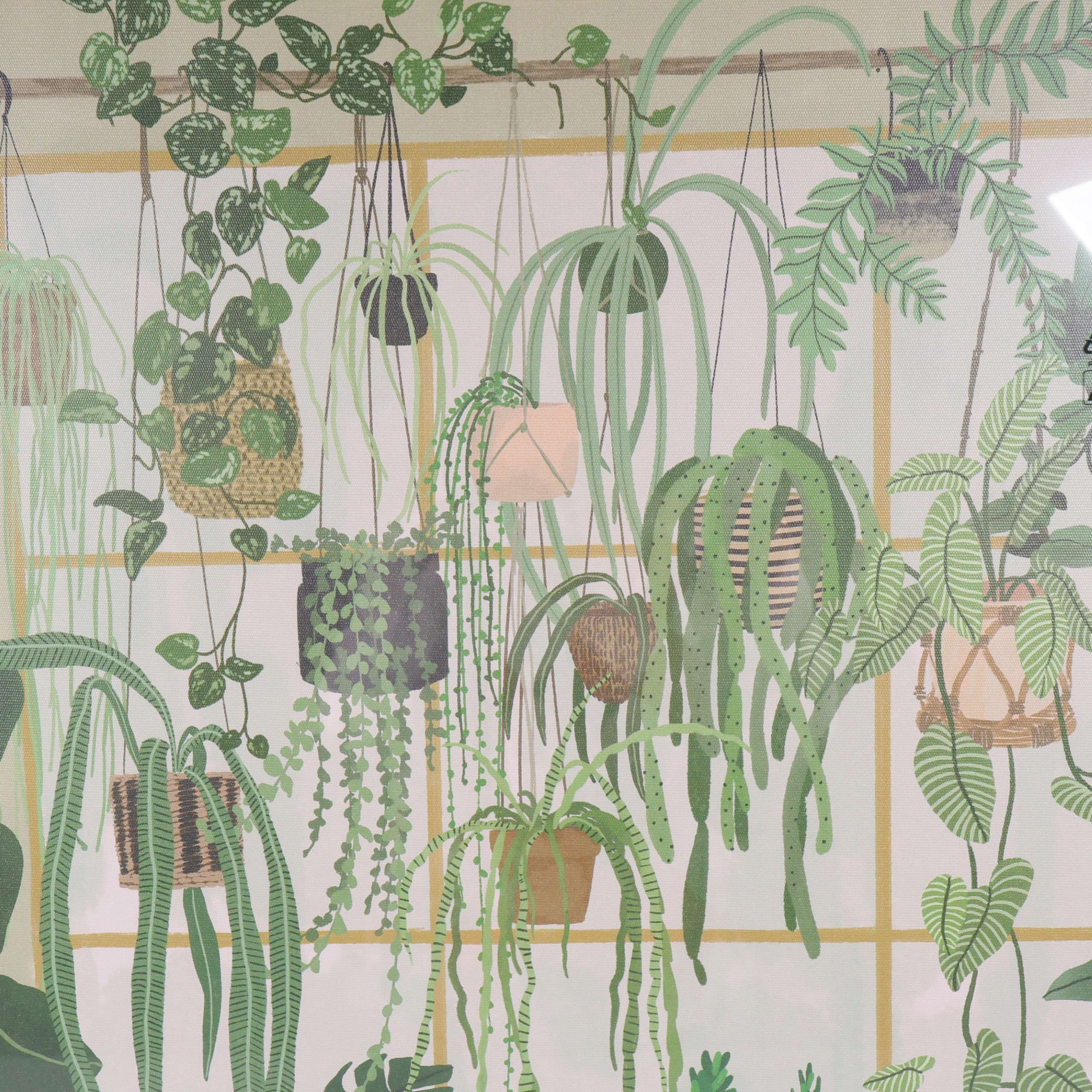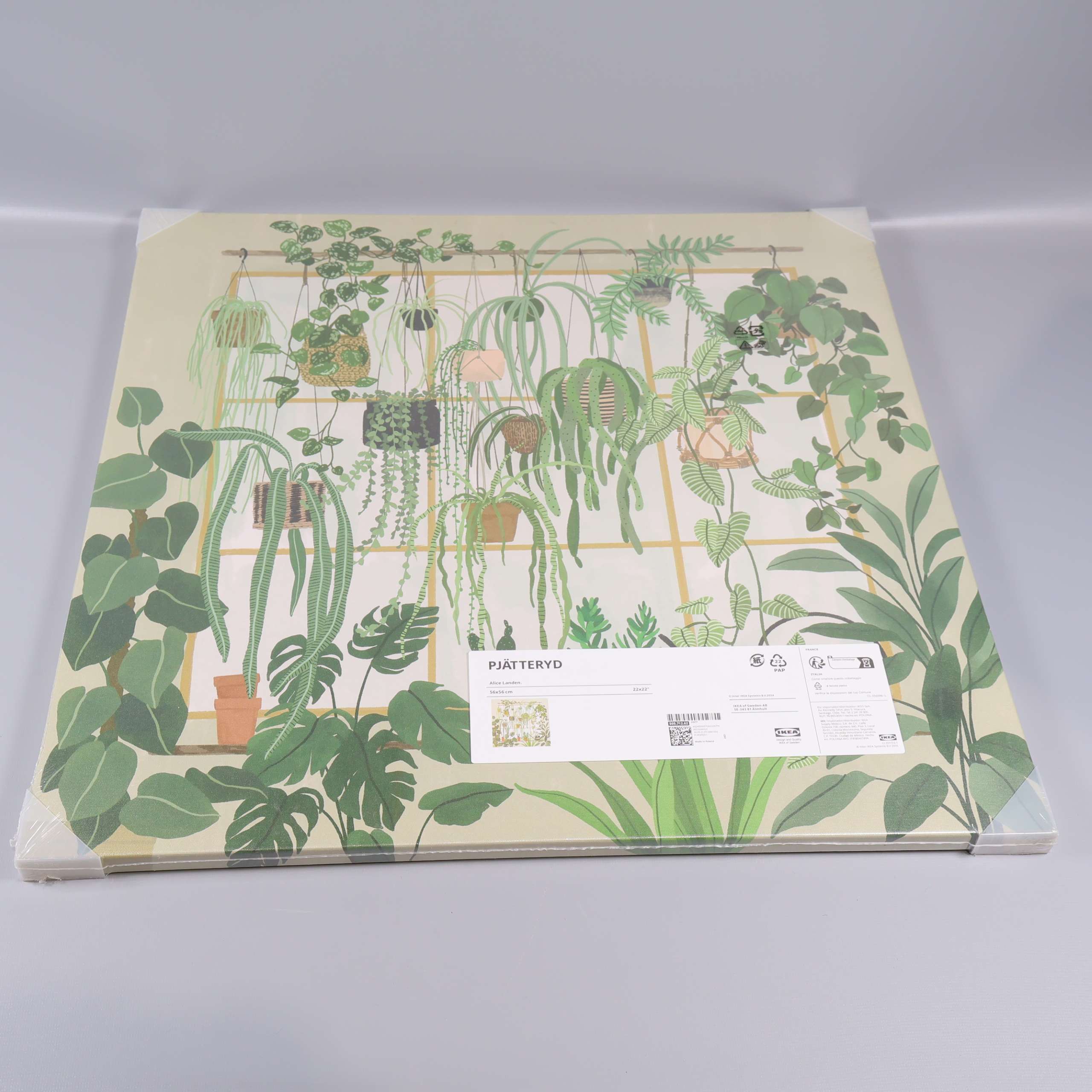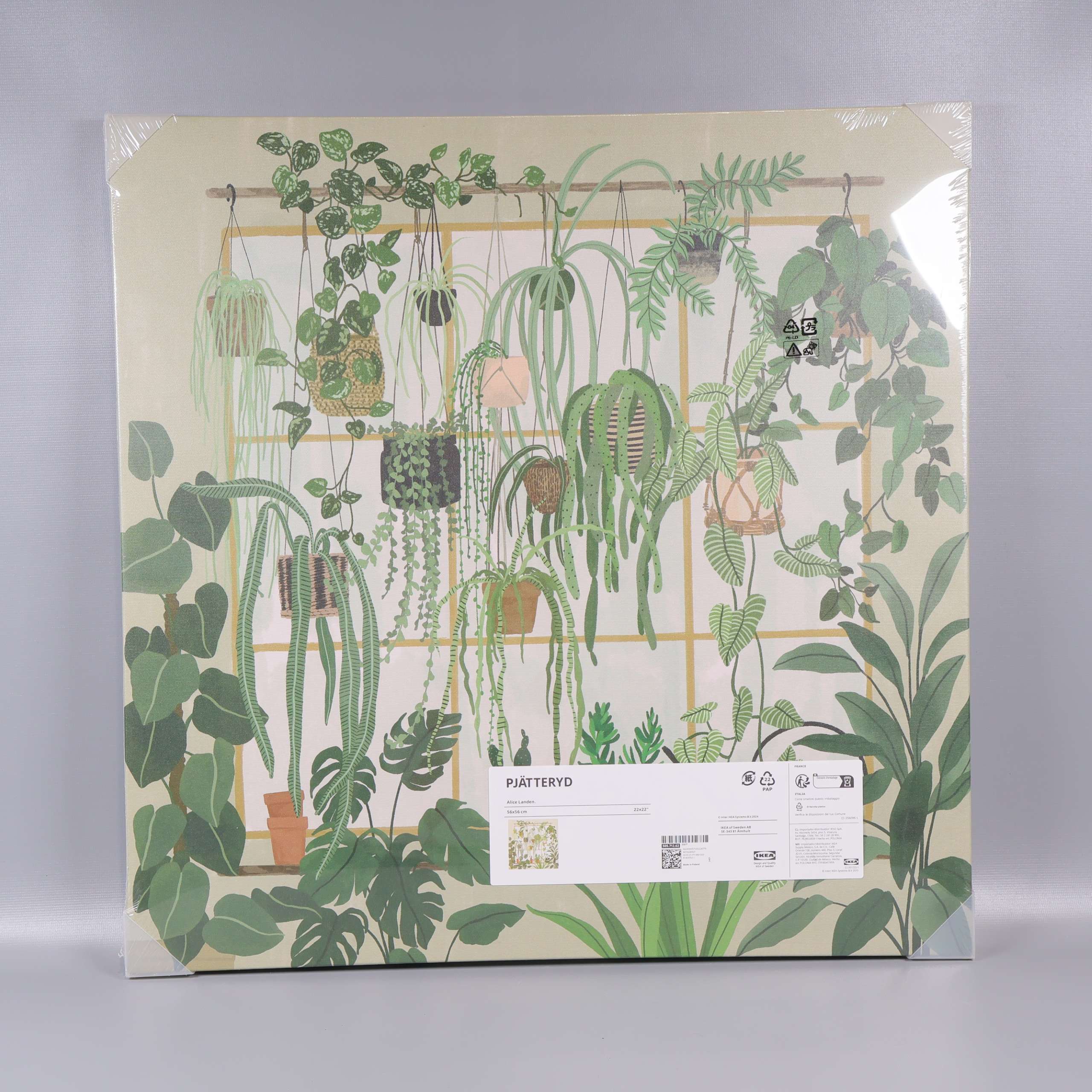 Stor fyrkantig tavla med illustrationer av hängande och stående gröna växter mot en ljus bakgrund. Modern och dekorativ design av Alice Landen, tryckt på canvas och monterad på träram. Perfekt för att ge rummet en grön, harmonisk känsla.