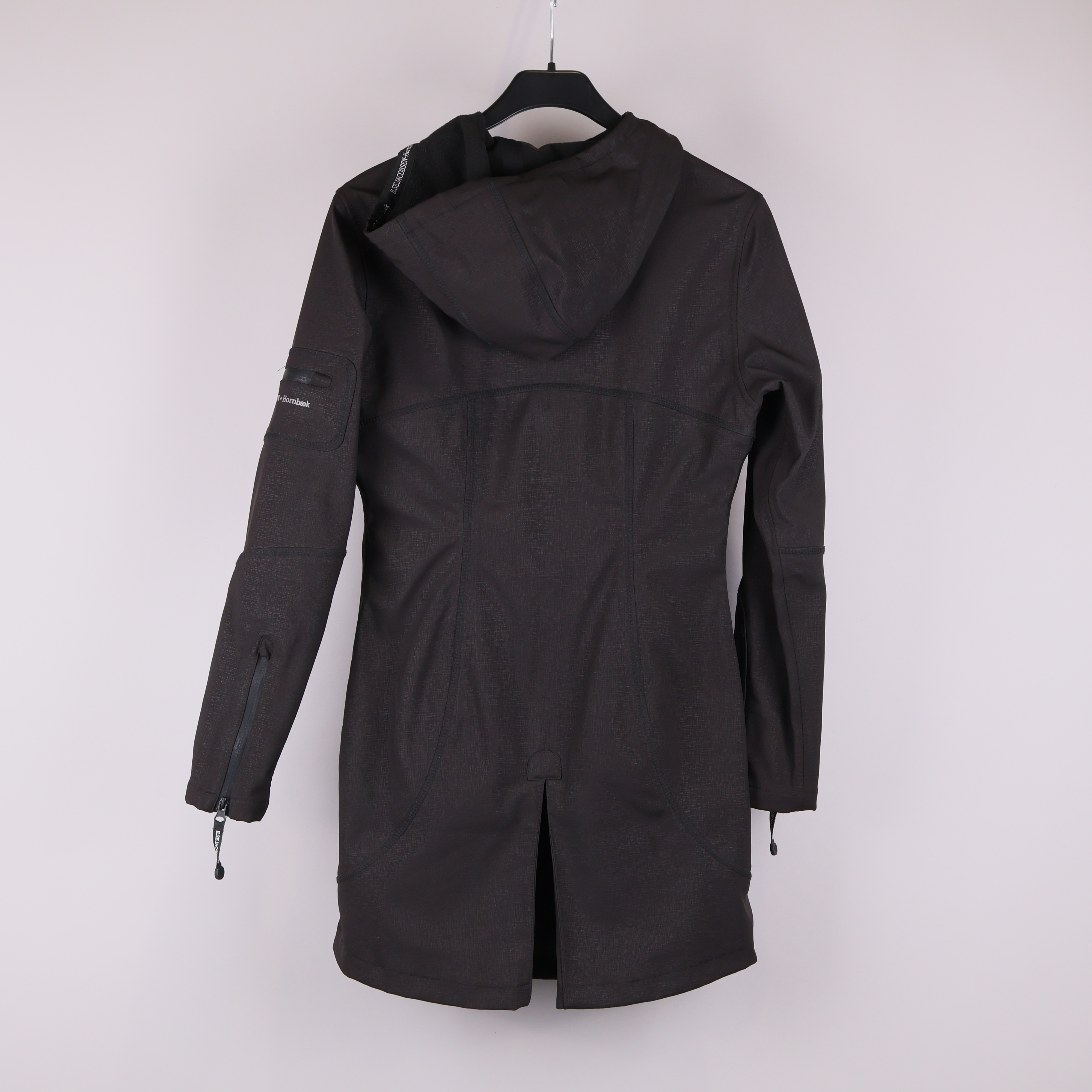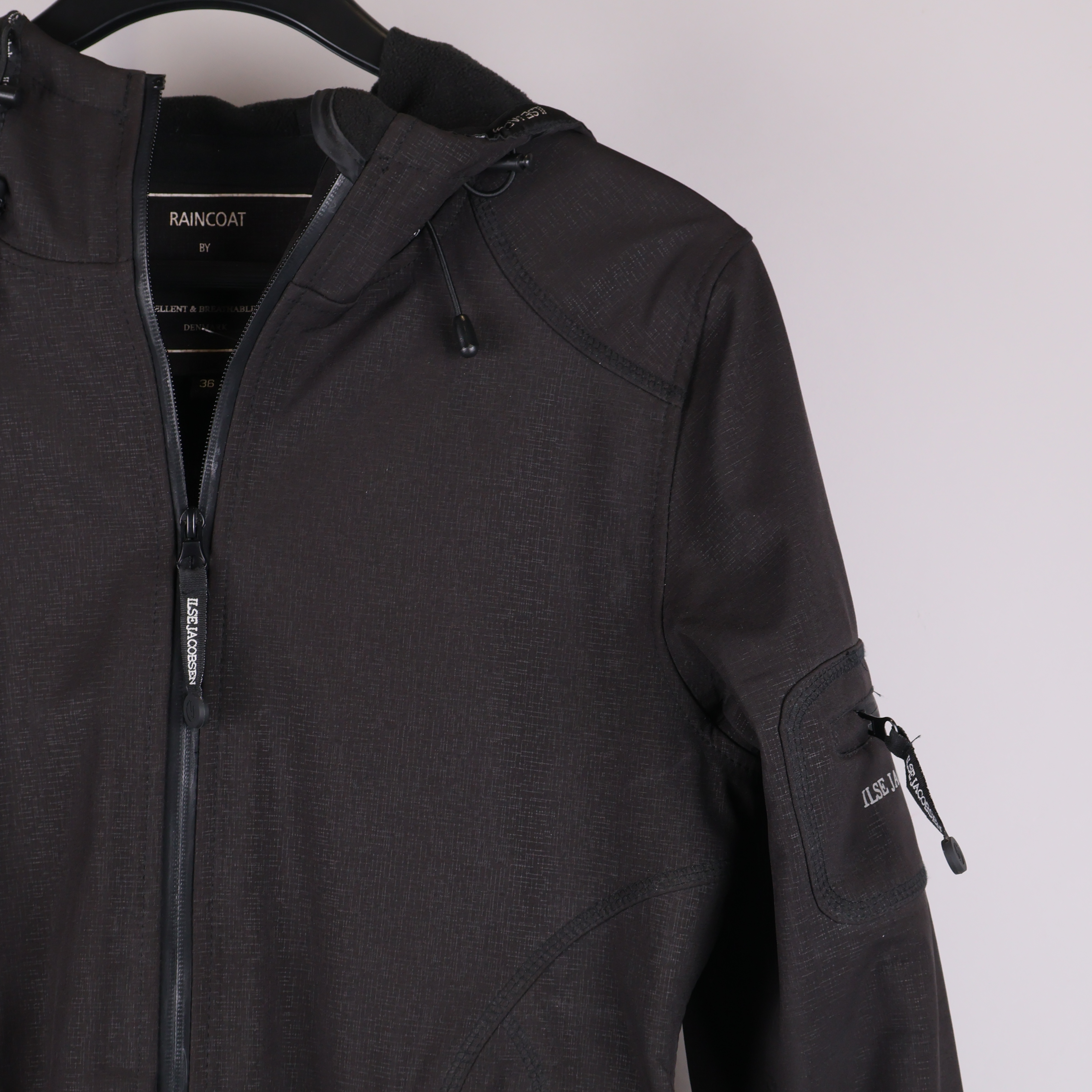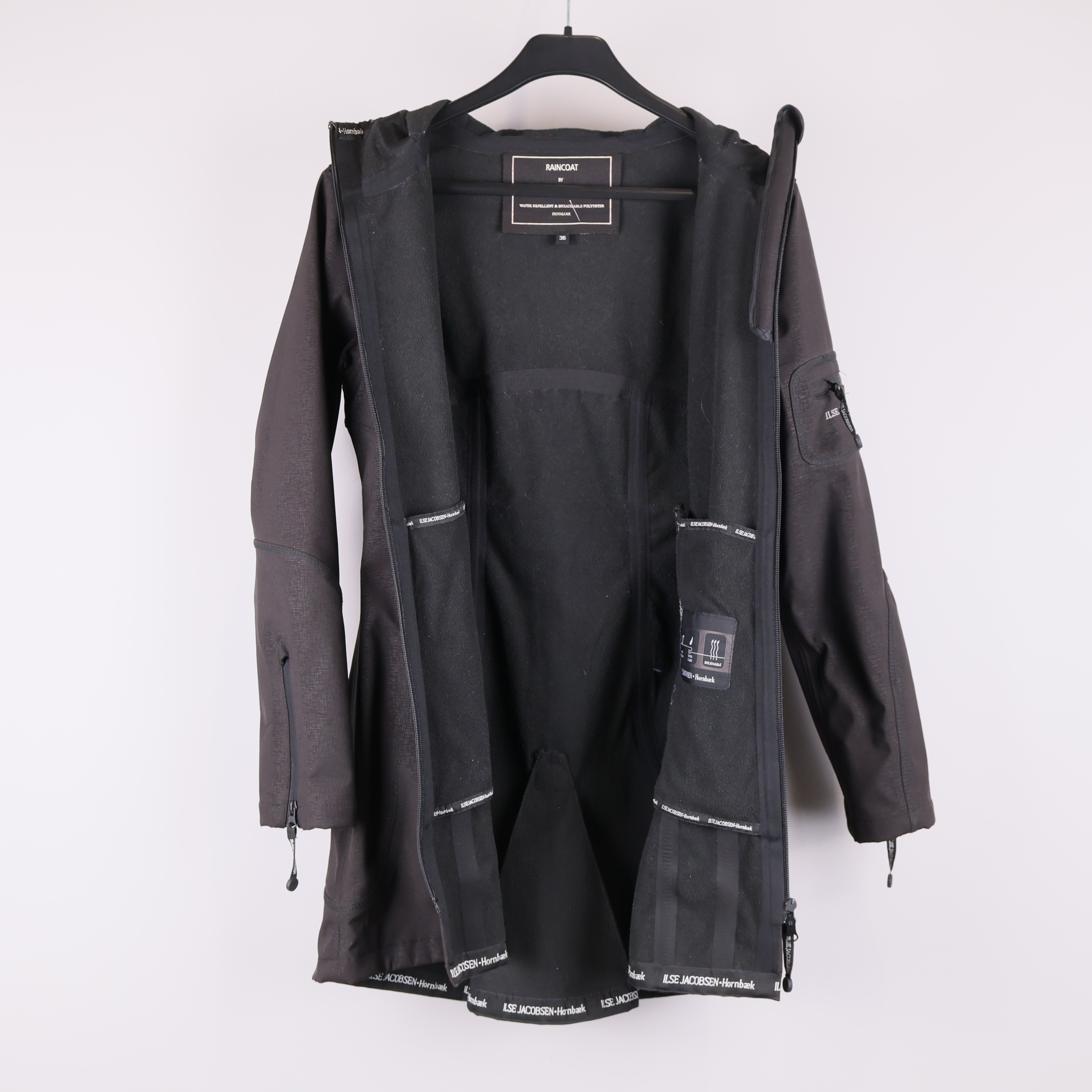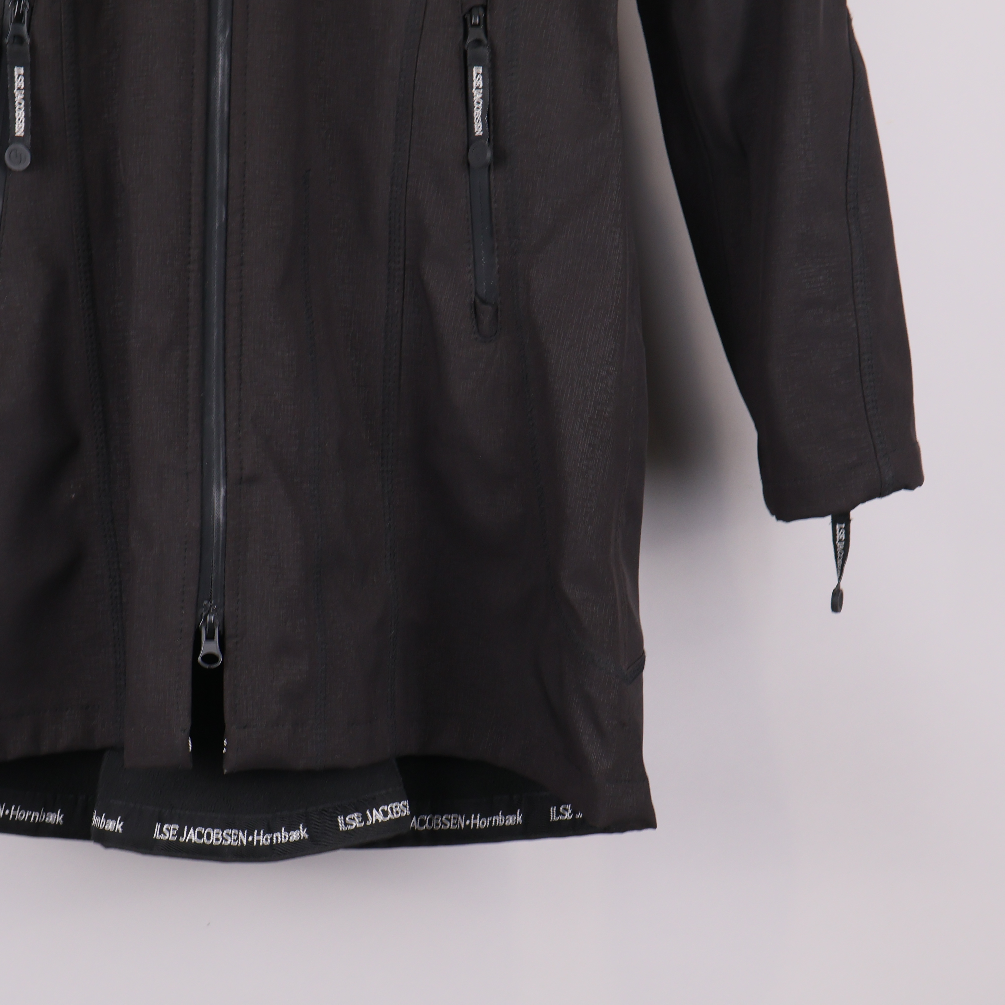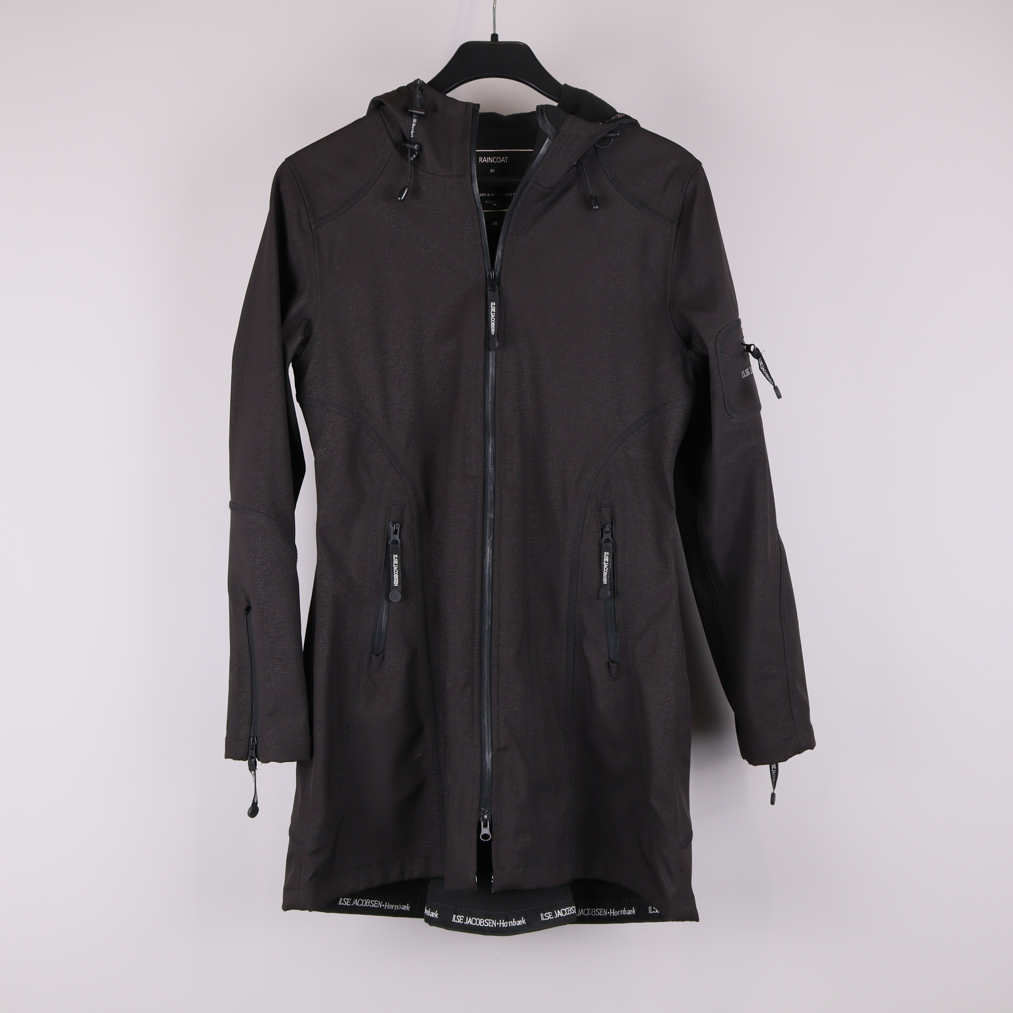 Praktisk regnjacka i mörk nyans med hel dragkedja fram och huva. Jackan har flera praktiska fickor med dragkedja, justerbara ärmslut och slits bak för ökad rörelsefrihet. Diskreta logodetaljer ger ett stilrent och modernt intryck.