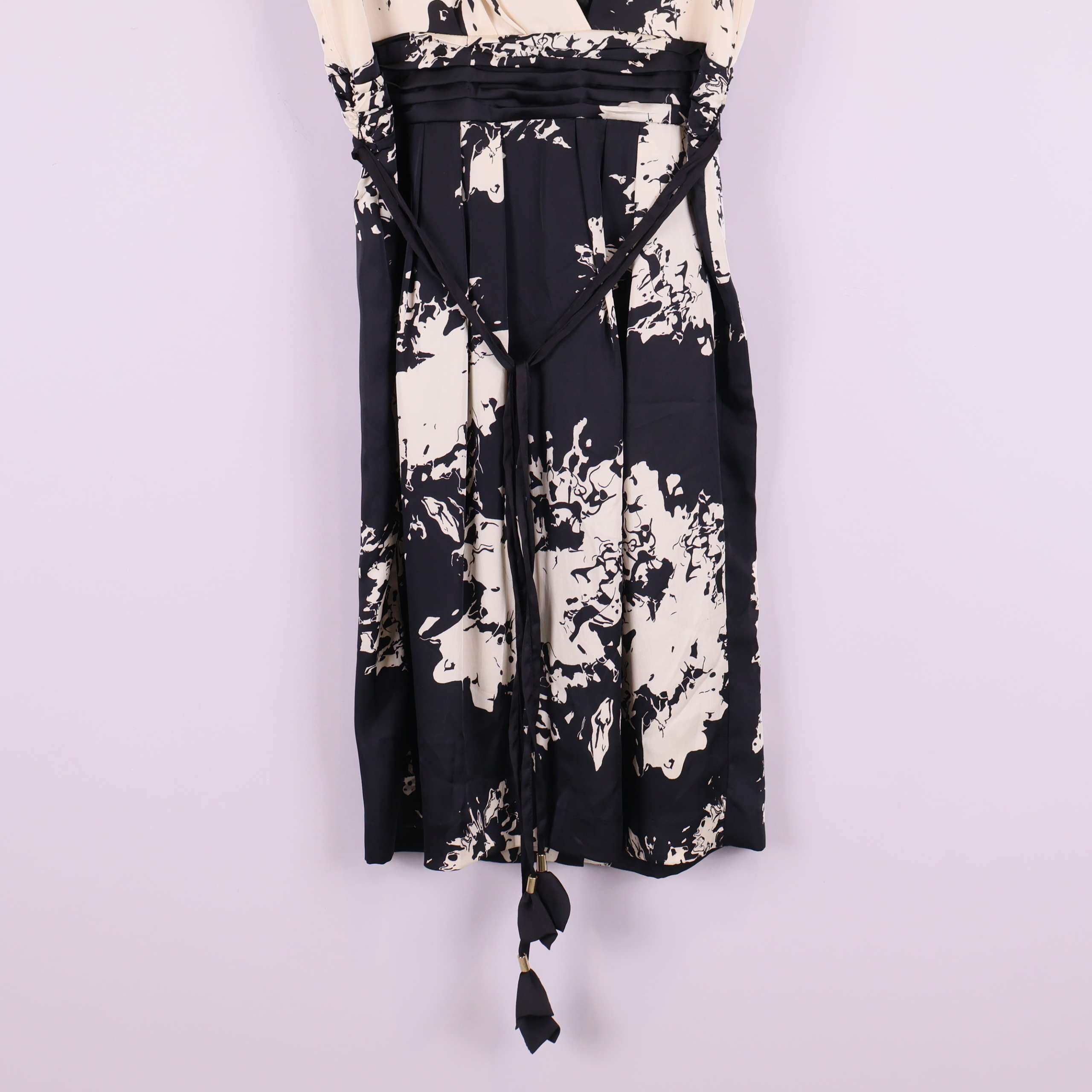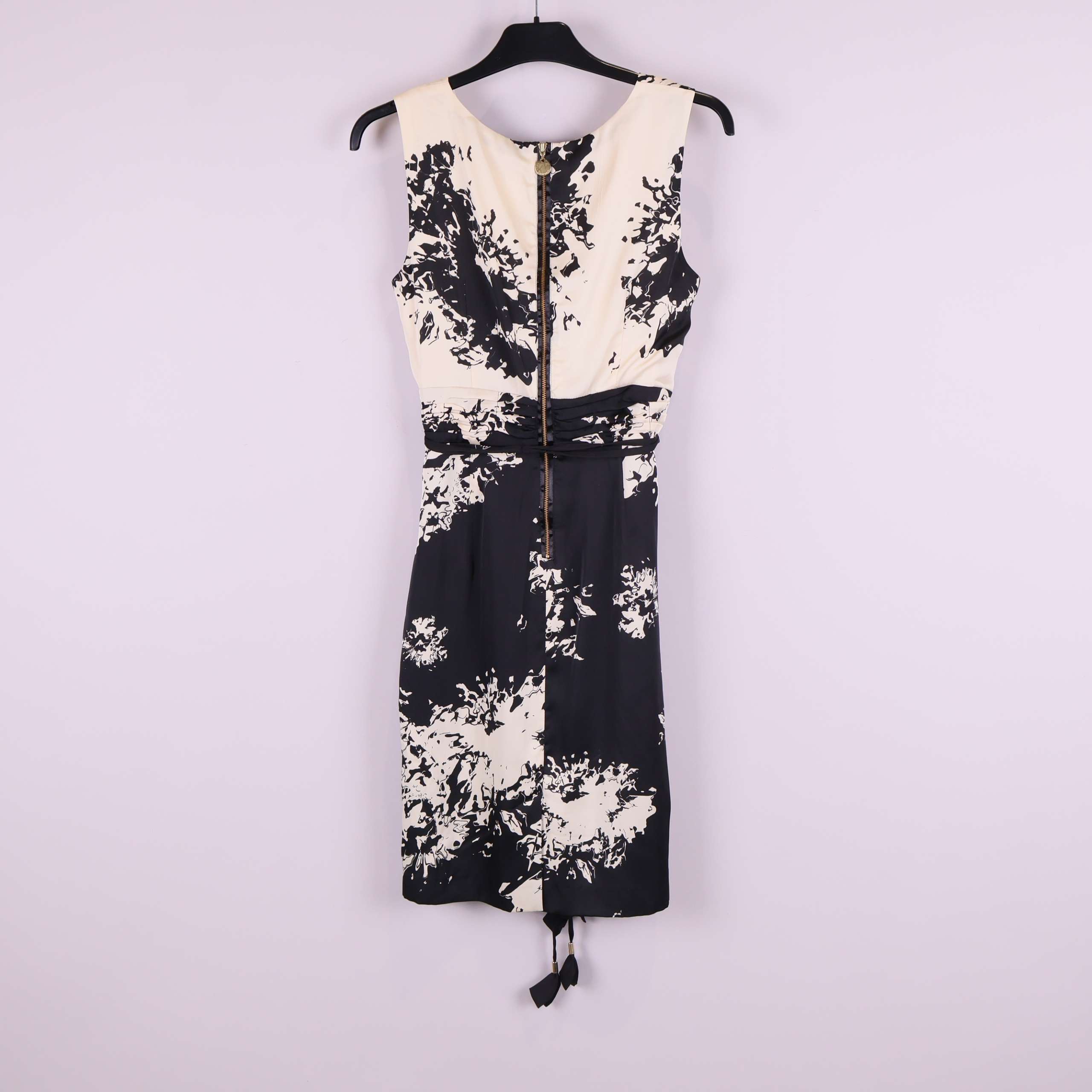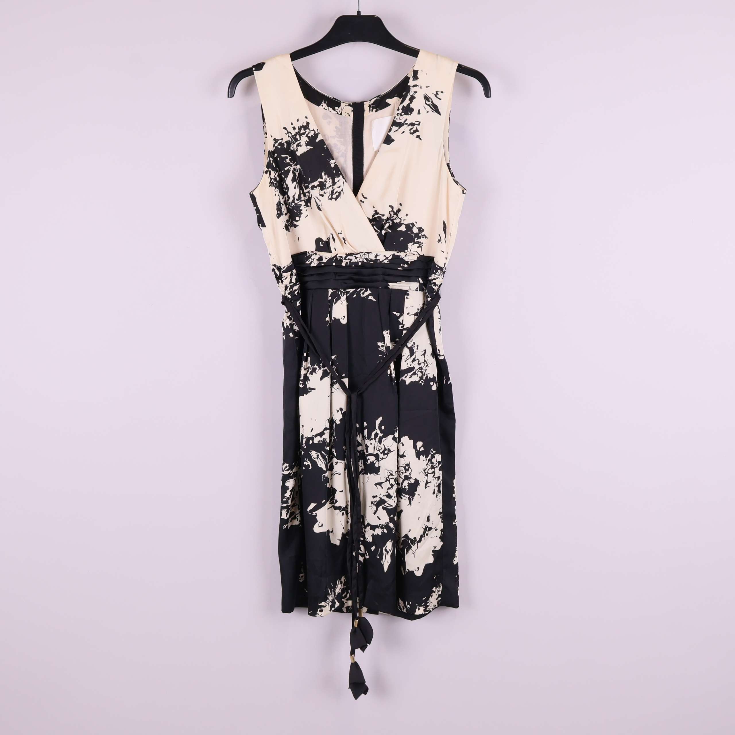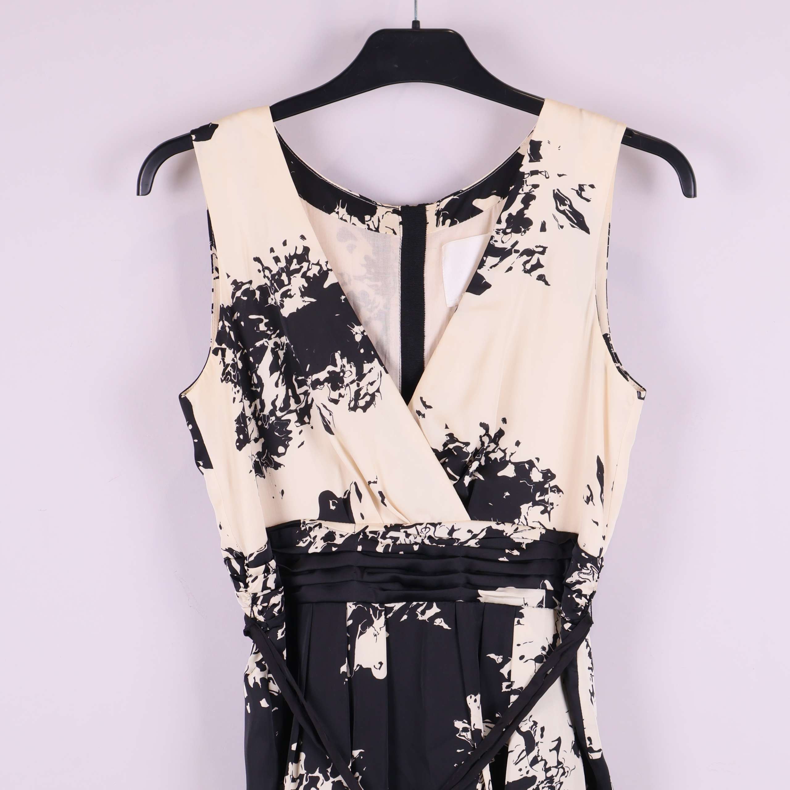 Denna eleganta ärmlösa klänning har ett tydligt grafiskt, svart och benvitt mönster som skapar en modern, konstnärlig look. Klänningen har omlottöverdelen, dekorativa sömmar i midjan och smala band med tofsar för en unik touch. Dold dragkedja bak för smidig passform och lätt vaddering vid axlarna ger lite extra struktur. Perfekt för dig som gillar detaljer med edge och en stylish, trendig känsla.