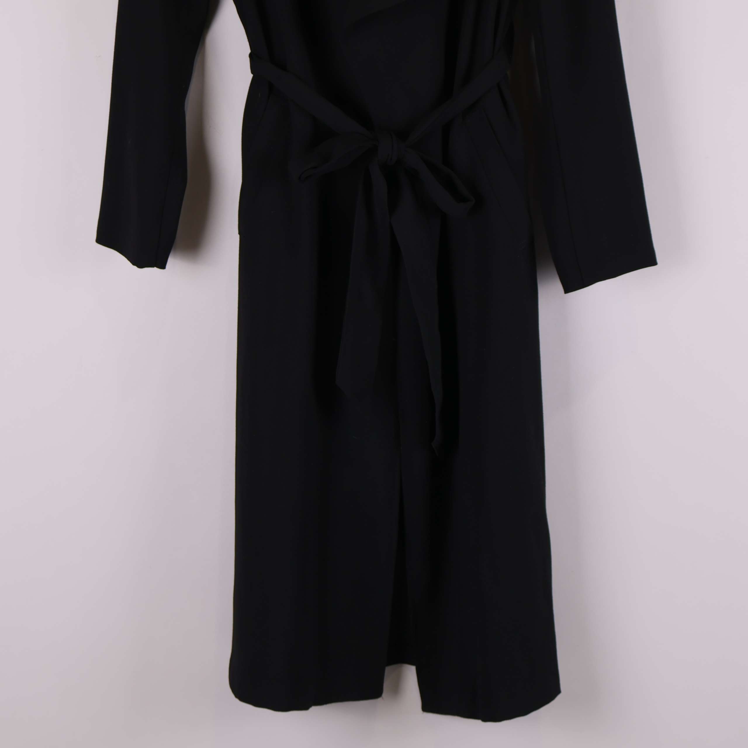 Stilren lång kappa med draperad krage och knytskärp i midjan som ger en modern och avslappnad siluett. Modellen har släta ytor, raka linjer och dekorativa axelknappar för en extra detalj. Passar perfekt att klä upp eller bära över casual outfits för en chic vibe.