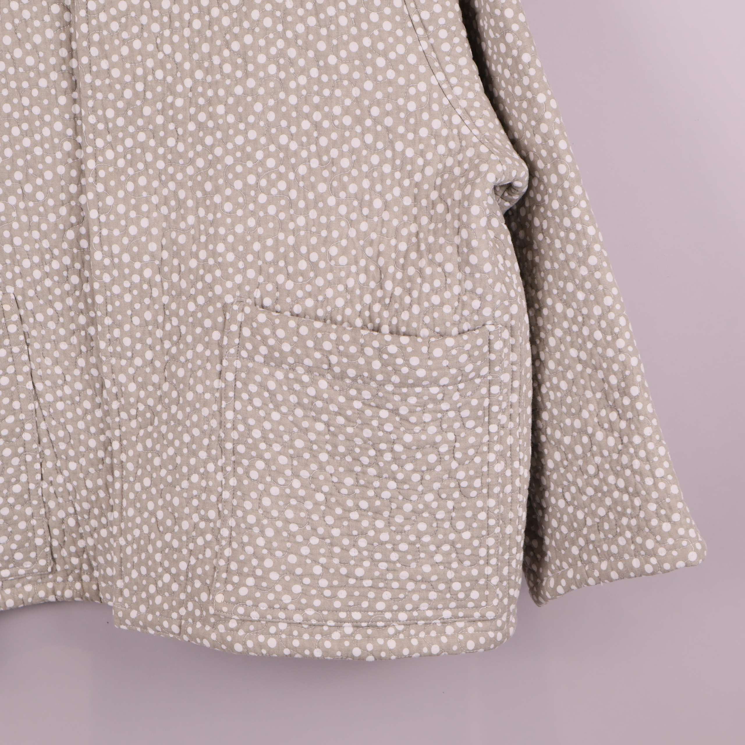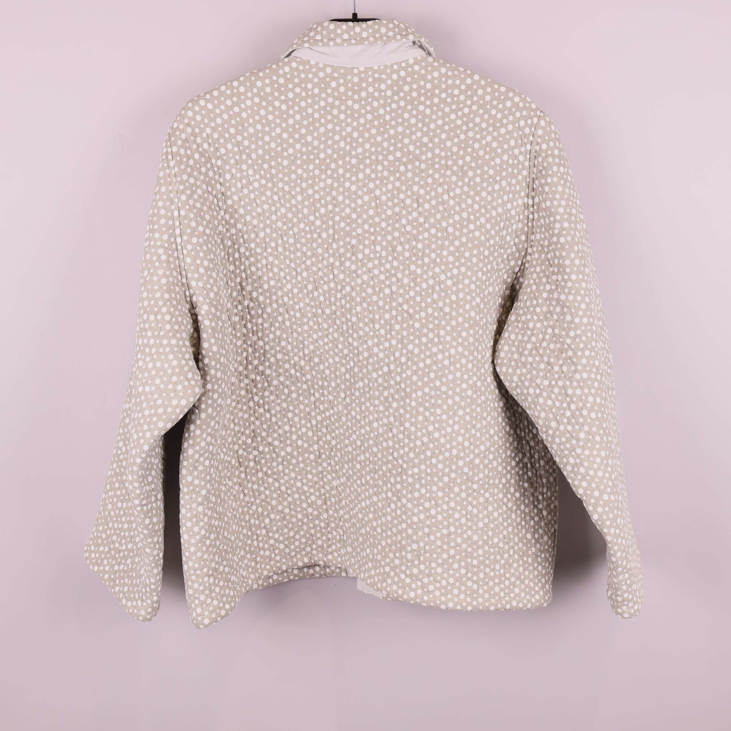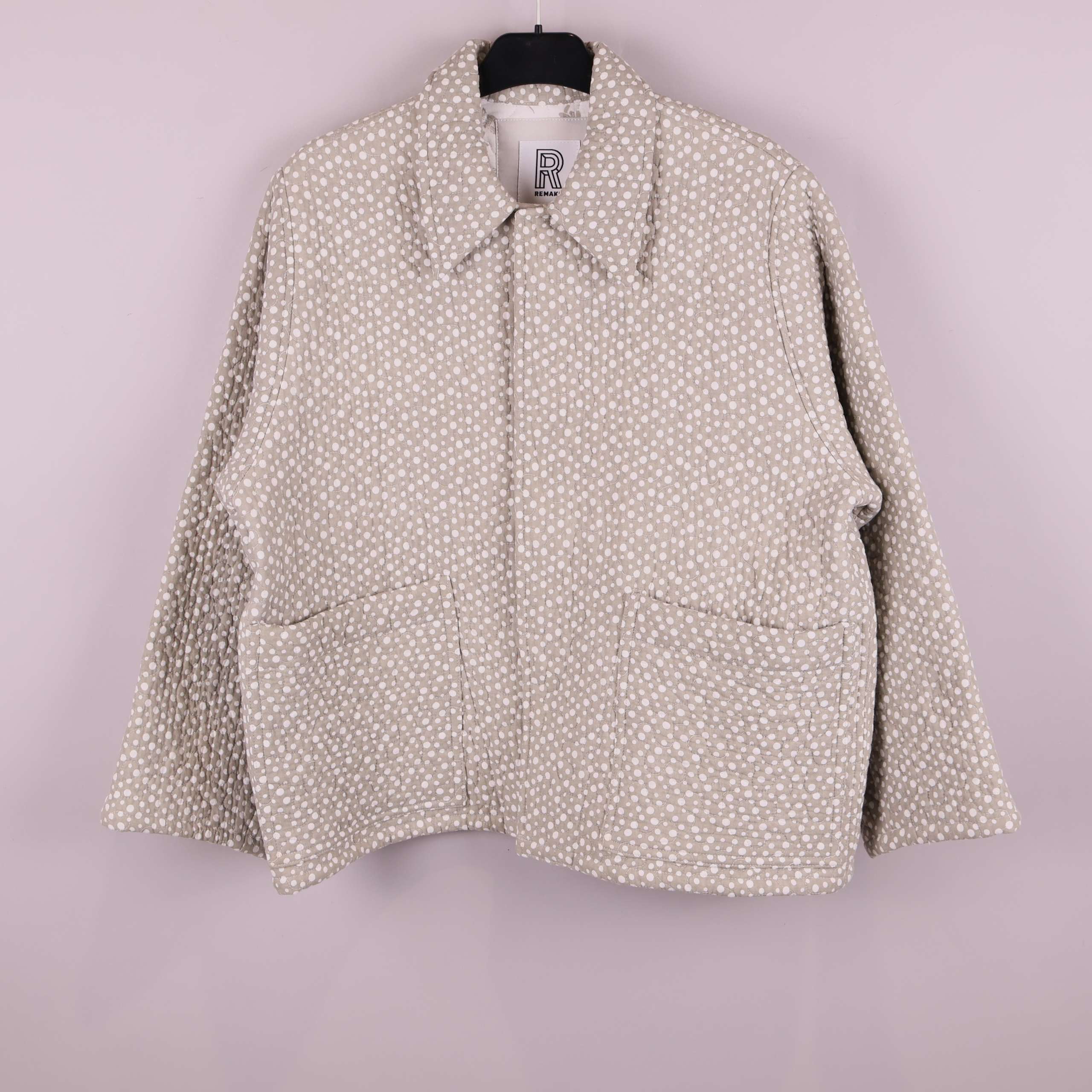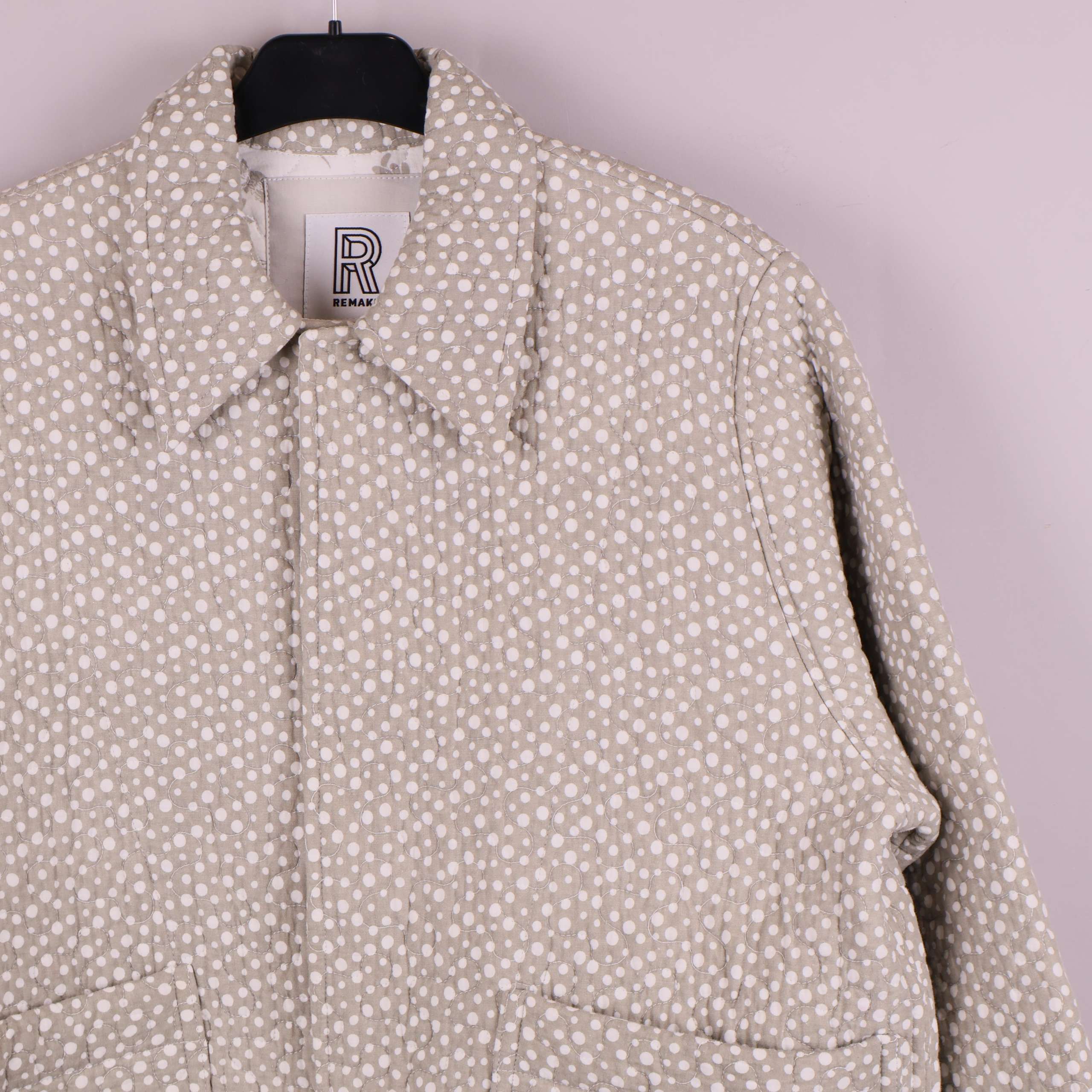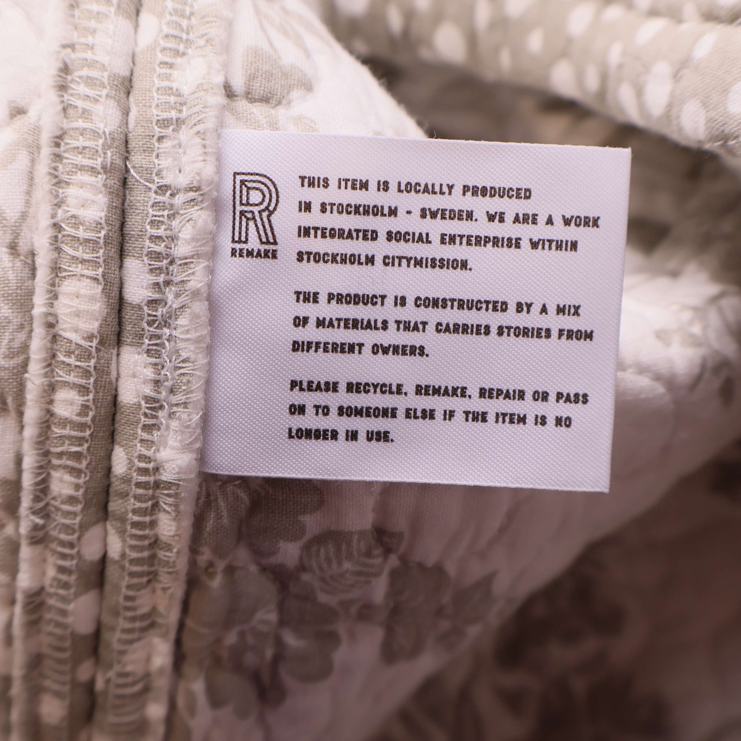 Jacket Mika from quilted bedthrow, crafted from fabric donated to Stockholms Stadsmission. Each piece is carefully cut, featuring two front pockets and a collar. The design is straight, hip-length, and fastens with snap buttons at the front.