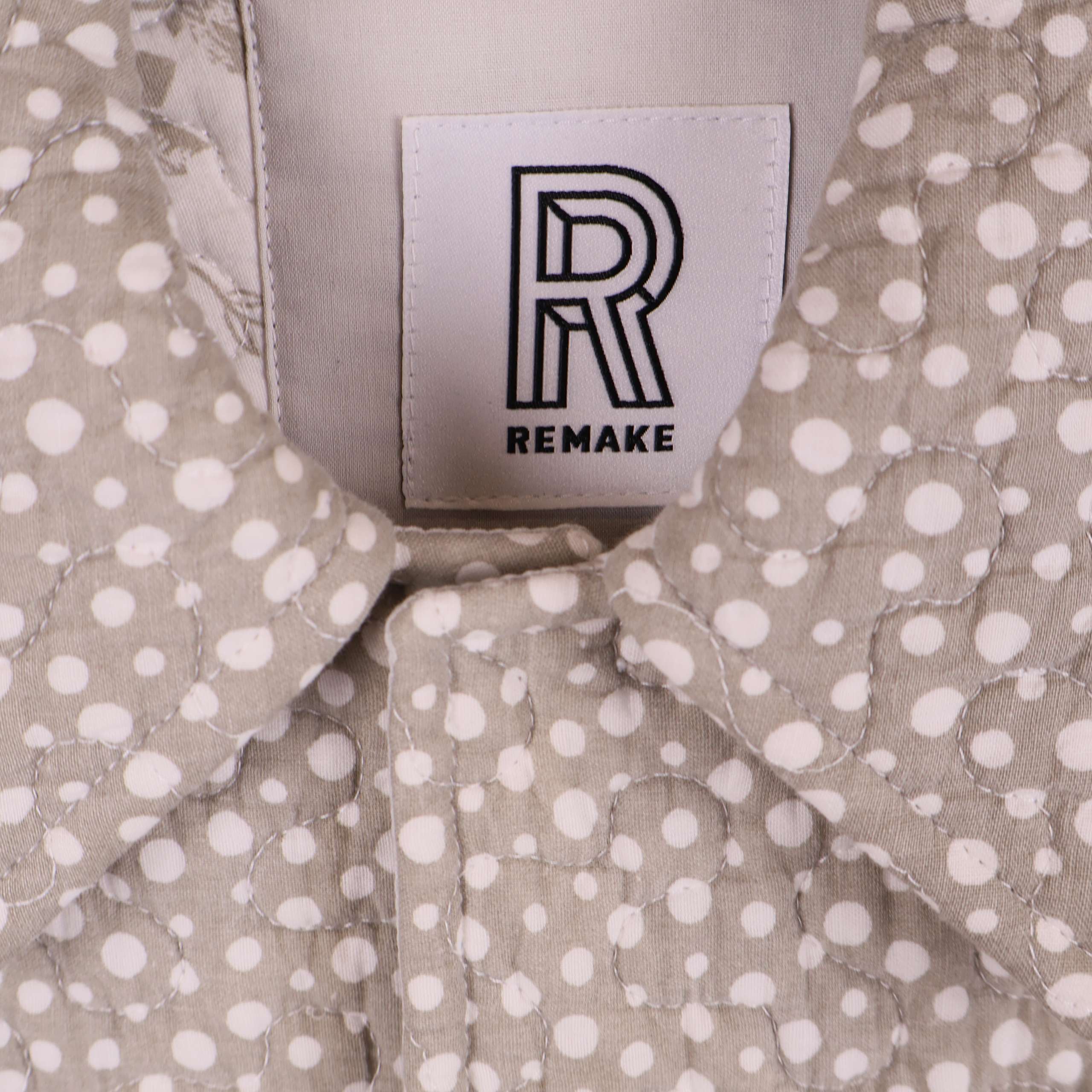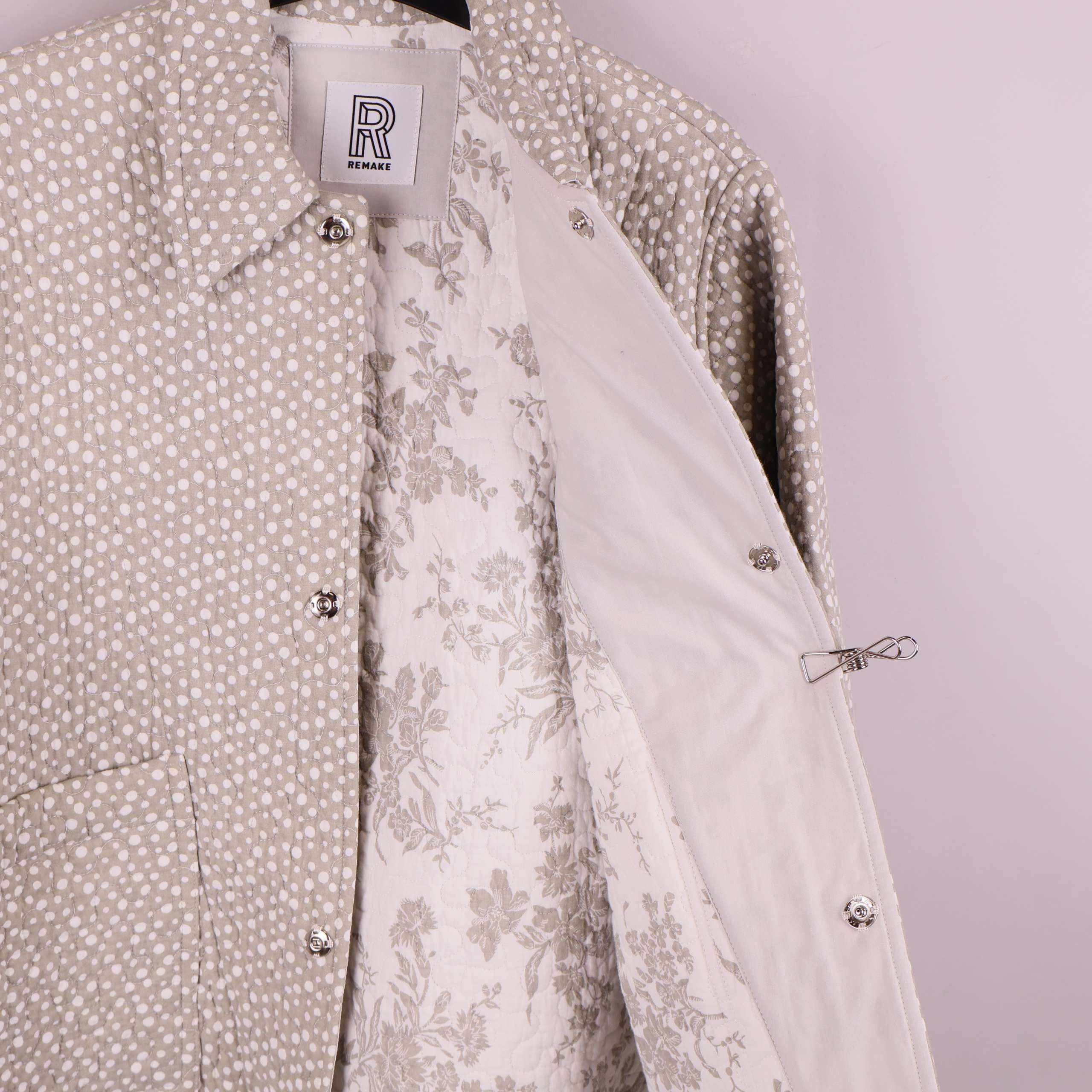 Jackan Mika av quiltat överkast, sydd av donerat material till Stockholms Stadsmission. Varje modell är noggrant tillskuren med krage och två framfickor. Modellen är rak, höftlång och den stängs med tryckknappar fram.
